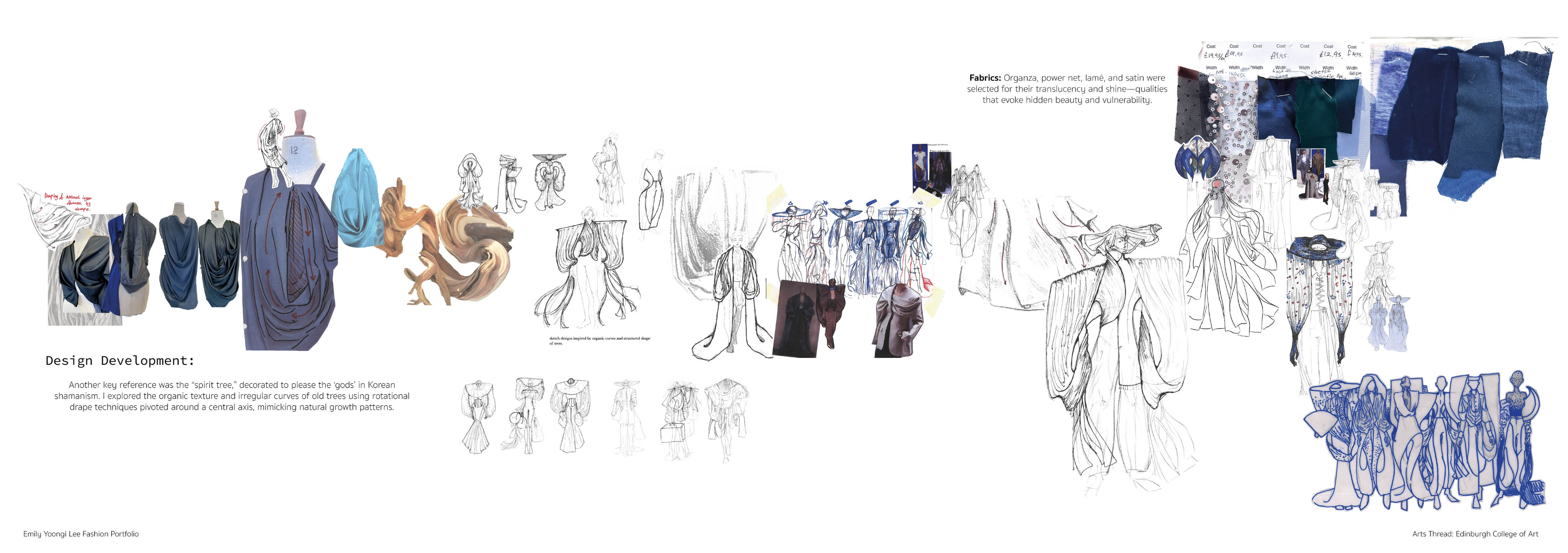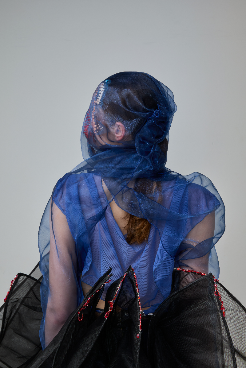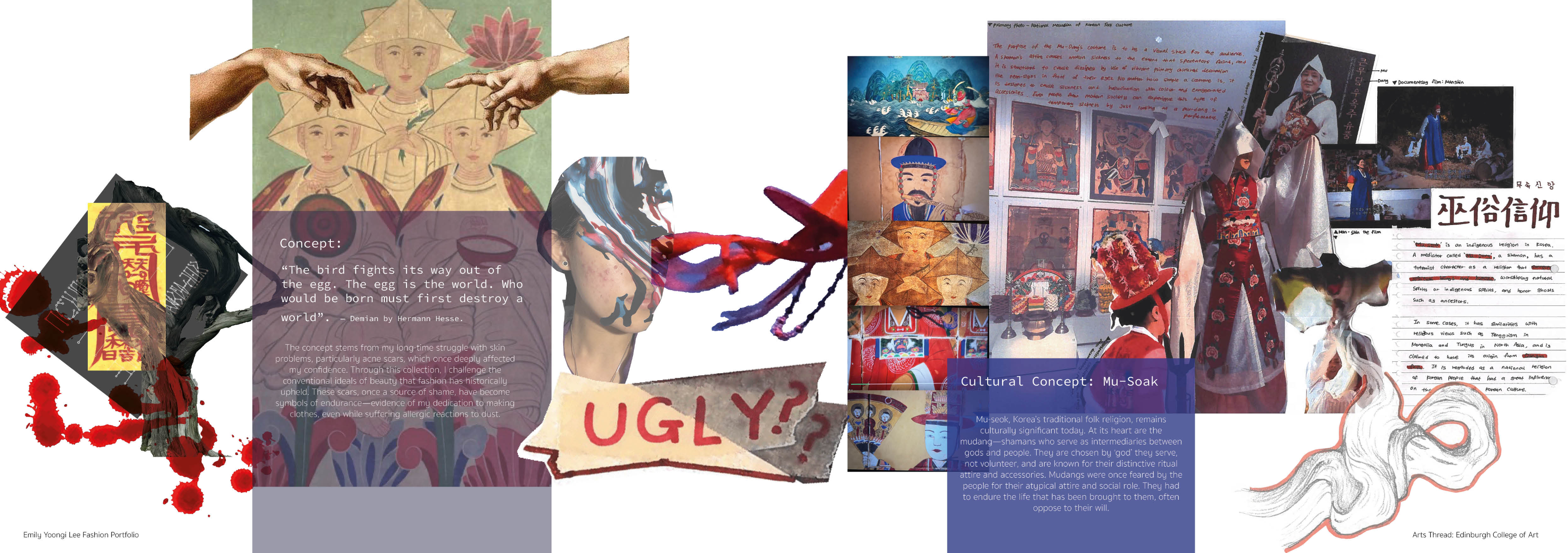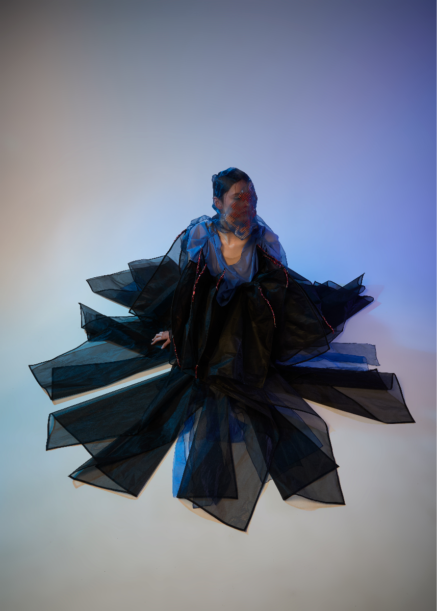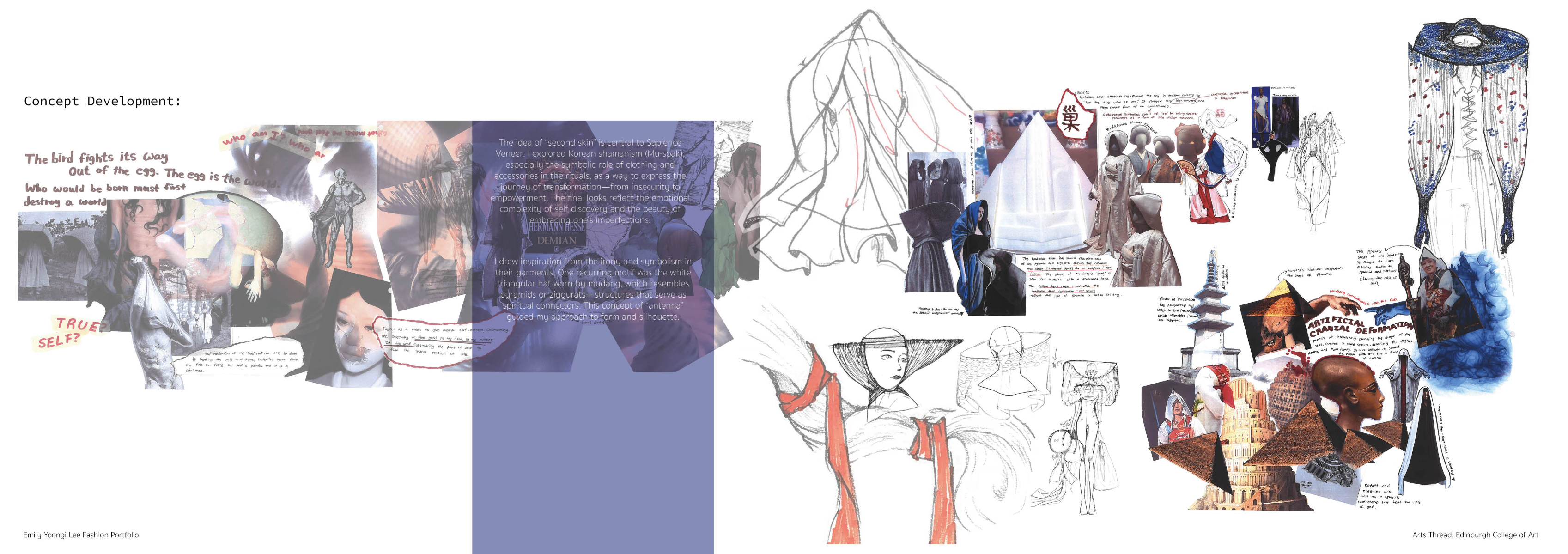 Sapience Veneer is my graduate collection for my undergraduate studies at ECA. The collection explores a wide scope of concepts, from traditional Korean folk religion (Mu-soak) to my personal journey of overcoming insecurities related to my skin. It draws parallel between the shamanic figures of Mu-soak who are "chosen" by god to serve the role regardless of their own will, and my own journey of overcoming skin insecurities which also came to me against my will. Sapience Veneer delivers a message about self-acceptance and love. Sheer, iridescent fabrics like organza act as a second skin, not to conceal, but to reveal. They catch the light, creating a shimmering, almost ethereal shell that represents the beautiful, fragile layer one must break through on the journey to self-acceptance. By exploring fashion’s role as a “cover” and examining how we dress to communicate our ideal selves with others, the collection showcases a 6 look journey that uses sculptural metal and draped soft accessories and accessorizing garments as key statement while maintaining the wearable aspect of RTW fashion.