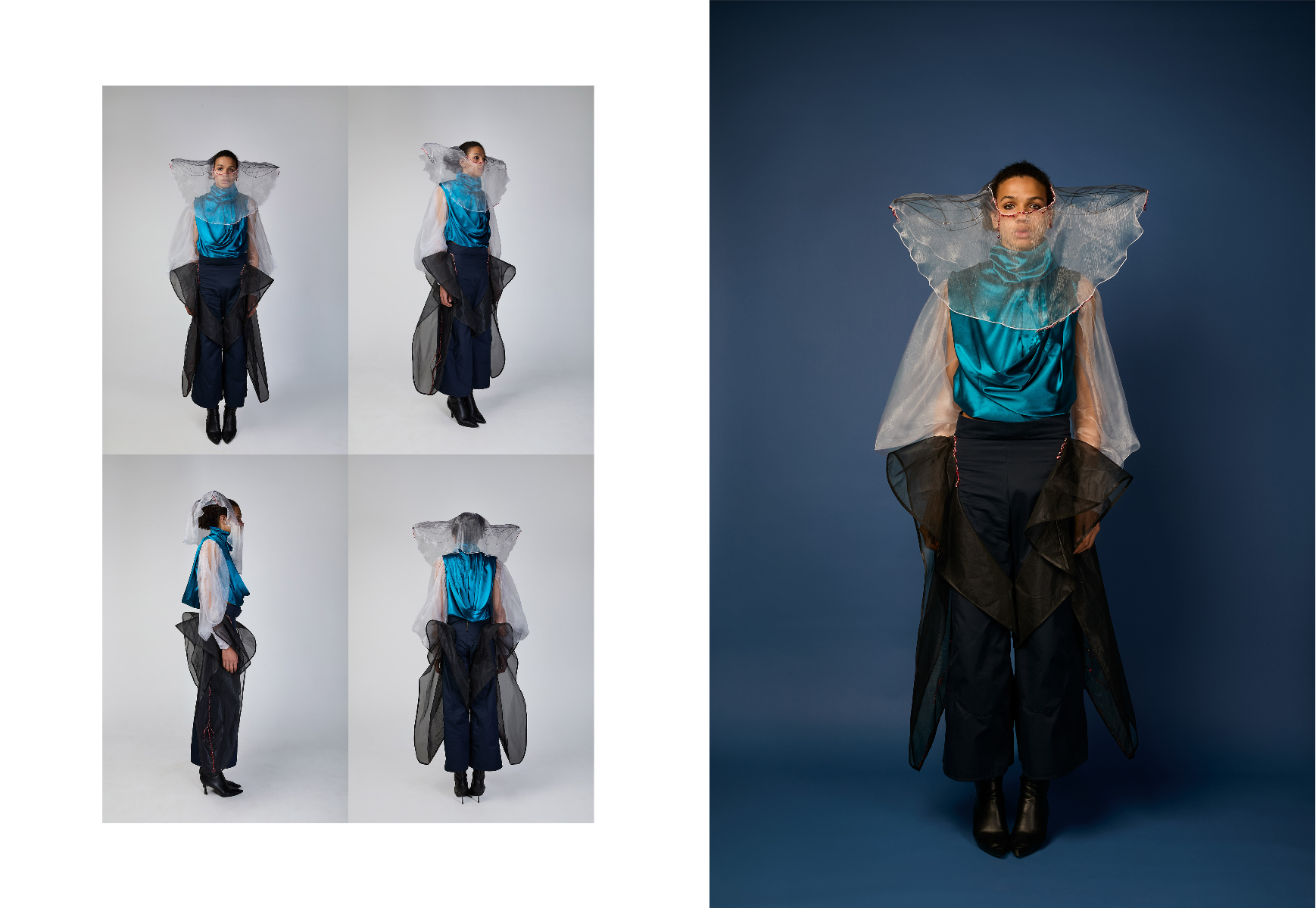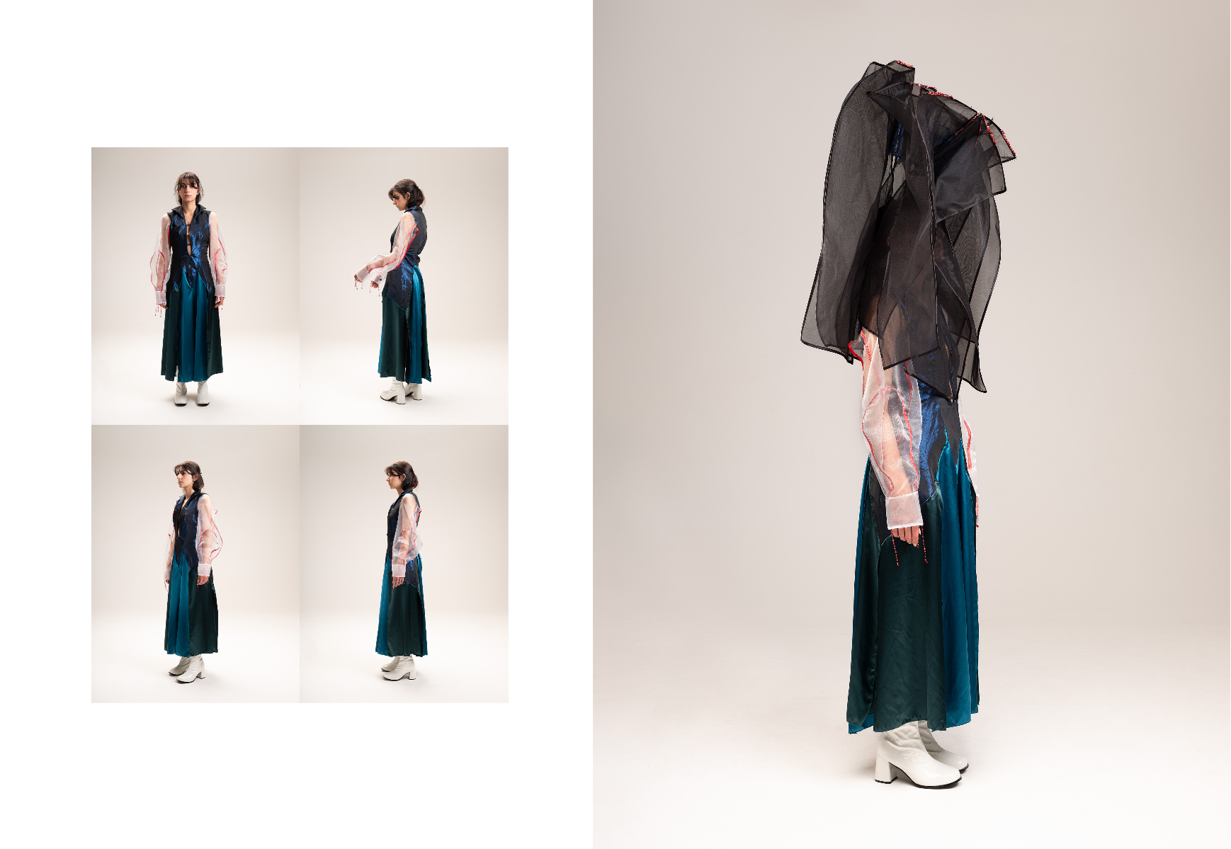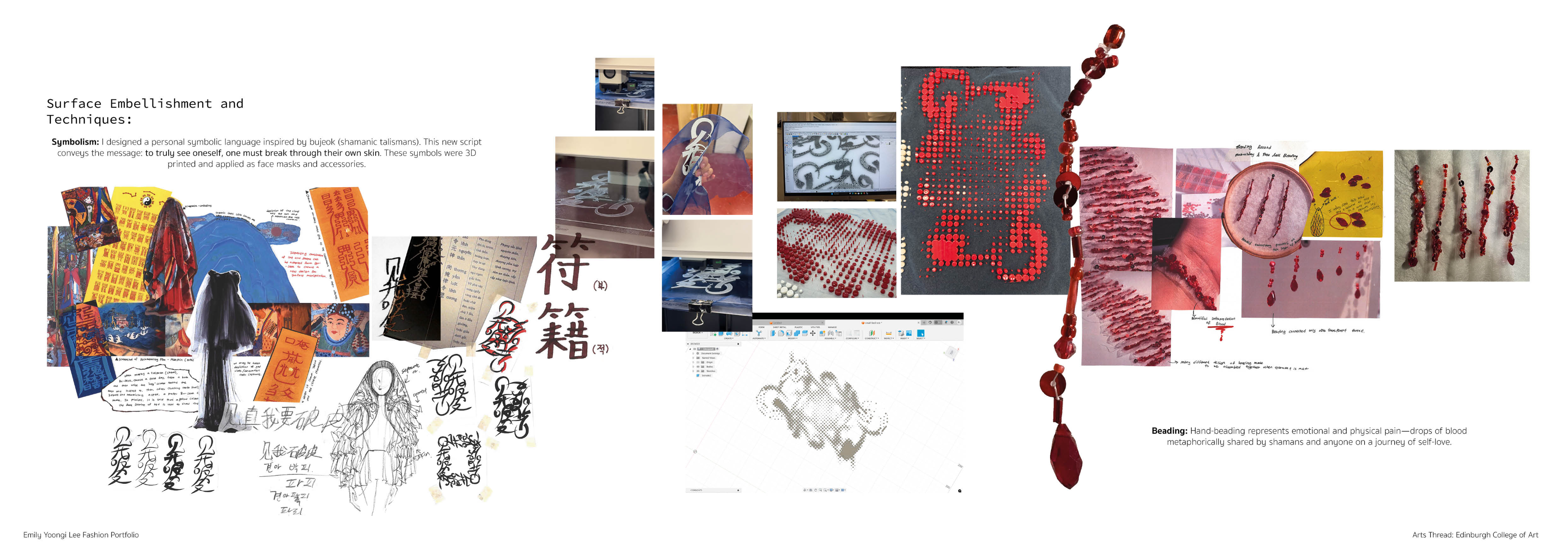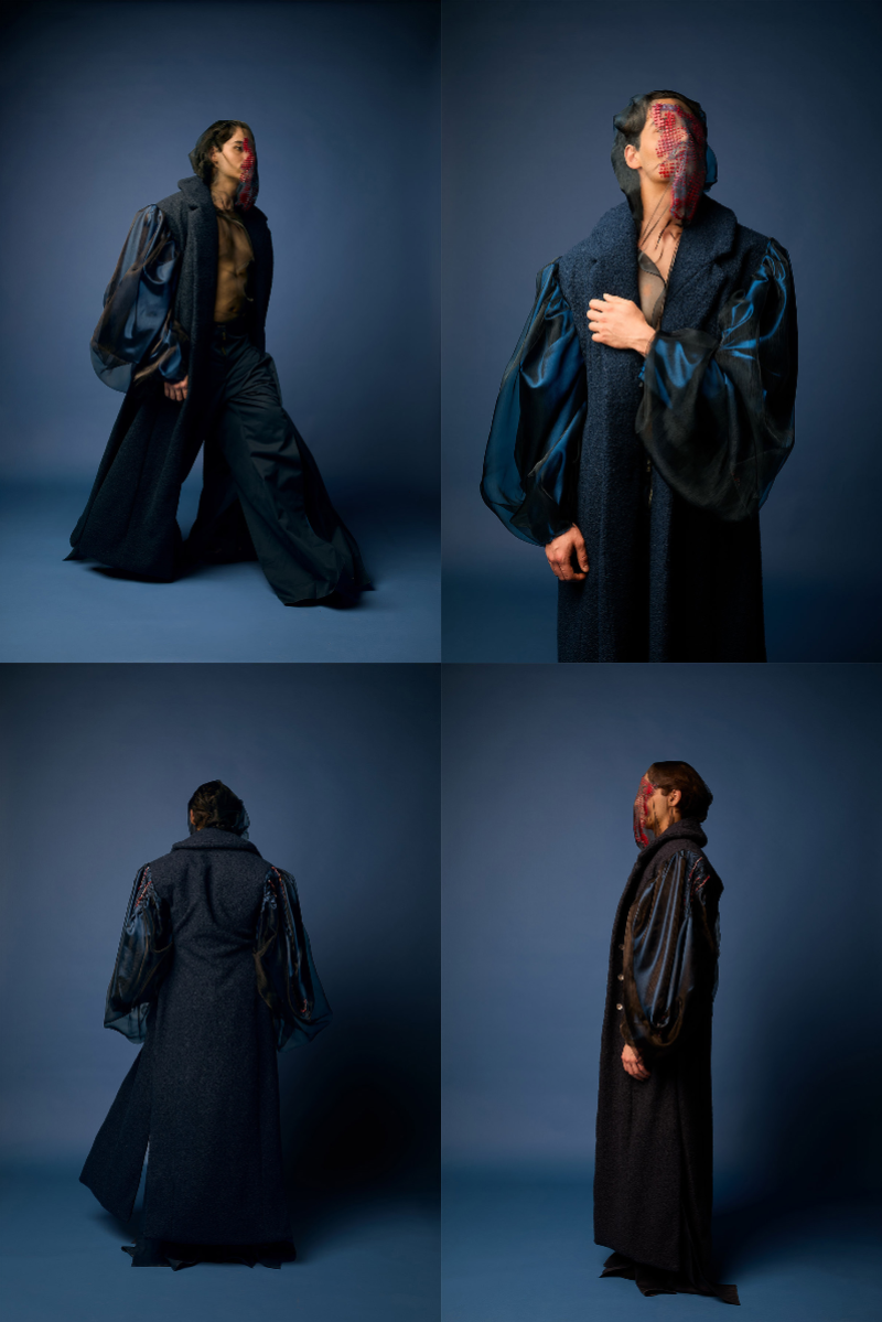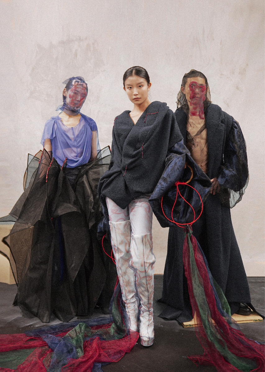 Sapience Veneer is my graduate collection for my undergraduate studies at ECA. The collection explores a wide scope of concepts, from traditional Korean folk religion (Mu-soak) to my personal journey of overcoming insecurities related to my skin. It draws parallel between the shamanic figures of Mu-soak who are "chosen" by god to serve the role regardless of their own will, and my own journey of overcoming skin insecurities which also came to me against my will. Sapience Veneer delivers a message about self-acceptance and love. Sheer, iridescent fabrics like organza act as a second skin, not to conceal, but to reveal. They catch the light, creating a shimmering, almost ethereal shell that represents the beautiful, fragile layer one must break through on the journey to self-acceptance. By exploring fashion’s role as a “cover” and examining how we dress to communicate our ideal selves with others, the collection showcases a 6 look journey that uses sculptural metal and draped soft accessories and accessorizing garments as key statement while maintaining the wearable aspect of RTW fashion.