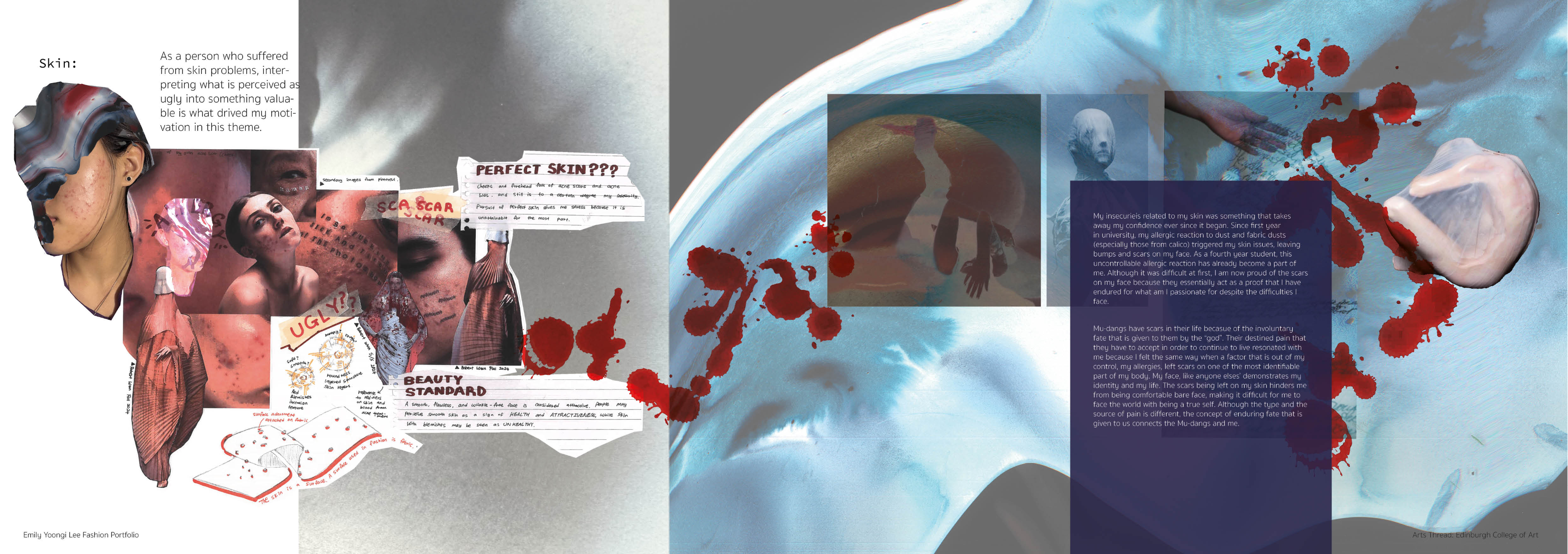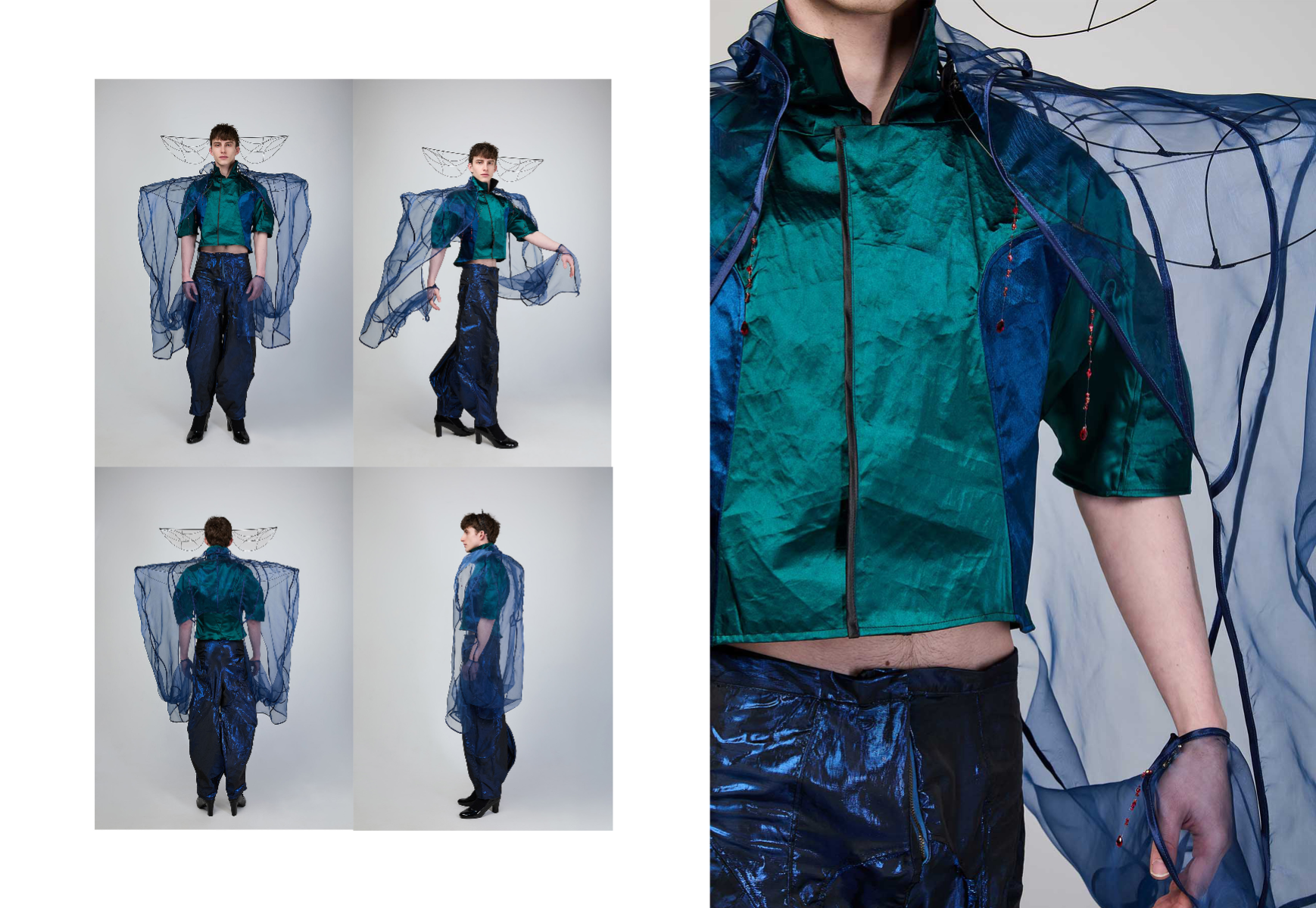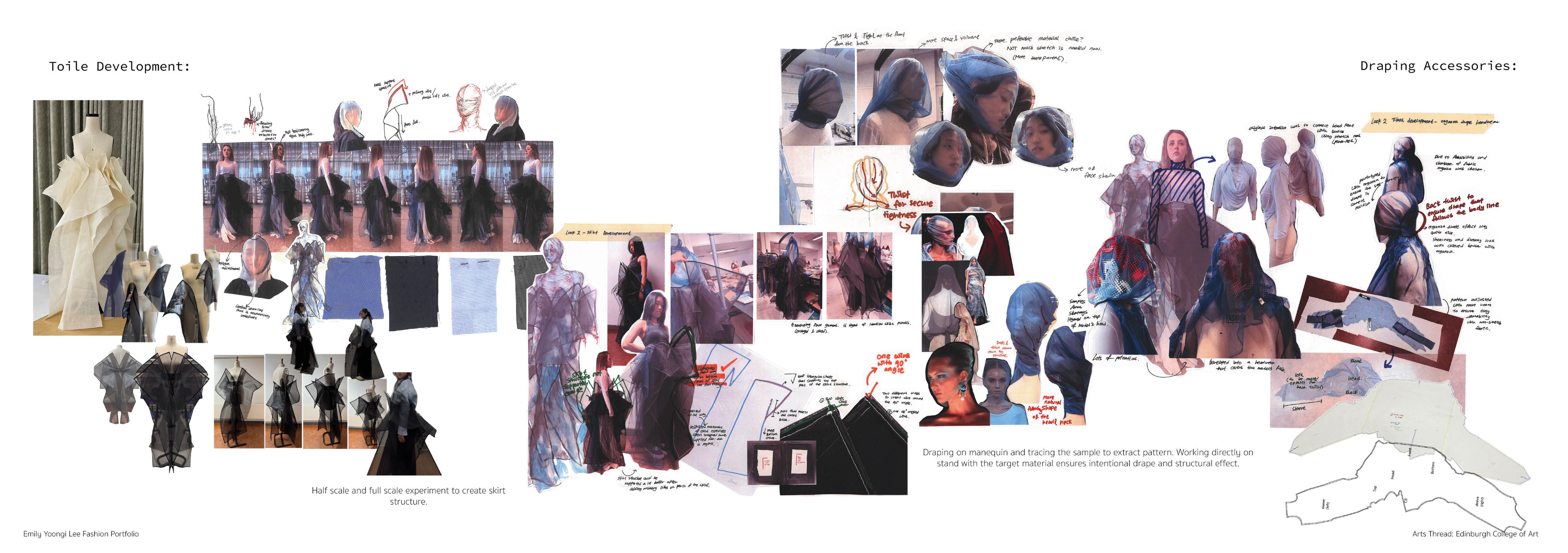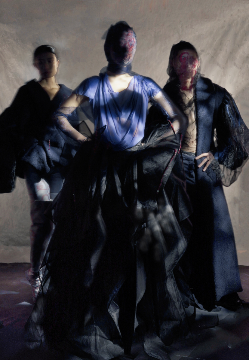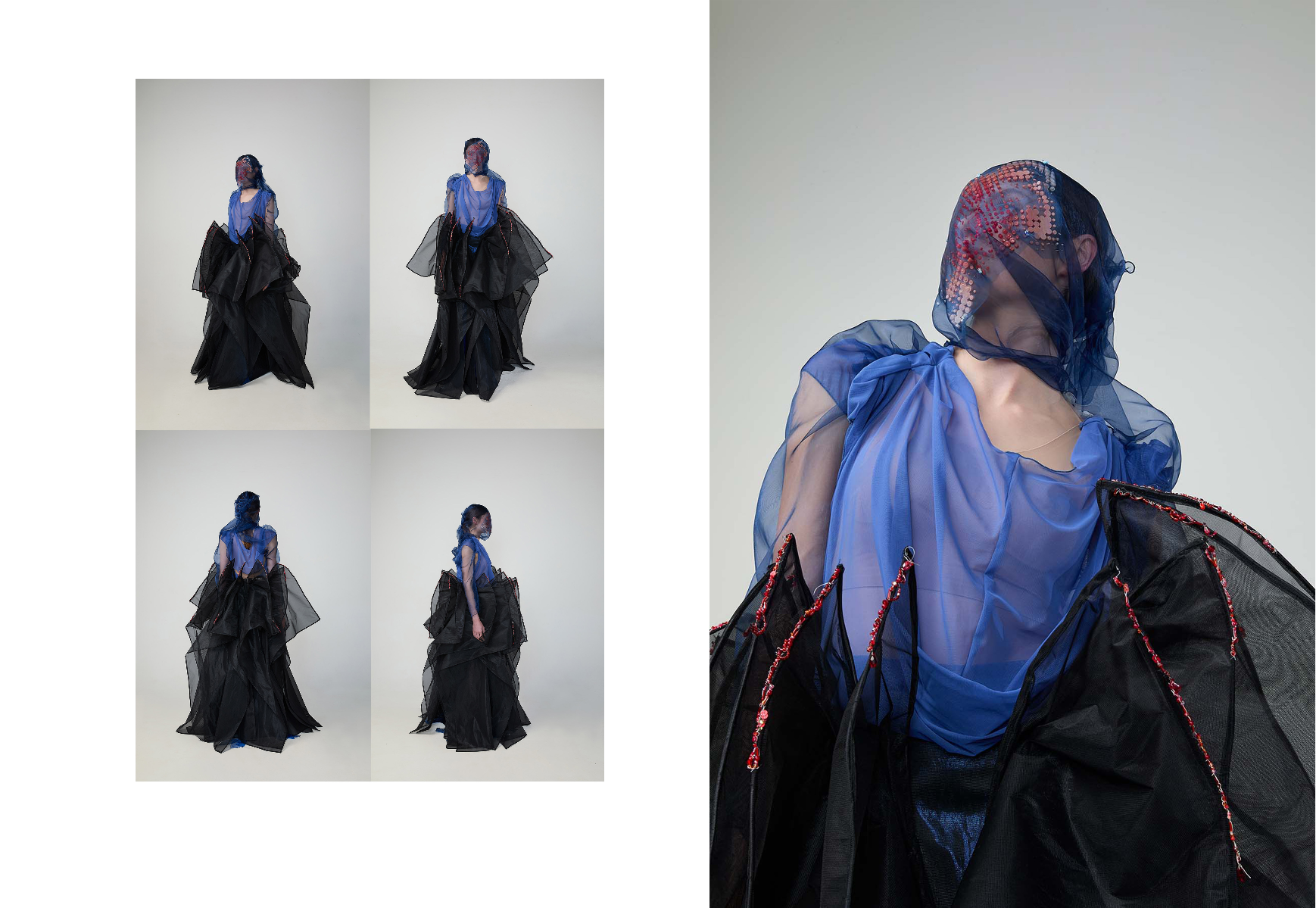 Sapience Veneer is my graduate collection for my undergraduate studies at ECA. The collection explores a wide scope of concepts, from traditional Korean folk religion (Mu-soak) to my personal journey of overcoming insecurities related to my skin. It draws parallel between the shamanic figures of Mu-soak who are "chosen" by god to serve the role regardless of their own will, and my own journey of overcoming skin insecurities which also came to me against my will. Sapience Veneer delivers a message about self-acceptance and love. Sheer, iridescent fabrics like organza act as a second skin, not to conceal, but to reveal. They catch the light, creating a shimmering, almost ethereal shell that represents the beautiful, fragile layer one must break through on the journey to self-acceptance. By exploring fashion’s role as a “cover” and examining how we dress to communicate our ideal selves with others, the collection showcases a 6 look journey that uses sculptural metal and draped soft accessories and accessorizing garments as key statement while maintaining the wearable aspect of RTW fashion.