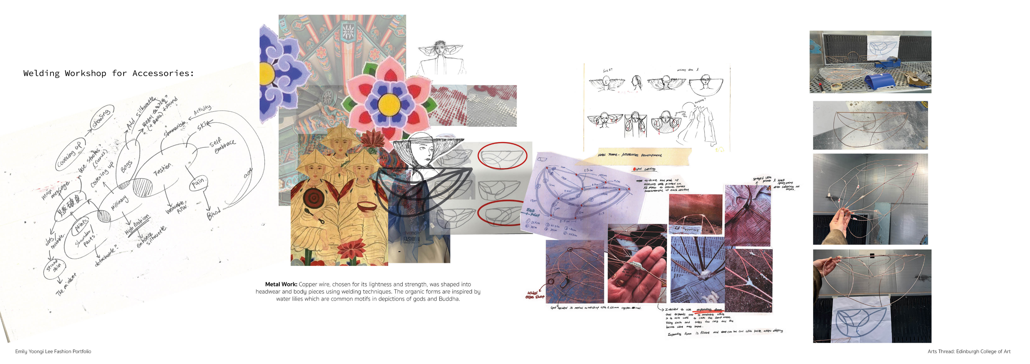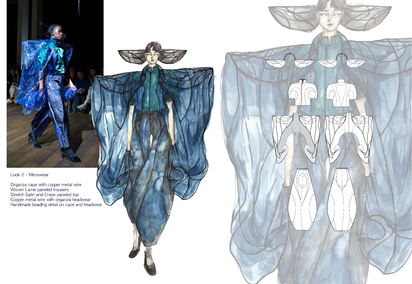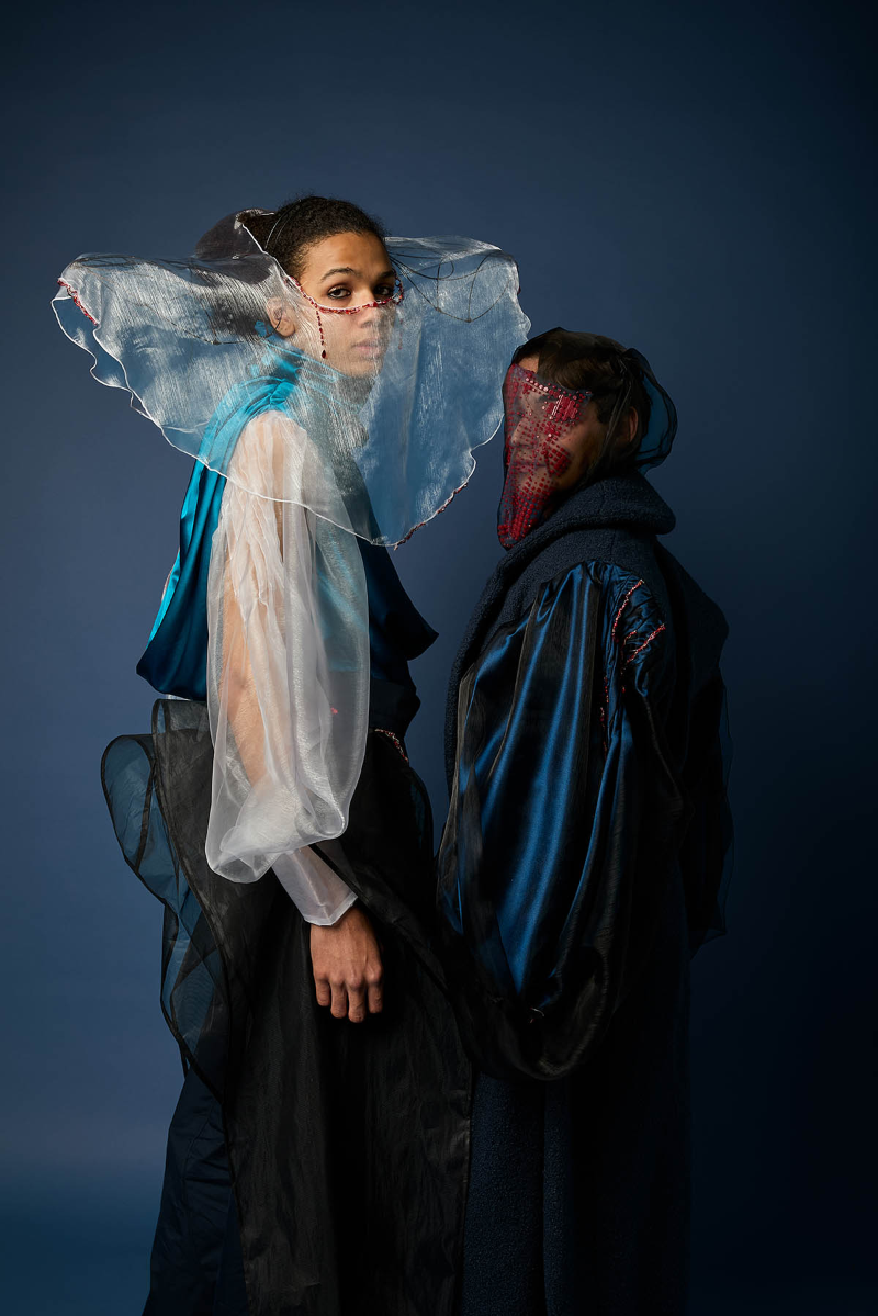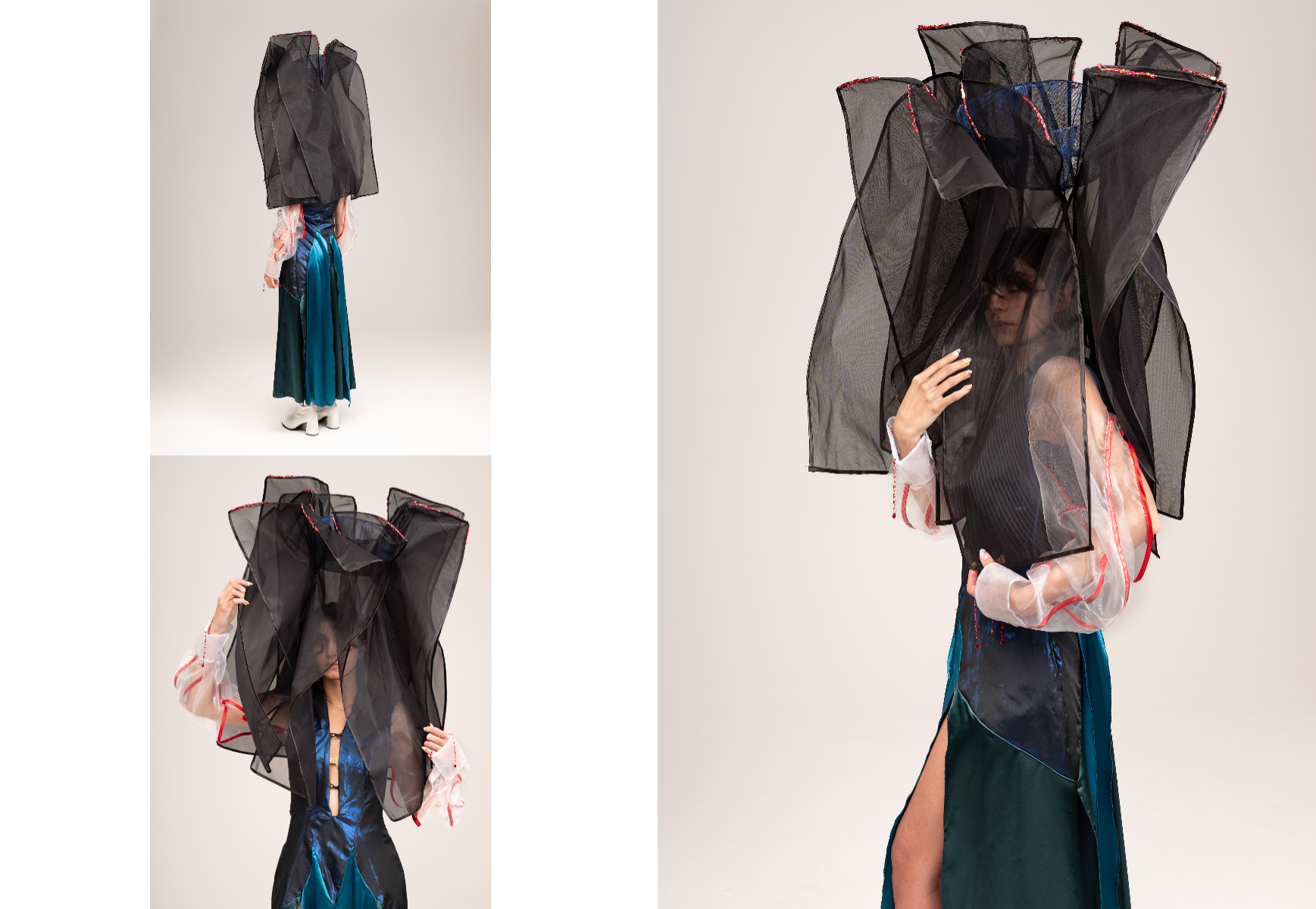 Sapience Veneer is my graduate collection for my undergraduate studies at ECA. The collection explores a wide scope of concepts, from traditional Korean folk religion (Mu-soak) to my personal journey of overcoming insecurities related to my skin. It draws parallel between the shamanic figures of Mu-soak who are "chosen" by god to serve the role regardless of their own will, and my own journey of overcoming skin insecurities which also came to me against my will. Sapience Veneer delivers a message about self-acceptance and love. Sheer, iridescent fabrics like organza act as a second skin, not to conceal, but to reveal. They catch the light, creating a shimmering, almost ethereal shell that represents the beautiful, fragile layer one must break through on the journey to self-acceptance. By exploring fashion’s role as a “cover” and examining how we dress to communicate our ideal selves with others, the collection showcases a 6 look journey that uses sculptural metal and draped soft accessories and accessorizing garments as key statement while maintaining the wearable aspect of RTW fashion.