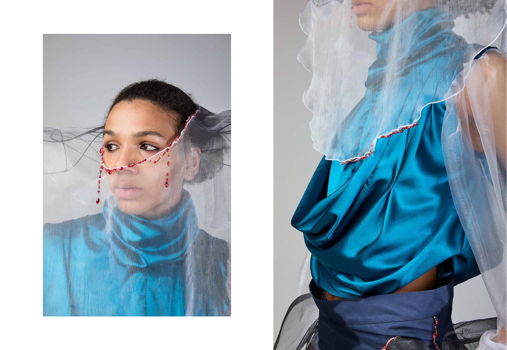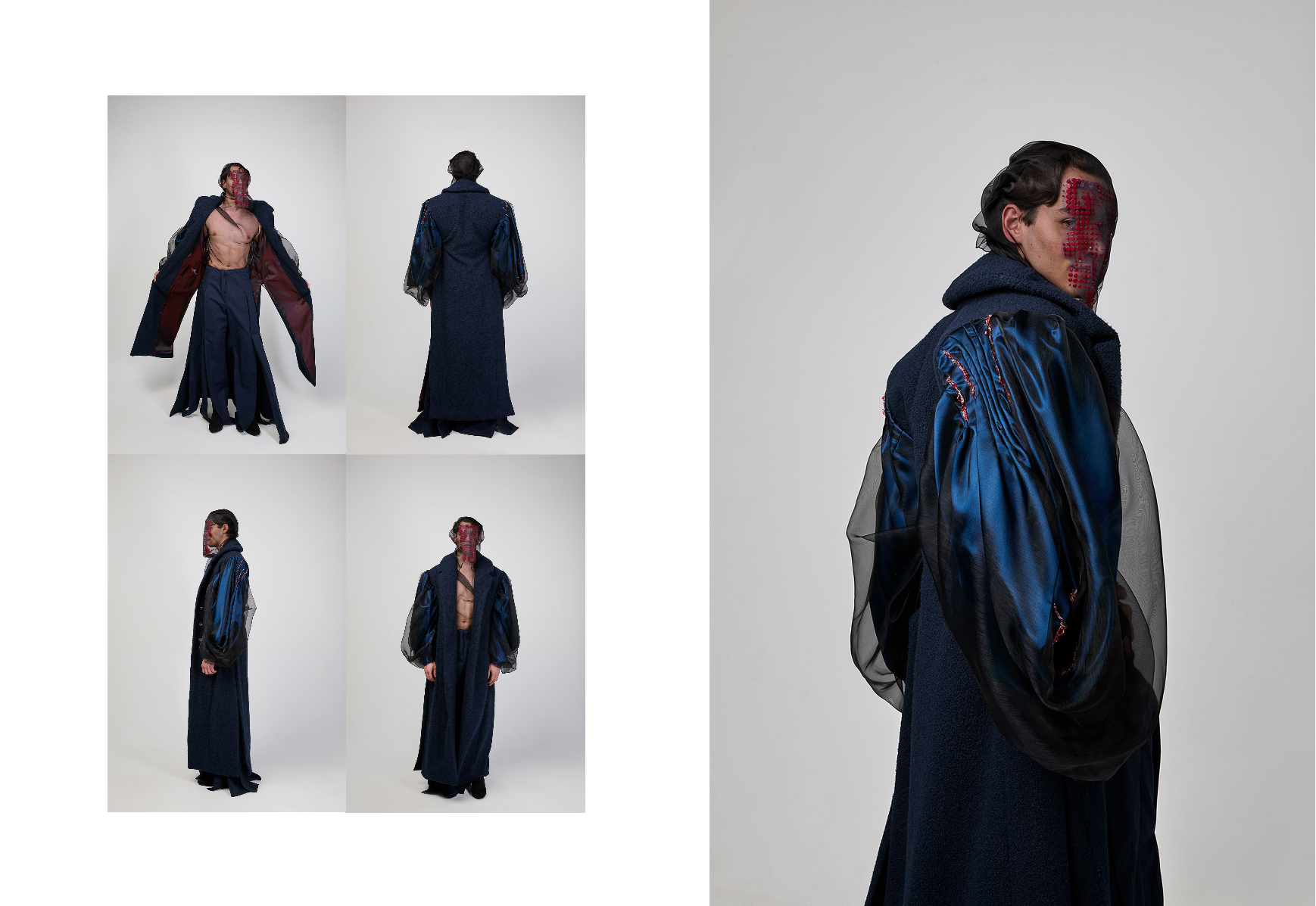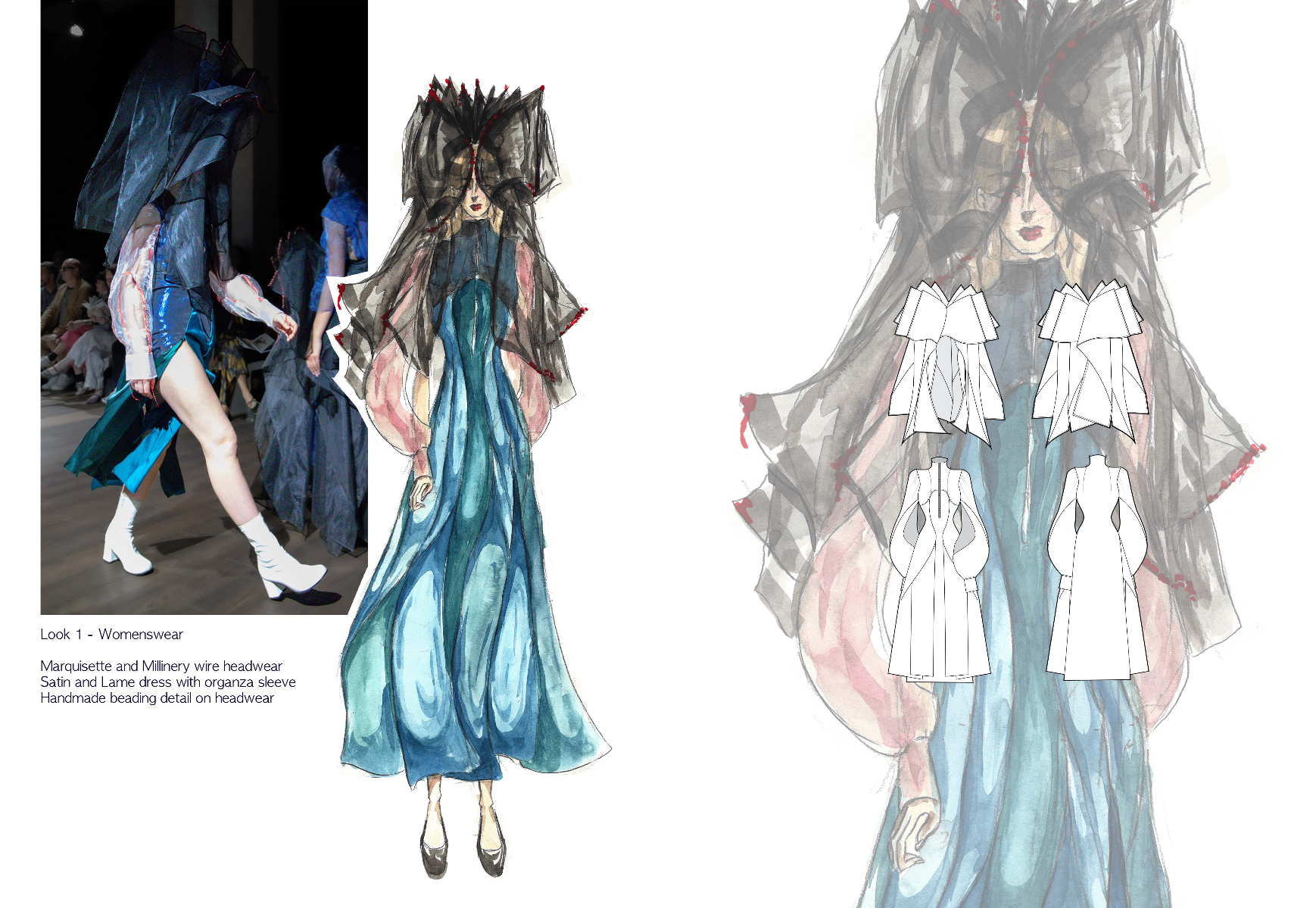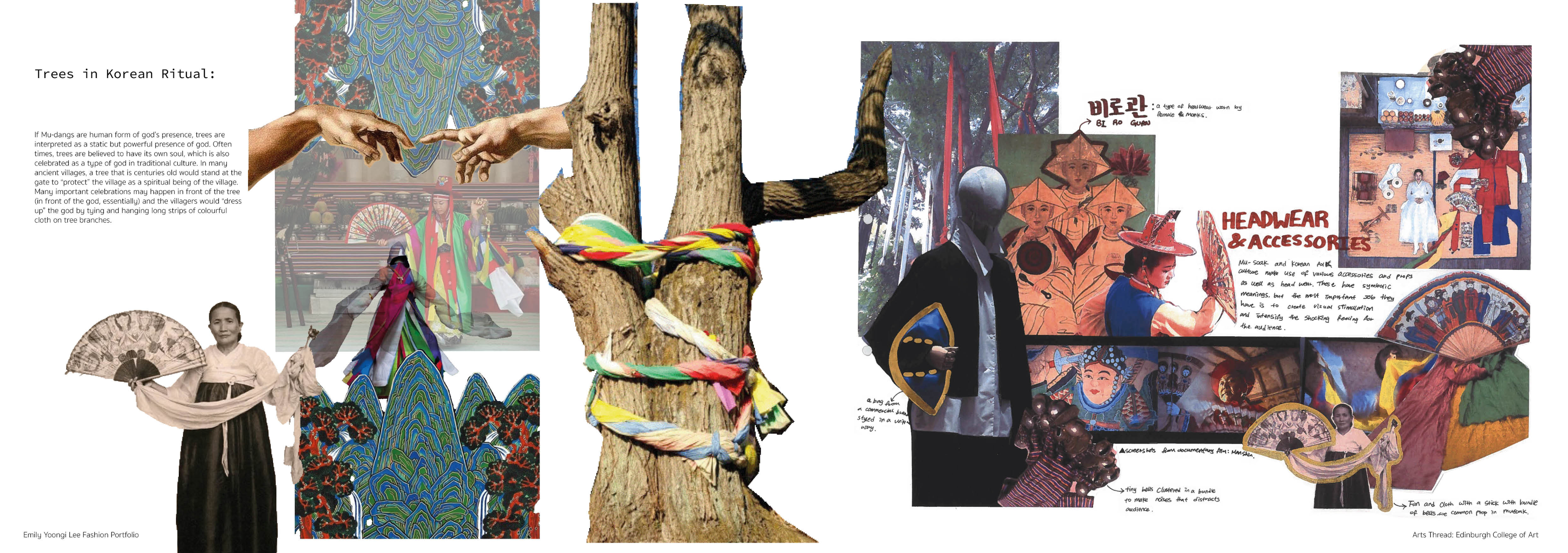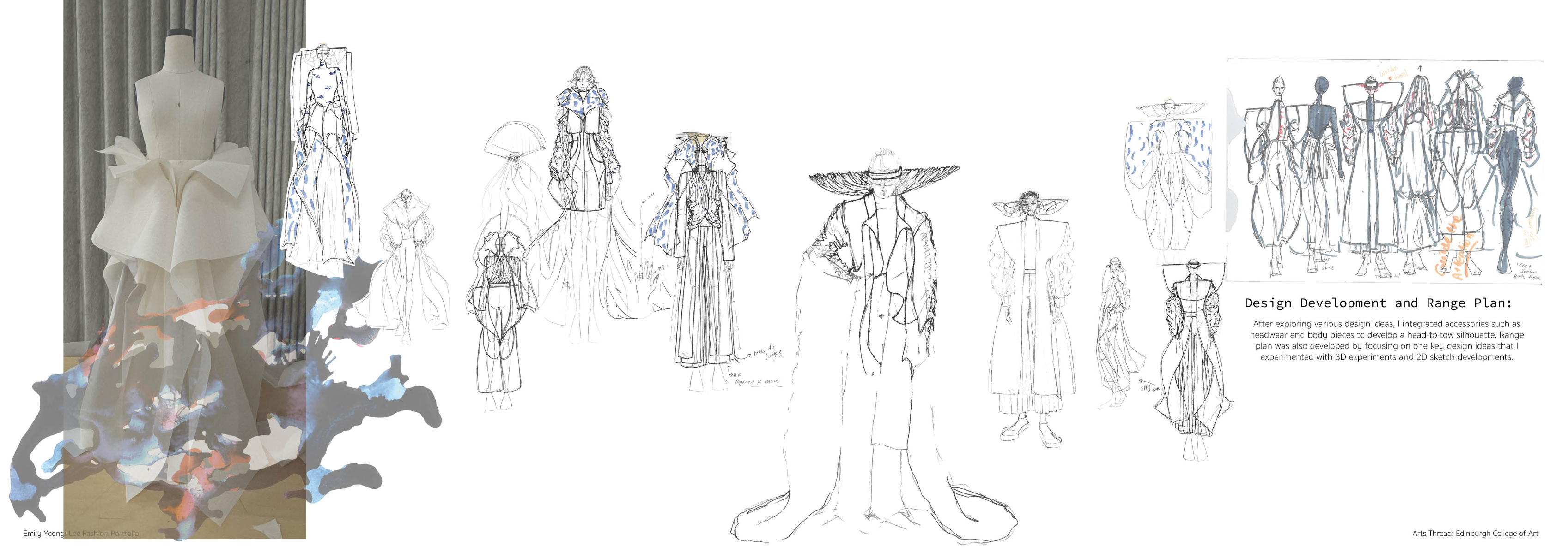 Sapience Veneer is my graduate collection for my undergraduate studies at ECA. The collection explores a wide scope of concepts, from traditional Korean folk religion (Mu-soak) to my personal journey of overcoming insecurities related to my skin. It draws parallel between the shamanic figures of Mu-soak who are "chosen" by god to serve the role regardless of their own will, and my own journey of overcoming skin insecurities which also came to me against my will. Sapience Veneer delivers a message about self-acceptance and love. Sheer, iridescent fabrics like organza act as a second skin, not to conceal, but to reveal. They catch the light, creating a shimmering, almost ethereal shell that represents the beautiful, fragile layer one must break through on the journey to self-acceptance. By exploring fashion’s role as a “cover” and examining how we dress to communicate our ideal selves with others, the collection showcases a 6 look journey that uses sculptural metal and draped soft accessories and accessorizing garments as key statement while maintaining the wearable aspect of RTW fashion.
