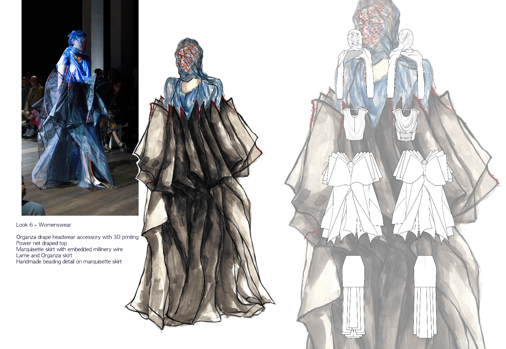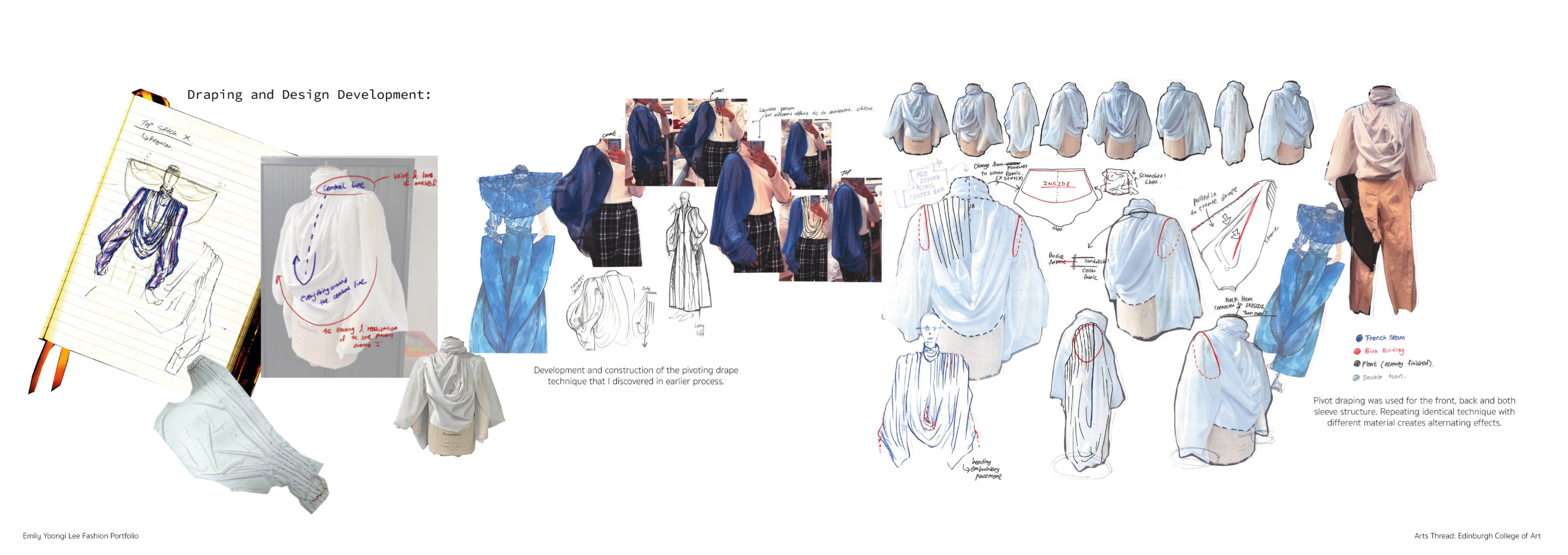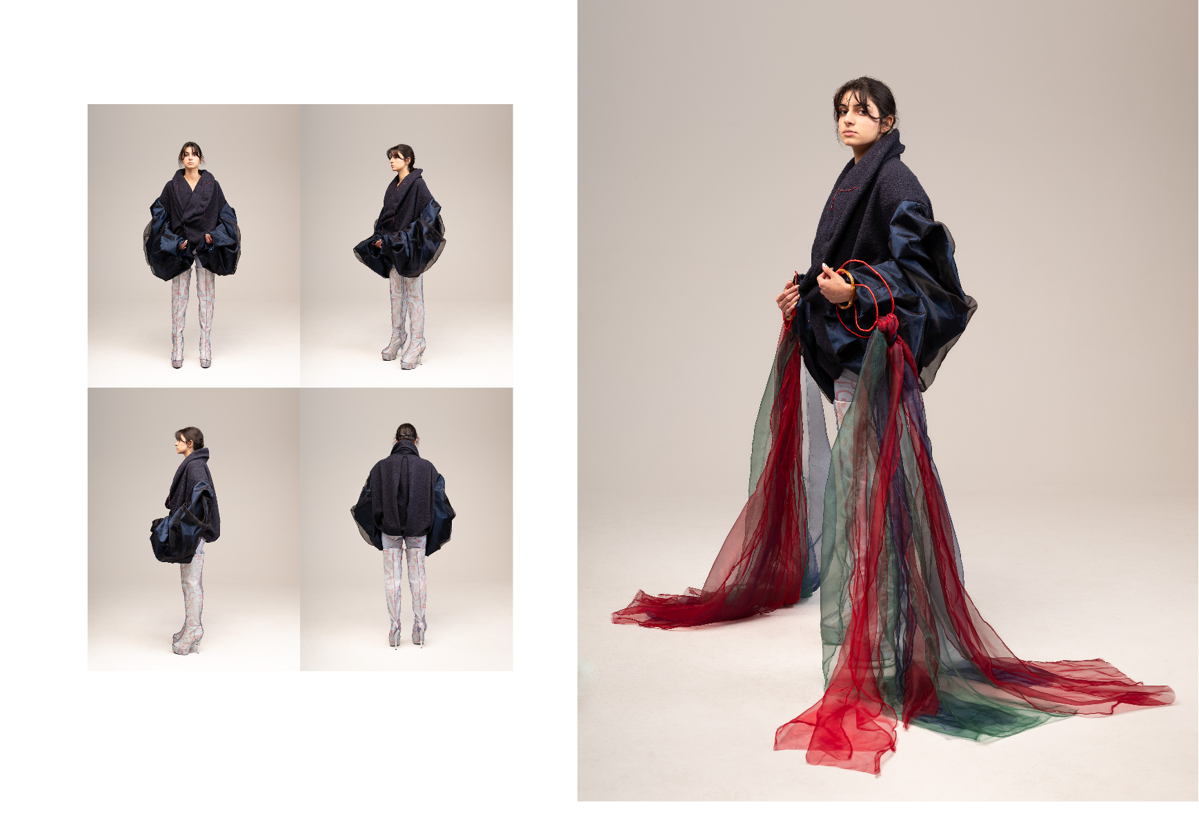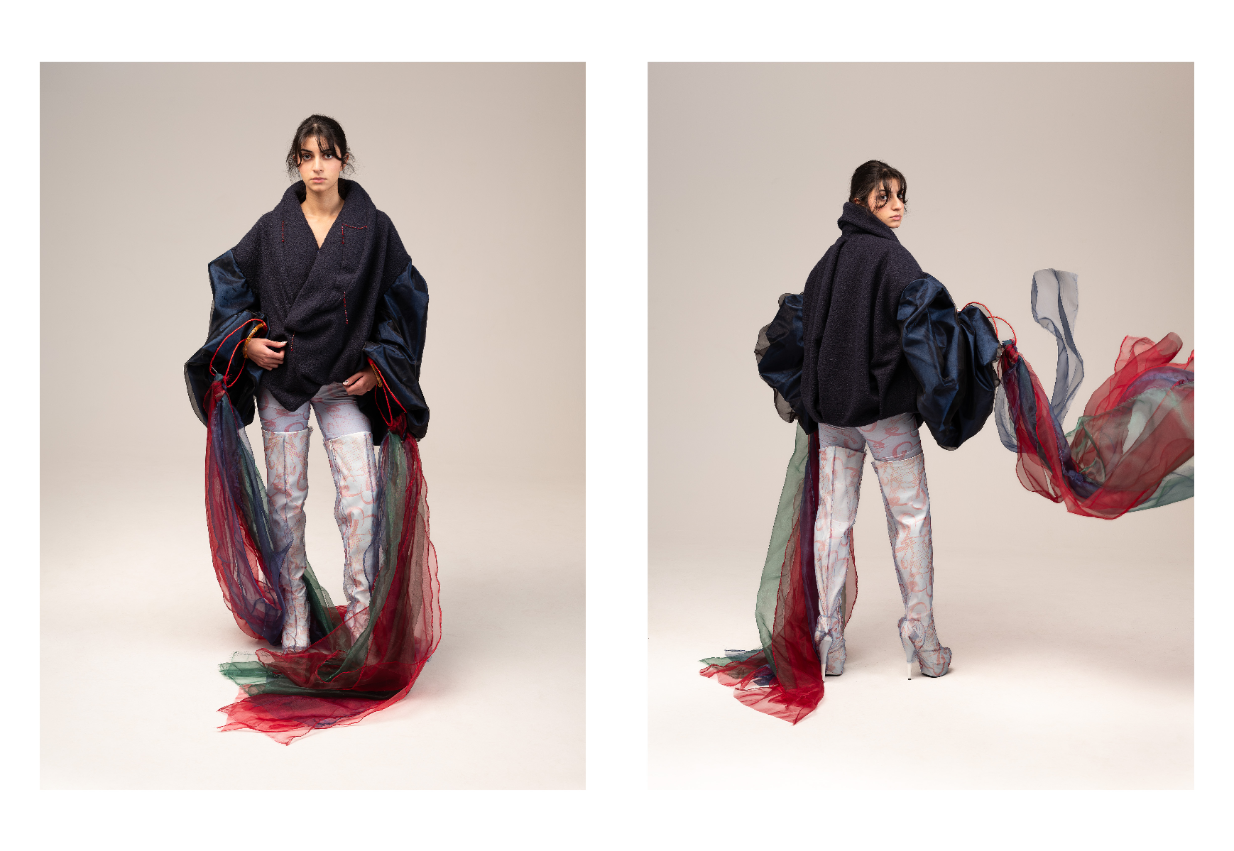 Sapience Veneer is my graduate collection for my undergraduate studies at ECA. The collection explores a wide scope of concepts, from traditional Korean folk religion (Mu-soak) to my personal journey of overcoming insecurities related to my skin. It draws parallel between the shamanic figures of Mu-soak who are "chosen" by god to serve the role regardless of their own will, and my own journey of overcoming skin insecurities which also came to me against my will. Sapience Veneer delivers a message about self-acceptance and love. Sheer, iridescent fabrics like organza act as a second skin, not to conceal, but to reveal. They catch the light, creating a shimmering, almost ethereal shell that represents the beautiful, fragile layer one must break through on the journey to self-acceptance. By exploring fashion’s role as a “cover” and examining how we dress to communicate our ideal selves with others, the collection showcases a 6 look journey that uses sculptural metal and draped soft accessories and accessorizing garments as key statement while maintaining the wearable aspect of RTW fashion.