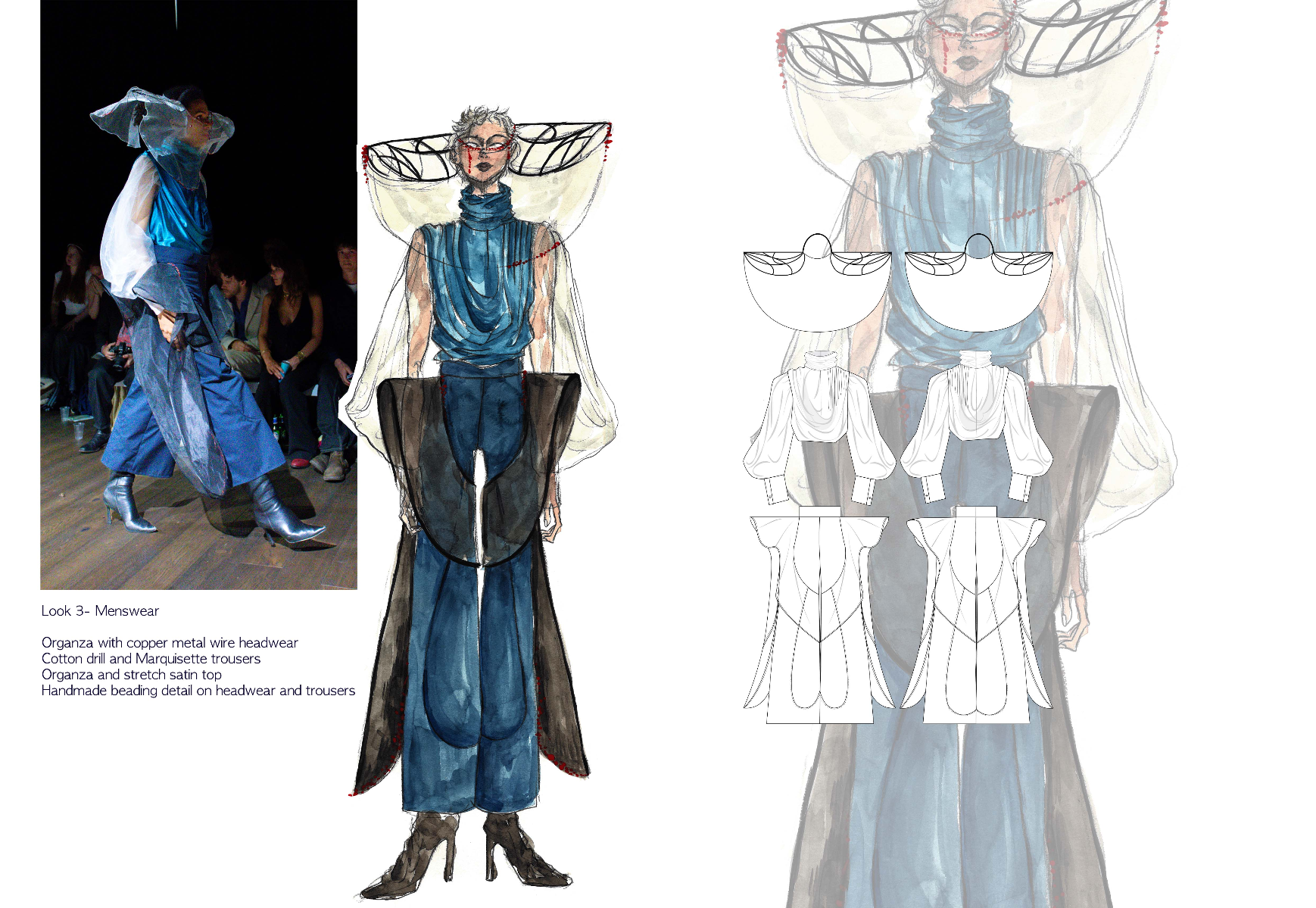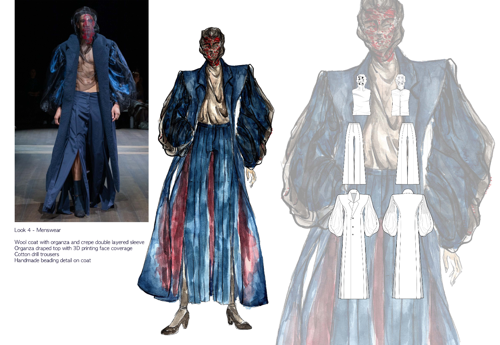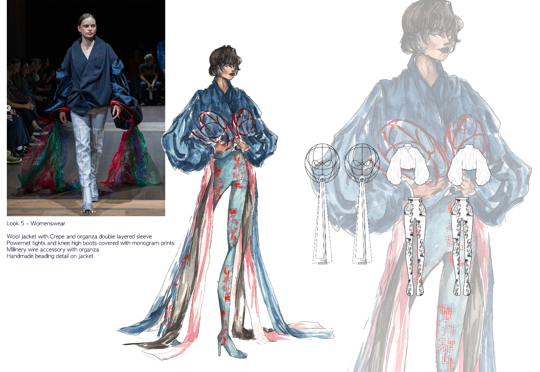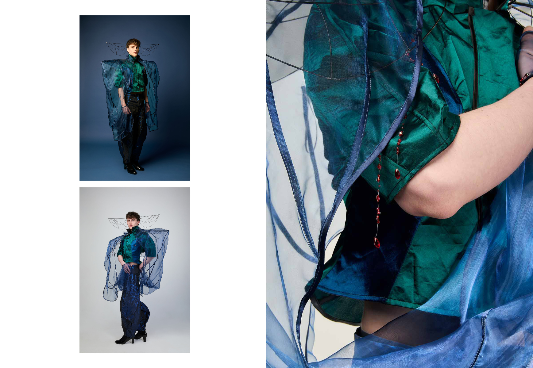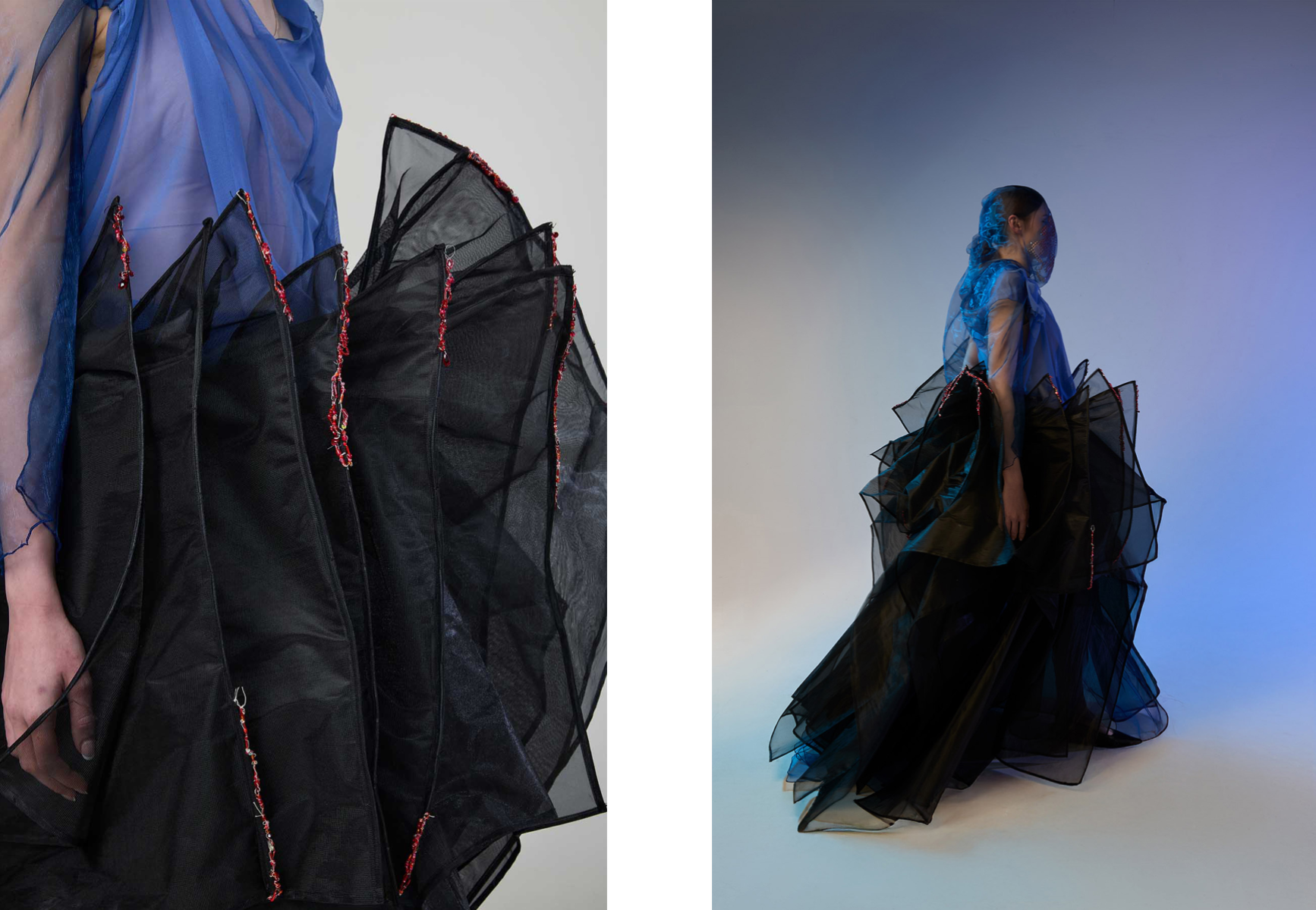 Sapience Veneer is my graduate collection for my undergraduate studies at ECA. The collection explores a wide scope of concepts, from traditional Korean folk religion (Mu-soak) to my personal journey of overcoming insecurities related to my skin. It draws parallel between the shamanic figures of Mu-soak who are "chosen" by god to serve the role regardless of their own will, and my own journey of overcoming skin insecurities which also came to me against my will. Sapience Veneer delivers a message about self-acceptance and love. Sheer, iridescent fabrics like organza act as a second skin, not to conceal, but to reveal. They catch the light, creating a shimmering, almost ethereal shell that represents the beautiful, fragile layer one must break through on the journey to self-acceptance. By exploring fashion’s role as a “cover” and examining how we dress to communicate our ideal selves with others, the collection showcases a 6 look journey that uses sculptural metal and draped soft accessories and accessorizing garments as key statement while maintaining the wearable aspect of RTW fashion.
