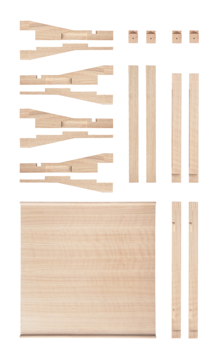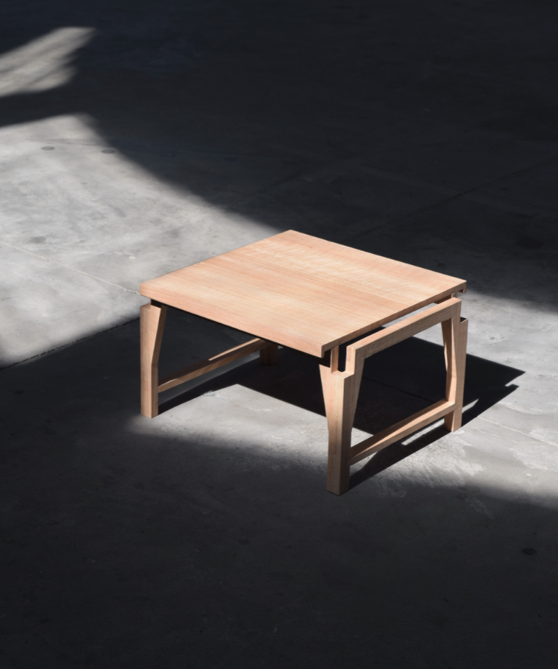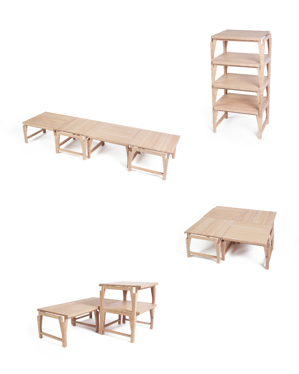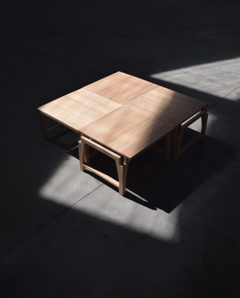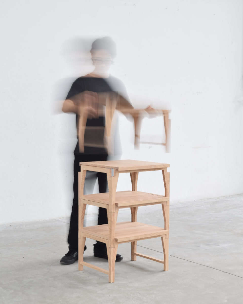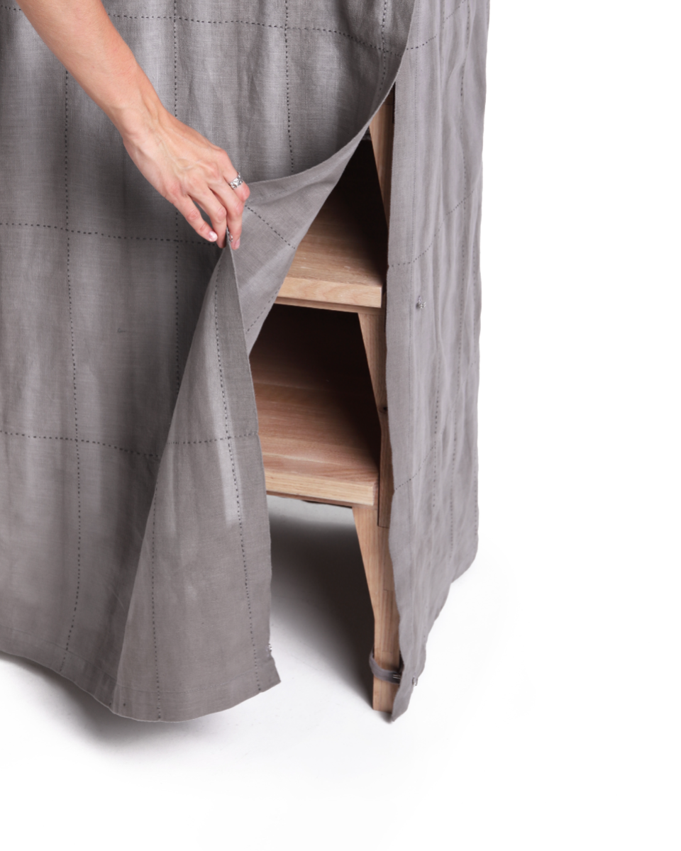 Tekto is a modular piece of furniture designed as an ergonomic and mobile workstation for craft-based work in domestic environments. It consists of four identical modules – tables that can be connected either horizontally or vertically. The modular construction allows the furniture to be used comfortably in various body positions and to be easily reconfigured, adapting its layout to different spaces and individual user needs. Its simple form and flexible configuration make it a versatile solution, suitable not only for homes but also for hospitality spaces (as a mobile counter or coffee table), schools (as a play station or storage unit), as well as retail or pop-up spaces (as an adaptable display base). An additional element of the furniture is a textile cover that conceals items stored on the shelving, helping to maintain order. The decorative pattern of the cover was designed to harmonise with the form and structure of the unit. The four-module set presented in the project represents only the basic version of the system, which, thanks to its modular structure, can be further developed with additional segments as well as entirely new elements – for example, an attachable tabletop that transforms it into a full-size desk. This allows for the creation of larger and more diverse configurations. The project draws on traditional Japanese woodworking and textile decoration techniques. The frame is made of red oak using the sashimono technique, which involves precise wooden joinery without metal fasteners. The cover is sewn from ramie fabric, dyed with oak bark using the shibori method, which creates organic and unique patterns. The entire piece is finished with hand-stitched sashiko embroidery that complements the pattern formed during the dyeing process.