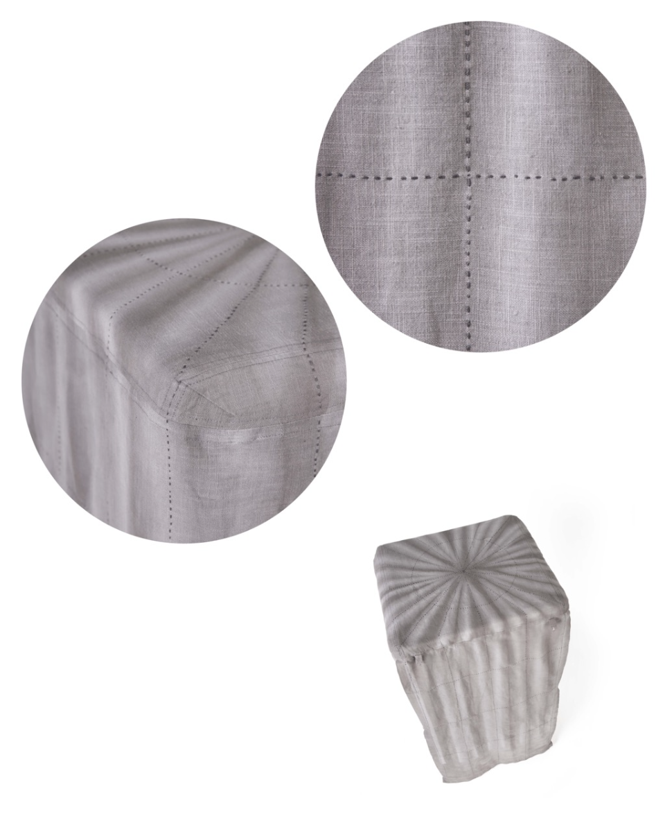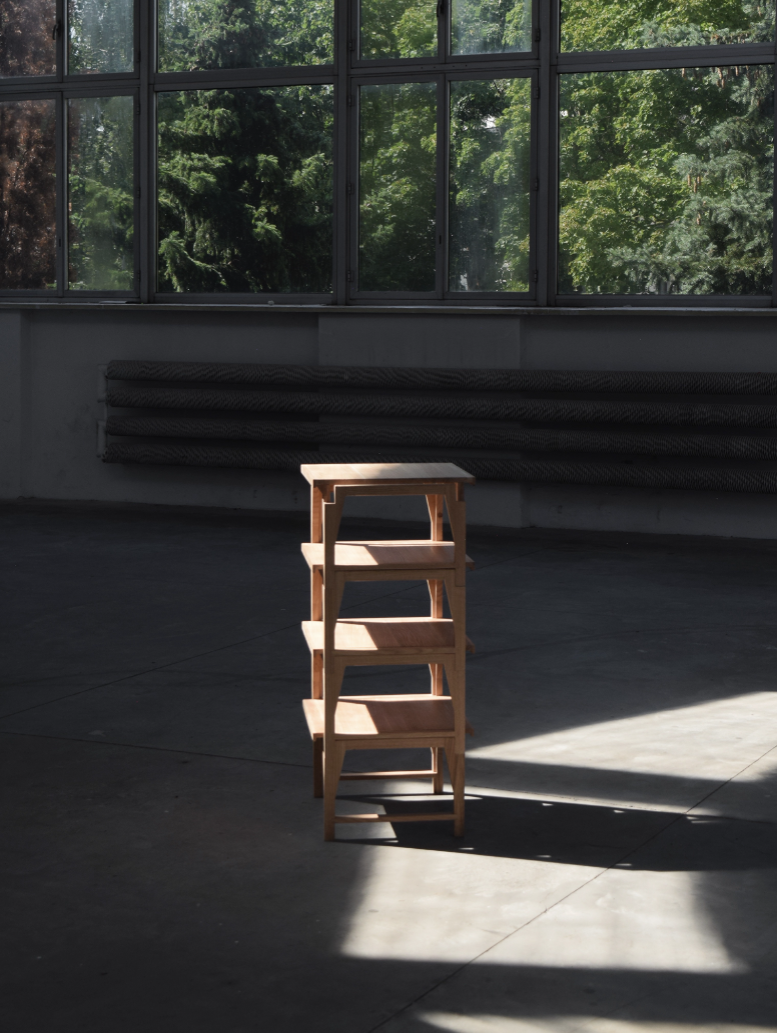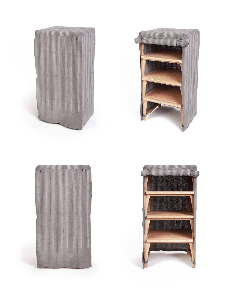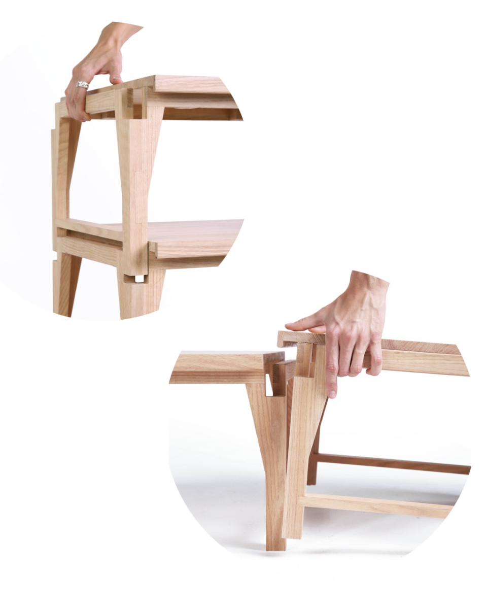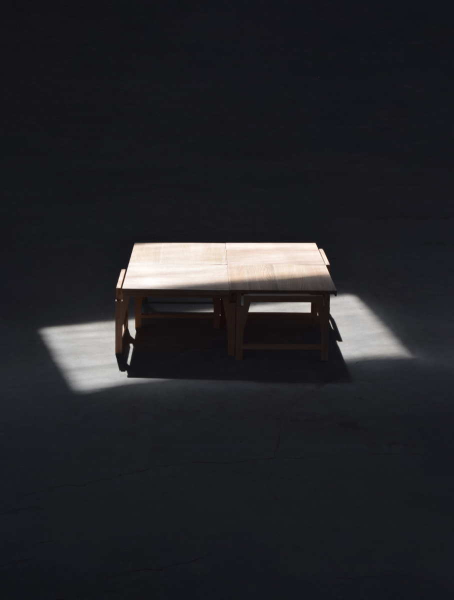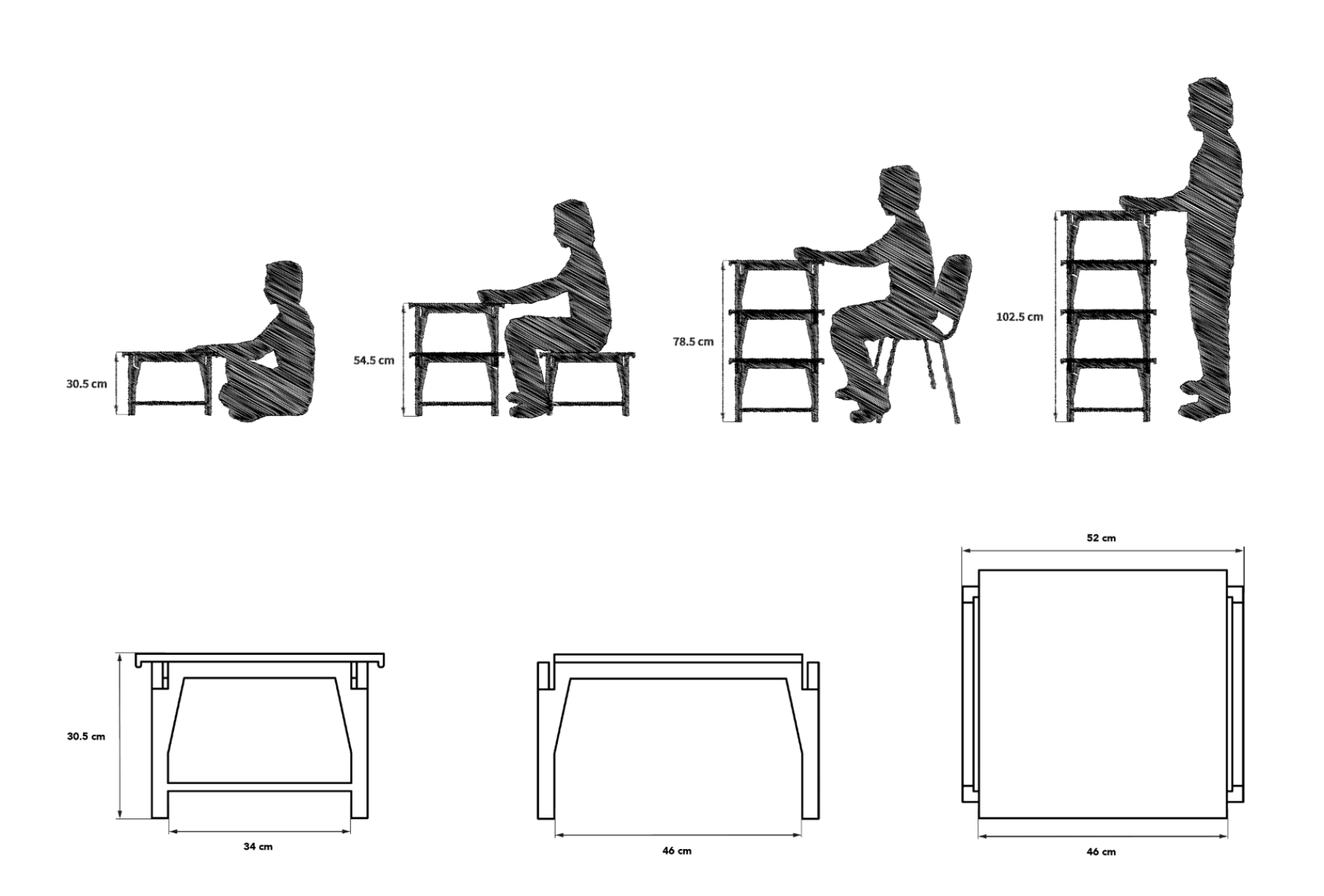 Tekto is a modular piece of furniture designed as an ergonomic and mobile workstation for craft-based work in domestic environments. It consists of four identical modules – tables that can be connected either horizontally or vertically. The modular construction allows the furniture to be used comfortably in various body positions and to be easily reconfigured, adapting its layout to different spaces and individual user needs. Its simple form and flexible configuration make it a versatile solution, suitable not only for homes but also for hospitality spaces (as a mobile counter or coffee table), schools (as a play station or storage unit), as well as retail or pop-up spaces (as an adaptable display base). An additional element of the furniture is a textile cover that conceals items stored on the shelving, helping to maintain order. The decorative pattern of the cover was designed to harmonise with the form and structure of the unit. The four-module set presented in the project represents only the basic version of the system, which, thanks to its modular structure, can be further developed with additional segments as well as entirely new elements – for example, an attachable tabletop that transforms it into a full-size desk. This allows for the creation of larger and more diverse configurations. The project draws on traditional Japanese woodworking and textile decoration techniques. The frame is made of red oak using the sashimono technique, which involves precise wooden joinery without metal fasteners. The cover is sewn from ramie fabric, dyed with oak bark using the shibori method, which creates organic and unique patterns. The entire piece is finished with hand-stitched sashiko embroidery that complements the pattern formed during the dyeing process.
