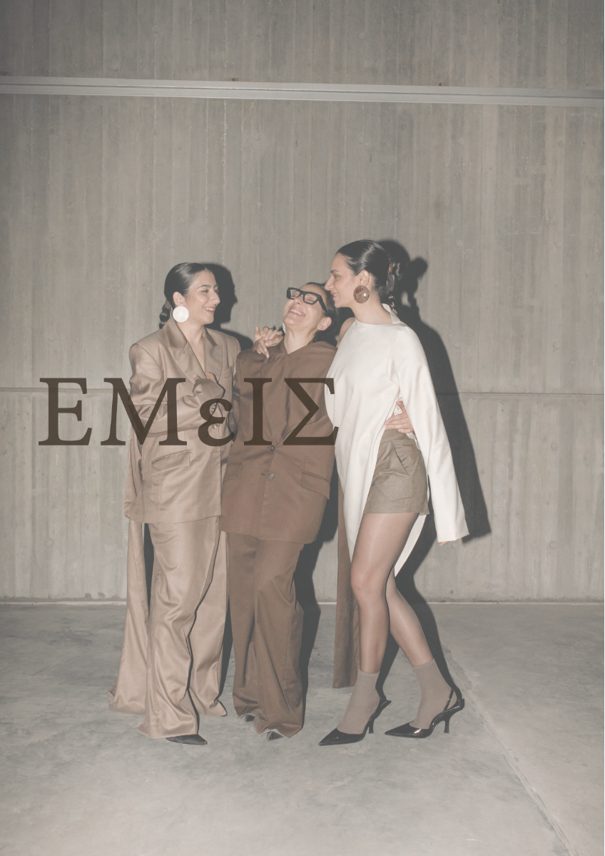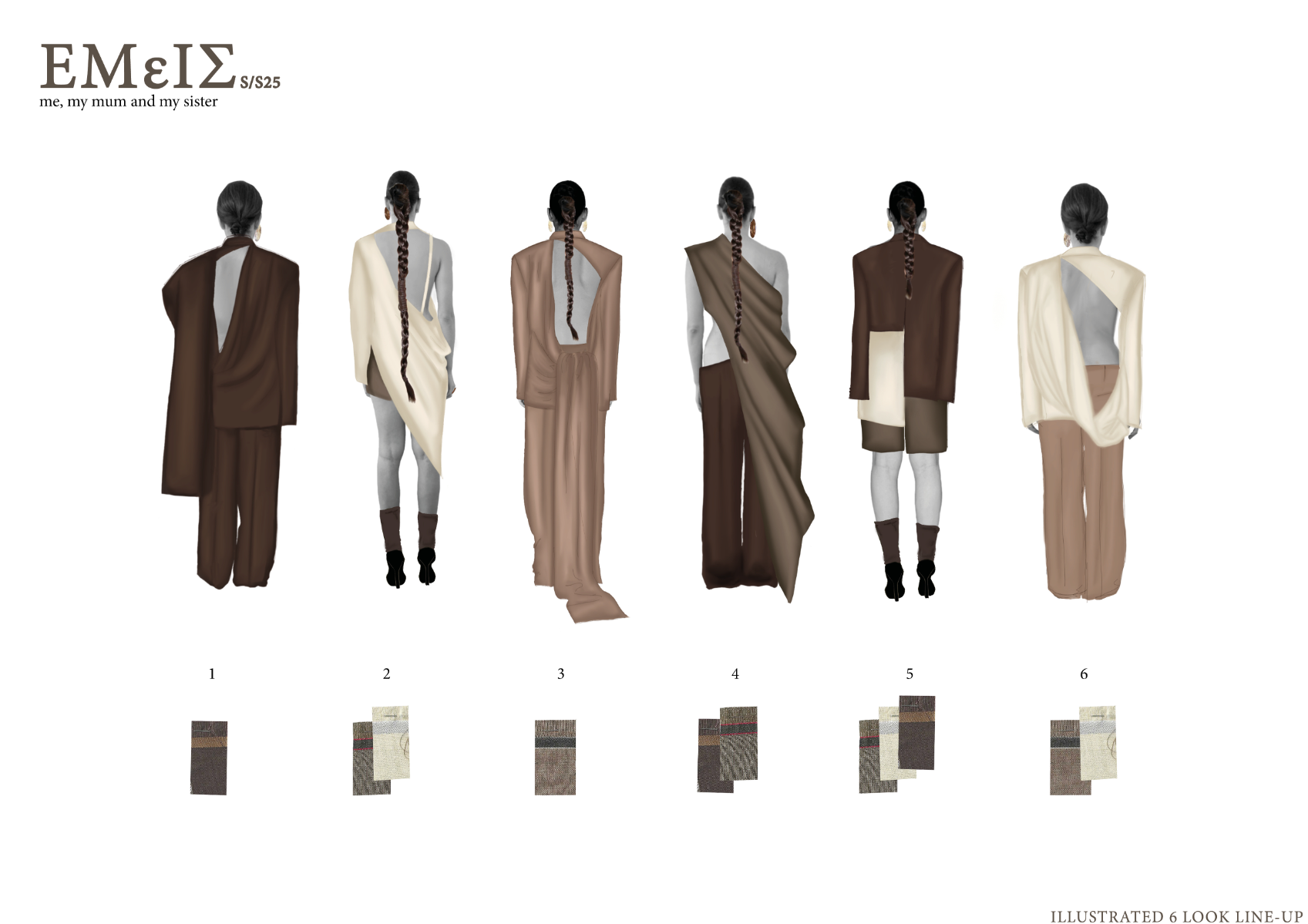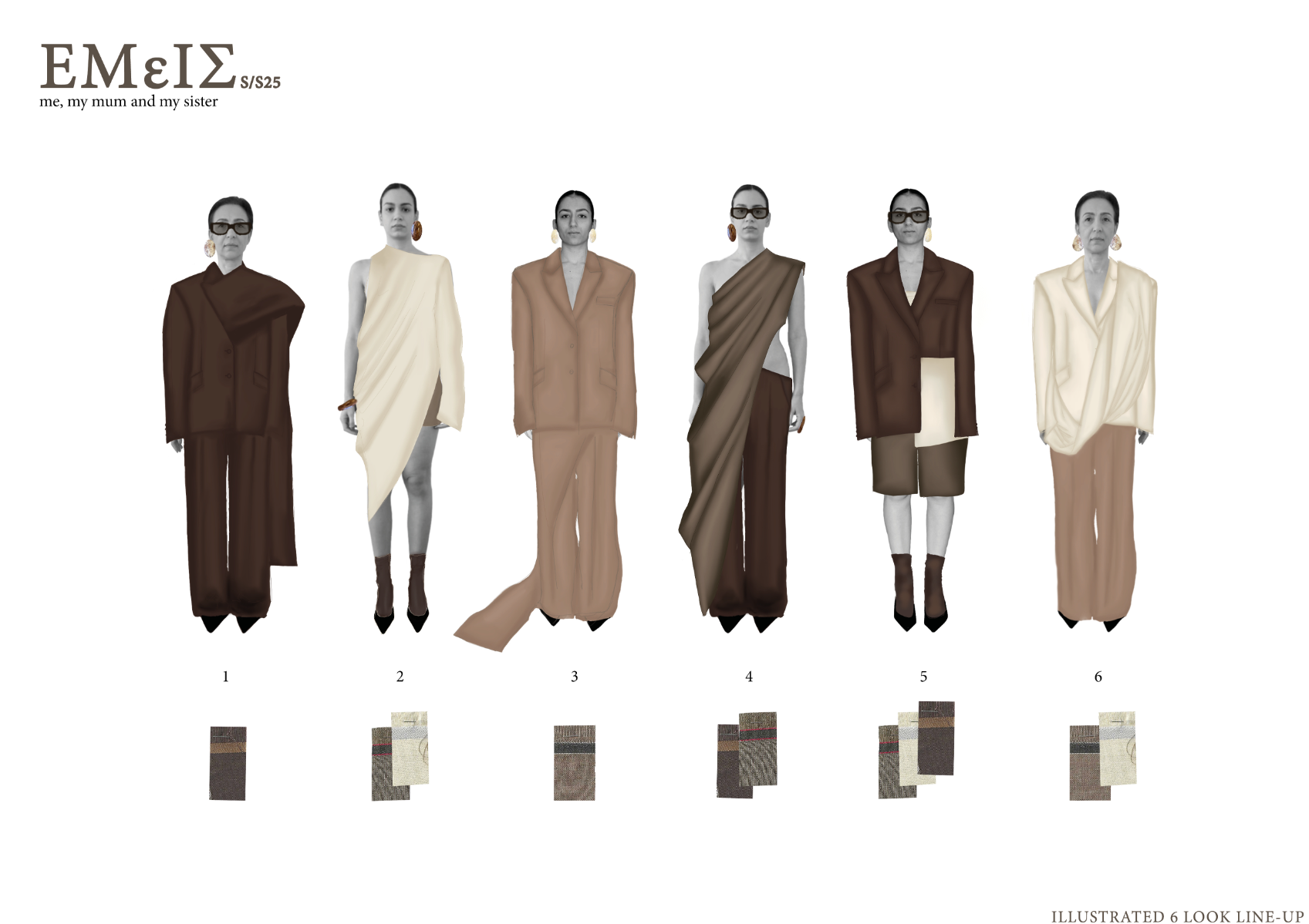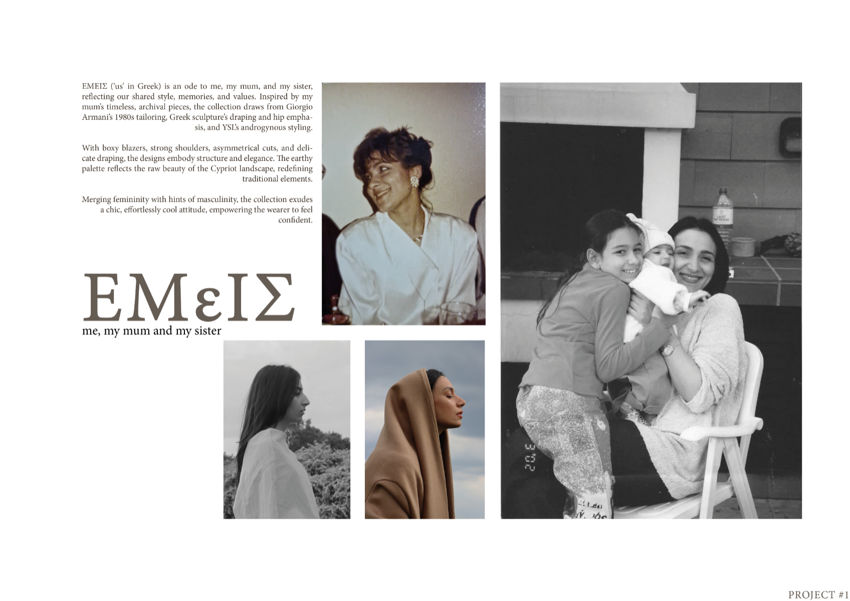 ΕΜΕΙΣ (‘us’ in Greek) is an ode to me, my mum, and my sister, reflecting our shared style, memories, and values. Inspired by my mum’s timeless, archival pieces, the collection draws from Giorgio Armani’s 1980s tailoring, Greek sculpture’s draping and hip empha- sis, and YSL’s androgynous styling. With boxy blazers, strong shoulders, asymmetrical cuts, and deli- cate draping, the designs embody structure and elegance. The earthy palette reflects the raw beauty of the Cypriot landscape, redefining traditional elements. Merging femininity with hints of masculinity, the collection exudes a chic, effortlessly cool attitude, empowering the wearer to feel confident.