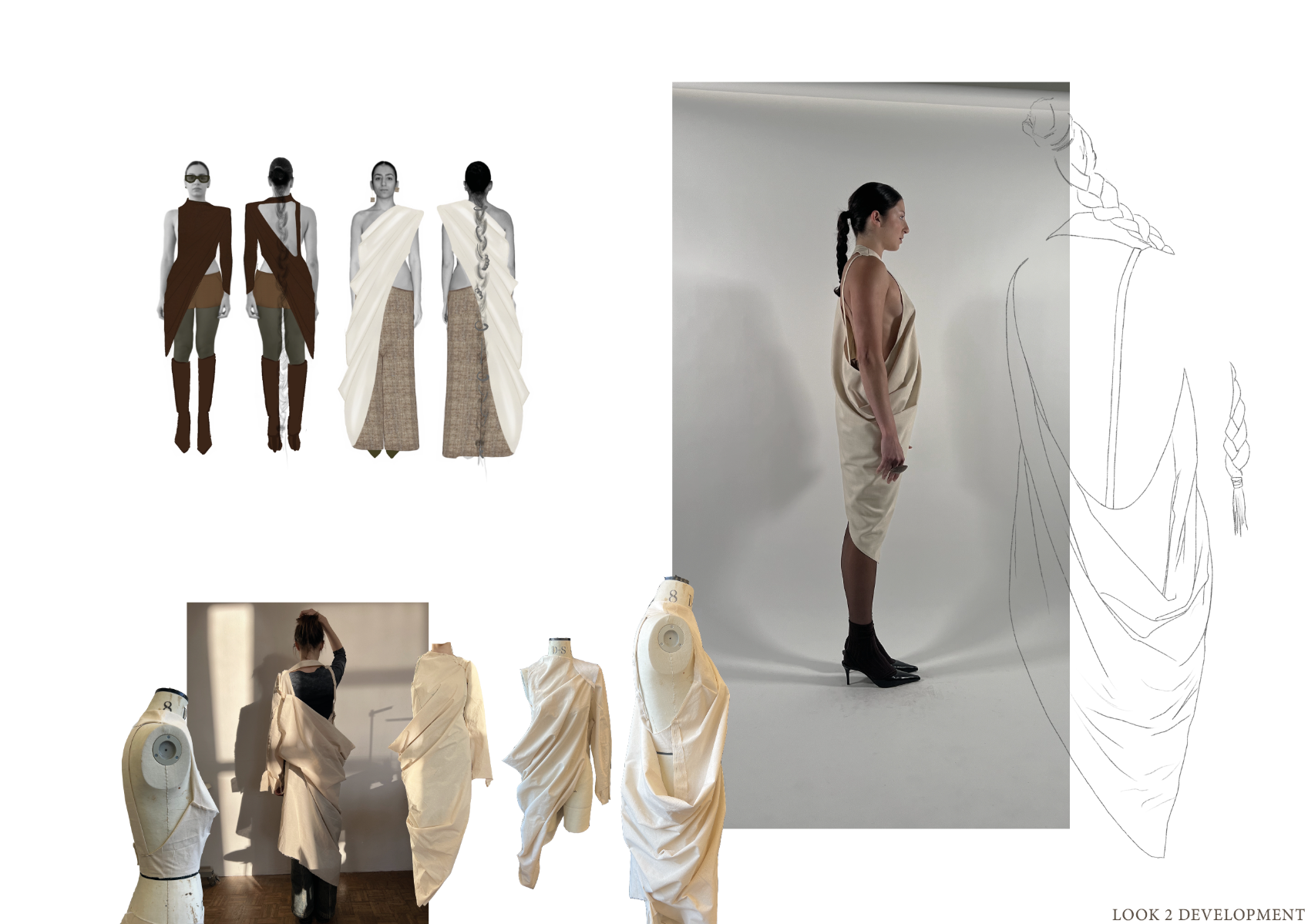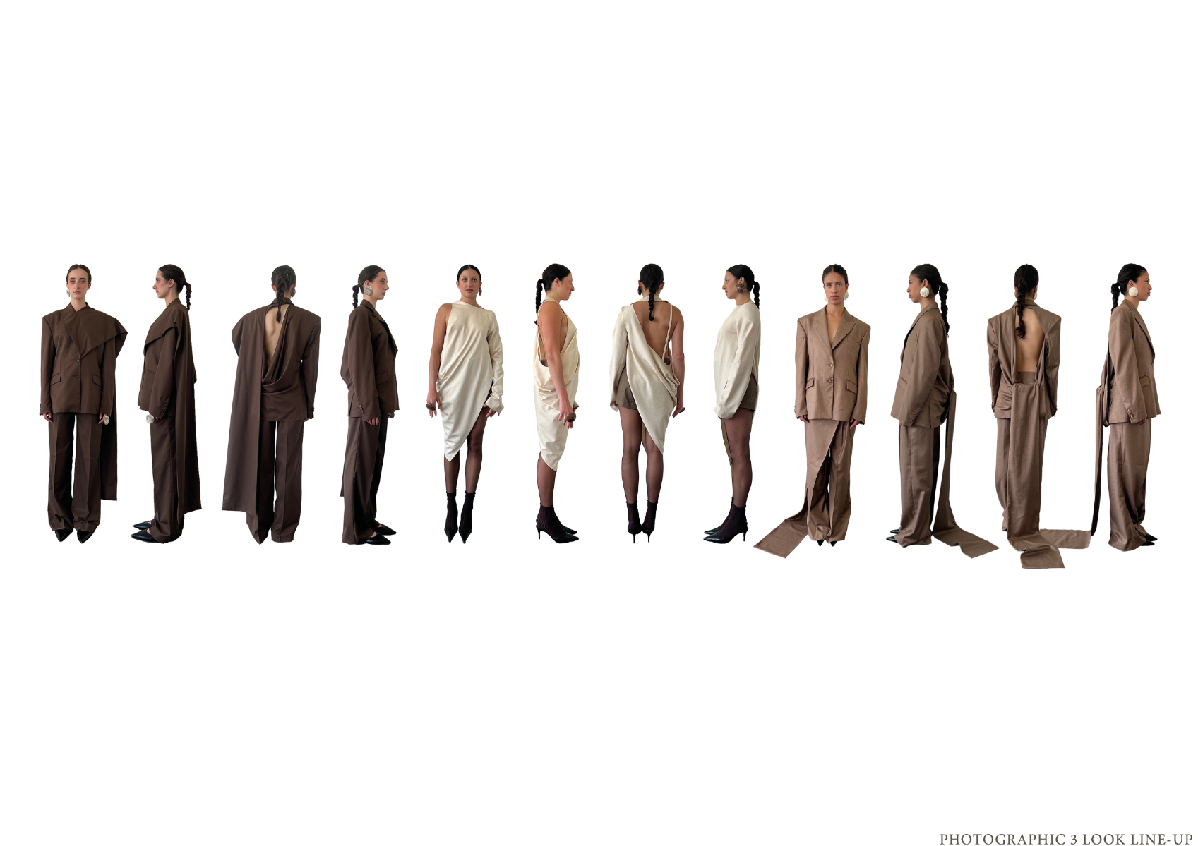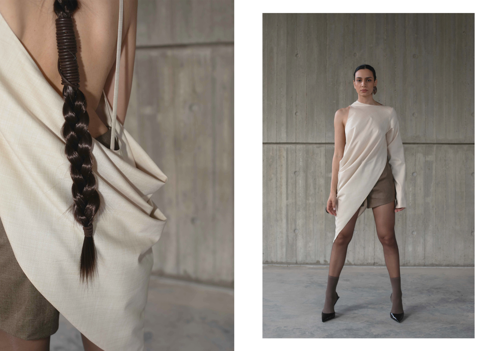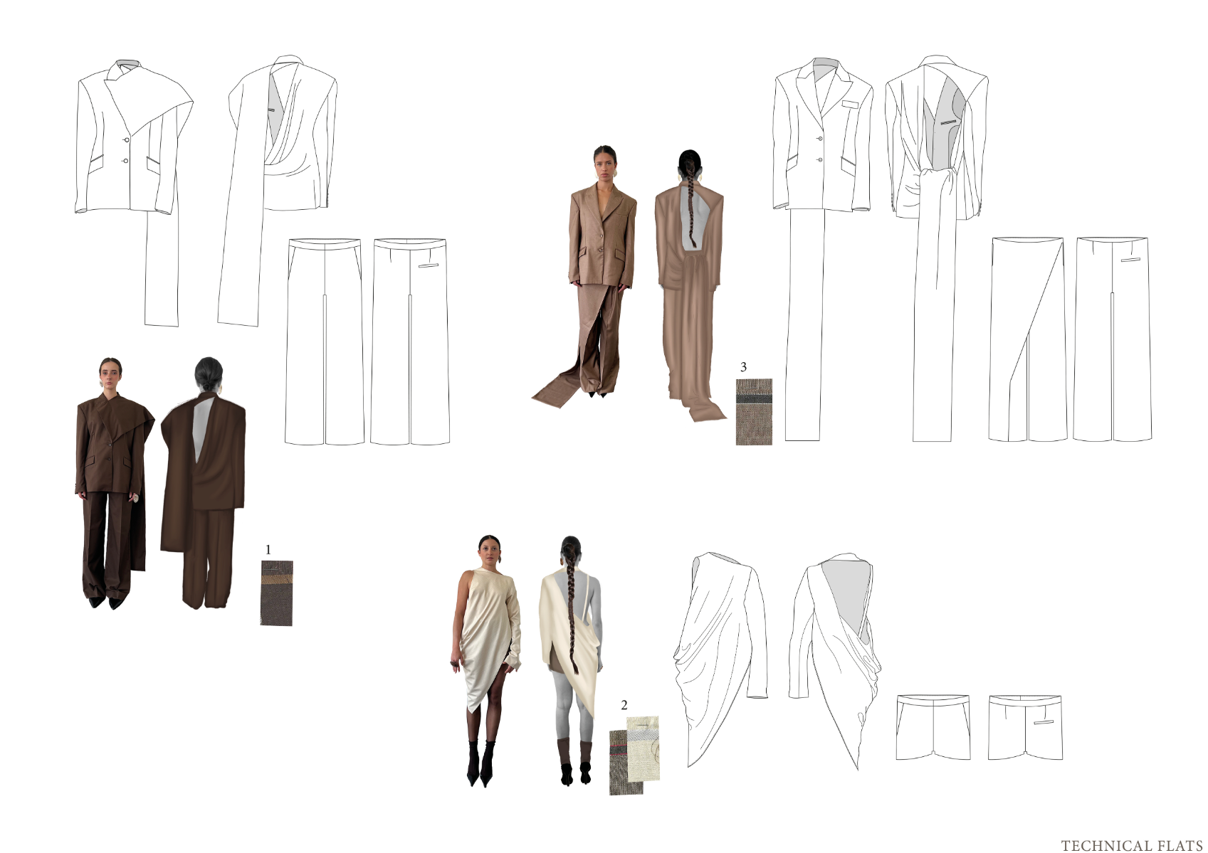 ΕΜΕΙΣ (‘us’ in Greek) is an ode to me, my mum, and my sister, reflecting our shared style, memories, and values. Inspired by my mum’s timeless, archival pieces, the collection draws from Giorgio Armani’s 1980s tailoring, Greek sculpture’s draping and hip empha- sis, and YSL’s androgynous styling. With boxy blazers, strong shoulders, asymmetrical cuts, and deli- cate draping, the designs embody structure and elegance. The earthy palette reflects the raw beauty of the Cypriot landscape, redefining traditional elements. Merging femininity with hints of masculinity, the collection exudes a chic, effortlessly cool attitude, empowering the wearer to feel confident.