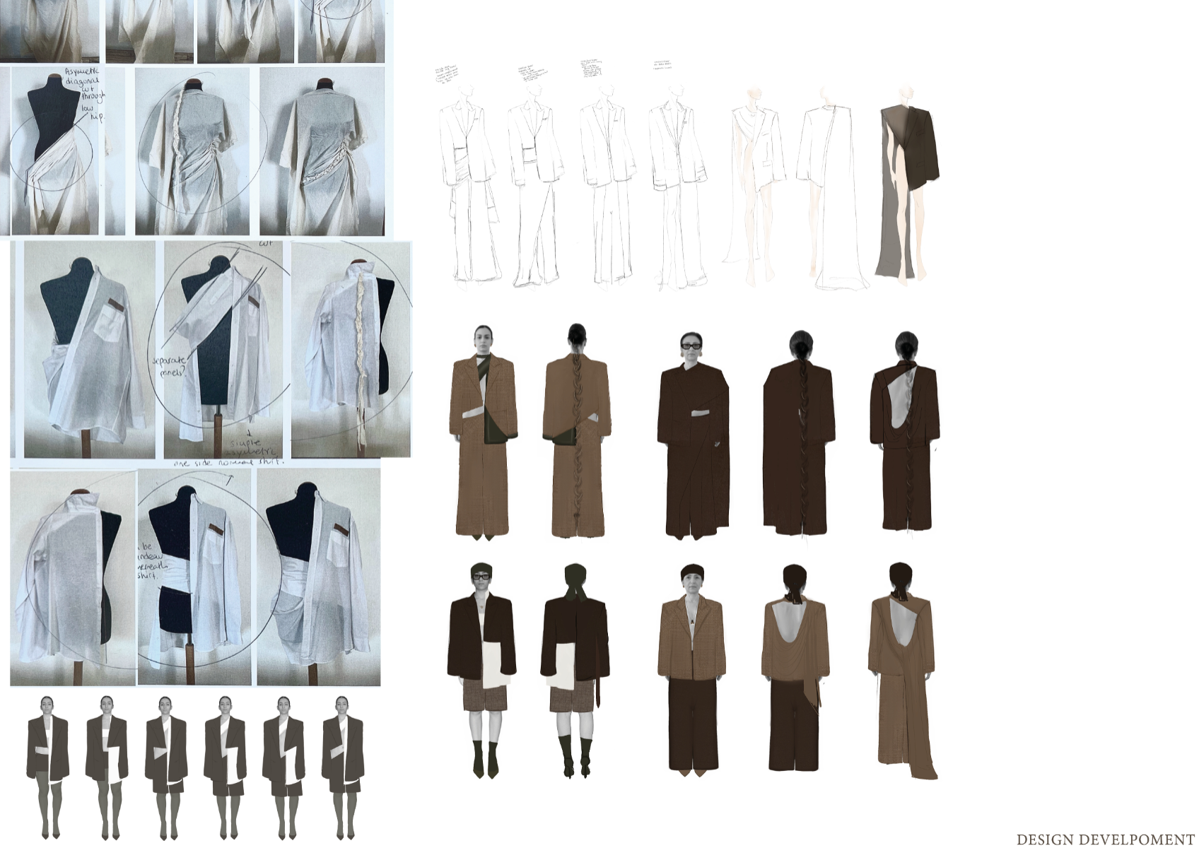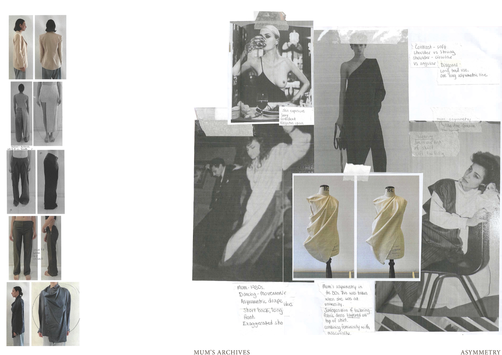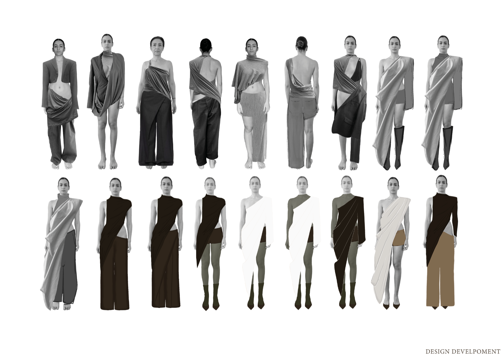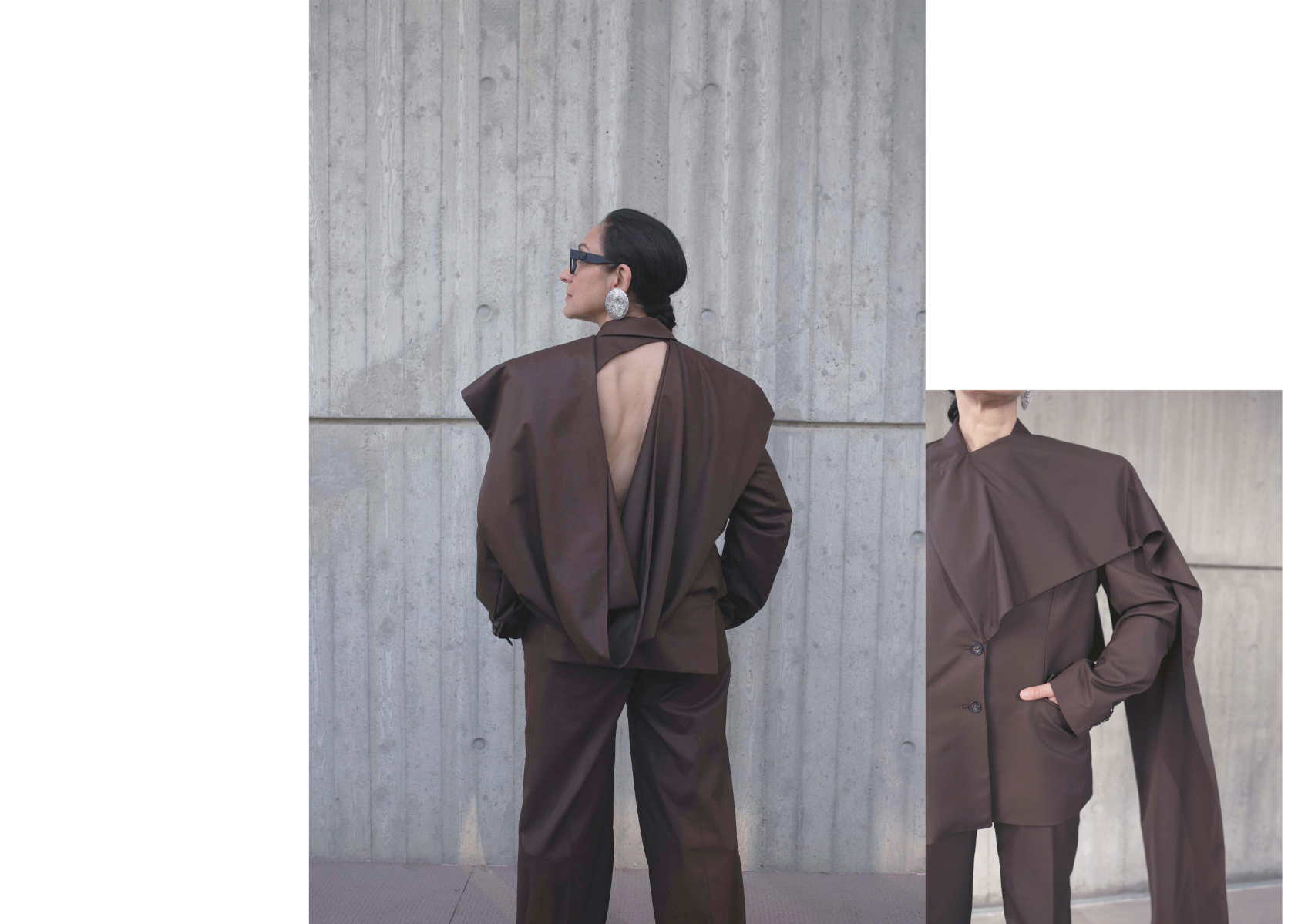 ΕΜΕΙΣ (‘us’ in Greek) is an ode to me, my mum, and my sister, reflecting our shared style, memories, and values. Inspired by my mum’s timeless, archival pieces, the collection draws from Giorgio Armani’s 1980s tailoring, Greek sculpture’s draping and hip empha- sis, and YSL’s androgynous styling. With boxy blazers, strong shoulders, asymmetrical cuts, and deli- cate draping, the designs embody structure and elegance. The earthy palette reflects the raw beauty of the Cypriot landscape, redefining traditional elements. Merging femininity with hints of masculinity, the collection exudes a chic, effortlessly cool attitude, empowering the wearer to feel confident.