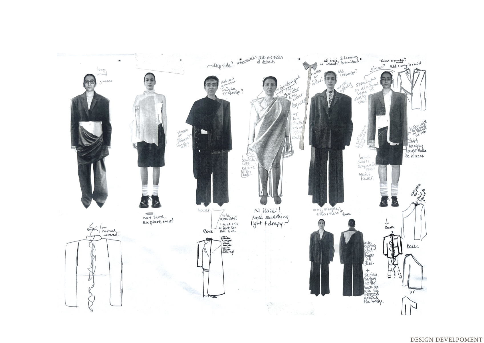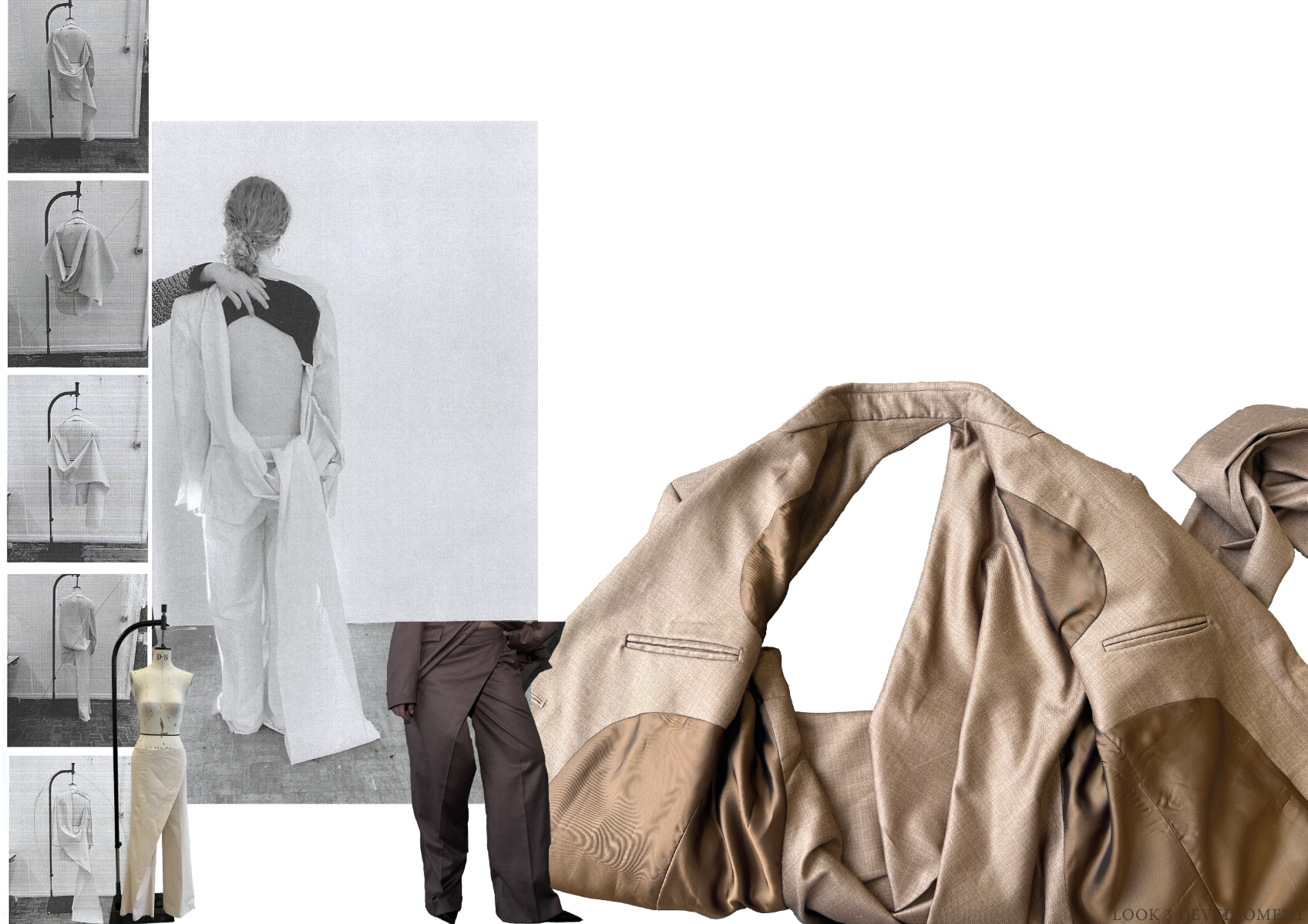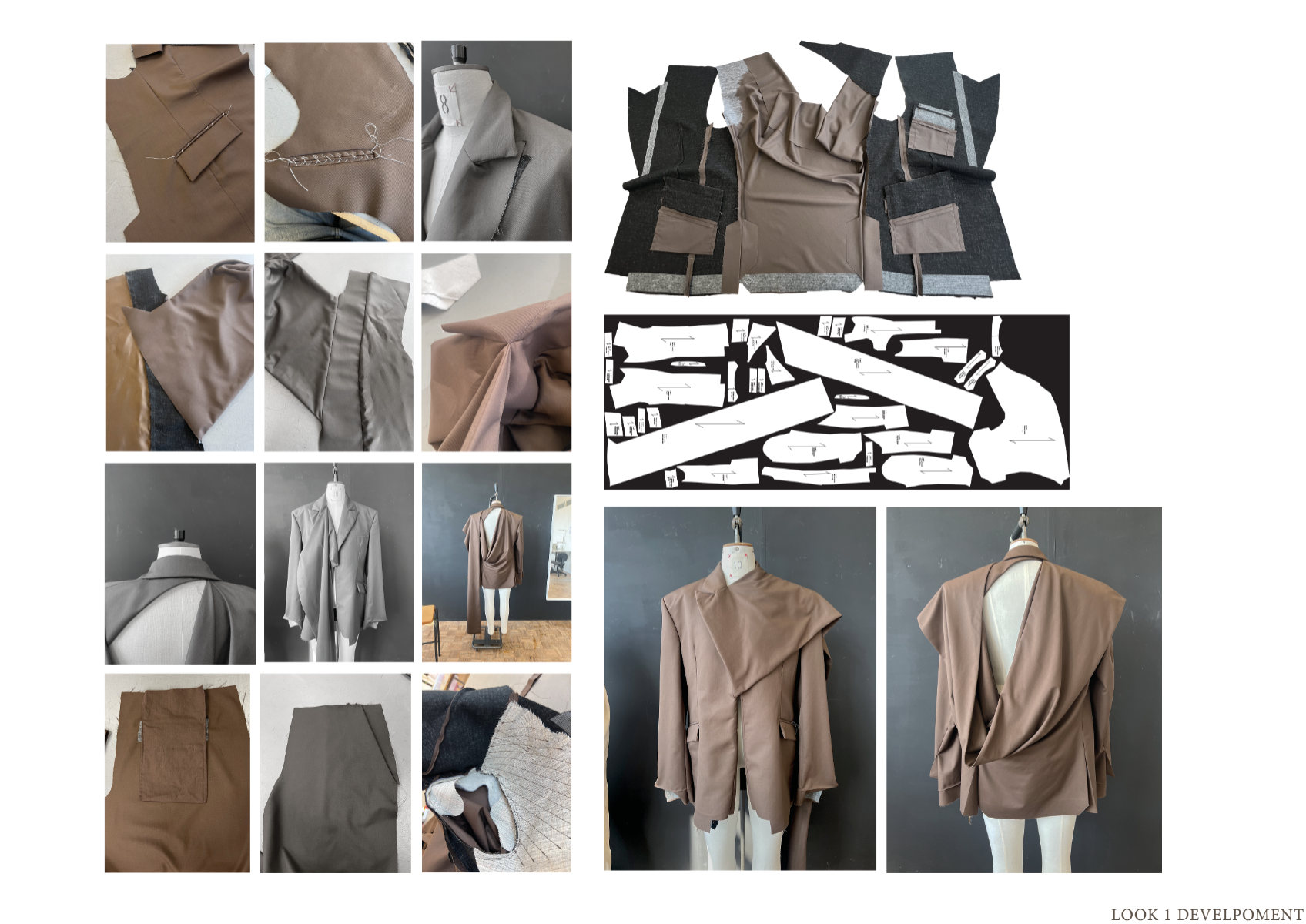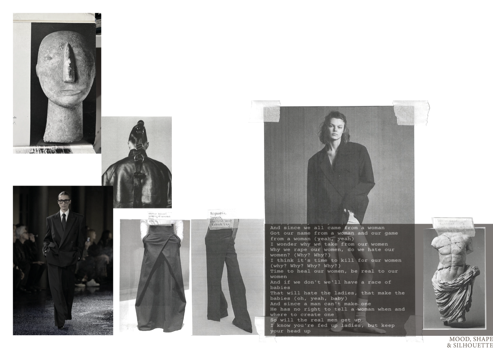 ΕΜΕΙΣ (‘us’ in Greek) is an ode to me, my mum, and my sister, reflecting our shared style, memories, and values. Inspired by my mum’s timeless, archival pieces, the collection draws from Giorgio Armani’s 1980s tailoring, Greek sculpture’s draping and hip empha- sis, and YSL’s androgynous styling. With boxy blazers, strong shoulders, asymmetrical cuts, and deli- cate draping, the designs embody structure and elegance. The earthy palette reflects the raw beauty of the Cypriot landscape, redefining traditional elements. Merging femininity with hints of masculinity, the collection exudes a chic, effortlessly cool attitude, empowering the wearer to feel confident.