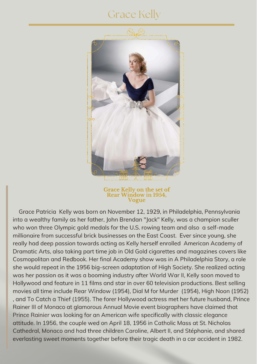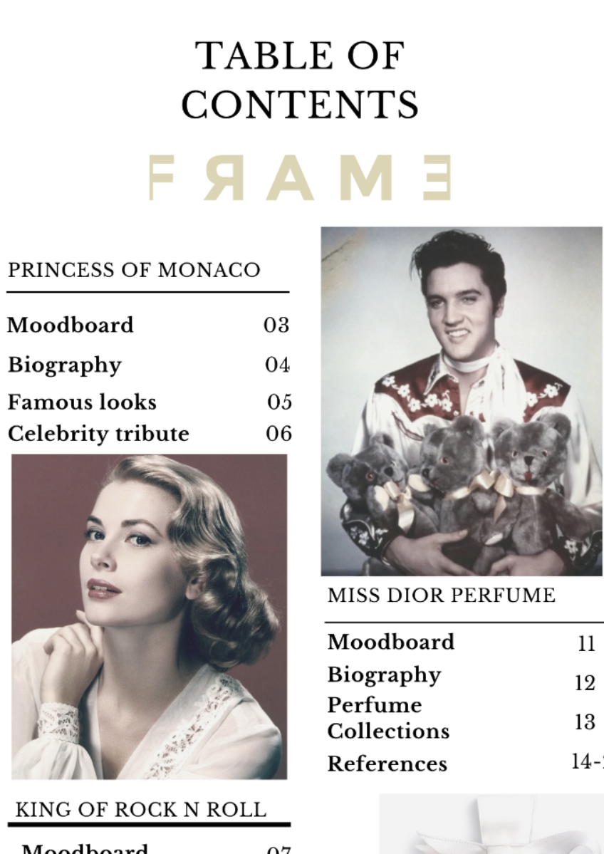 This project was made purposely on highlighting two of the important fashion trend setters: Elvis Presley and Grace Kelly. While also discussing the unique story behind Miss Dior pErfume, named after Catherine Dior, the designers sister's name.