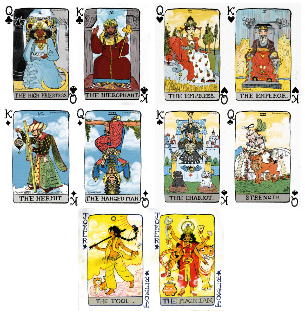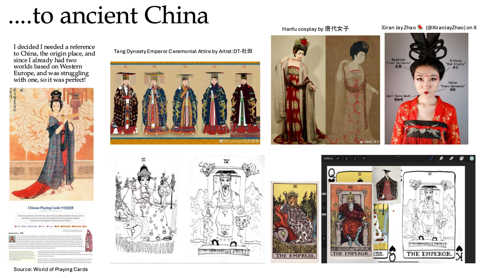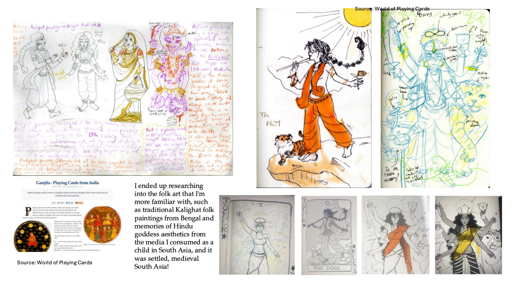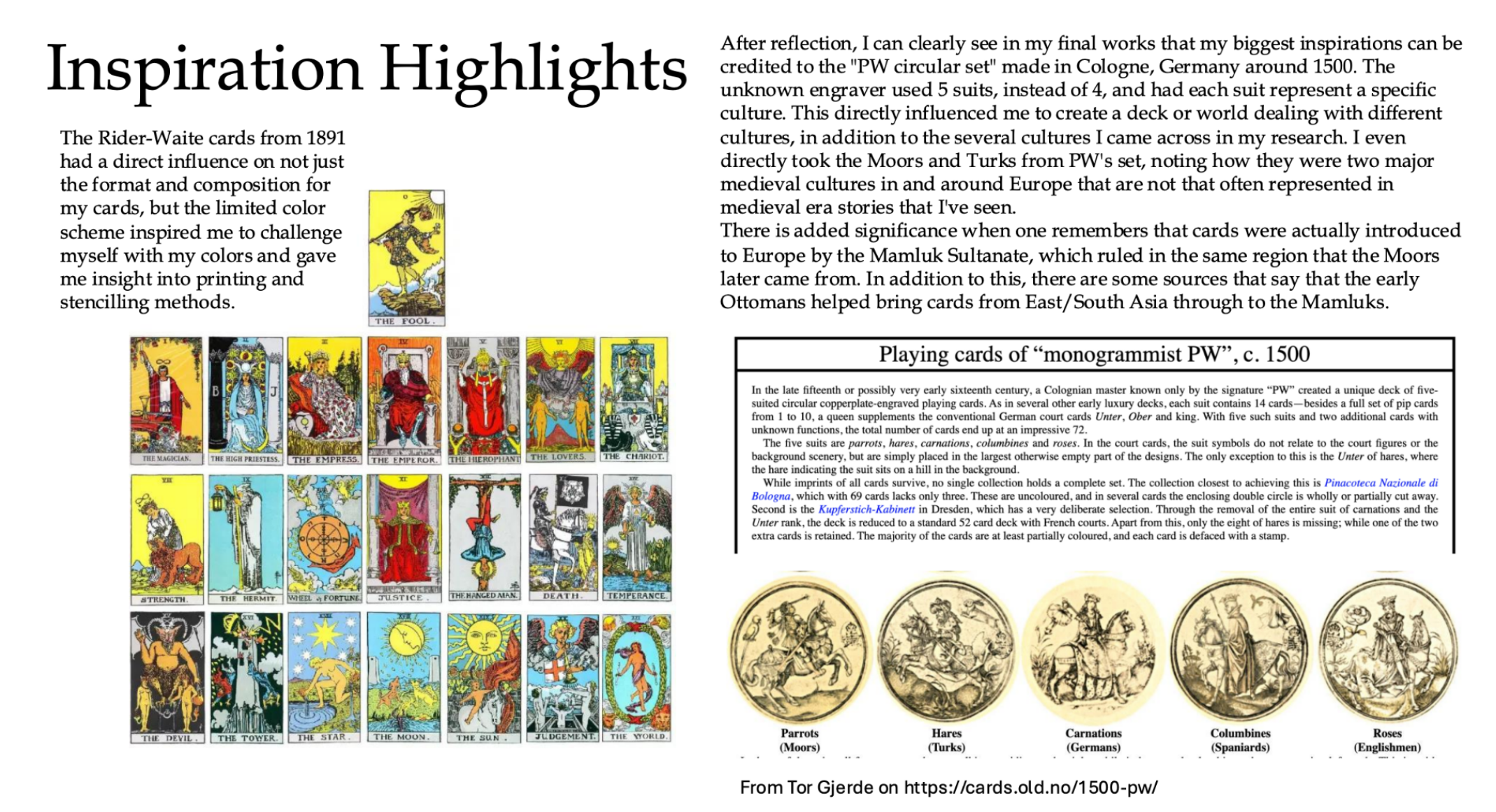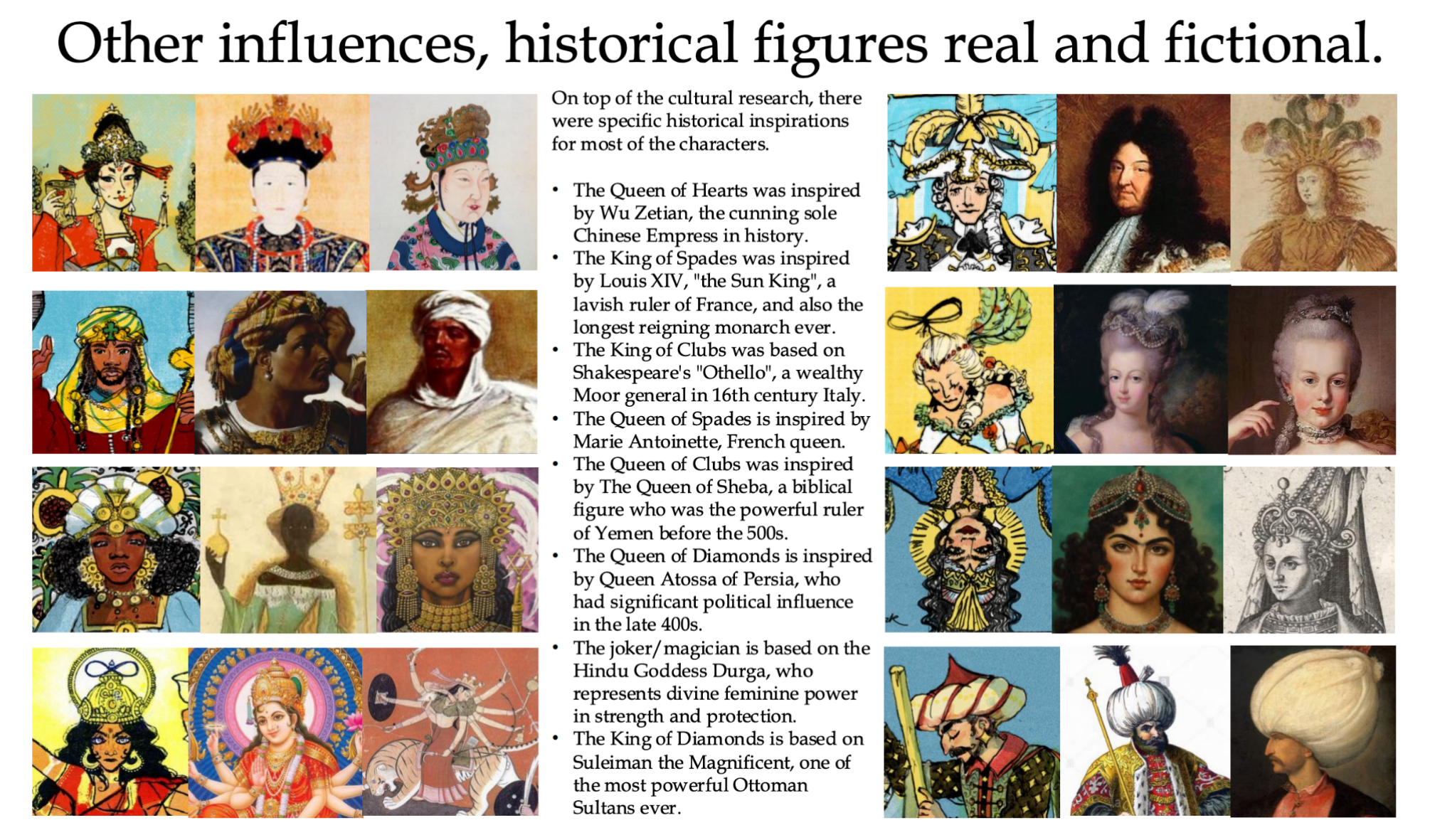 A tale of five suits tells the story of an original high fantasy world based on the forgotten ethnodiversity of Medieval times and the lore behind playing cards and tarot, through a deck of dual-play (playable as both classic and tarot) cards. The history of playing cards is a culmination of so many different cultures, which is not well remembered in modern times. My cards showcased clothes and cultures of the Ottoman Turks, Tang Dynasty China, the Mamluk empire, Moorish Spain, Chandra and Deva era Bengal, and Rococo France, chosen due to their distinct connections to playing card history. In my fictional world, each suit is a distinct kingdom with their own forms of magic and government. For my first drawings, I decided to depict the Queen and King of each respective kingdom, as well as the Joker cards from a different kingdom, in the form of the Major Arcana of the traditional Tarot lore. I hope to accomplish completing at least 8 other additional Tarot cards of the Major Arcana, digging deeper into the historic contexts, and having that reflect through my character design and technical artist, but eventually my goal is to have a whole deck, as well as a cohesive story that fits the Hero's Journey.