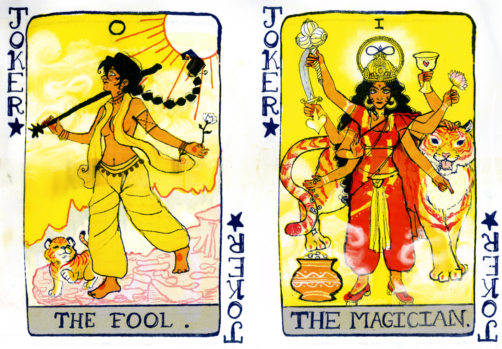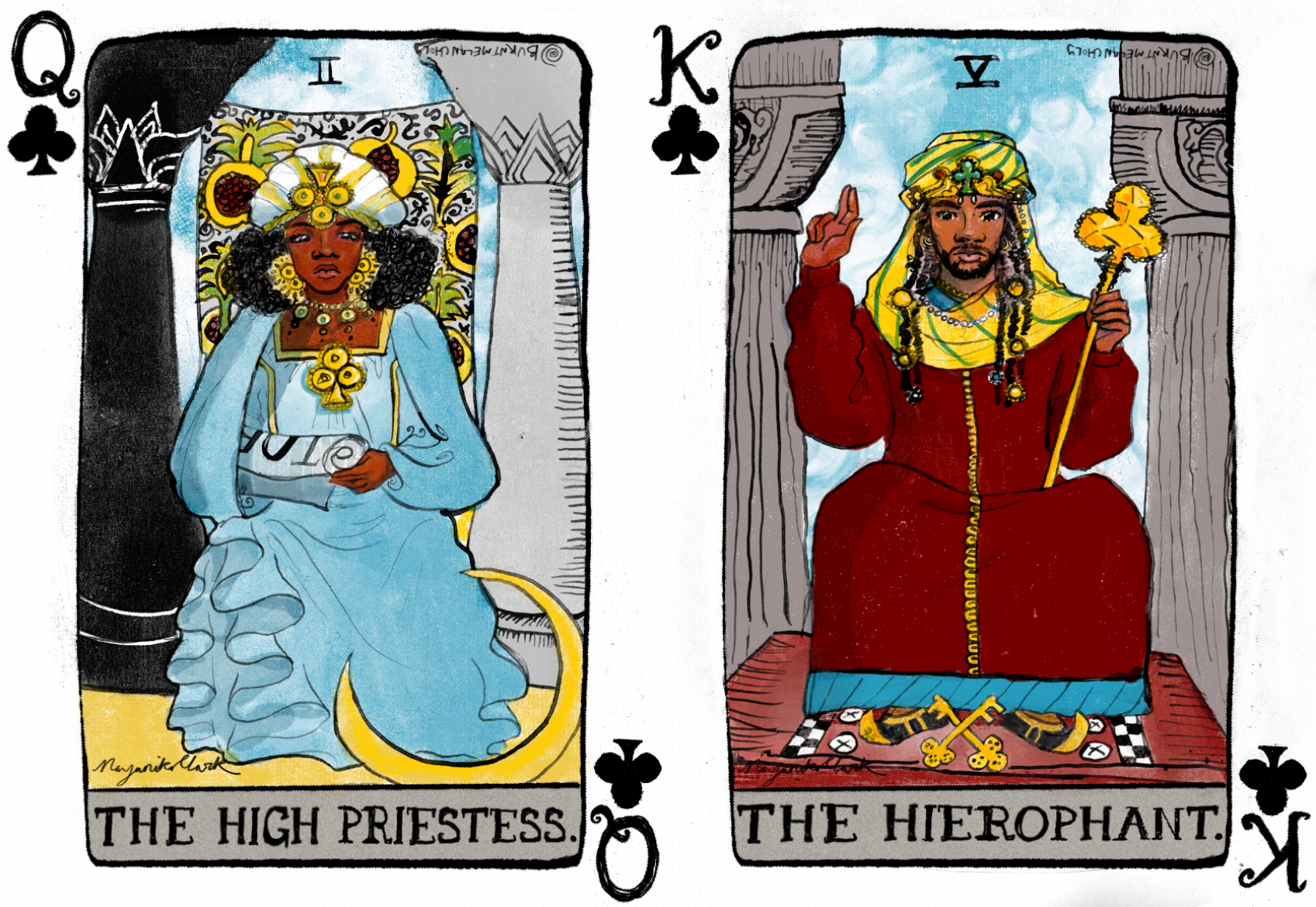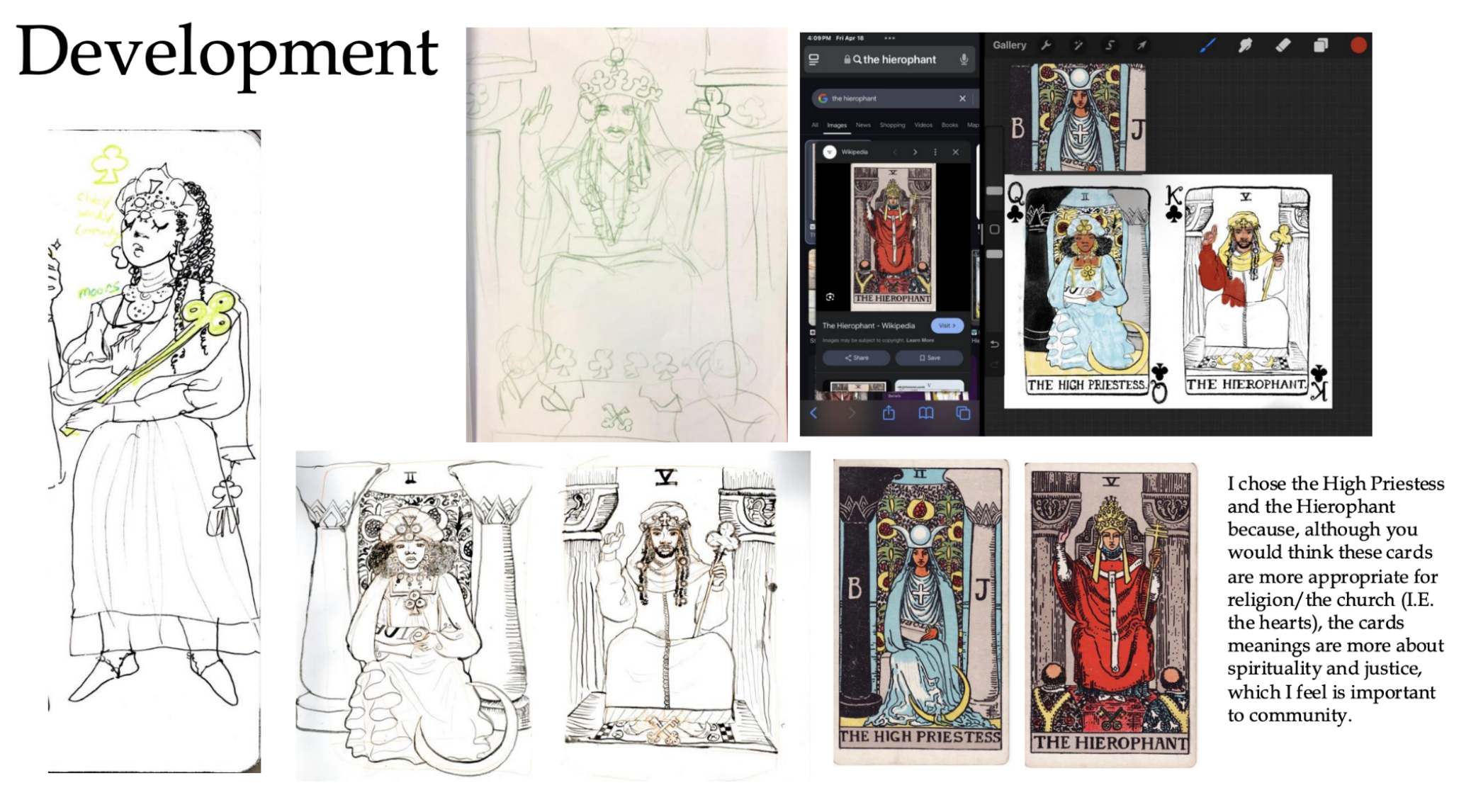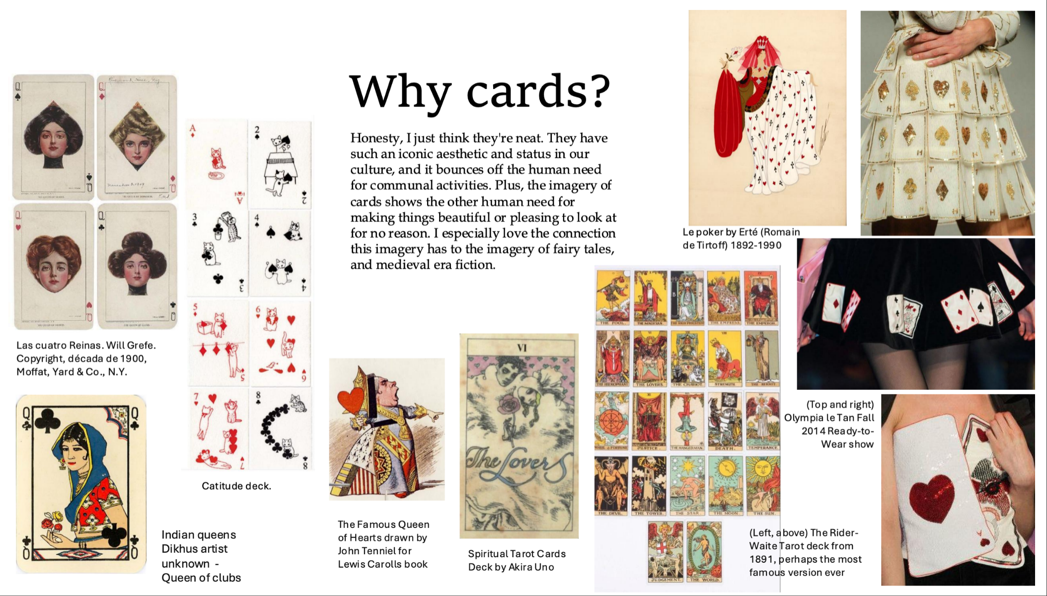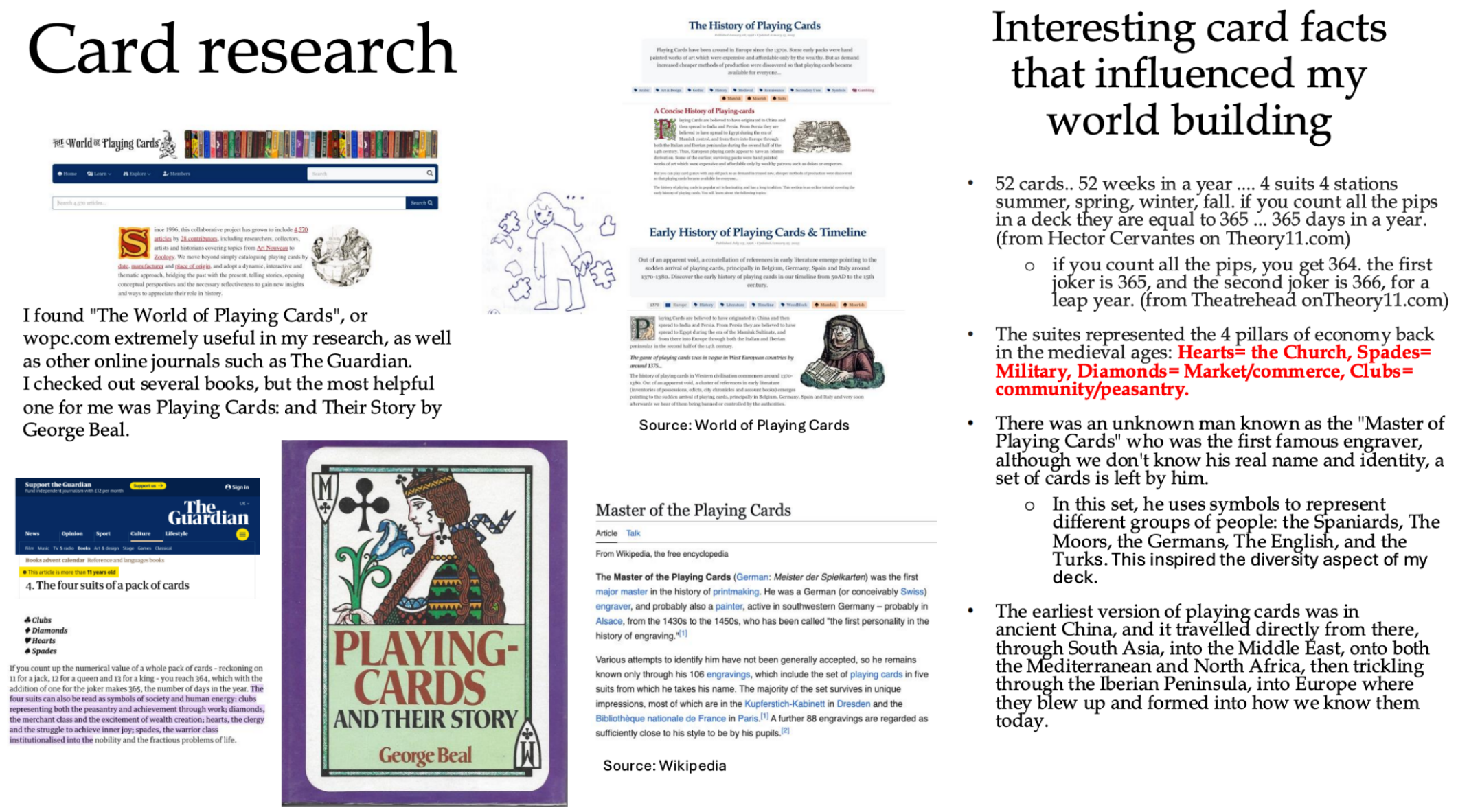 A tale of five suits tells the story of an original high fantasy world based on the forgotten ethnodiversity of Medieval times and the lore behind playing cards and tarot, through a deck of dual-play (playable as both classic and tarot) cards. The history of playing cards is a culmination of so many different cultures, which is not well remembered in modern times. My cards showcased clothes and cultures of the Ottoman Turks, Tang Dynasty China, the Mamluk empire, Moorish Spain, Chandra and Deva era Bengal, and Rococo France, chosen due to their distinct connections to playing card history. In my fictional world, each suit is a distinct kingdom with their own forms of magic and government. For my first drawings, I decided to depict the Queen and King of each respective kingdom, as well as the Joker cards from a different kingdom, in the form of the Major Arcana of the traditional Tarot lore. I hope to accomplish completing at least 8 other additional Tarot cards of the Major Arcana, digging deeper into the historic contexts, and having that reflect through my character design and technical artist, but eventually my goal is to have a whole deck, as well as a cohesive story that fits the Hero's Journey.