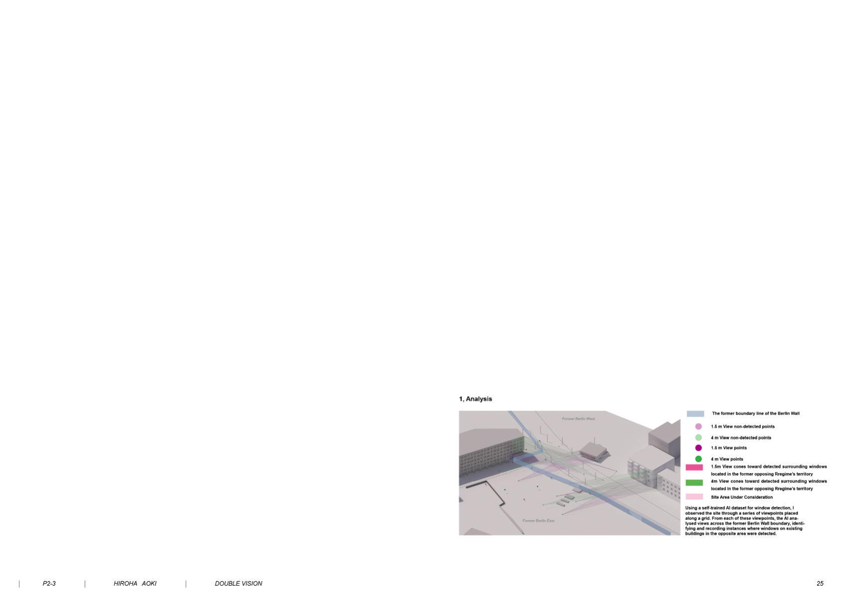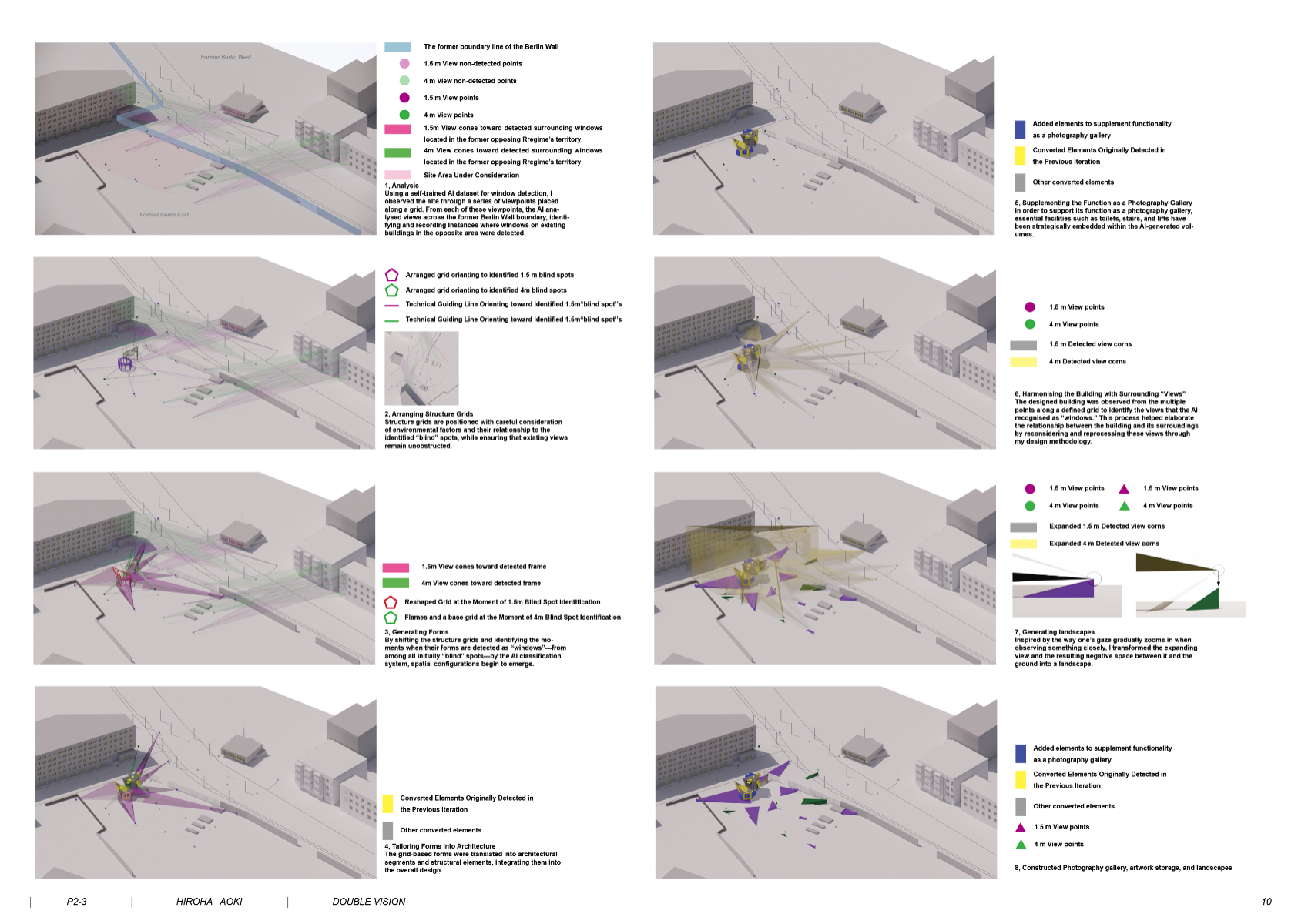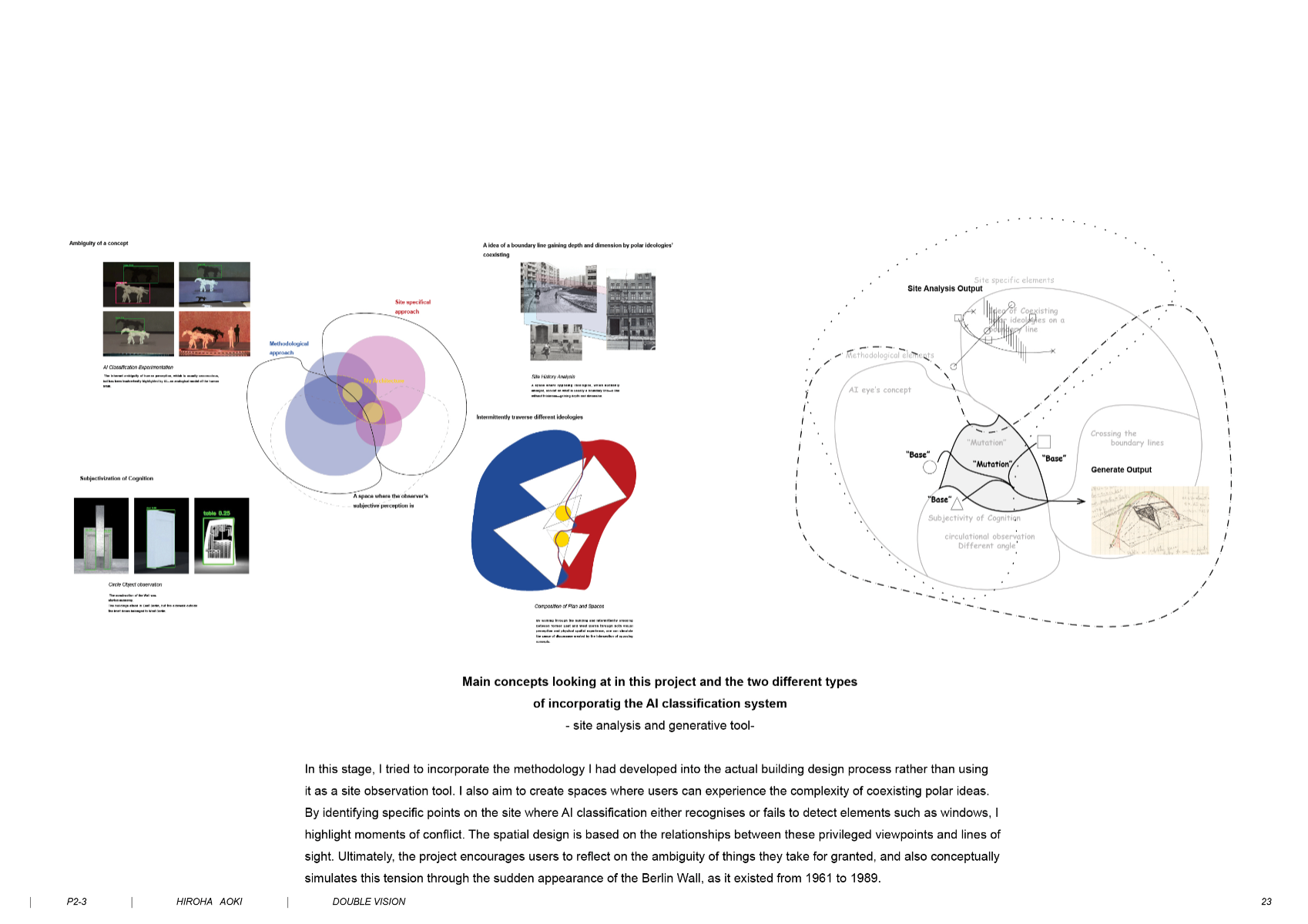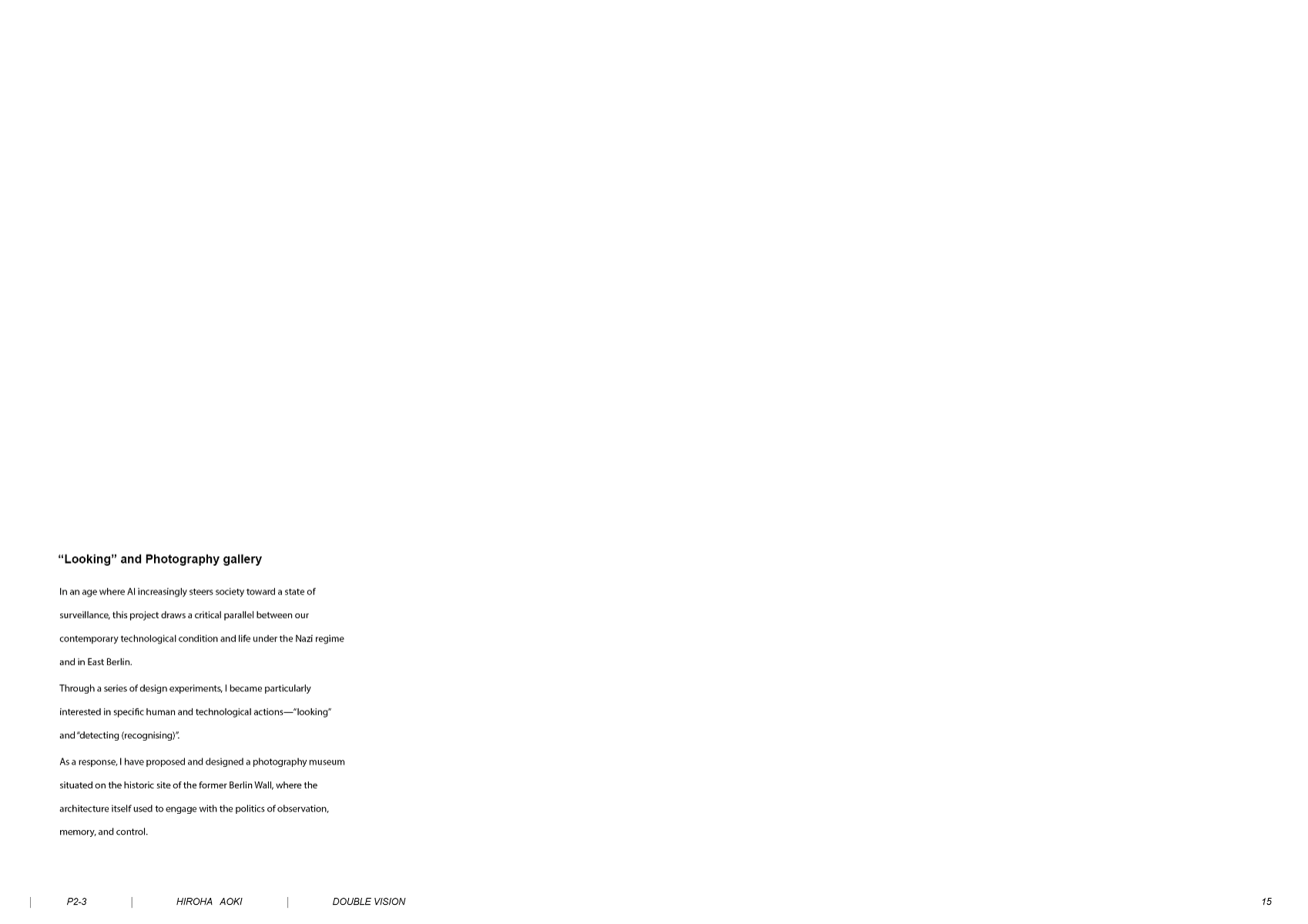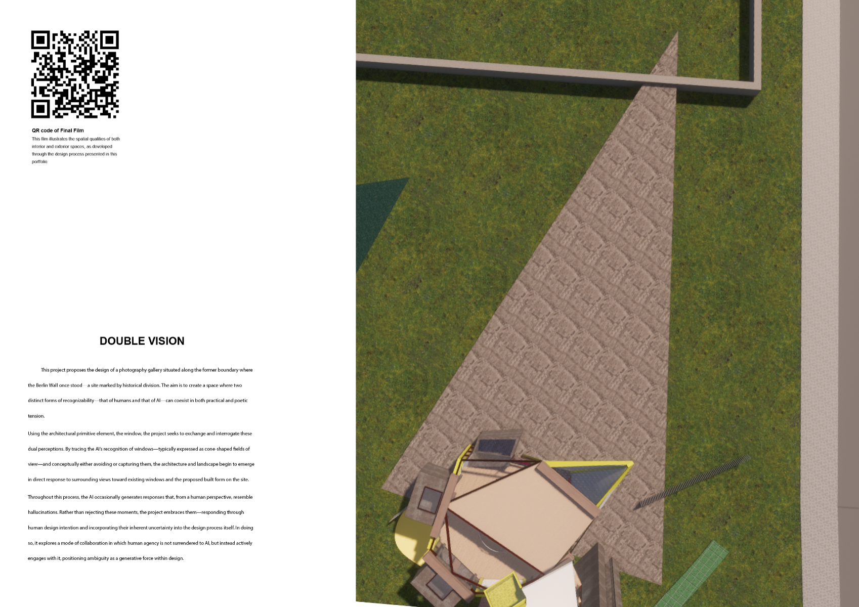 This project is a photography museum that explores the differences and inherent ambiguities between the AI object recognition systems and human perception. Located on the former site of the Berlin Wall—a place once defined by the artificial and forceful division of opposing ideologies—the museum introduces a new kind of boundary: one between human and machine perception. Through its architecture, the project invites a renewed confrontation, allowing both perspectives to coexist in a kind of "double vision," offering critical reflection on the past, present, and future. The building's distinctive forms are grounded in a self-developed methodology based on visual dialogue with AI systems. As both an outcome and a visual record of this process, the museum proposes a new model for engaging with AI—not as a means of simply handing over creative authority, but as a way to co-share design agency between human and artificial intelligence through visual negotiation.