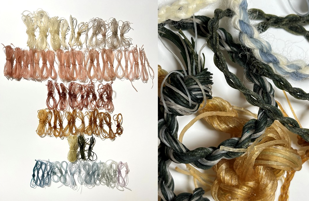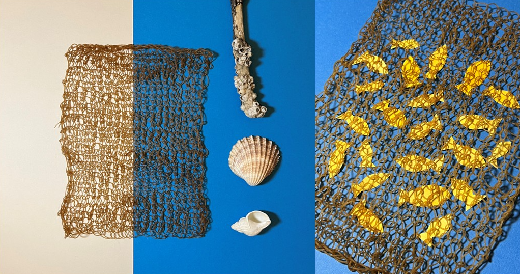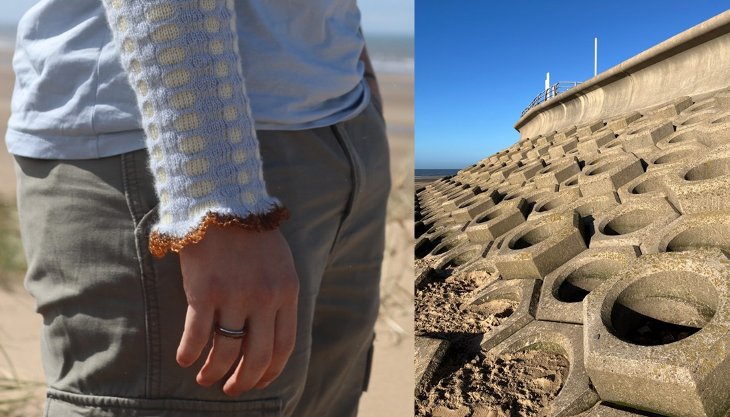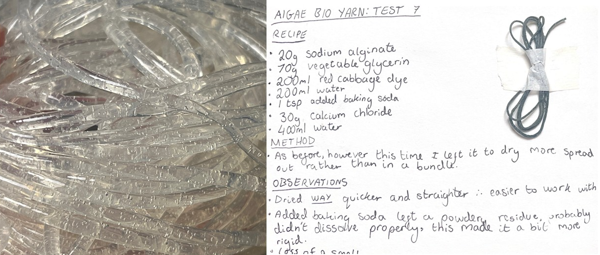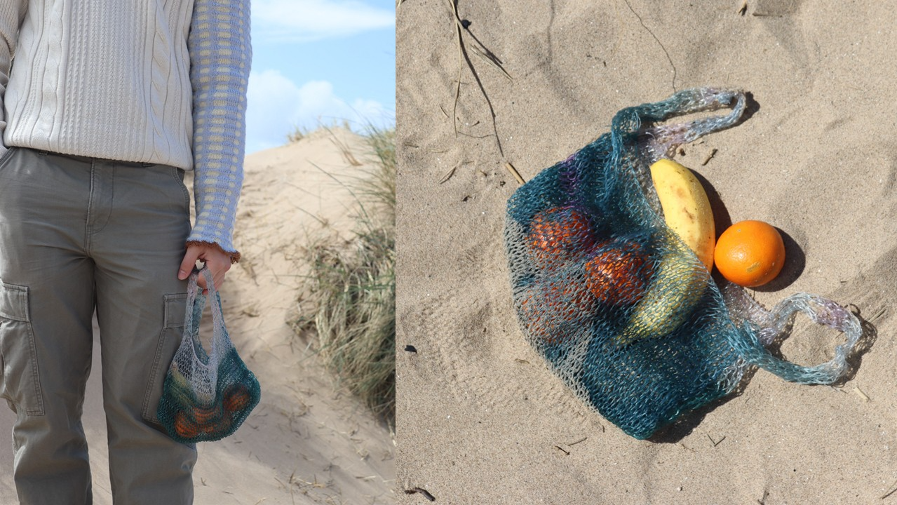 Algae as a Biomaterial is a project which explores the potential of algae, an abundant marine organism, as a sustainable alternative to plastic materials. Through extensive testing and material research, I have made and refined an algae-based yarn which is biodegradable and non-toxic, making it a suitable substitute for single-use packaging. My collection features a knitted bio yarn bag, made to safely break down after use. I have also explored this yarn as a decorative element: creating ropes and sleeve cuffs inspired by nautical elements, along with the organic colours and textures found on the beach. In my seaside hometown, I have witnessed masses of single-use plastic packaging littering the beaches, which is harmful to wildlife because it never fully degrades. Although sustainable packaging is slowly emerging as an alternative to plastic, change needs to happen faster. Algae is fast growing and readily available. It can be mass cultivated without a negative environmental impact. It produces at least 50% of the earth’s oxygen. Why not also make it a usable material?