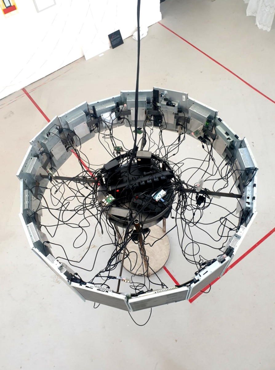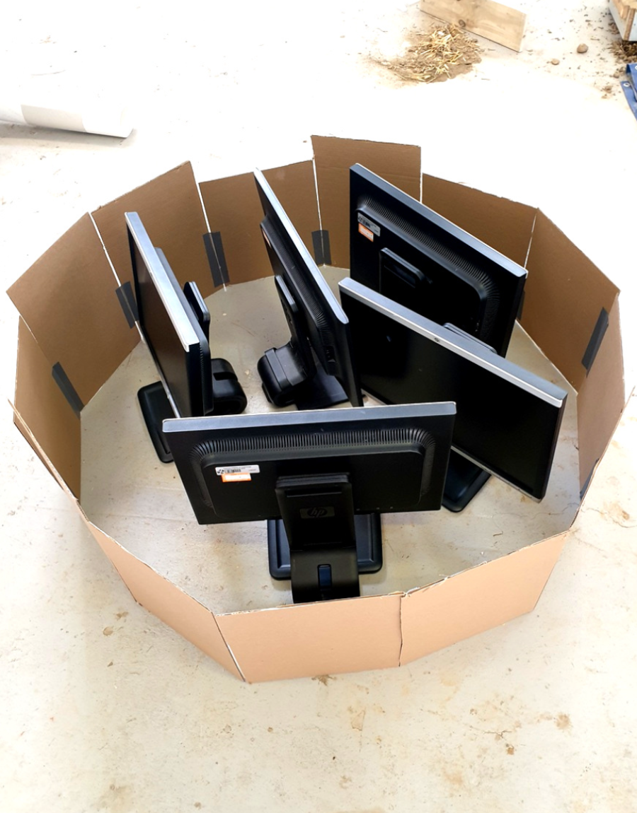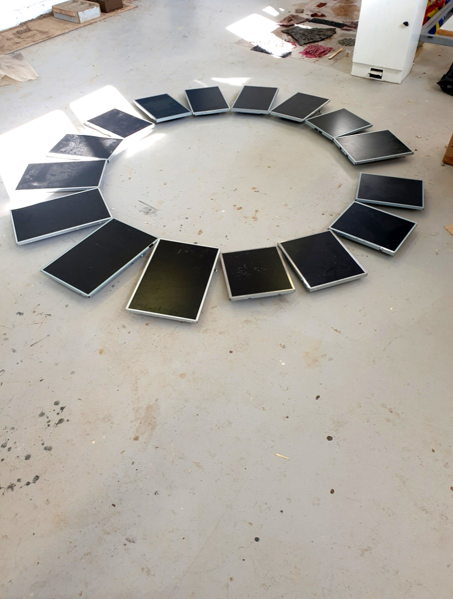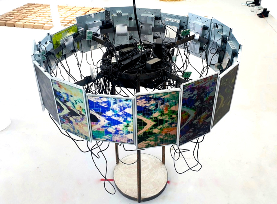 Altar to the Fallacy of Perpetual Growth is an audiovisual sculptural installation that interrogates the ideology of limitless expansion within capitalist systems. The work consists of seventeen reclaimed computer monitors, mounted on a steel and concrete base. Each screen is driven by a networked microcomputer, playing a 1 hour and 15 minute video piece on continuous loop. The videos are slightly delayed from one monitor to the next, creating a cascading visual and temporal sequence across the installation. By staging this choreography of recycled hardware and staggered playback, the work points to the contradictions of technological innovation bound to the demand for perpetual growth. The altar-like form highlights the ritualistic devotion to expansion that underpins contemporary digital culture, what Gerry McGovern has described as the “Growth Death Cult.”