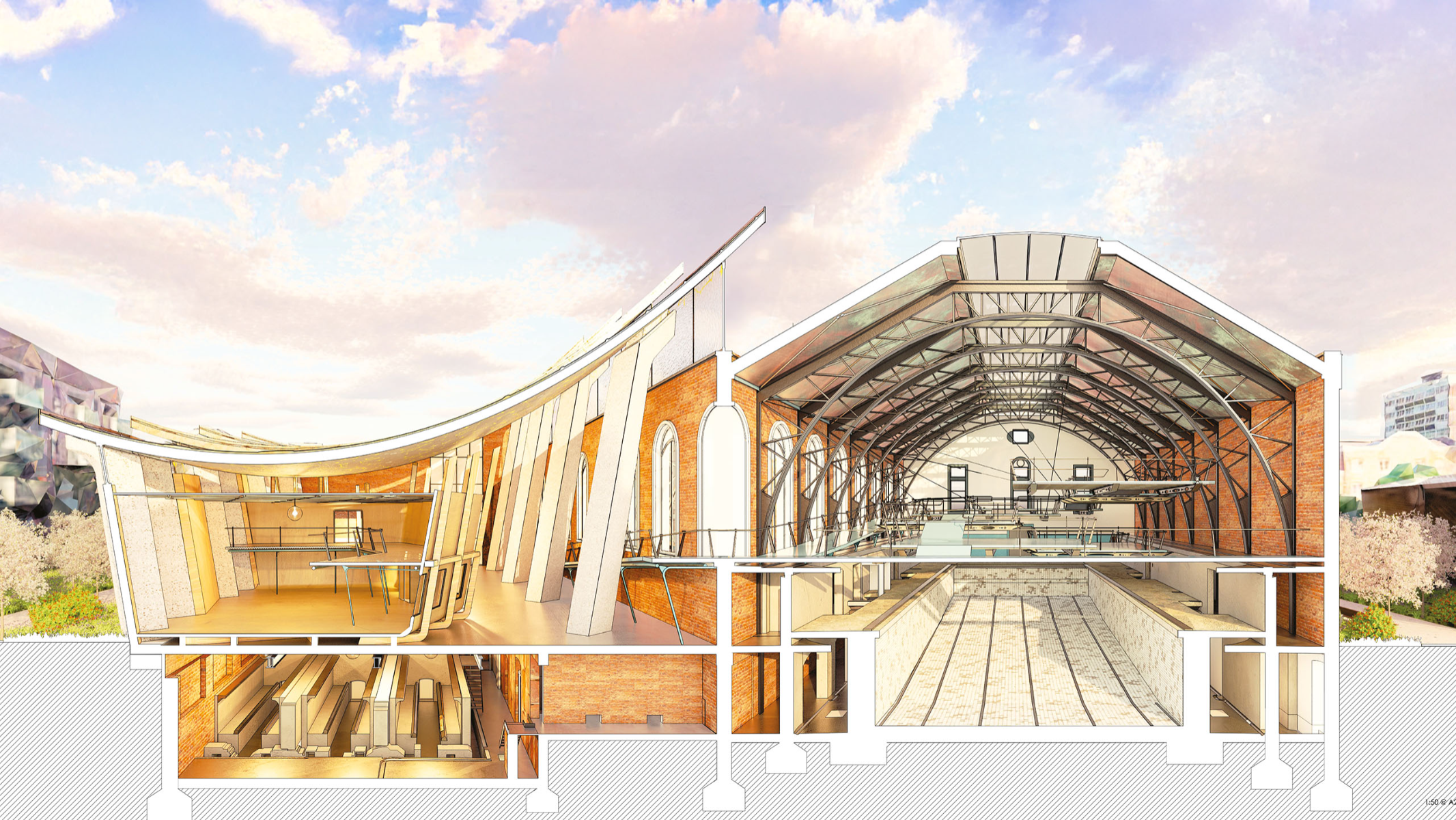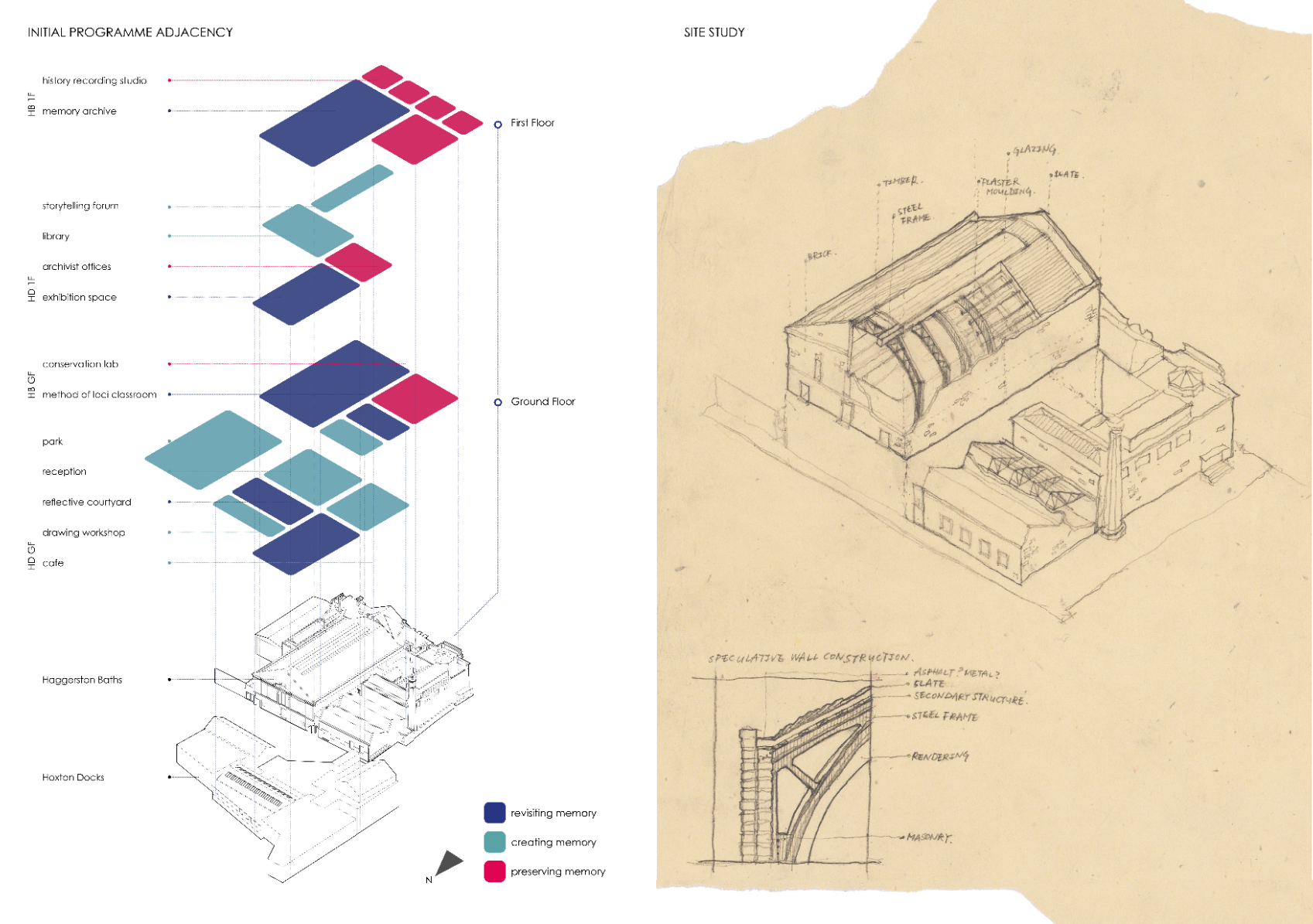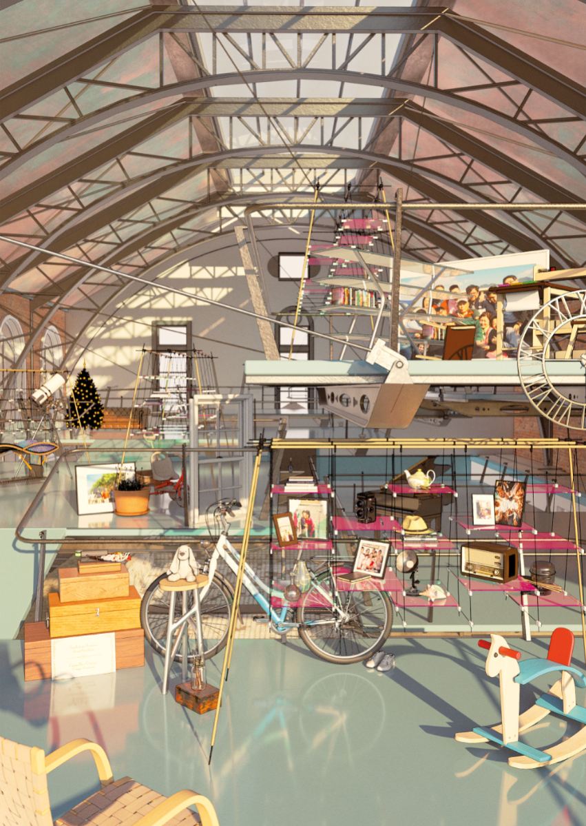 Memory is intrinsically tied to happiness and our shared understanding of one another. This interpretation of eutopia weaves a garden of remembered and forgotten fragments, layered over the Victorian Haggerston Baths as a vessel for holding, healing, and re-inscribing memory. As visitors ascend a ramp into a fantastical hall of suspended platforms, they leave behind artefacts for others to uncover: neighbours, grandchildren, ex-lovers, classmates. Memory becomes a shared ritual, a timeless act of rediscovery and reinterpretation. At its core is a gestural inversion of the poolhouse frames: a funicular suspension roof and corrugated façade that respond to and redefine the existing structural rhythm. Through a multi-scalar choreography of movement, the proposal uses the existing Baths' wall as the design axis; subtle sutures that guide circulation and provoke moments of reflection and awe. These gestures stitch past and present, conjuring spaces where physical memory lingers, quietly stirring reflection within the folds of life. This project integrates structural and environmental design with architectural intent, reaching a resolution of net-zero operational carbon.