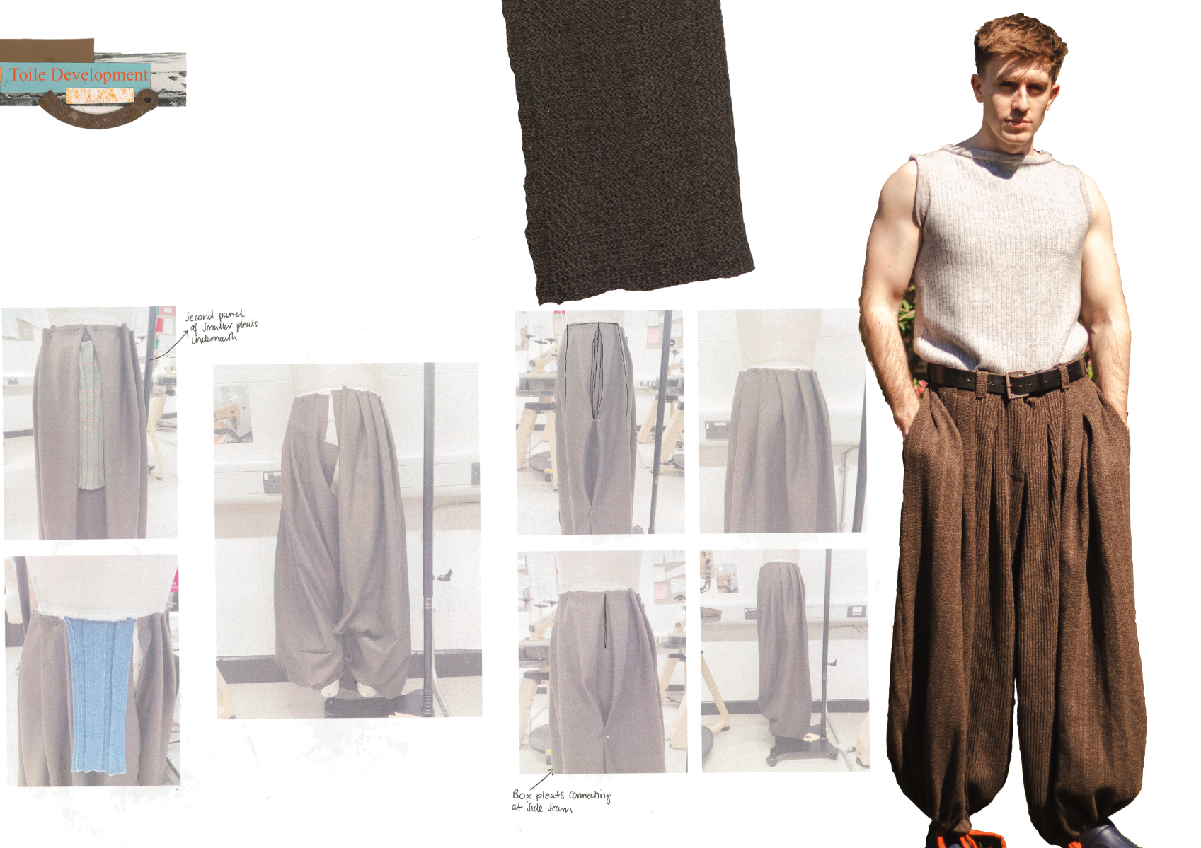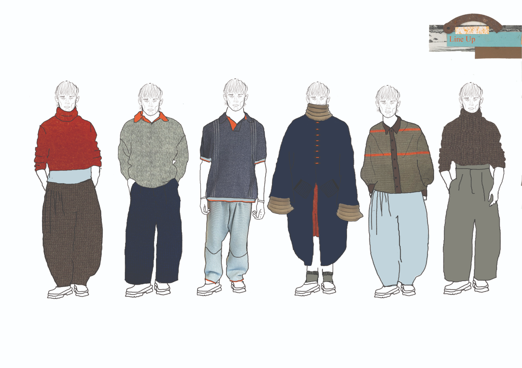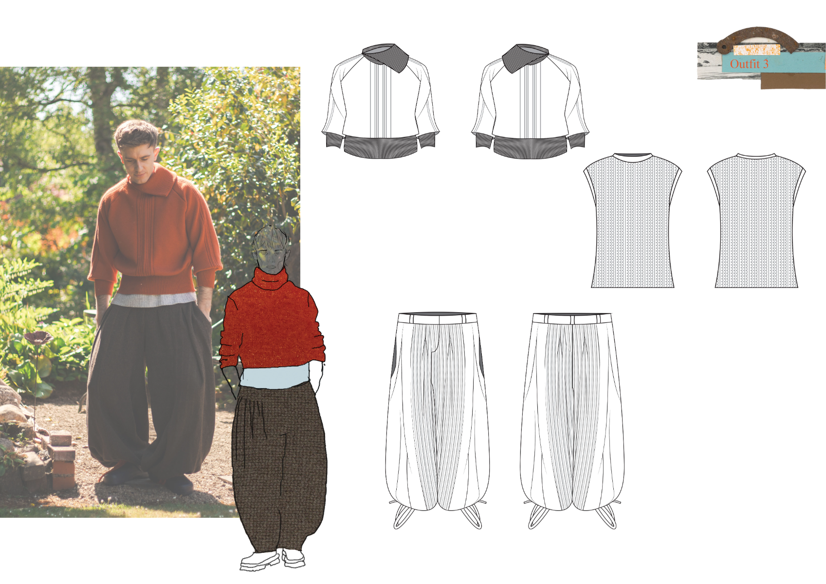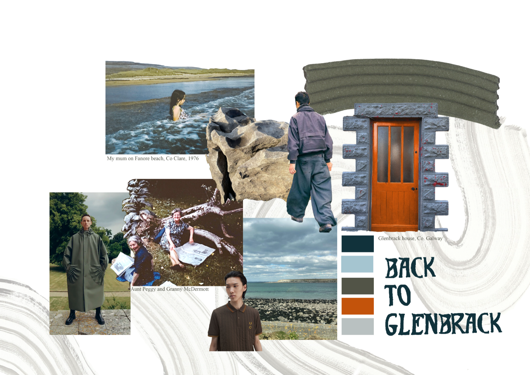 ‘Back to Glenbrack' is a menswear collection inspired by my family heritage. Glenbrack is my grandfathers birthplace in Co. Galway on the west coast of Ireland. I have fond memories of Ireland through my grandfathers storytelling and visits as a young child. In this collection, I explored traditional workwear silhouettes whilst aiming to create a comforting collection through use of natural fibres and subtle textures. I have taken inspiration from old family photos and the natural landscape to inform colour and fabric choices. The beginning of the concept started with a quote by W.B Yeats 'And may these characters remain when all is ruin once again' this is carved outside Thoor Ballylee Tower which my great great grandfather restored. This quote encourages me to think about the importance of preserving craftsmanship and how design can be used as a tool in remembering someone we have lost.