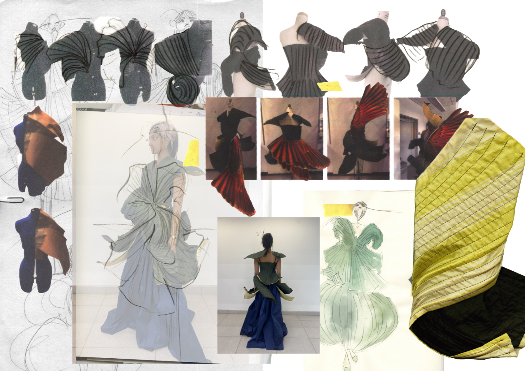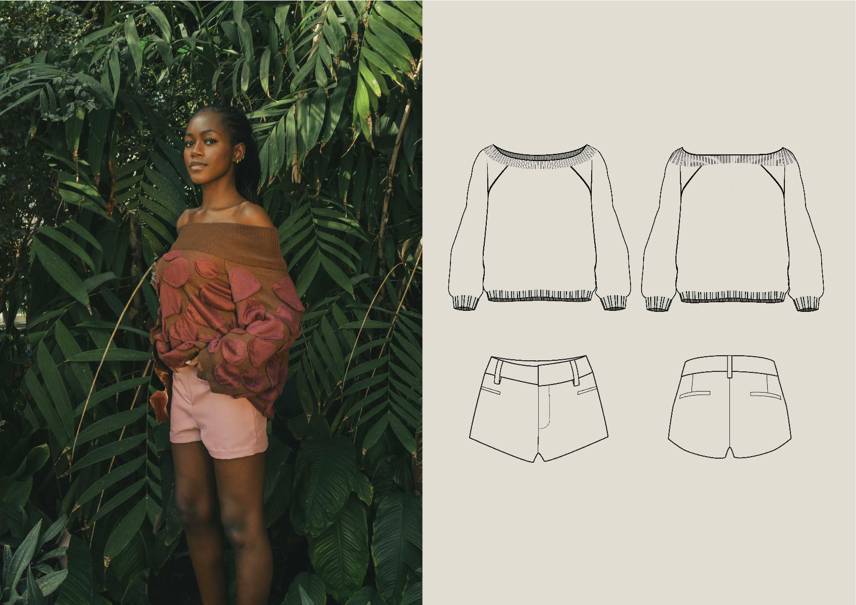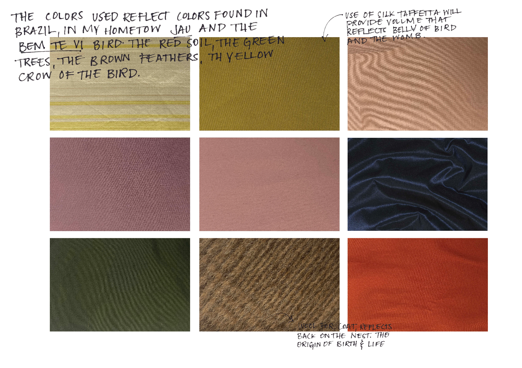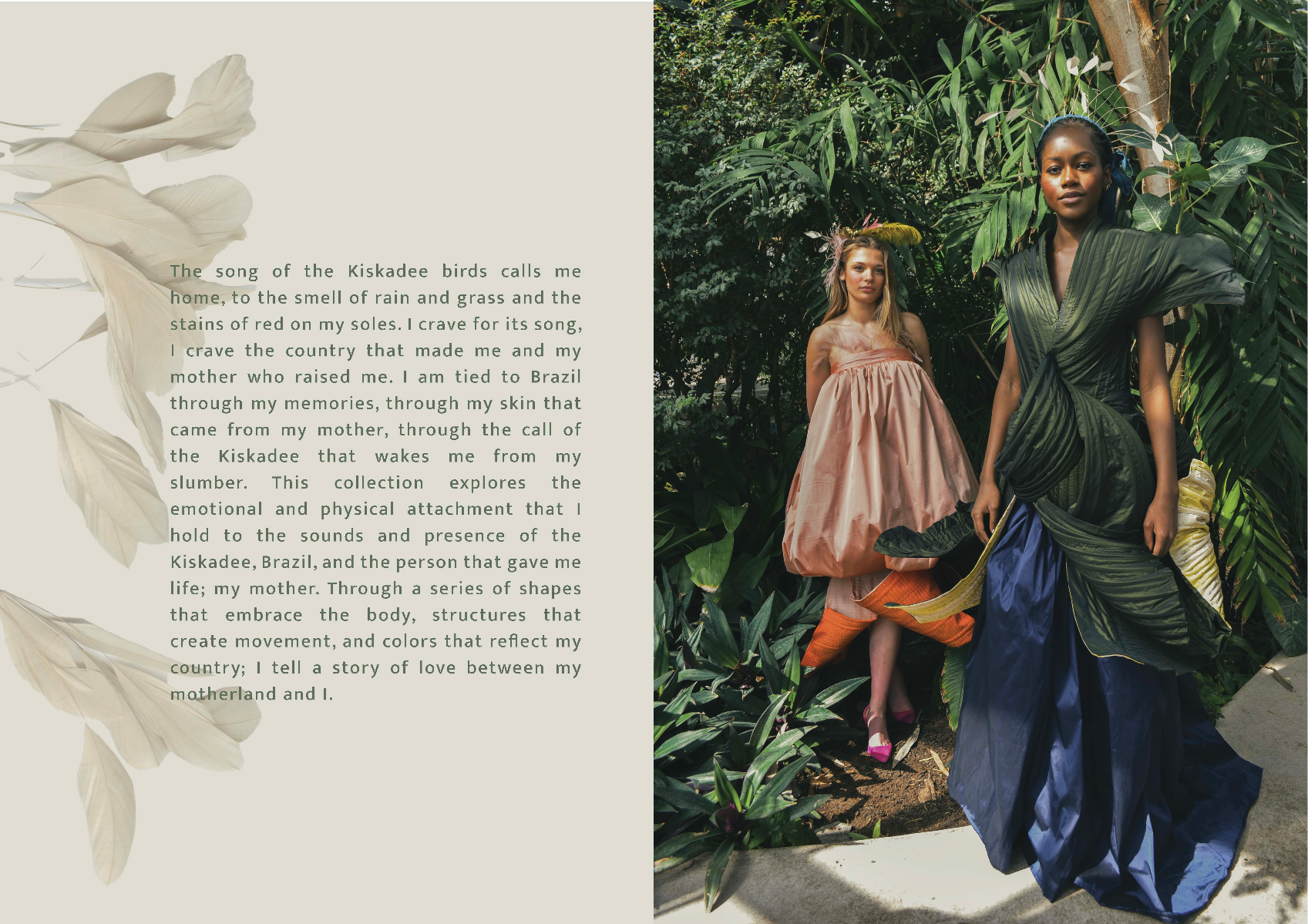 The song of the Kiskadee birds calls me home; to the smell of rain, grass, and the stains of red on my soles. I crave for its song, I crave the country that made me and my mother who raised me. I am tied to Brazil through my memories, through my skin that came from my mother, through the call of the Kiskadee that wakes me from my slumber. This collection explores the emotional and physical attachment that I hold to the sounds and presence of the Kiskadee bird, Brazil, and the person that gave me life; my mother. Through a series of shapes that embrace the body, structures that create movement, and colors that reflect my country; I tell a story of love between my motherland and I.