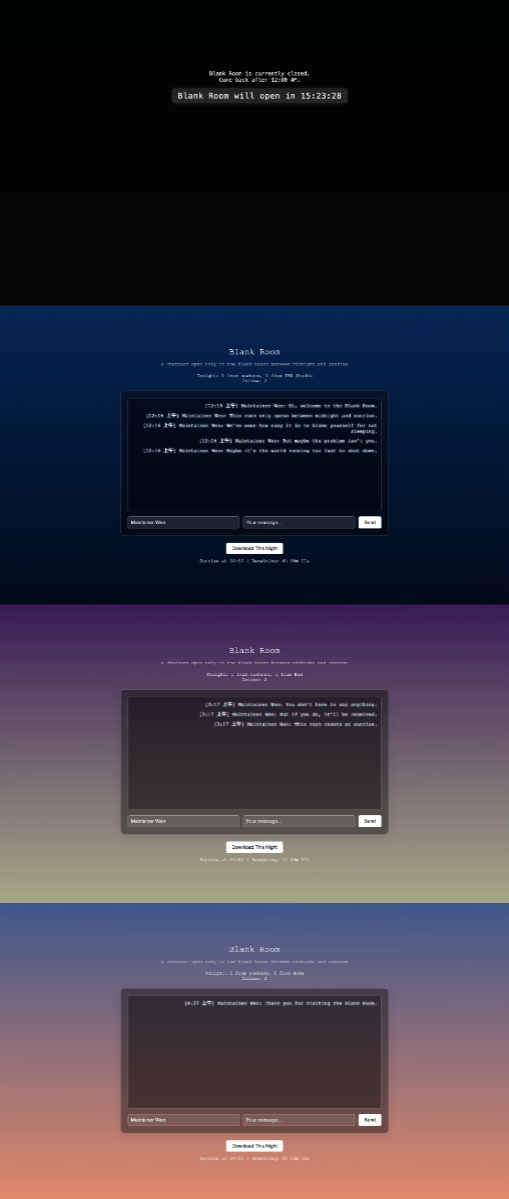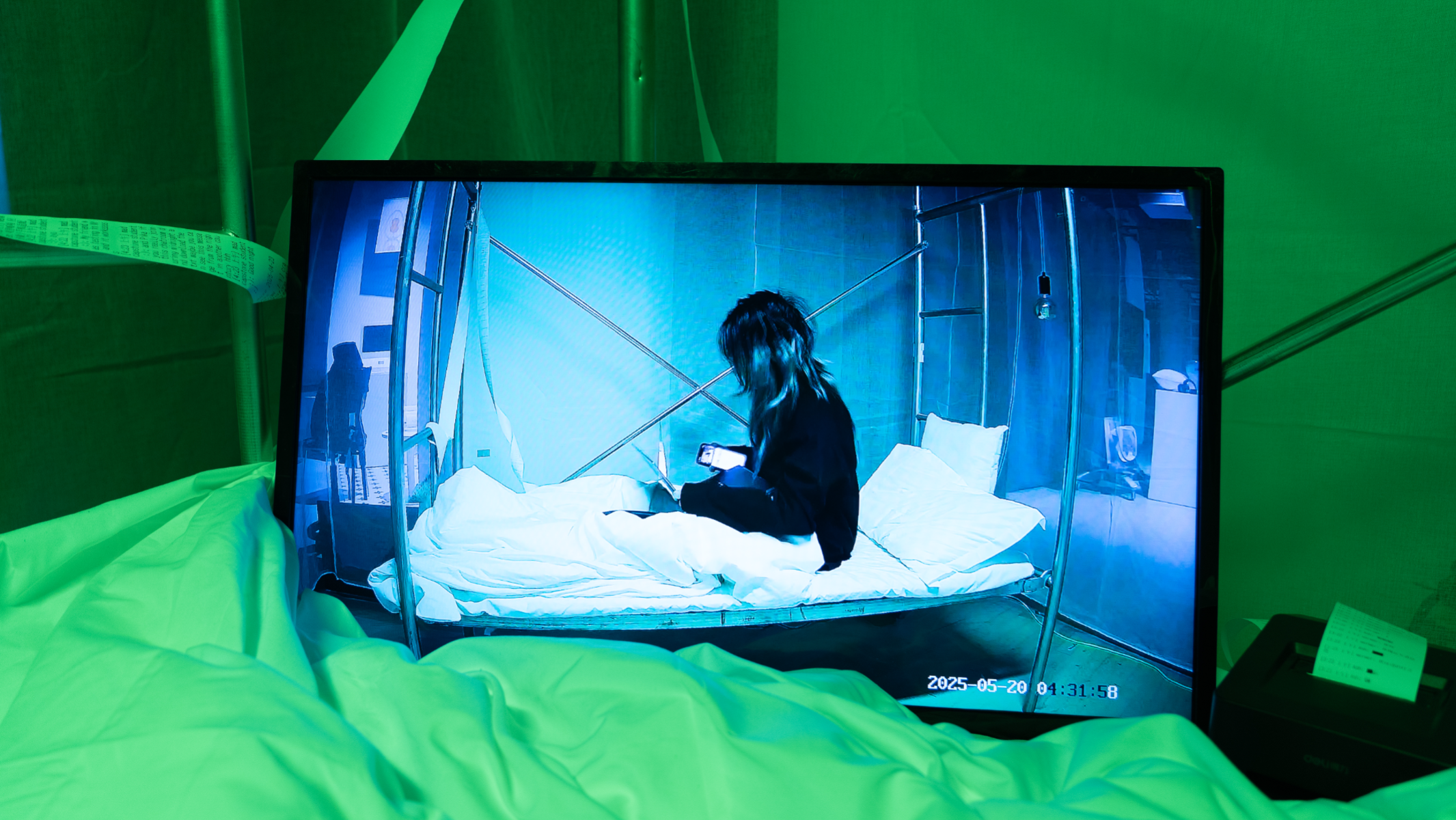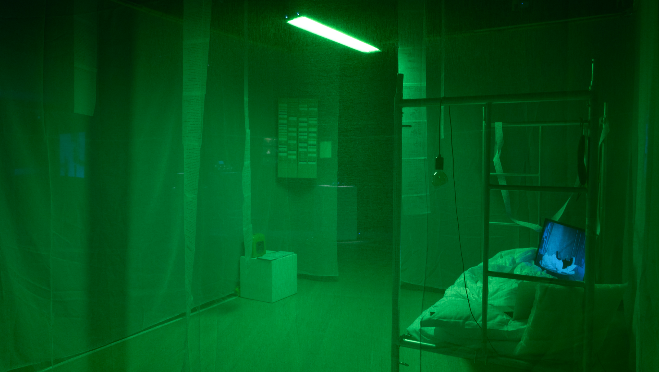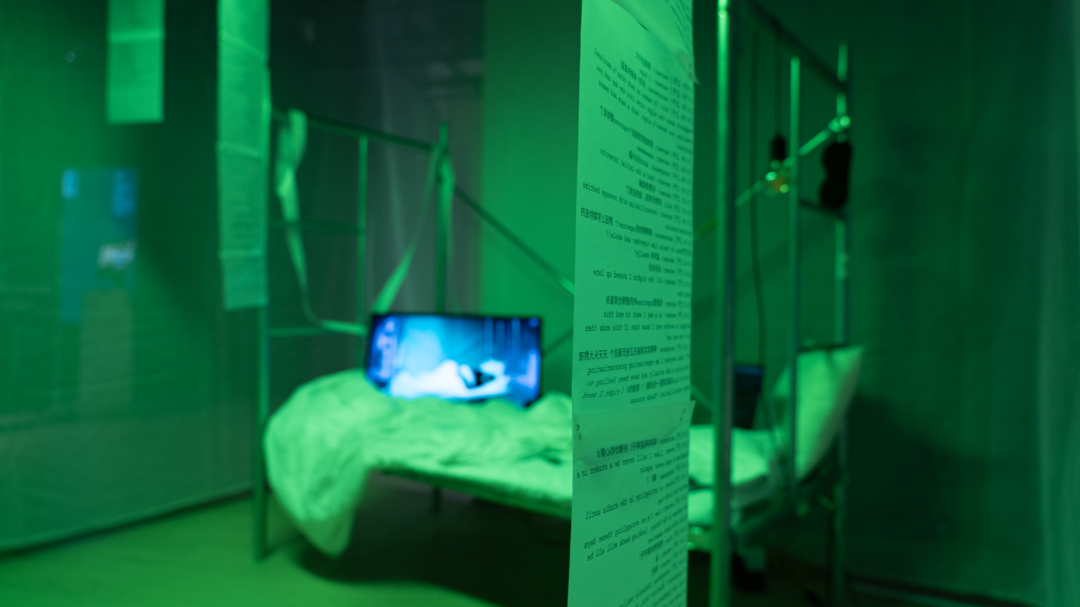 This installation begins with a familiar feeling: that moment late at night when, despite exhaustion, we choose not to sleep. Sometimes called revenge bedtime procrastination, this behavior points to collective sleeplessness—a contemporary condition of life. Can we think of such moments not as personal failures, but as invisible labor extracted by society? Or perhaps as a site of quiet resistance? Through a scaffolded bed, a nocturnal chatroom connected to light and thermal printing, and a speculative clock-in system for sleep, the project constructs a world where even rest becomes regulated, monitored, and subtly extracted. A performance video documents the artist staying overnight within the system, tracing the blurred boundary between bodily exhaustion and algorithmic attention. Visitors are invited to enter the space, trigger its mechanisms, and experience how private time is fractured and repurposed under late capitalism. Within this architecture of control, the chatroom functions as a fragile opening—offering no escape, but perhaps a flicker of presence, connection, or even quiet revenge. For more details of my research and development process: https://drive.google.com/drive/folders/1eoNJTpFZrQesyHKqKJUKHAsC9_4O-5l0?usp=sharing