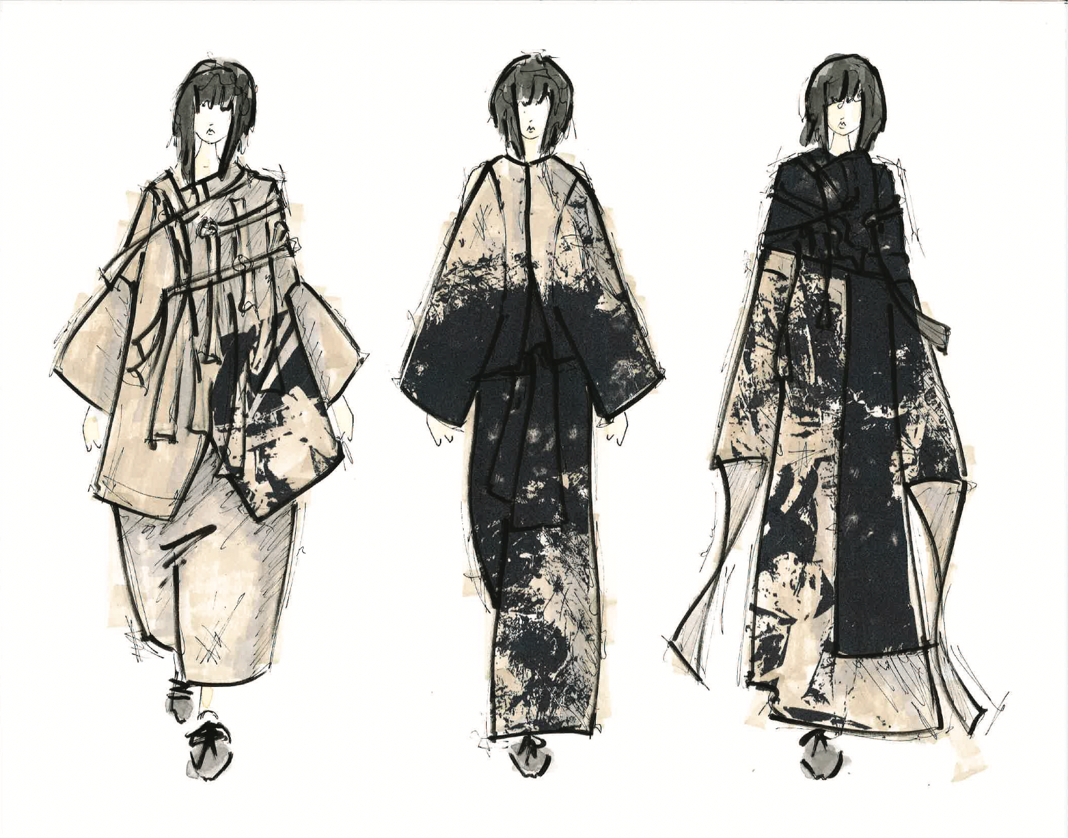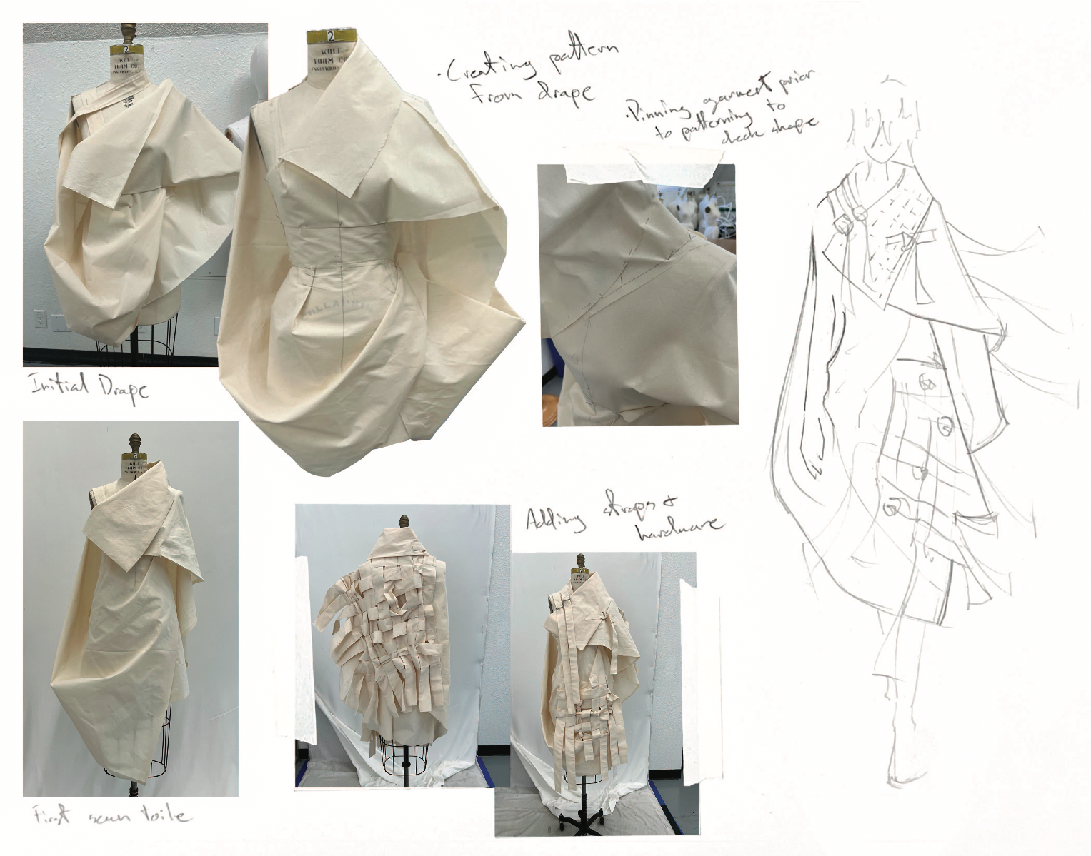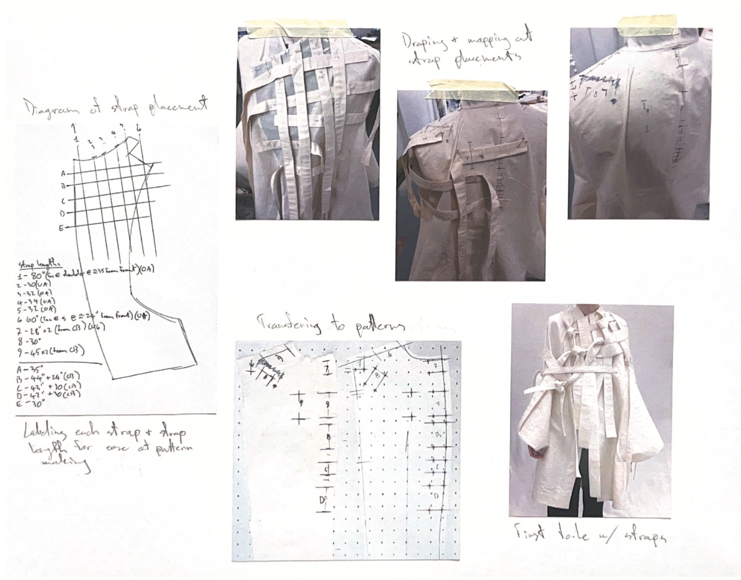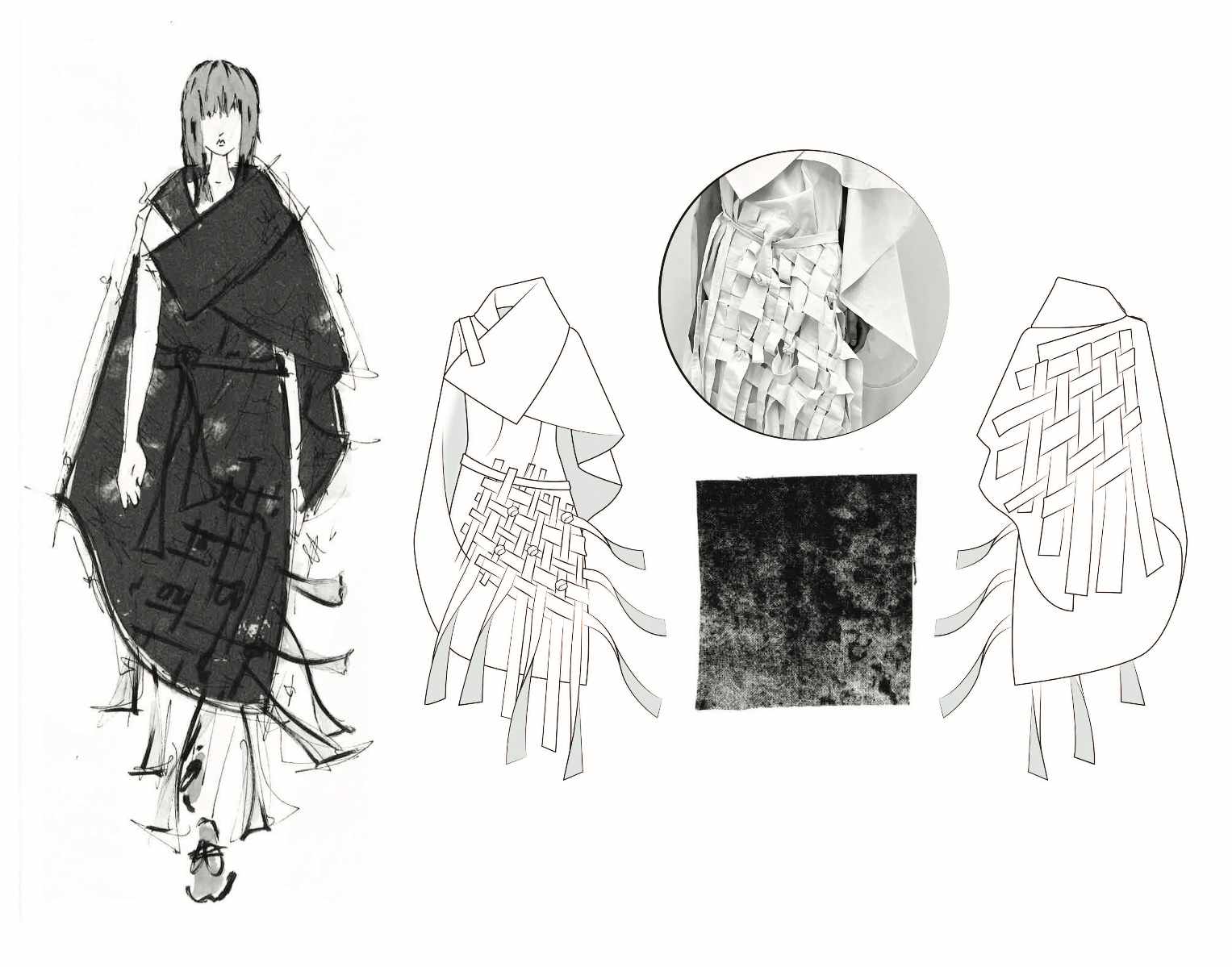 This project is inspired by a scene in The Silence of the Lambs in which Hannibal Lecter is completely restrained by a straight jacket, but is still in complete control of a room full of police. The straps and restriction of the upper body from the straight jacket are what spoke to me the most. I contrasted these motifs with flattering silhouettes and garments that allowed for and created movement in the lower body, while limiting the movement of the upper body and arms. This dichotomy was further explored through print – using a muslin fabric washed on high heat, I was able to create a soft, wrinkled fabric which was then printed with a dirty and chaotic textile design. The result is a cohesive, six-look collection that seeks to explore the dynamics of restraint vs. power through the use of restrictive clothing, print, and pattern cutting, while underlining my appreciation for craftsmanship.
