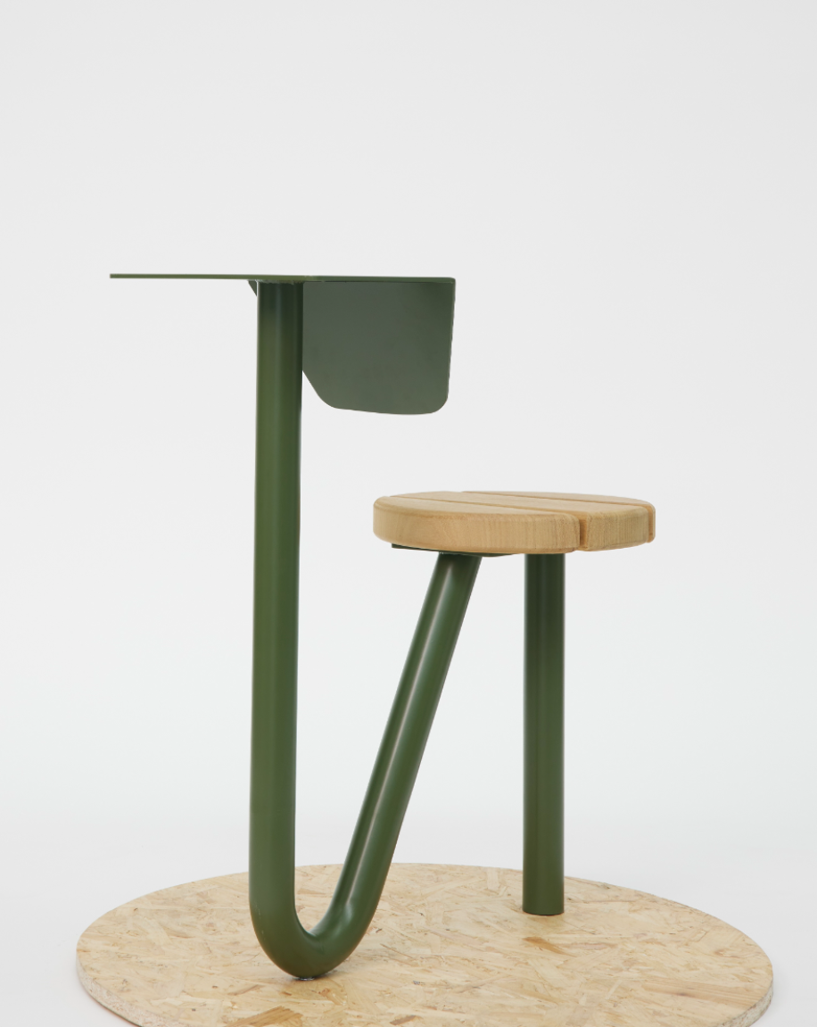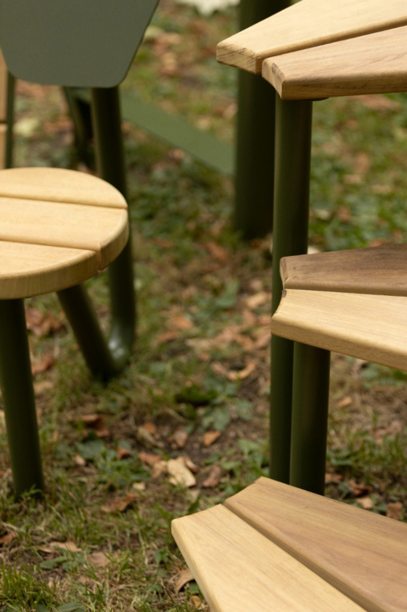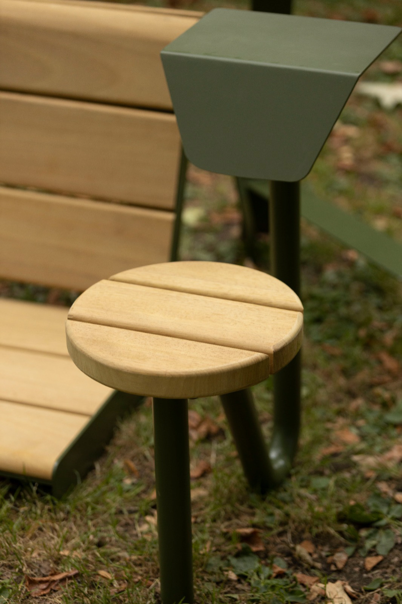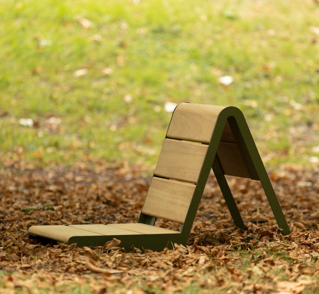 Chapters is a collection of public furniture designed for London’s parks, inspired by the quiet presence of book readers. In most parks, you will find the classic double bench, often occupied by just one person. Chapters reimagines this norm by offering silhouettes intentionally shaped for individual use. Each of the four pieces —Rest, Pause, Tilt, Nest— can create a personal moment within the public space and invite different experiences, whether you’re immersed in a novel, resting between moments, or simply taking in your surroundings. Chapters can also be used for social third spaces by multiplying their units and curating them accordingly. After observational studies, interviews, and design development, their forms have been shaped to respond intuitively to natural movements and postures, encouraging comfort and exploration. While their forms vary, they share a unifying olive green tone, chosen to blend harmoniously with the natural landscape rather than distract from it. Crafted from powder-coated mild steel and iroko wood, the materials are durable, tactile, and well-suited for outdoor use.