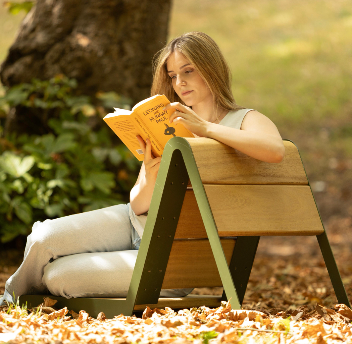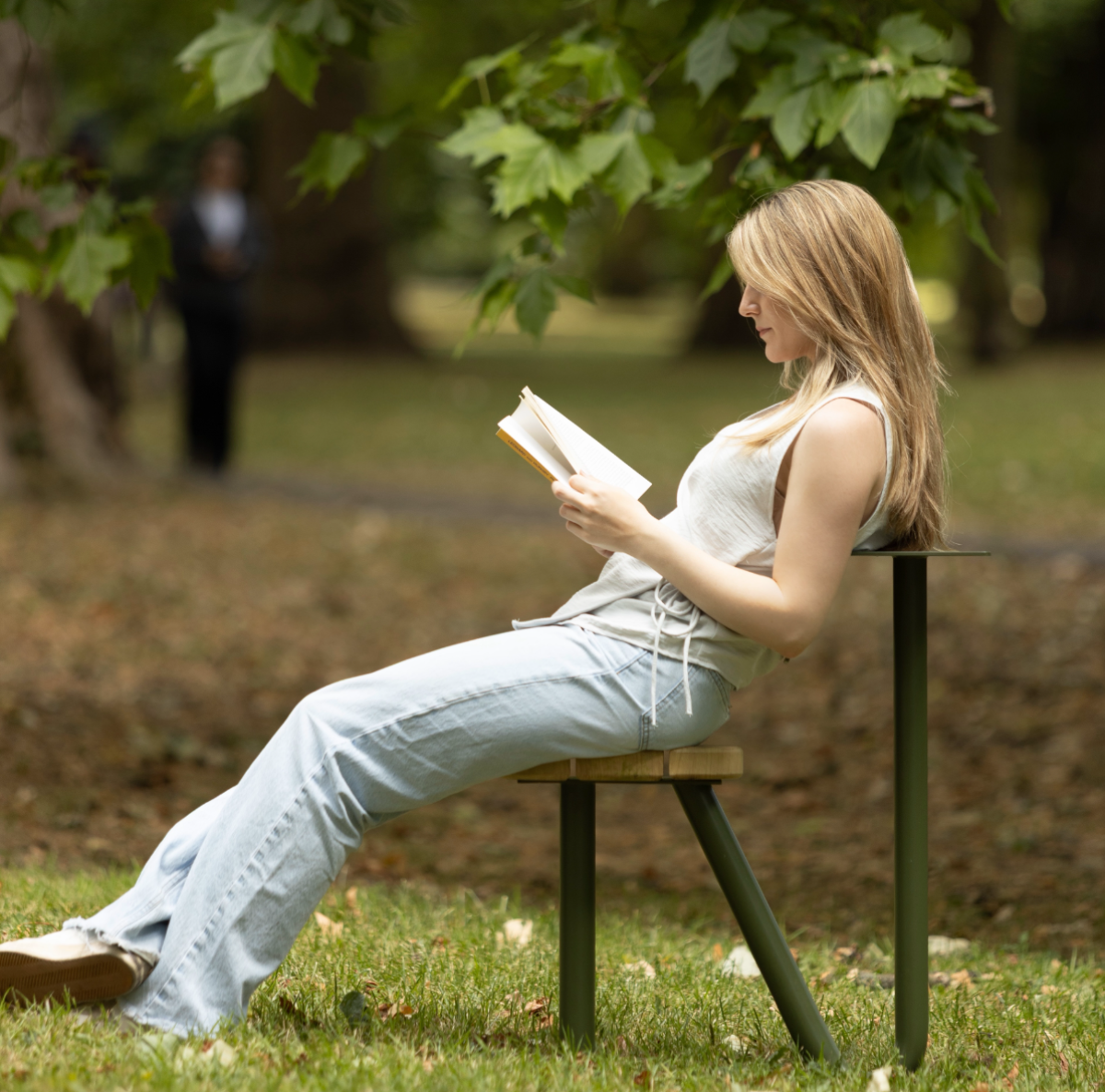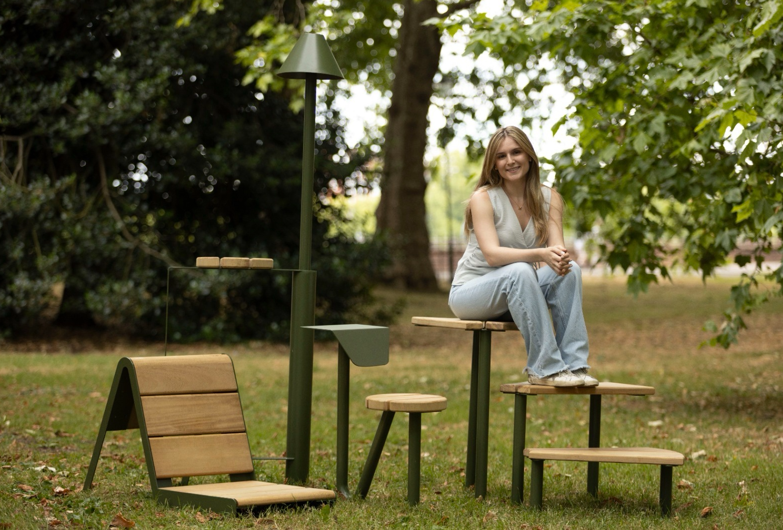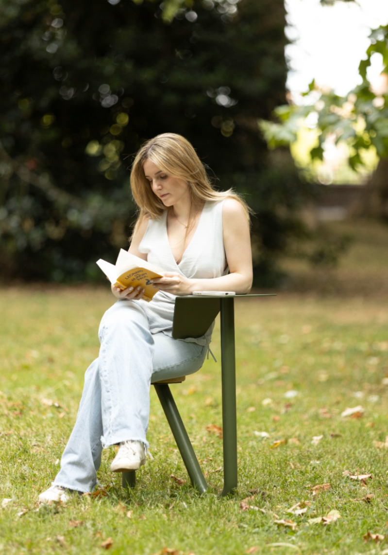 Chapters is a collection of public furniture designed for London’s parks, inspired by the quiet presence of book readers. In most parks, you will find the classic double bench, often occupied by just one person. Chapters reimagines this norm by offering silhouettes intentionally shaped for individual use. Each of the four pieces —Rest, Pause, Tilt, Nest— can create a personal moment within the public space and invite different experiences, whether you’re immersed in a novel, resting between moments, or simply taking in your surroundings. Chapters can also be used for social third spaces by multiplying their units and curating them accordingly. After observational studies, interviews, and design development, their forms have been shaped to respond intuitively to natural movements and postures, encouraging comfort and exploration. While their forms vary, they share a unifying olive green tone, chosen to blend harmoniously with the natural landscape rather than distract from it. Crafted from powder-coated mild steel and iroko wood, the materials are durable, tactile, and well-suited for outdoor use.