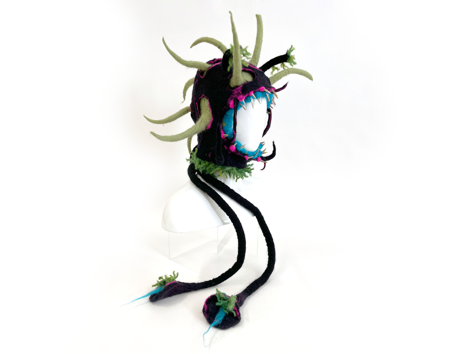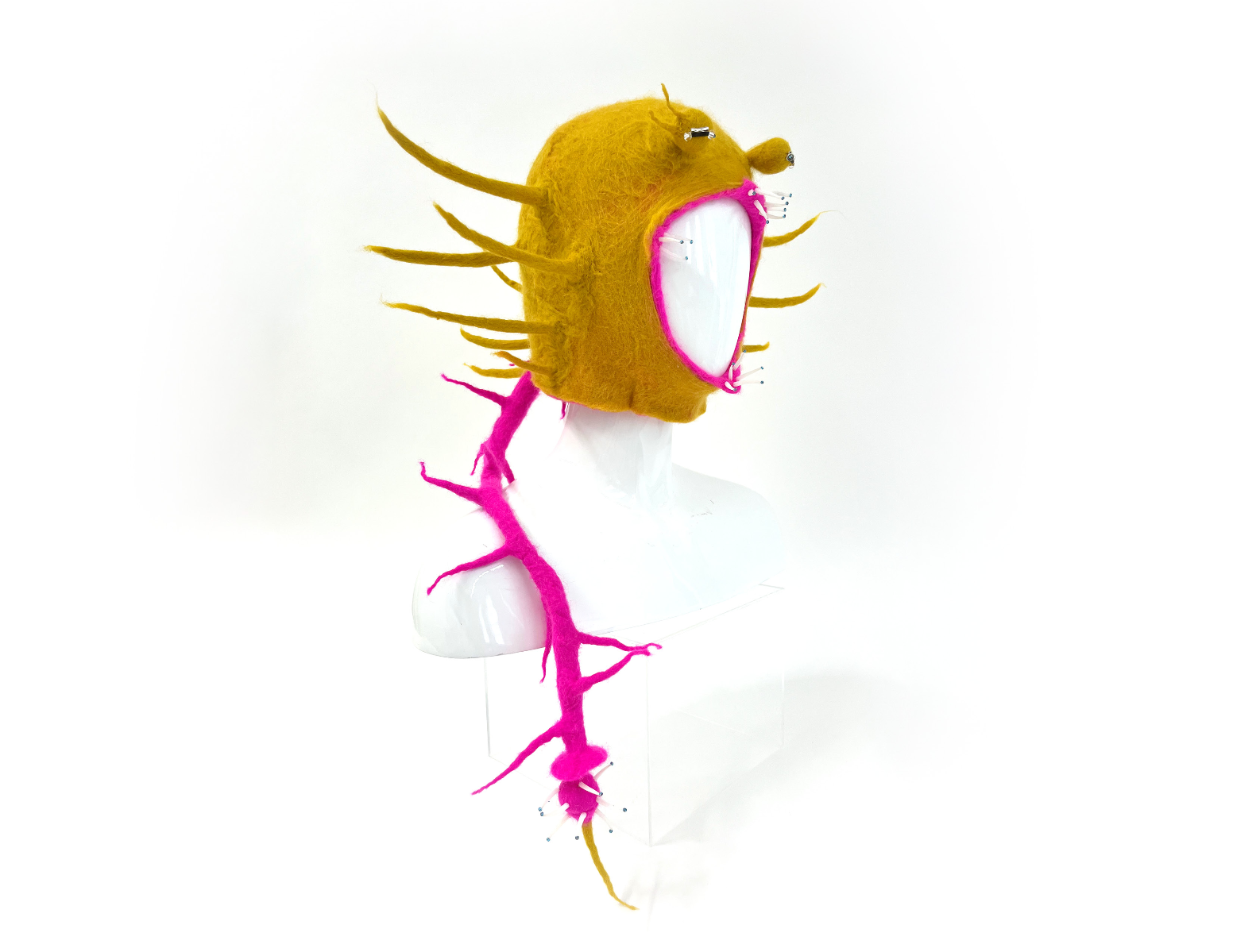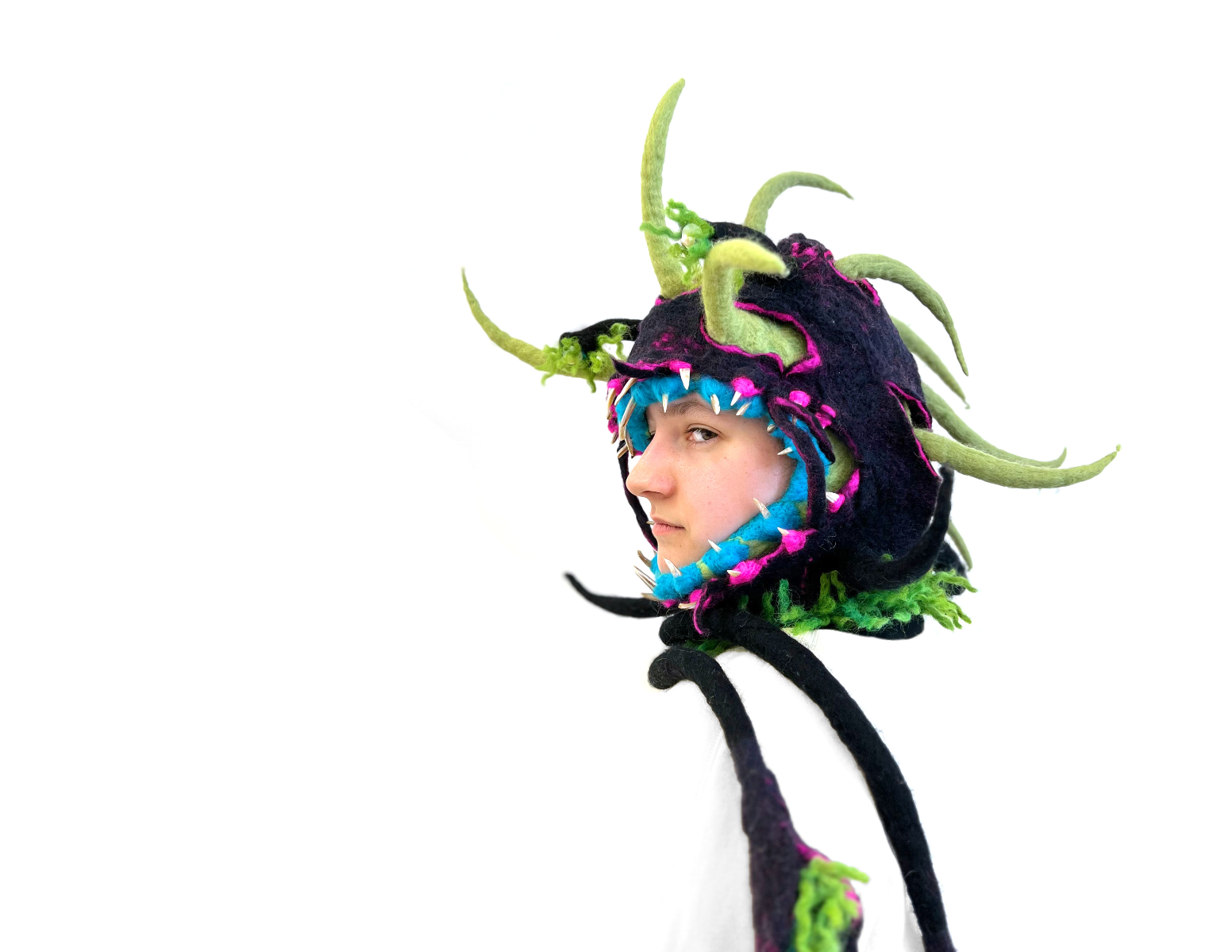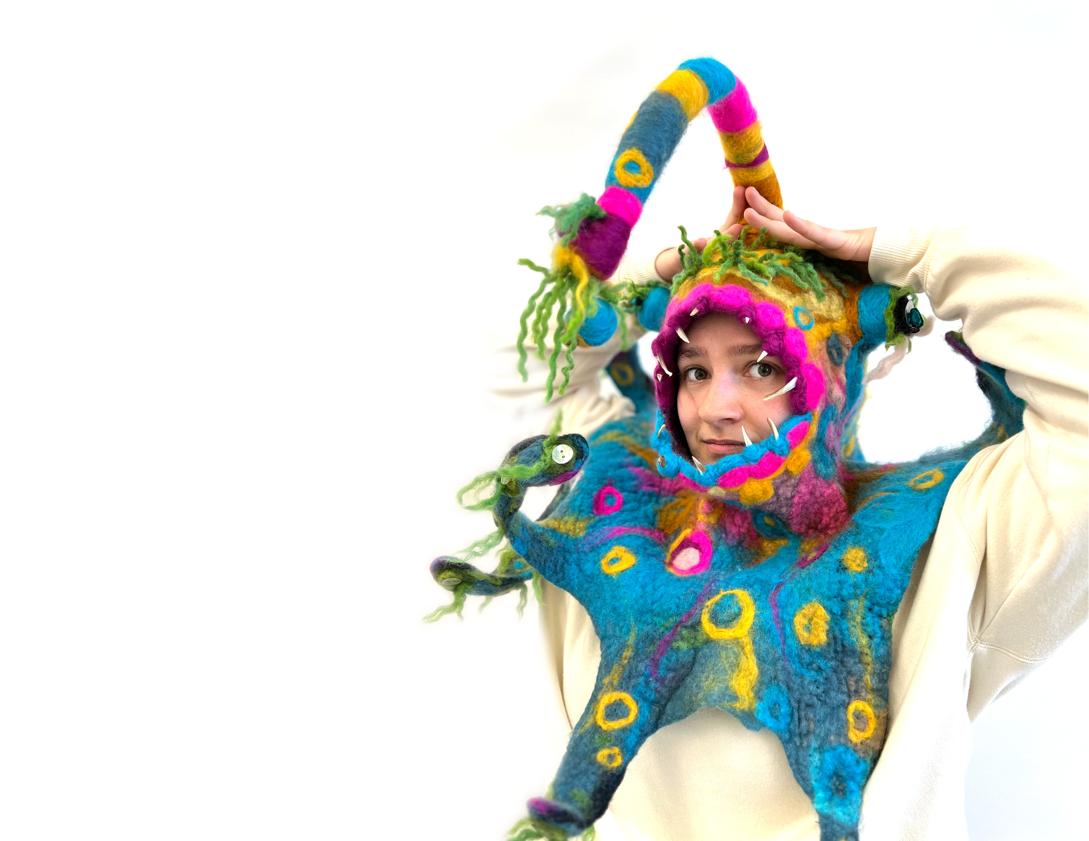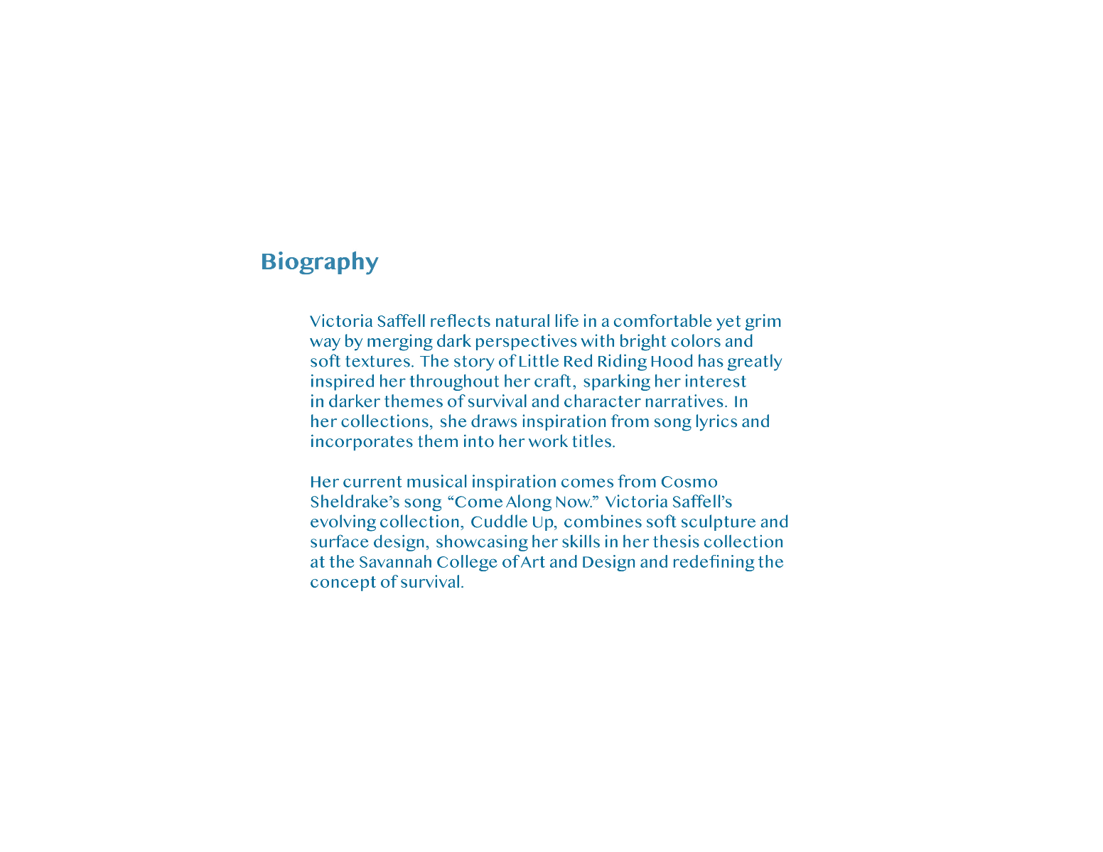 Victoria Saffell reflects natural life in a comfortable yet grim way by merging dark perspectives with bright colors and soft textures. The story of Little Red Riding Hood has greatly inspired her throughout her craft, sparking her interest in darker themes of survival and character narratives. In her collections, she draws inspiration from song lyrics and incorporates them into her work titles. Her current musical inspiration comes from Cosmo Sheldrake’s song “Come Along Now.” Victoria Saffell’s evolving collection, Cuddle Up, combines soft sculpture and surface design, showcasing her skills from Savannah College of Art and Design. As she delves into the predator-prey dynamic, survival emerges as a captivating theme for Victoria. It's the immediate, instinctual conflict that piques her interest. Within her art, she explores the predators lurking in the deep waters, fascinated by their variations of spikes, teeth, tendrils, eyes, and stingers. Each of these features serves a crucial purpose, enhancing their survival instincts with every movement. Through her creations, she seeks to transform the wearer into a predator of the depths, serving as a reminder that we, too, are predators lurking for a chance to attack.
