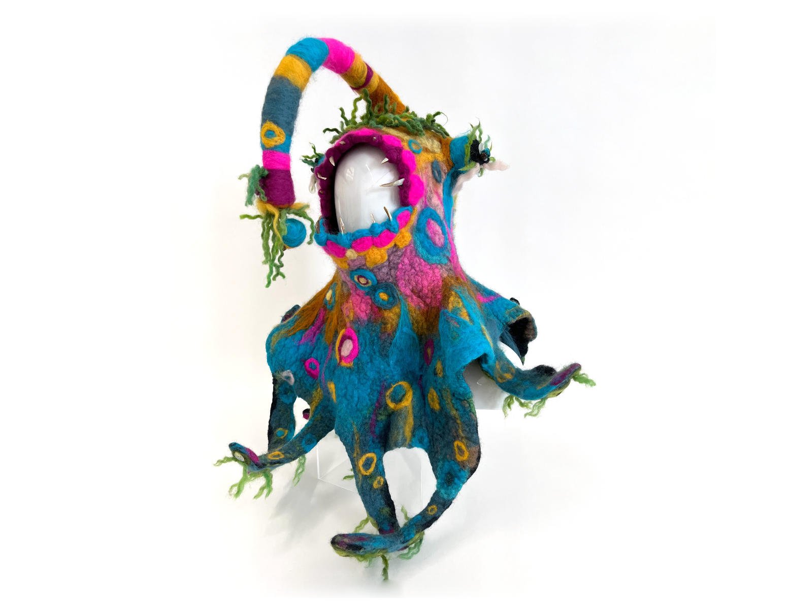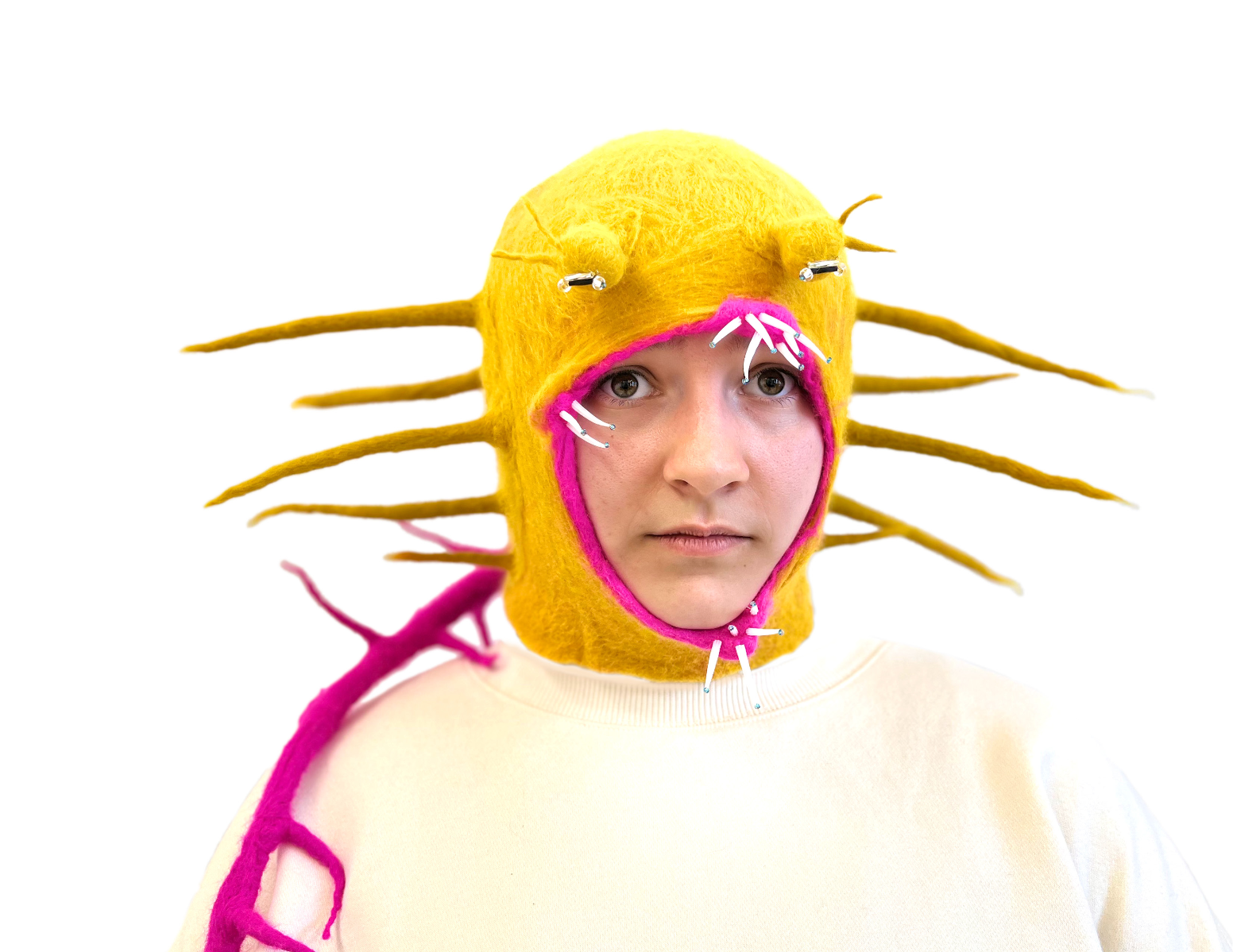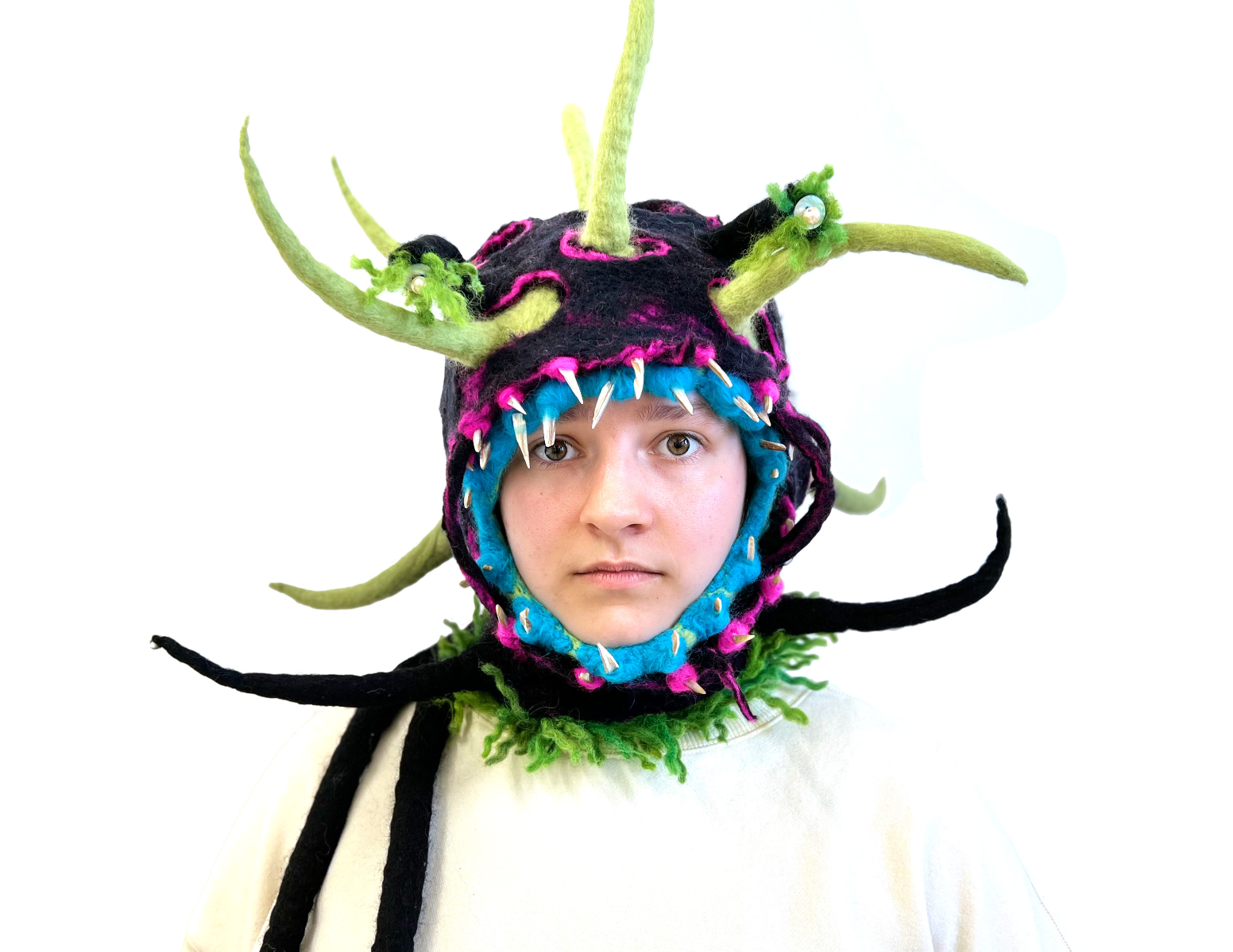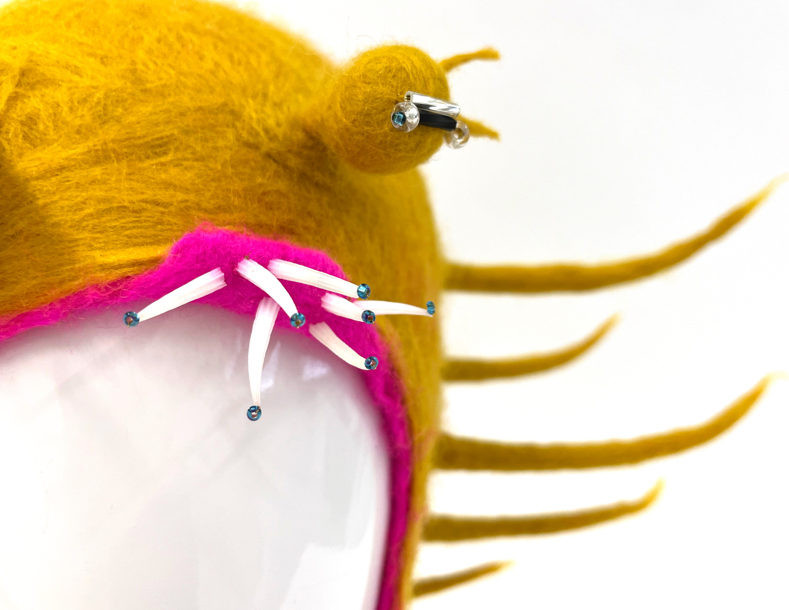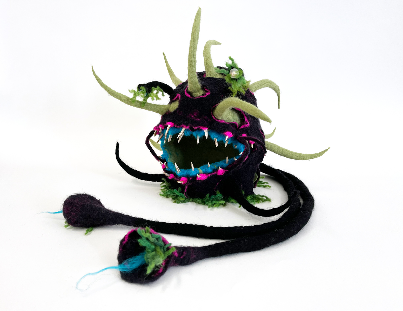 Victoria Saffell reflects natural life in a comfortable yet grim way by merging dark perspectives with bright colors and soft textures. The story of Little Red Riding Hood has greatly inspired her throughout her craft, sparking her interest in darker themes of survival and character narratives. In her collections, she draws inspiration from song lyrics and incorporates them into her work titles. Her current musical inspiration comes from Cosmo Sheldrake’s song “Come Along Now.” Victoria Saffell’s evolving collection, Cuddle Up, combines soft sculpture and surface design, showcasing her skills from Savannah College of Art and Design. As she delves into the predator-prey dynamic, survival emerges as a captivating theme for Victoria. It's the immediate, instinctual conflict that piques her interest. Within her art, she explores the predators lurking in the deep waters, fascinated by their variations of spikes, teeth, tendrils, eyes, and stingers. Each of these features serves a crucial purpose, enhancing their survival instincts with every movement. Through her creations, she seeks to transform the wearer into a predator of the depths, serving as a reminder that we, too, are predators lurking for a chance to attack.