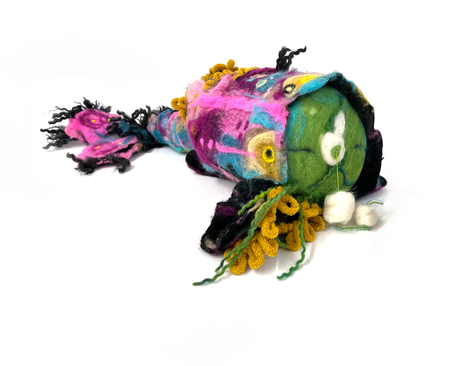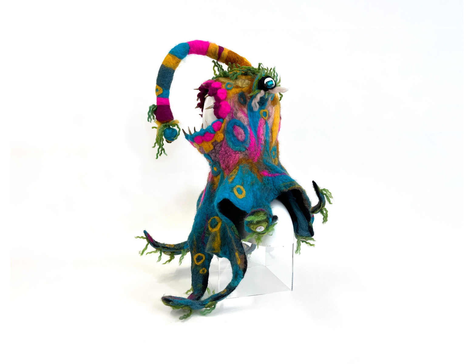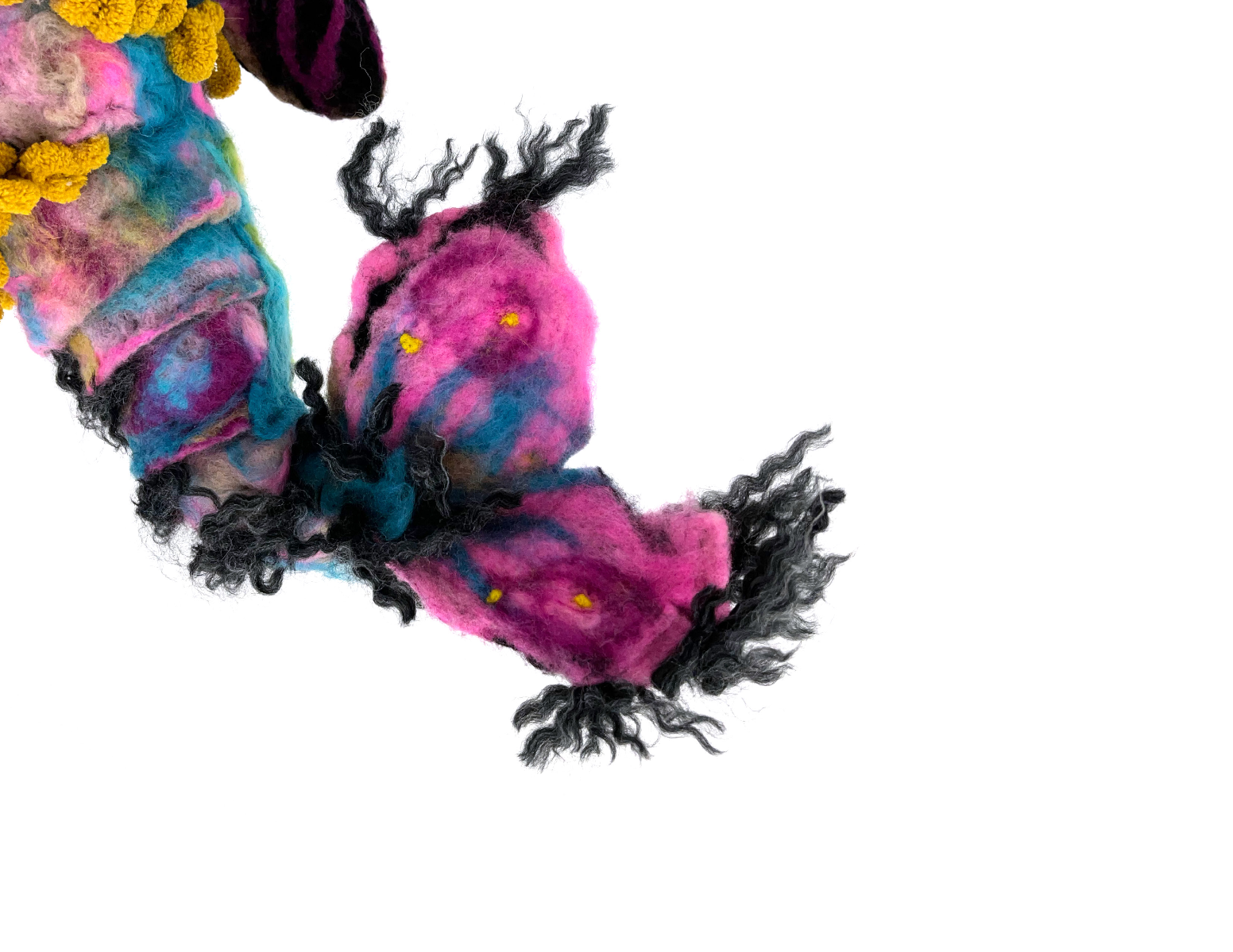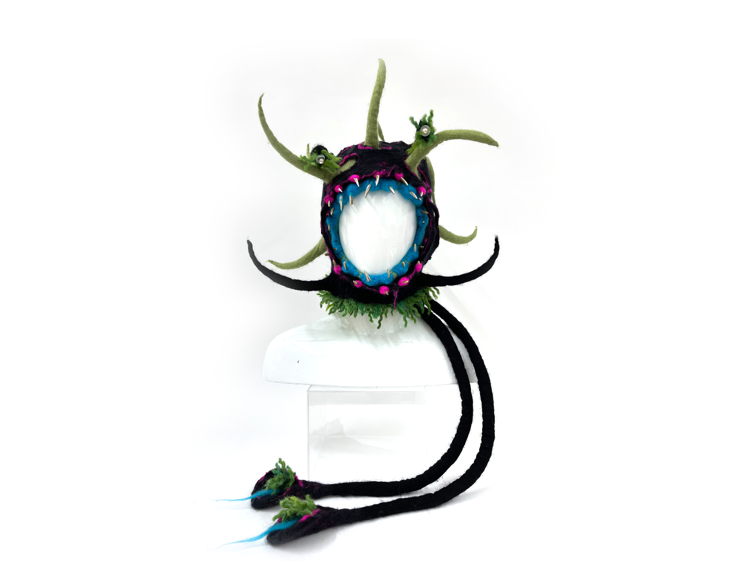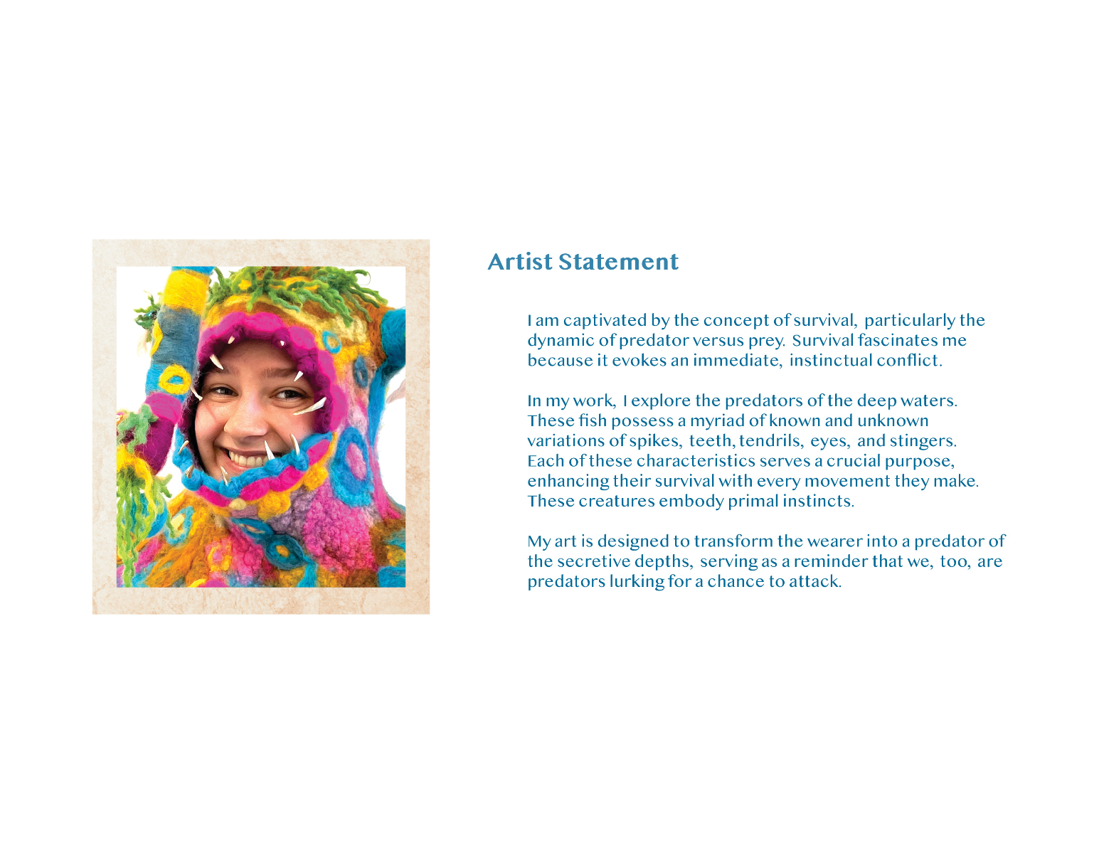Victoria Saffell reflects natural life in a comfortable yet grim way by merging dark perspectives with bright colors and soft textures. The story of Little Red Riding Hood has greatly inspired her throughout her craft, sparking her interest in darker themes of survival and character narratives. In her collections, she draws inspiration from song lyrics and incorporates them into her work titles. Her current musical inspiration comes from Cosmo Sheldrake’s song “Come Along Now.” Victoria Saffell’s evolving collection, Cuddle Up, combines soft sculpture and surface design, showcasing her skills from Savannah College of Art and Design. As she delves into the predator-prey dynamic, survival emerges as a captivating theme for Victoria. It's the immediate, instinctual conflict that piques her interest. Within her art, she explores the predators lurking in the deep waters, fascinated by their variations of spikes, teeth, tendrils, eyes, and stingers. Each of these features serves a crucial purpose, enhancing their survival instincts with every movement. Through her creations, she seeks to transform the wearer into a predator of the depths, serving as a reminder that we, too, are predators lurking for a chance to attack.