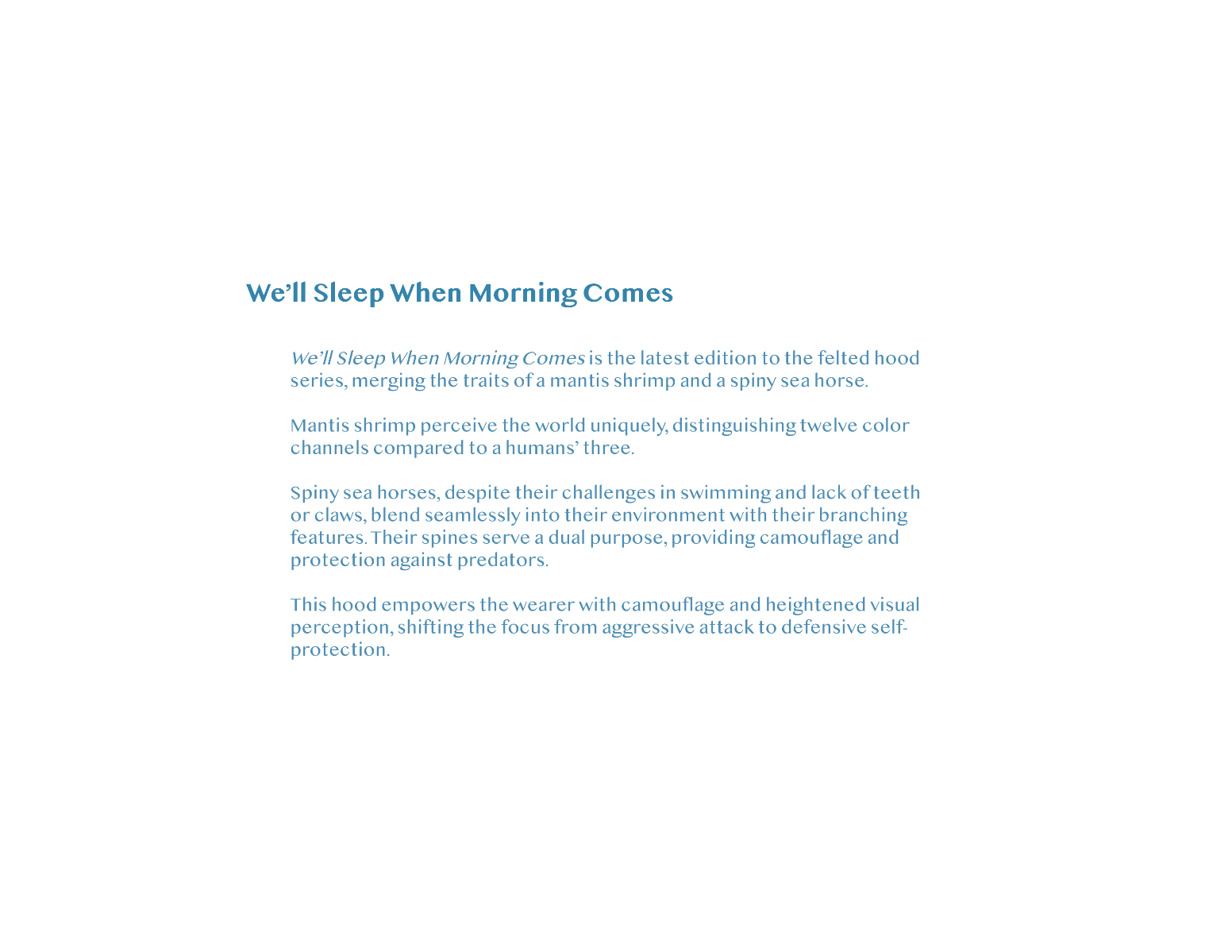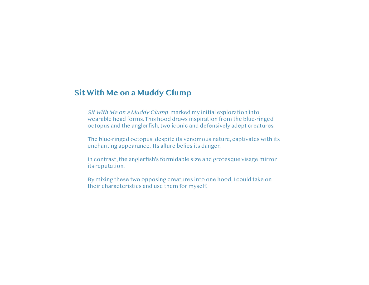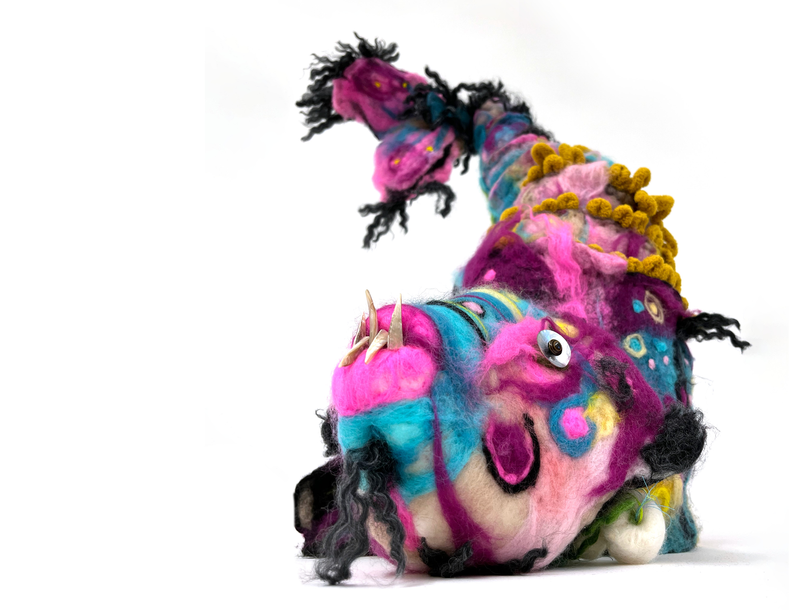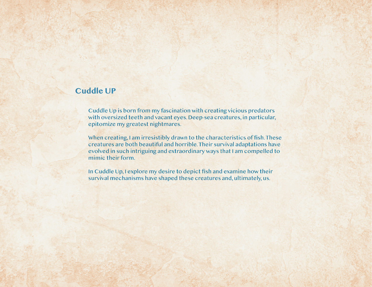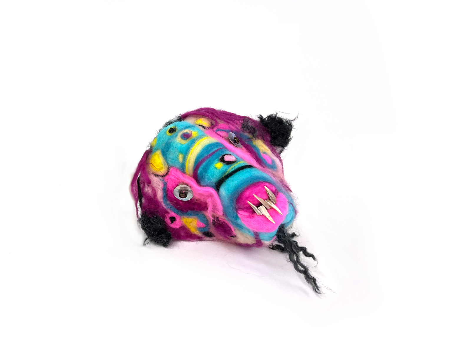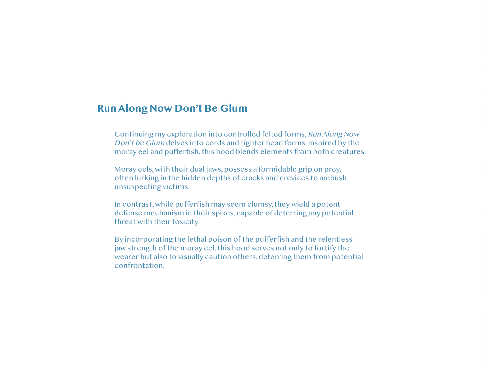Victoria Saffell reflects natural life in a comfortable yet grim way by merging dark perspectives with bright colors and soft textures. The story of Little Red Riding Hood has greatly inspired her throughout her craft, sparking her interest in darker themes of survival and character narratives. In her collections, she draws inspiration from song lyrics and incorporates them into her work titles. Her current musical inspiration comes from Cosmo Sheldrake’s song “Come Along Now.” Victoria Saffell’s evolving collection, Cuddle Up, combines soft sculpture and surface design, showcasing her skills from Savannah College of Art and Design. As she delves into the predator-prey dynamic, survival emerges as a captivating theme for Victoria. It's the immediate, instinctual conflict that piques her interest. Within her art, she explores the predators lurking in the deep waters, fascinated by their variations of spikes, teeth, tendrils, eyes, and stingers. Each of these features serves a crucial purpose, enhancing their survival instincts with every movement. Through her creations, she seeks to transform the wearer into a predator of the depths, serving as a reminder that we, too, are predators lurking for a chance to attack.