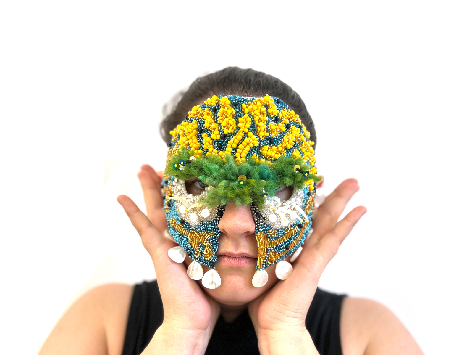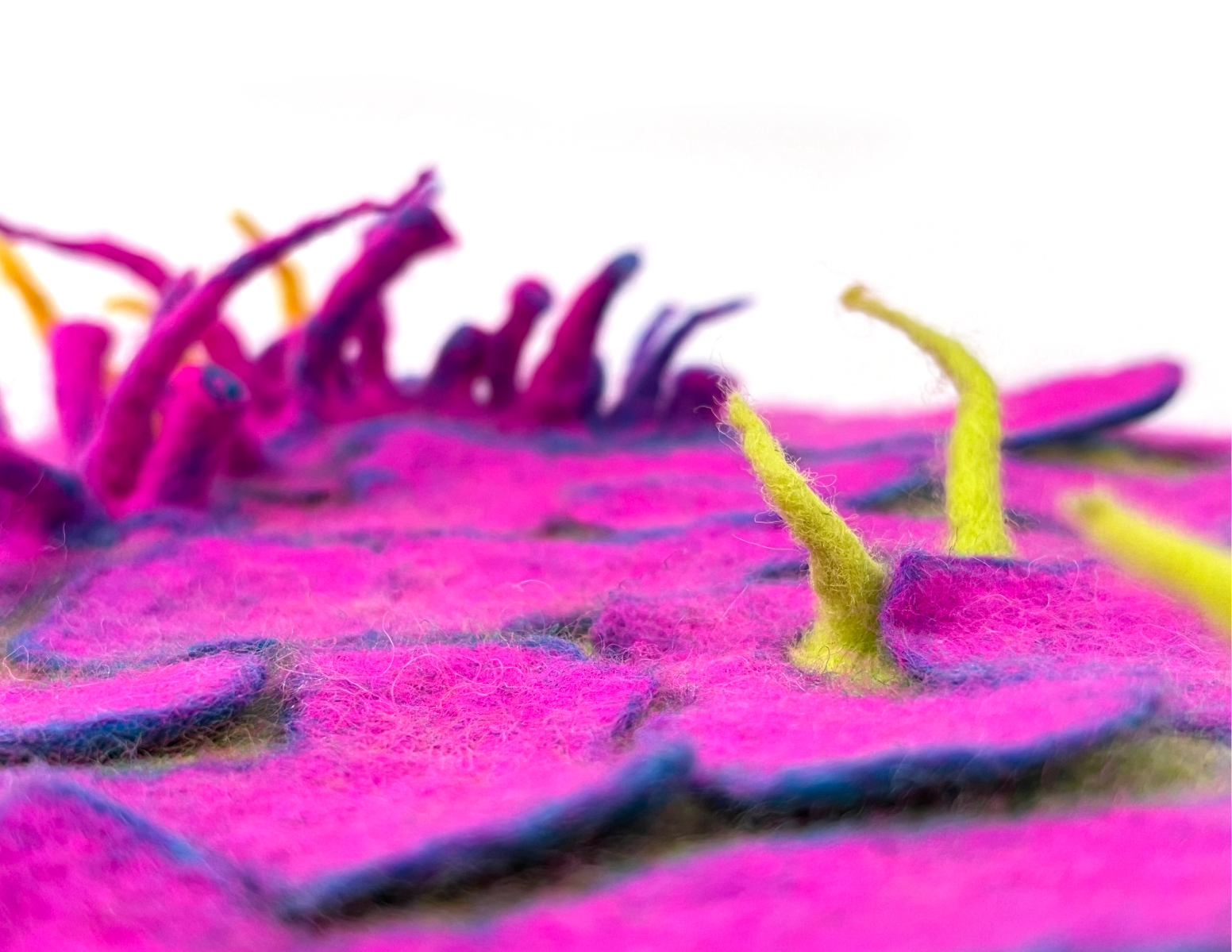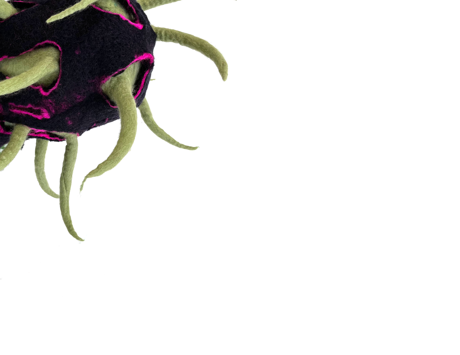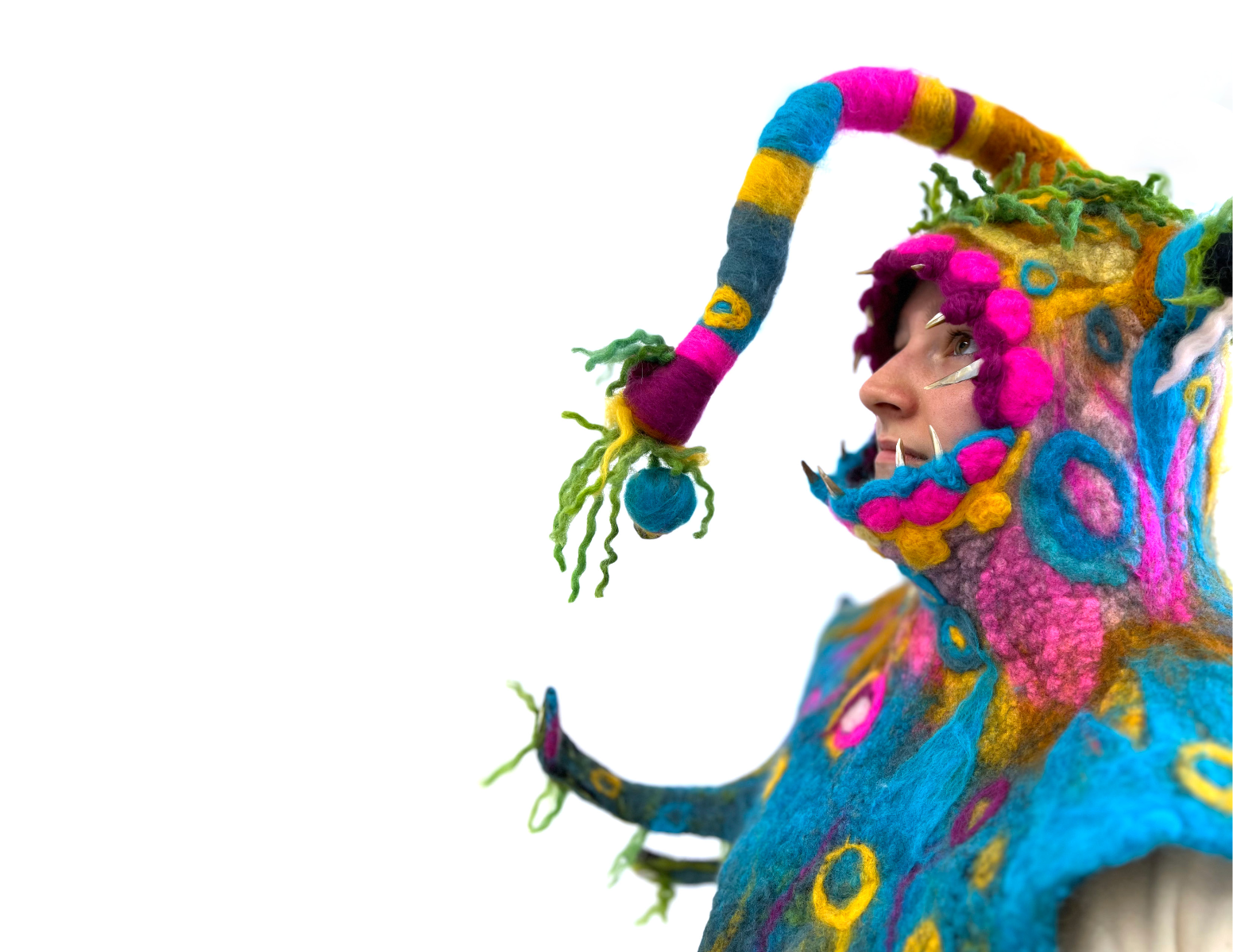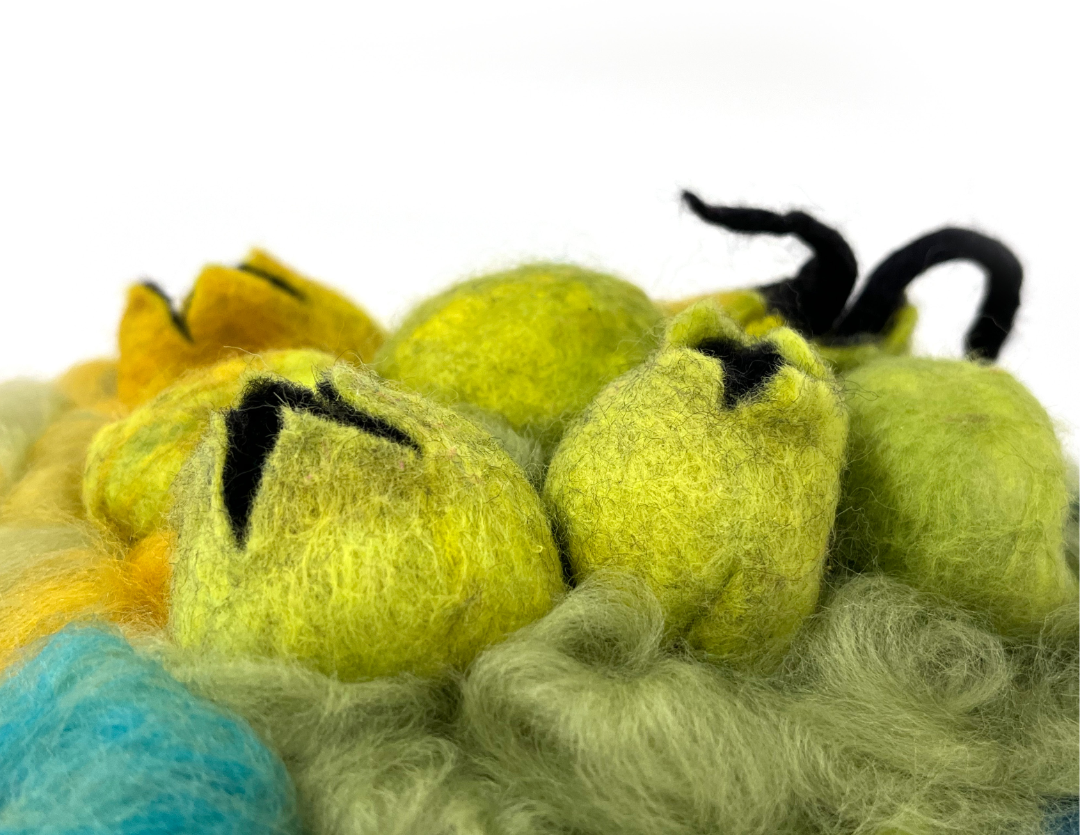 Victoria Saffell reflects natural life in a comfortable yet grim way by merging dark perspectives with bright colors and soft textures. The story of Little Red Riding Hood has greatly inspired her throughout her craft, sparking her interest in darker themes of survival and character narratives. In her collections, she draws inspiration from song lyrics and incorporates them into her work titles. Her current musical inspiration comes from Cosmo Sheldrake’s song “Come Along Now.” Victoria Saffell’s evolving collection, Cuddle Up, combines soft sculpture and surface design, showcasing her skills from Savannah College of Art and Design. As she delves into the predator-prey dynamic, survival emerges as a captivating theme for Victoria. It's the immediate, instinctual conflict that piques her interest. Within her art, she explores the predators lurking in the deep waters, fascinated by their variations of spikes, teeth, tendrils, eyes, and stingers. Each of these features serves a crucial purpose, enhancing their survival instincts with every movement. Through her creations, she seeks to transform the wearer into a predator of the depths, serving as a reminder that we, too, are predators lurking for a chance to attack.