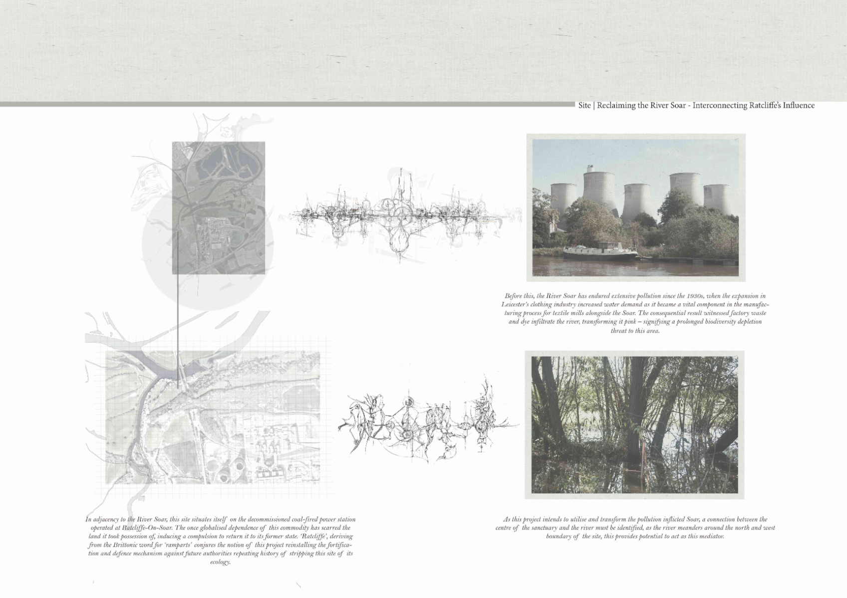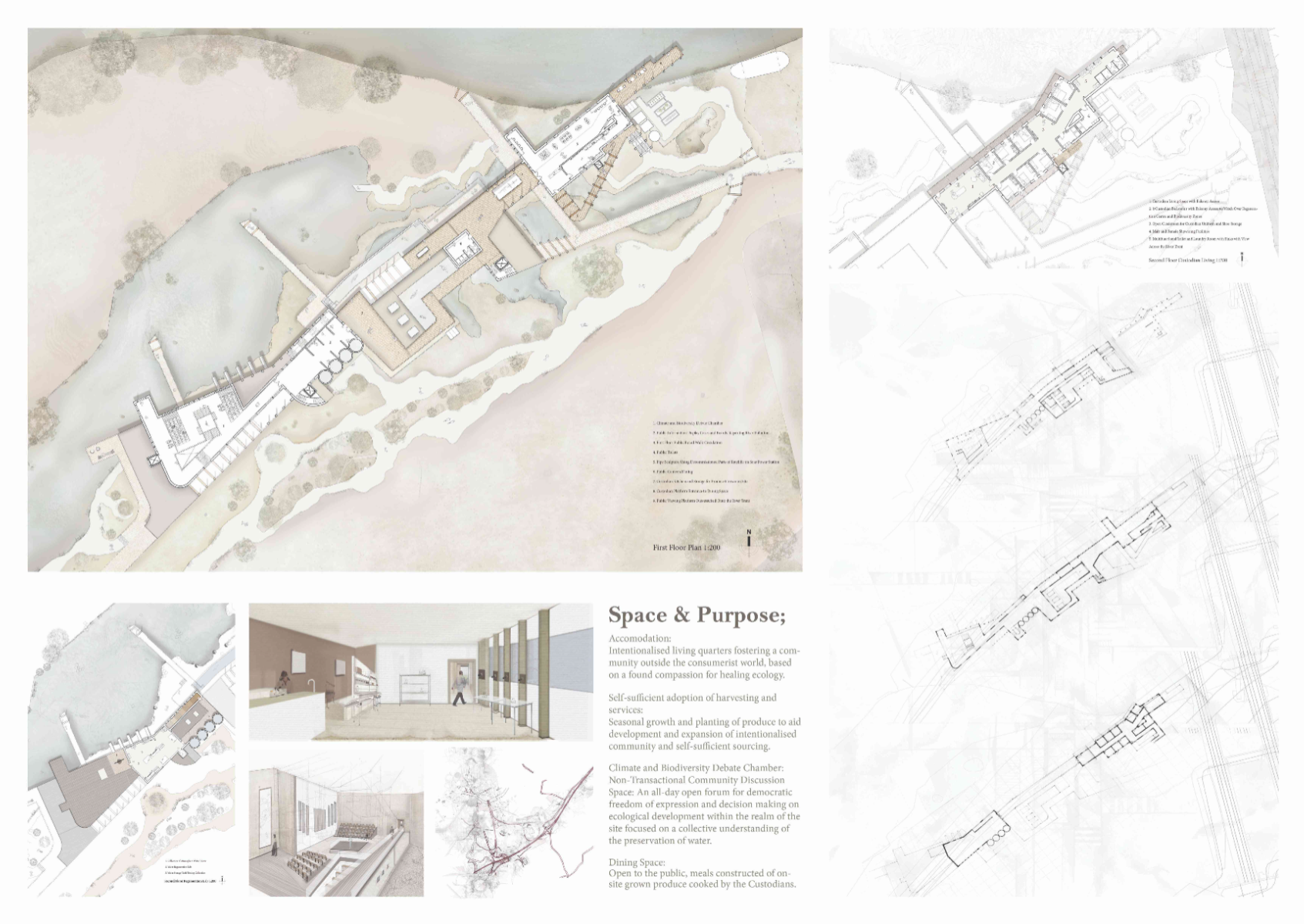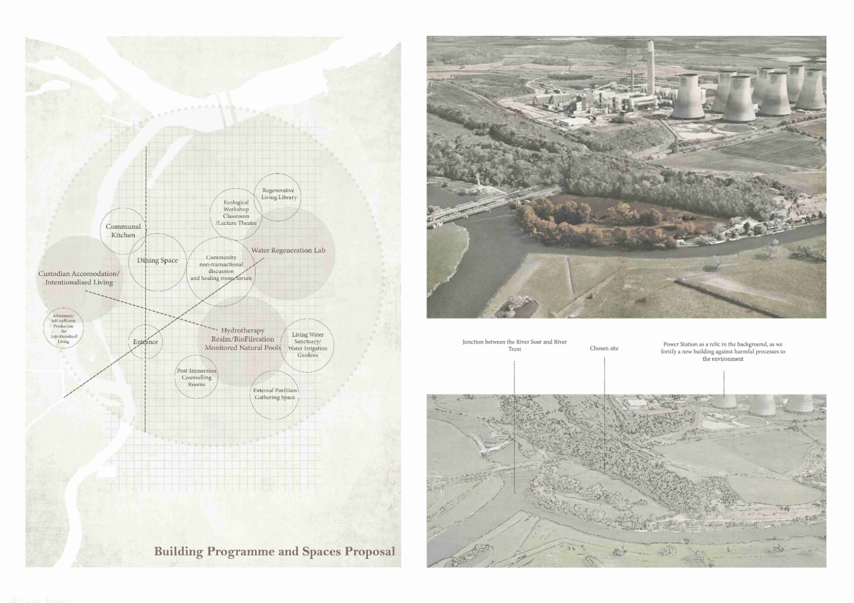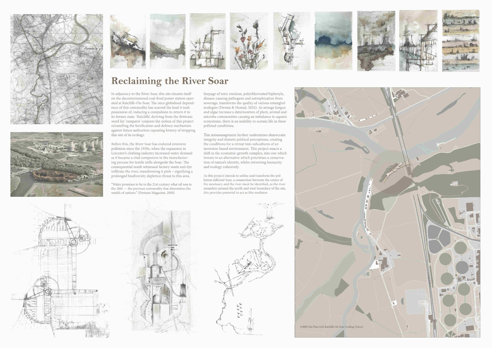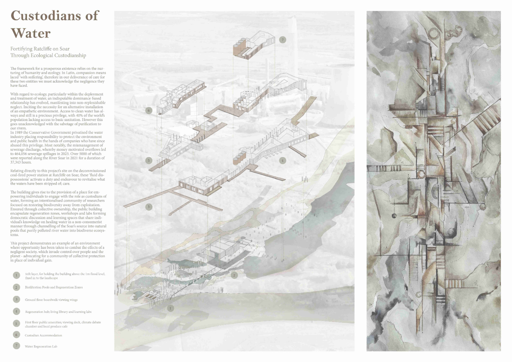 The framework for a prosperous existence relies on the nurturing of ecology. However, within the treatment of water, a dominance-based relationship has evolved. Access to clean water is a precious privilege, with 40% of the world’s population lacking access to basic sanitation. However, this goes unacknowledged with the sabotage of purification to our rivers. The mismanagement of sewerage discharge, led to 464,056 sewerage spillages in 2023. Over 5000 of which were reported along the River Soar. Relating directly to the project’s site at Ratcliffe on Soar, Nottingham, England, these fluid dispossessions activate a duty to revitalise what the waters have been stripped of; care. Inciting the necessity for an installation of an empathetic environment, whereby rights are restored to the river as a living entity. The building gives rise to the provision of a place for empowering individuals to engage with the role as ‘Custodians of Water.’ The public building encapsulates regeneration zones, workshops and labs forming democratic discussion spaces as well as channeling the River Soar into natural pools that purify polluted river water into biodiverse ecosystems. This project aims to combat the effects of a negligent society, advocating for a community of collective protection in place of individual gain.