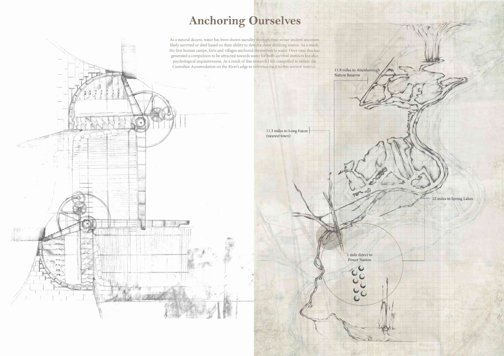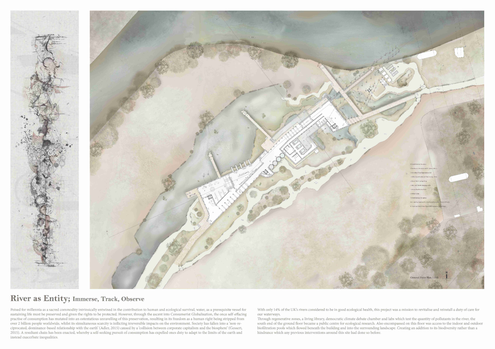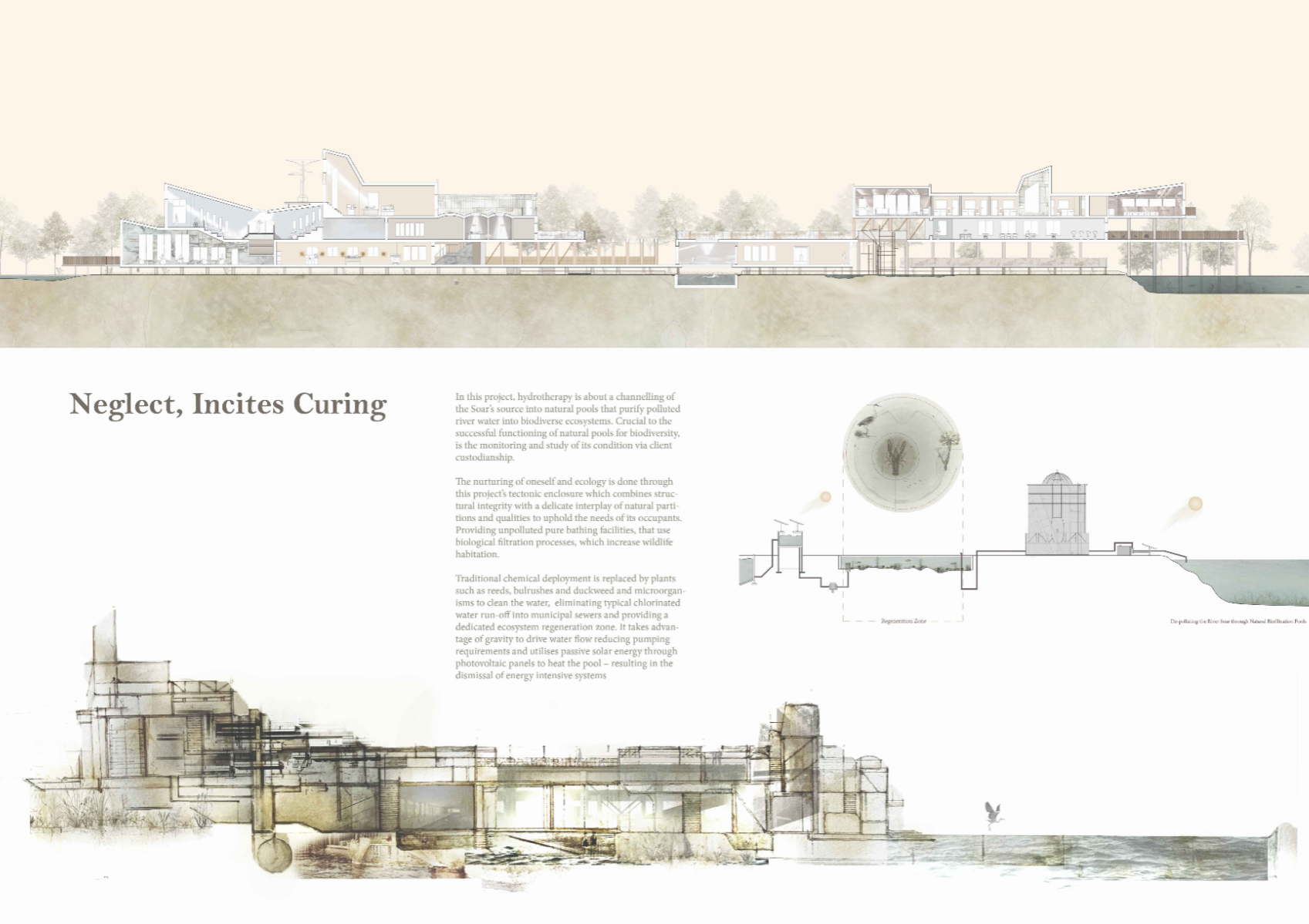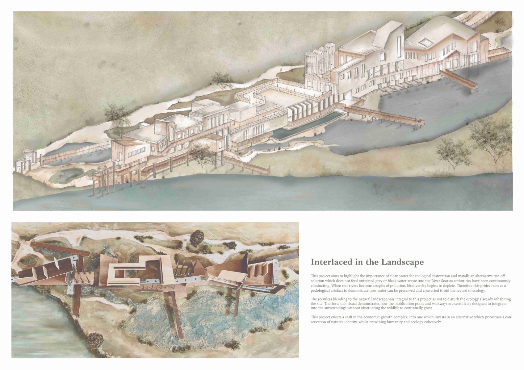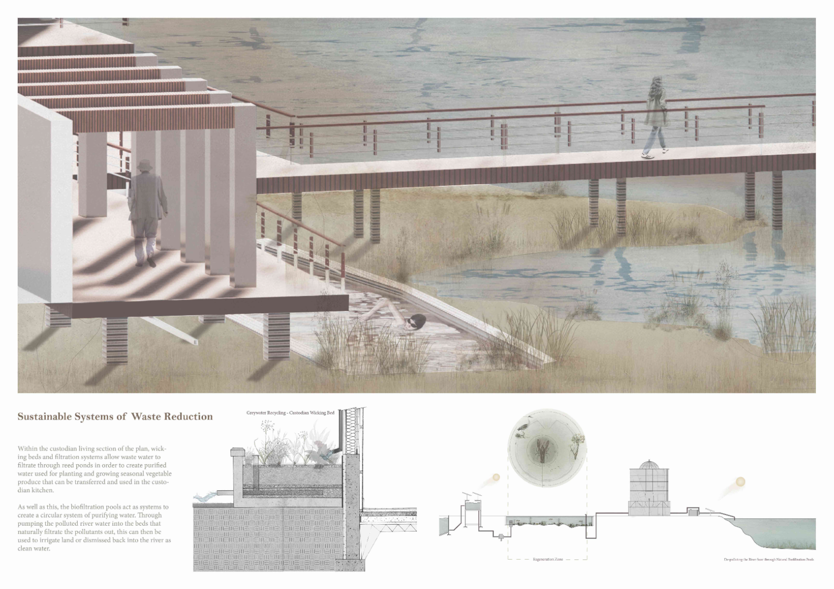 The framework for a prosperous existence relies on the nurturing of ecology. However, within the treatment of water, a dominance-based relationship has evolved. Access to clean water is a precious privilege, with 40% of the world’s population lacking access to basic sanitation. However, this goes unacknowledged with the sabotage of purification to our rivers. The mismanagement of sewerage discharge, led to 464,056 sewerage spillages in 2023. Over 5000 of which were reported along the River Soar. Relating directly to the project’s site at Ratcliffe on Soar, Nottingham, England, these fluid dispossessions activate a duty to revitalise what the waters have been stripped of; care. Inciting the necessity for an installation of an empathetic environment, whereby rights are restored to the river as a living entity. The building gives rise to the provision of a place for empowering individuals to engage with the role as ‘Custodians of Water.’ The public building encapsulates regeneration zones, workshops and labs forming democratic discussion spaces as well as channeling the River Soar into natural pools that purify polluted river water into biodiverse ecosystems. This project aims to combat the effects of a negligent society, advocating for a community of collective protection in place of individual gain.