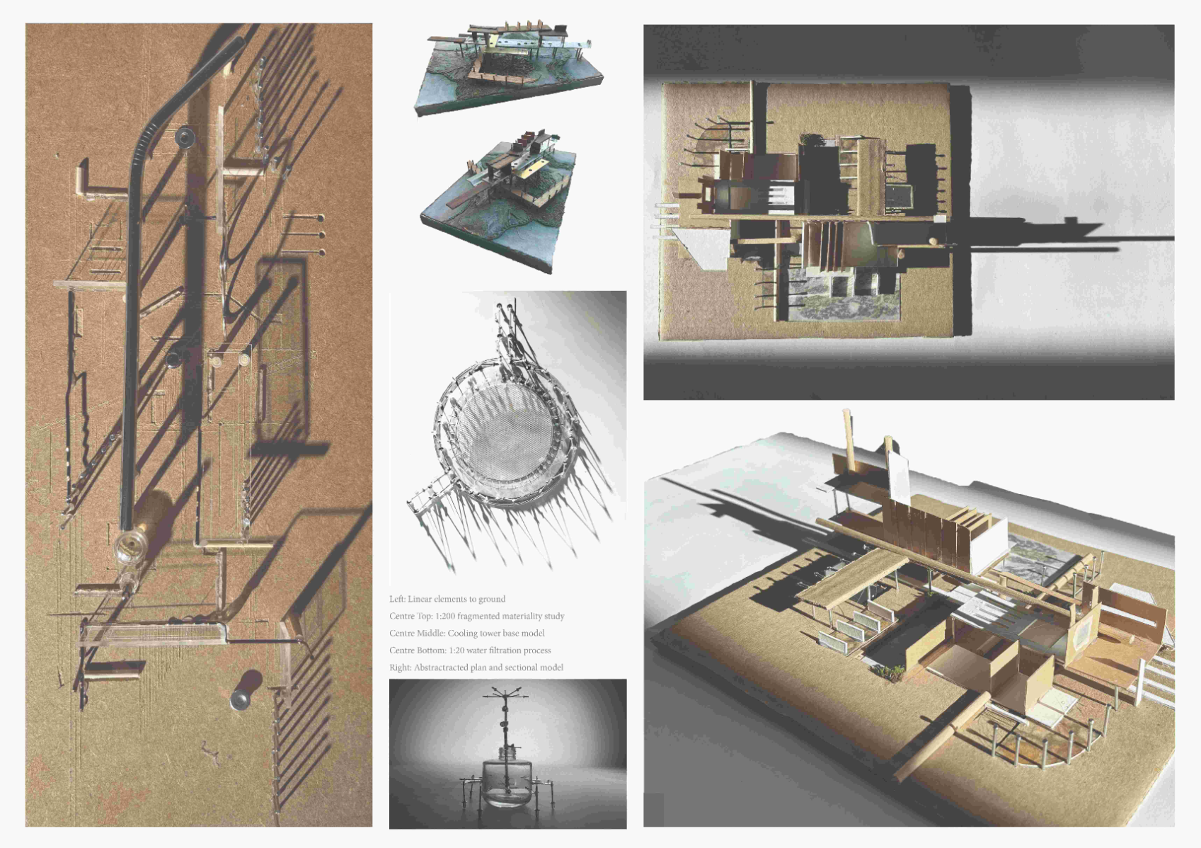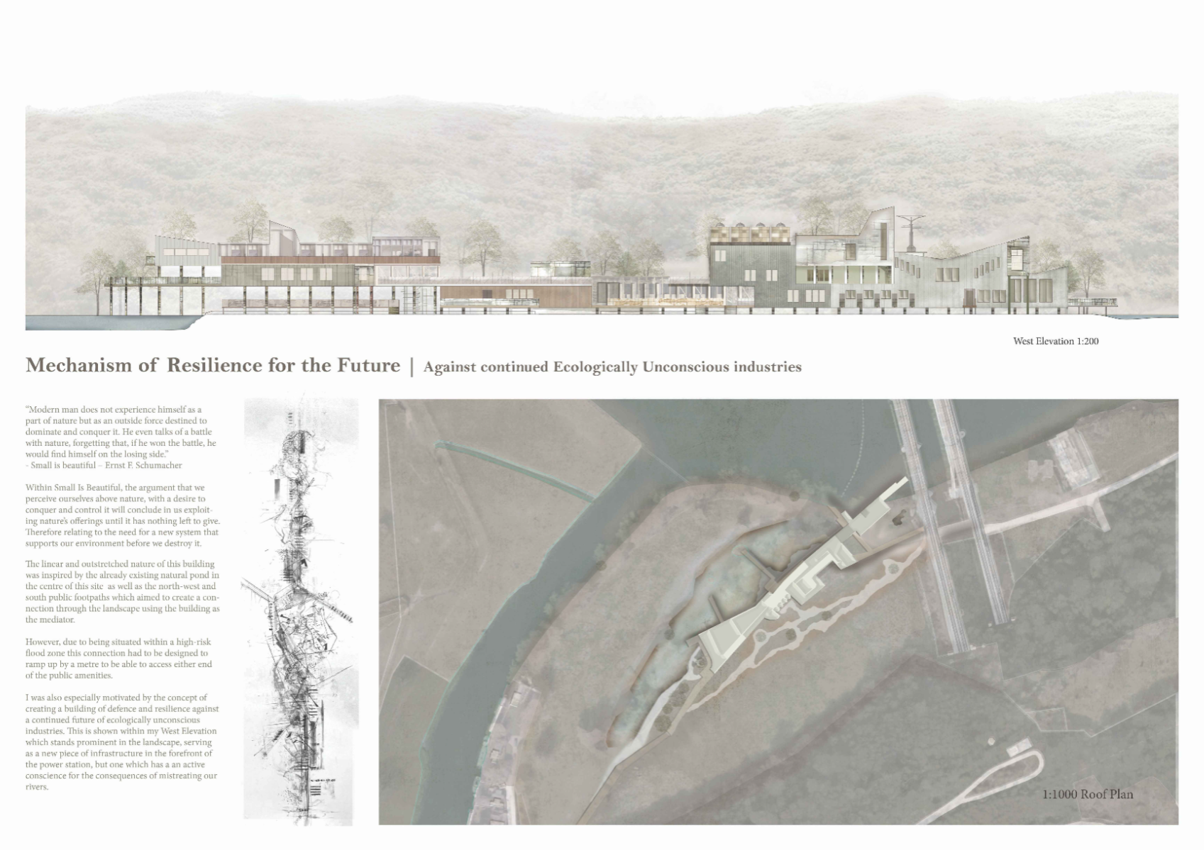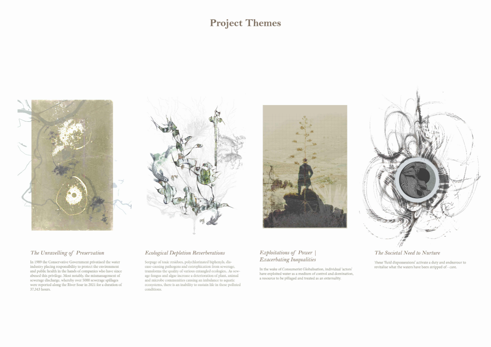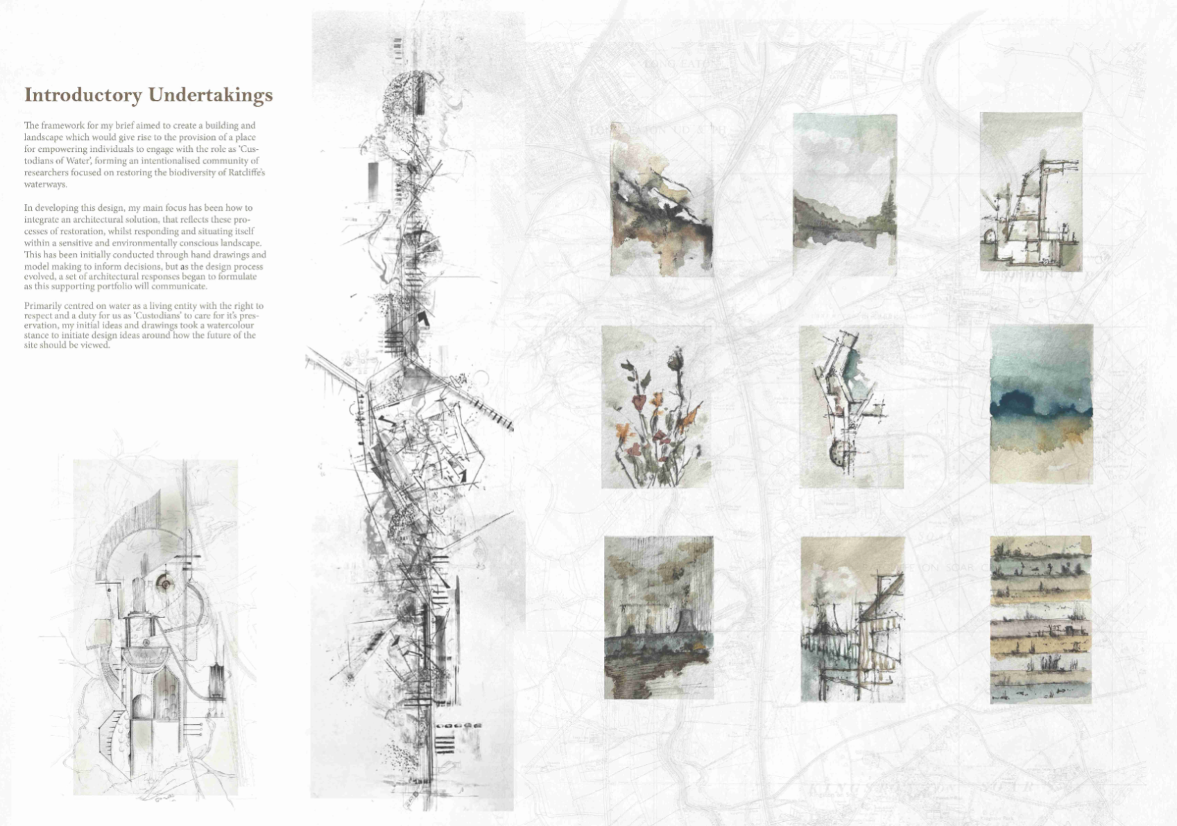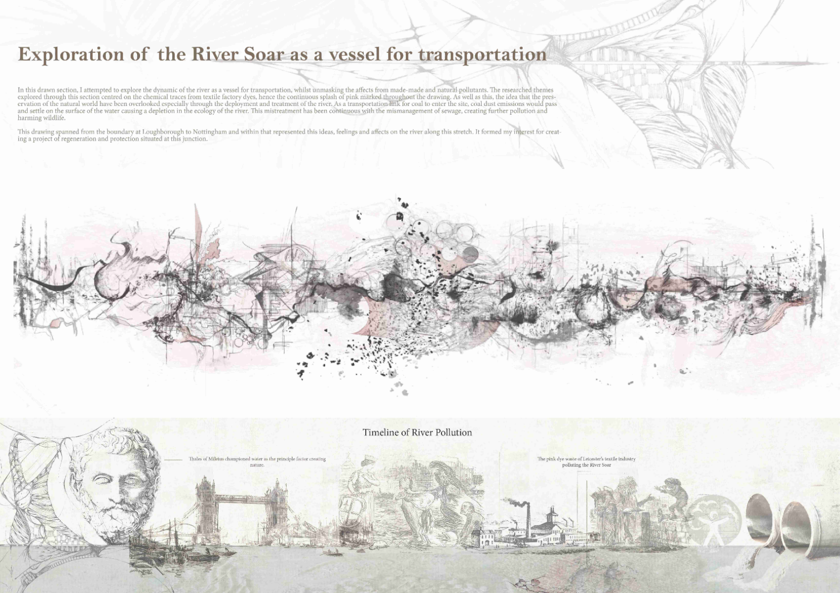 The framework for a prosperous existence relies on the nurturing of ecology. However, within the treatment of water, a dominance-based relationship has evolved. Access to clean water is a precious privilege, with 40% of the world’s population lacking access to basic sanitation. However, this goes unacknowledged with the sabotage of purification to our rivers. The mismanagement of sewerage discharge, led to 464,056 sewerage spillages in 2023. Over 5000 of which were reported along the River Soar. Relating directly to the project’s site at Ratcliffe on Soar, Nottingham, England, these fluid dispossessions activate a duty to revitalise what the waters have been stripped of; care. Inciting the necessity for an installation of an empathetic environment, whereby rights are restored to the river as a living entity. The building gives rise to the provision of a place for empowering individuals to engage with the role as ‘Custodians of Water.’ The public building encapsulates regeneration zones, workshops and labs forming democratic discussion spaces as well as channeling the River Soar into natural pools that purify polluted river water into biodiverse ecosystems. This project aims to combat the effects of a negligent society, advocating for a community of collective protection in place of individual gain.