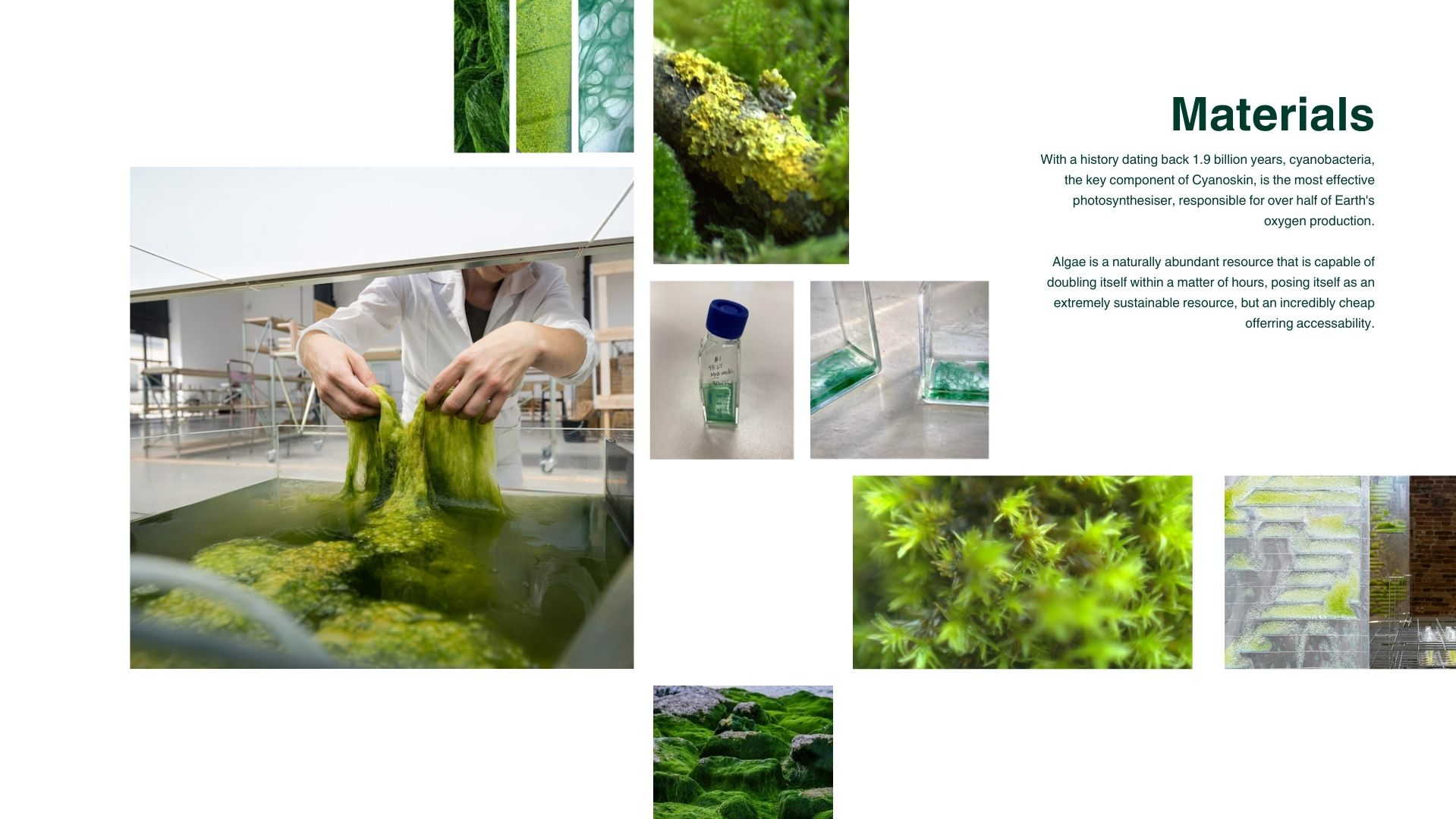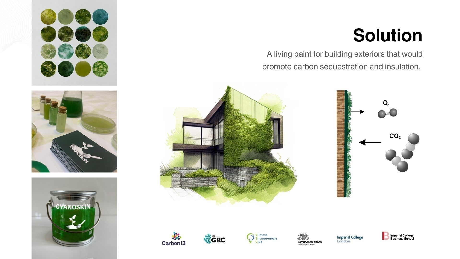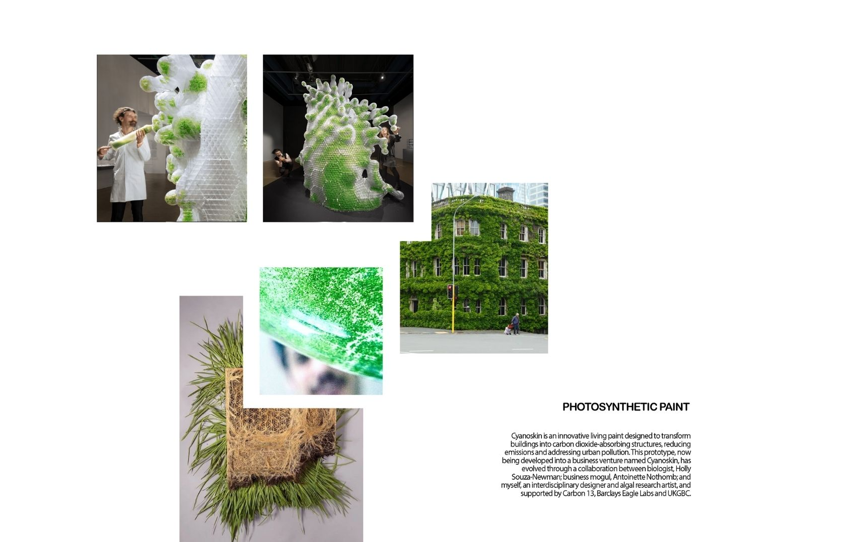 Cyanoskin is centred around an innovative living paint designed to transform buildings into carbon dioxide-absorbing structures, reducing emissions and addressing urban pollution. This prototype, now being developed into a business venture named Cyanoskin, has evolved through a collaboration between biologist, Holly Souza-Newman; business mogul, Antoinette Nothomb; and myself, an interdisciplinary designer and algal research artist, and supported by Carbon 13, Barclays Eagle Labs and UKGBC.