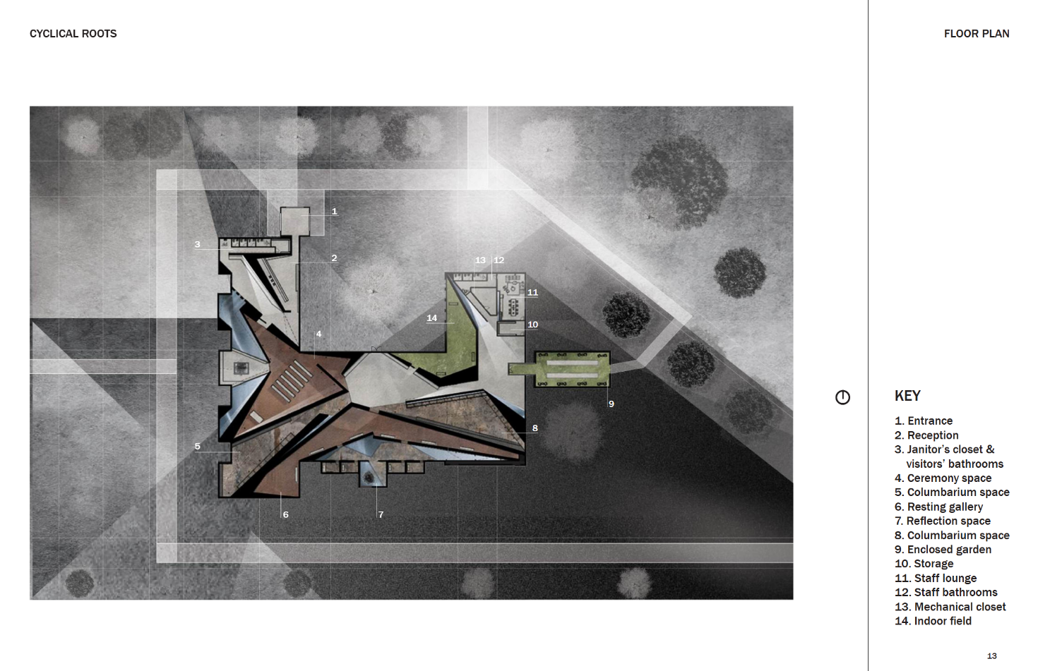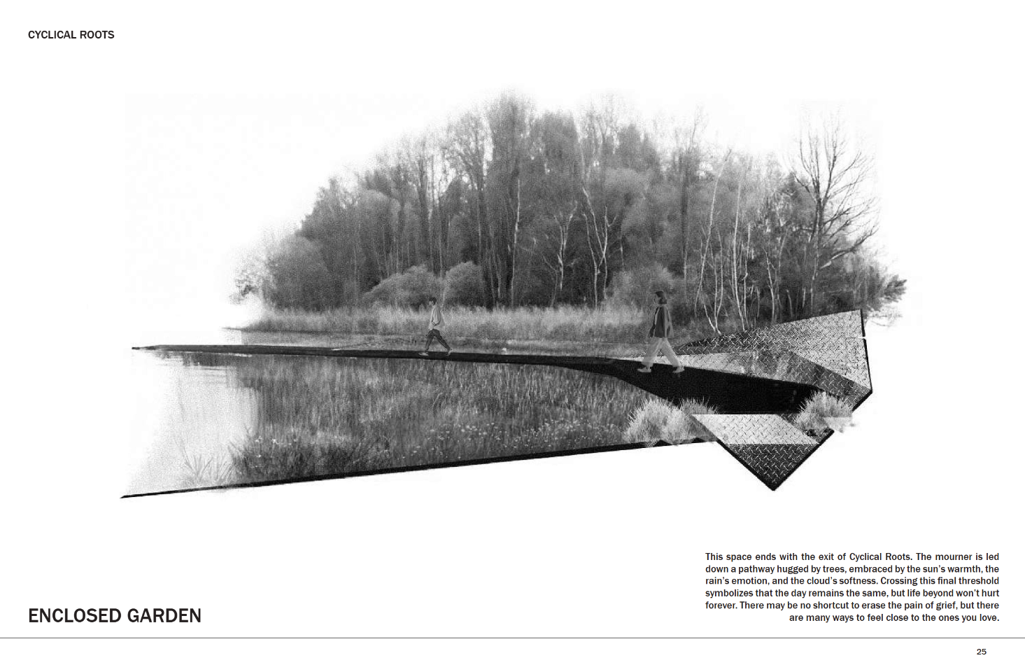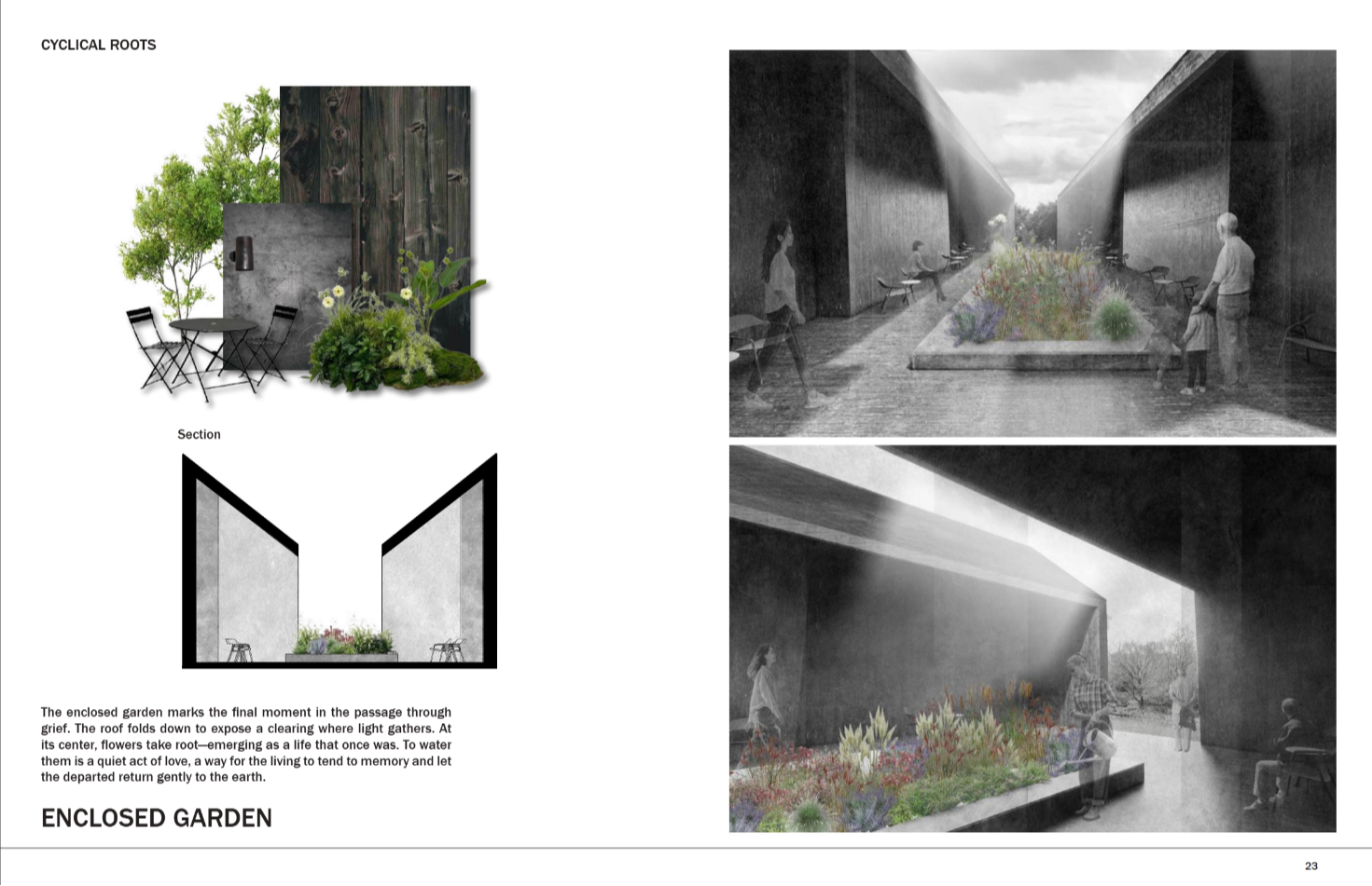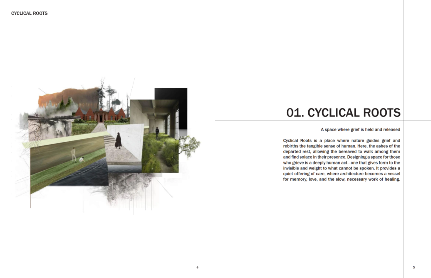 Cyclical Roots is a place where nature guides grief and gently allows for the rebirth of the human spirit. It holds the ashes of the departed and offers meaningful solitude for those mourning. The name is drawn from the rhythm of the seasons—winter’s decay mirroring the heaviest moments of grief, and spring’s blooming flowers and lengthening days reflecting the gradual return of warmth and resilience. Loss is not just sorrow, but an enduring testament to love and connection. In every leaf, flower, and turning tree found inside Cyclical Roots, the memory of the departed lingers—patient, tender, and ever-present for those who choose to see.
