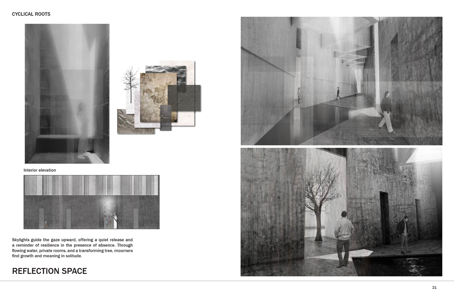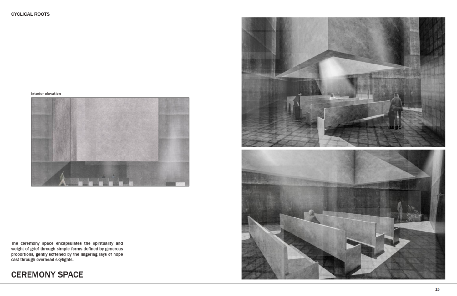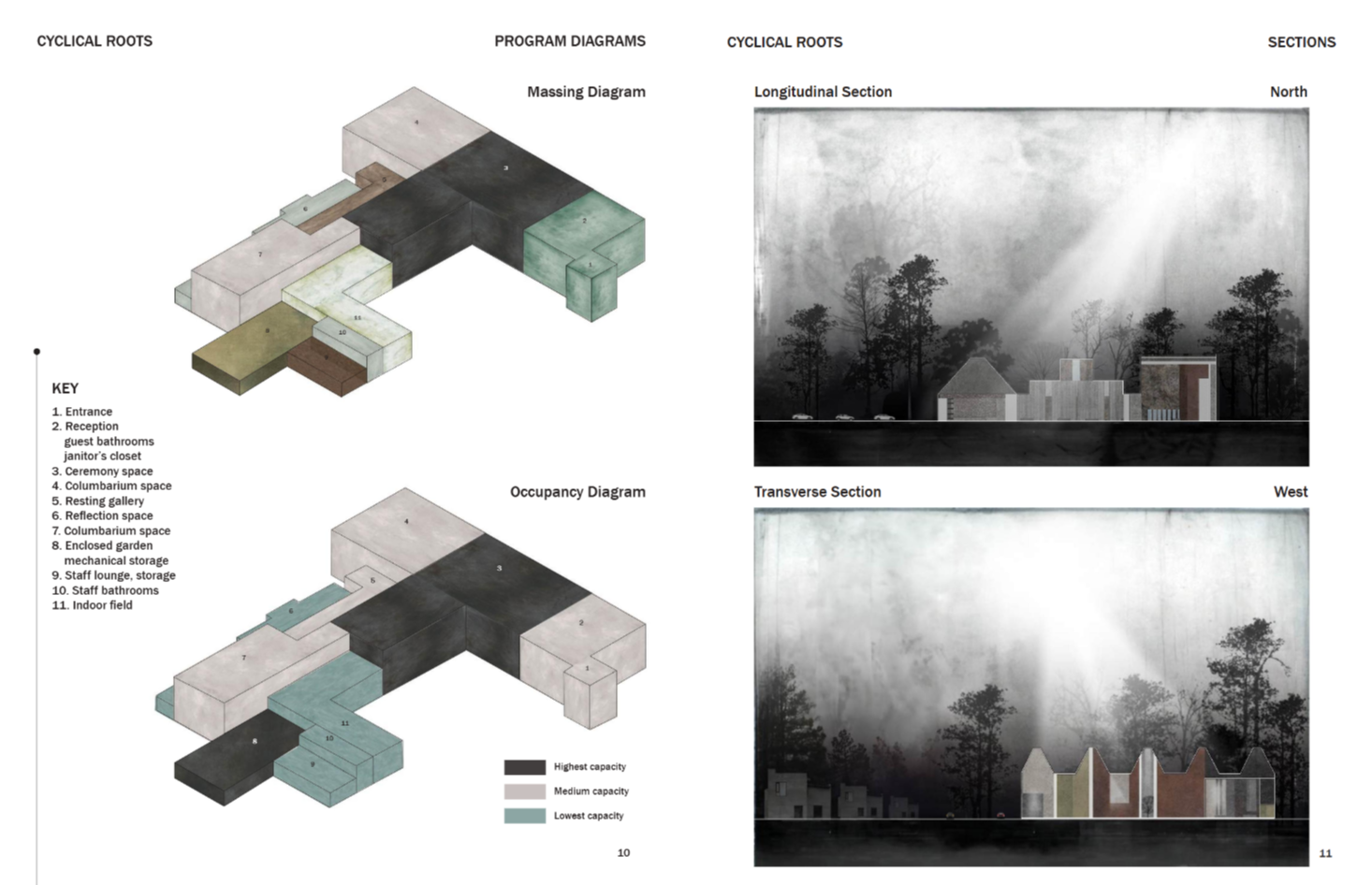 Cyclical Roots is a place where nature guides grief and gently allows for the rebirth of the human spirit. It holds the ashes of the departed and offers meaningful solitude for those mourning. The name is drawn from the rhythm of the seasons—winter’s decay mirroring the heaviest moments of grief, and spring’s blooming flowers and lengthening days reflecting the gradual return of warmth and resilience. Loss is not just sorrow, but an enduring testament to love and connection. In every leaf, flower, and turning tree found inside Cyclical Roots, the memory of the departed lingers—patient, tender, and ever-present for those who choose to see.