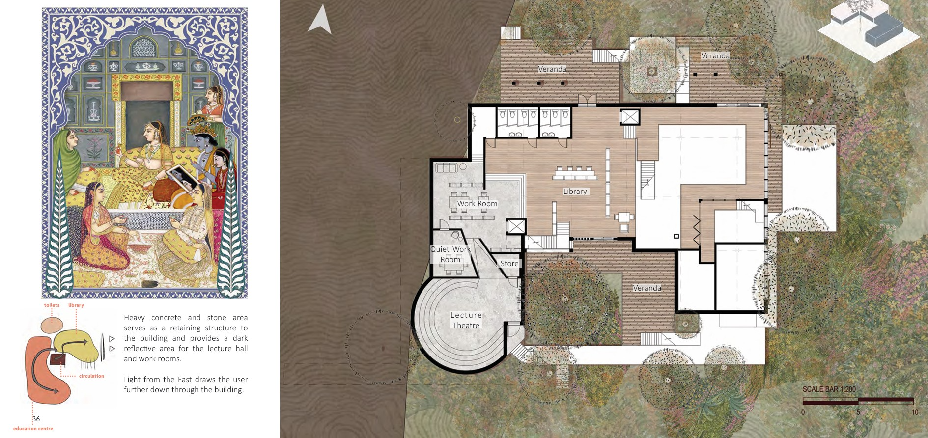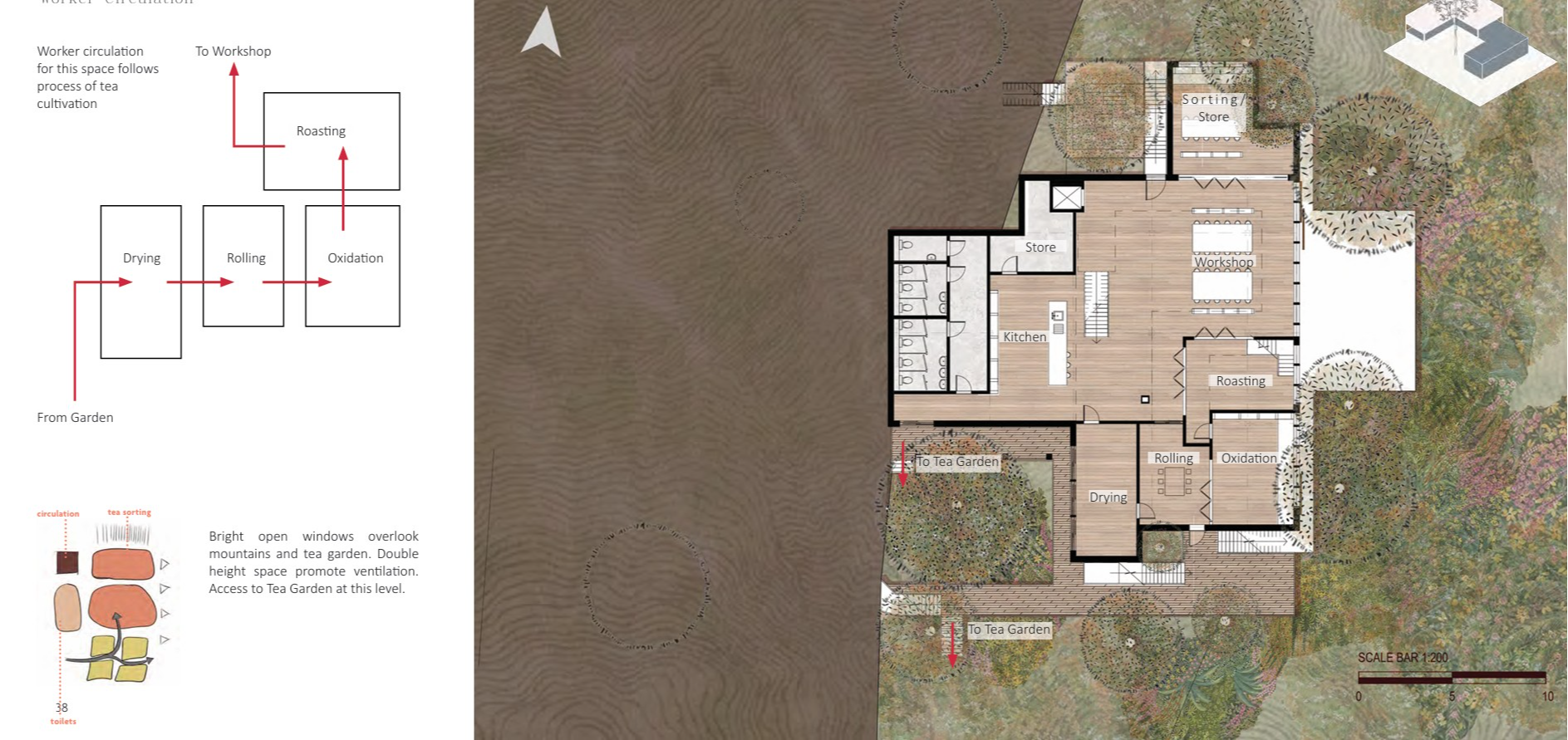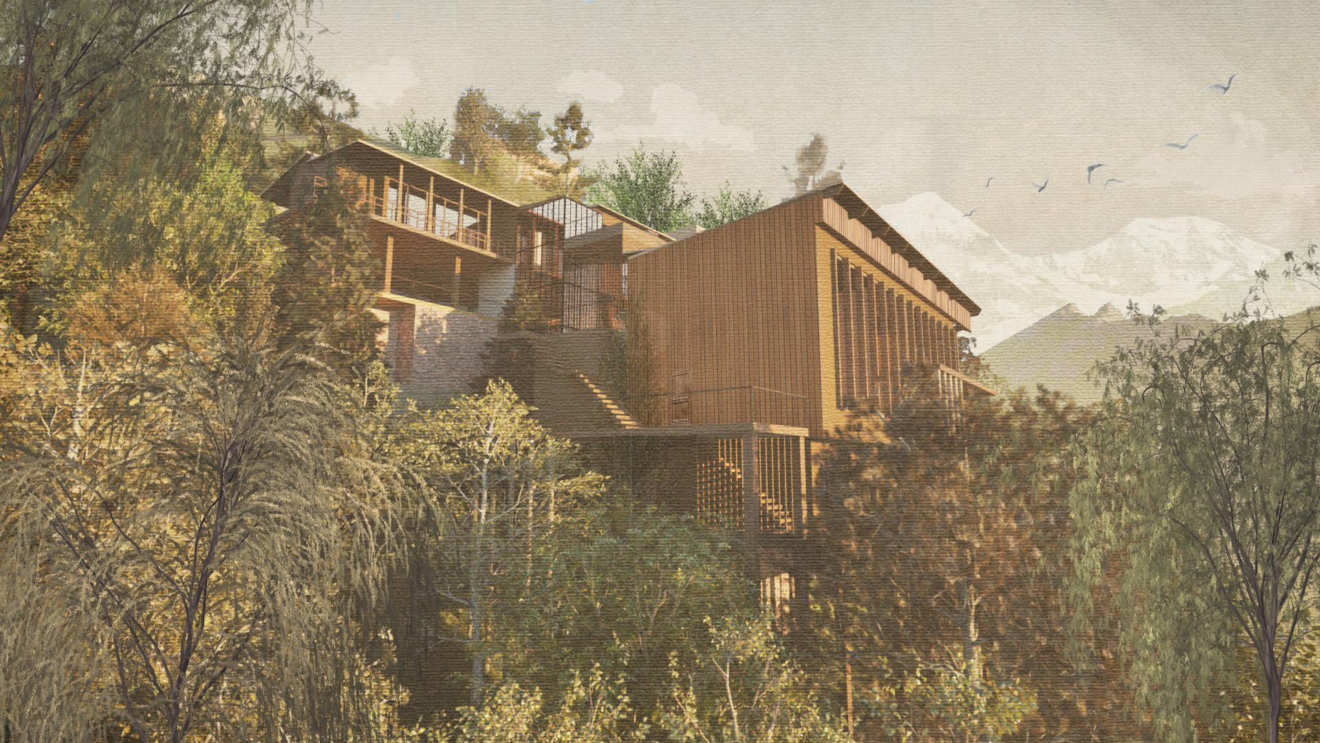 To preserve Darjeeling's delicate ecosystem, this permaculture tea house utilizes vernacular technologies and sustainable construction techniques to celebrate the local environment and produce a fine tea for the Darjeeling community. Workrooms allow local farmers to develop skills and share sustainable practices together.