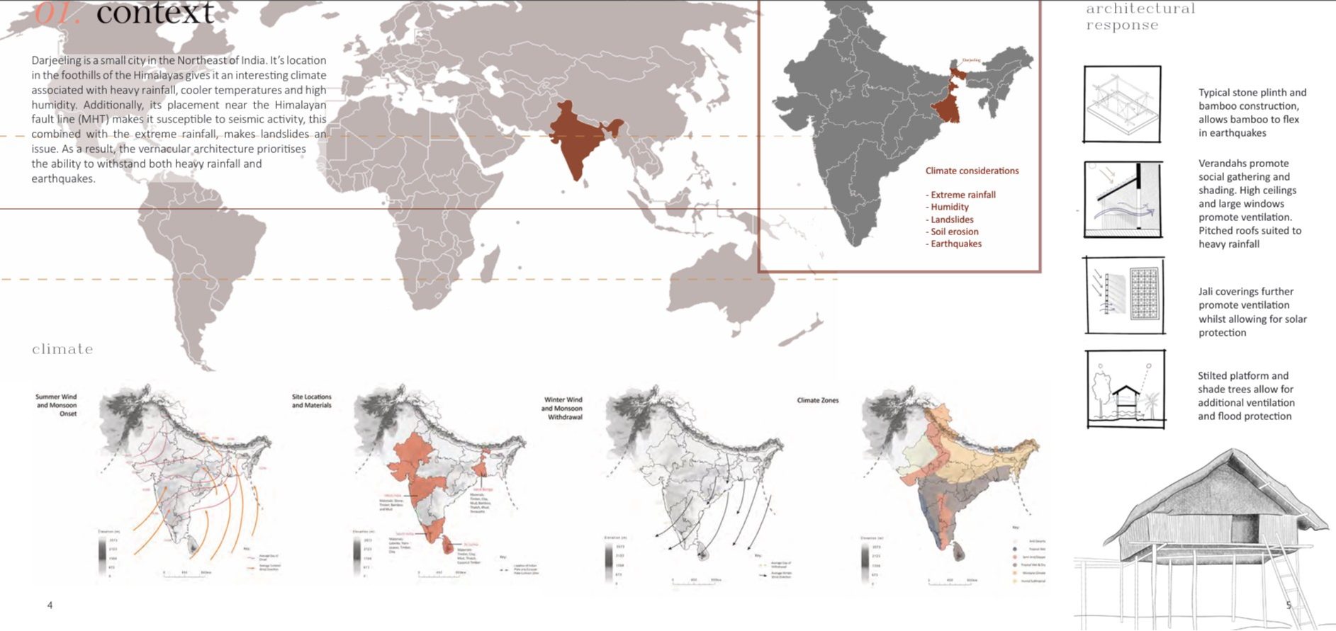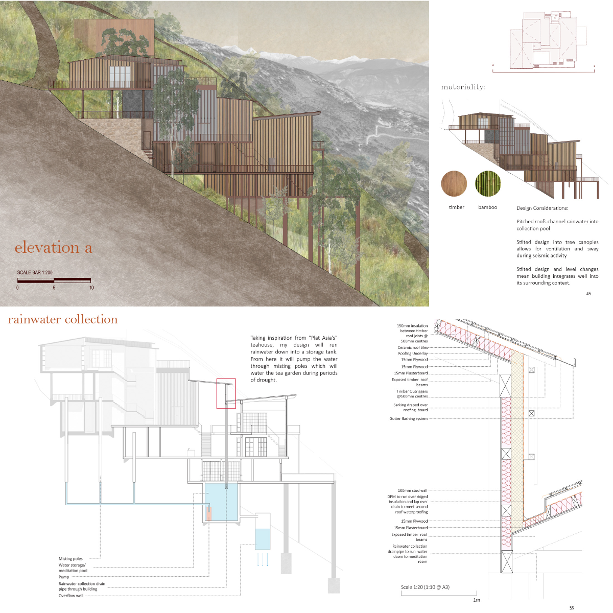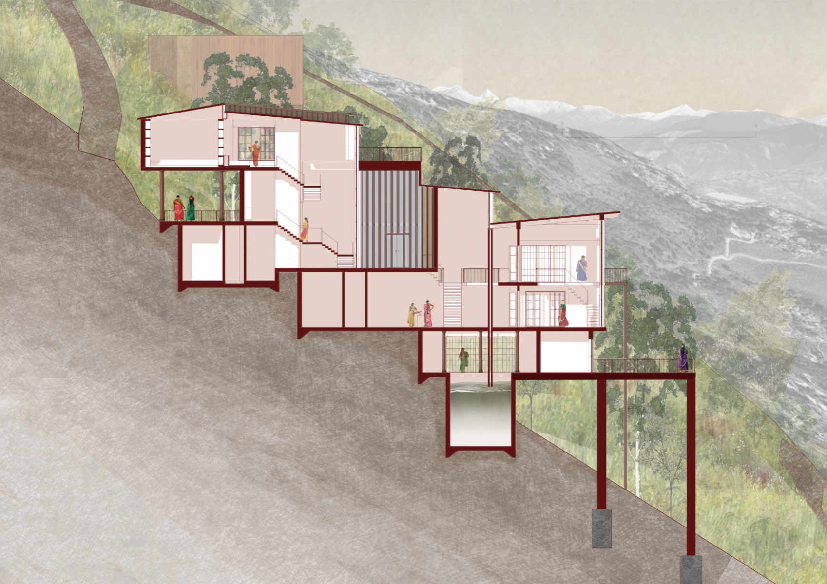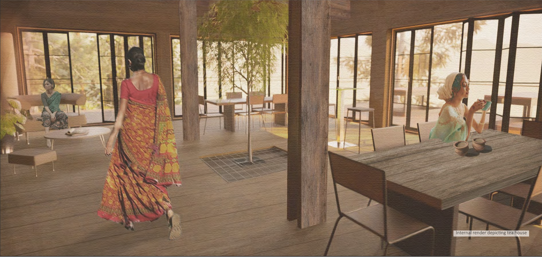 To preserve Darjeeling's delicate ecosystem, this permaculture tea house utilizes vernacular technologies and sustainable construction techniques to celebrate the local environment and produce a fine tea for the Darjeeling community. Workrooms allow local farmers to develop skills and share sustainable practices together.