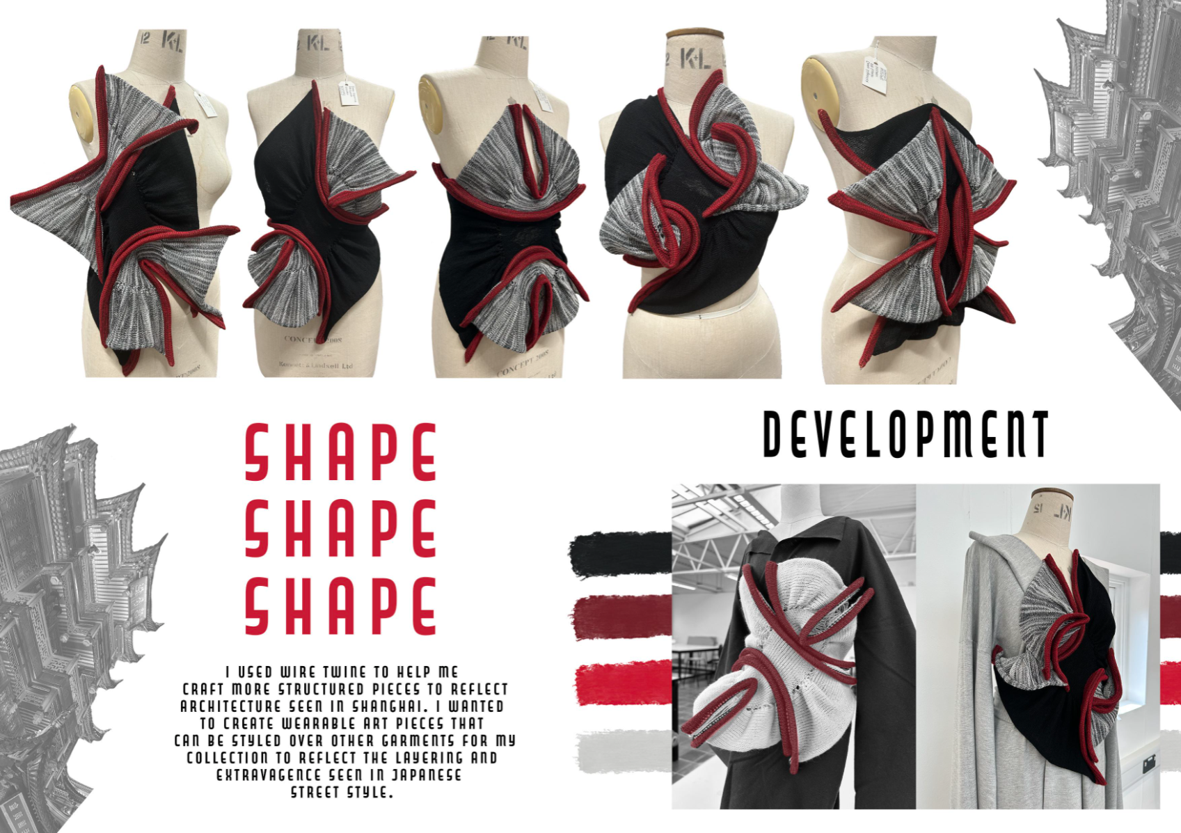 'Day to Night' explores the shift in colour, landscape, and atmosphere seen in Asian cities when day turns to night. The collection is inspired by my own travel photography I took on a trip across Asia last year. I was mesmerised by the scale of everything in the cities I visited. There was an excitement I felt that was magnified when the cityscape transformed as the sun went down, and I wanted to capture this feeling in my designs. The collection is a nod to Japanese fashion and the impact is has had on the world of fashion design.