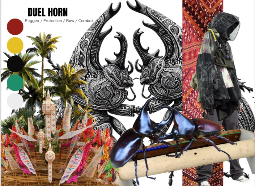 A streetwear outfit that mixes beetle fight, the northern tribe game, with practical features such as waterproof, windproof, and warm. It’s made from recycled materials and has a poncho-inspired style, designed for everyday use.
