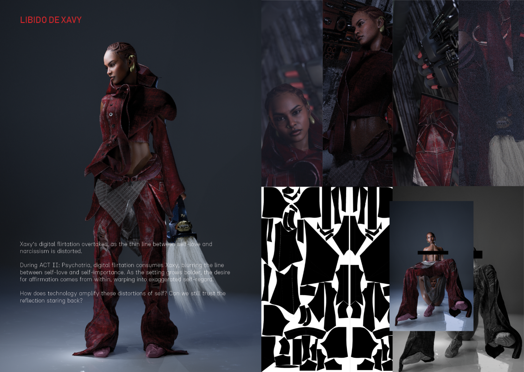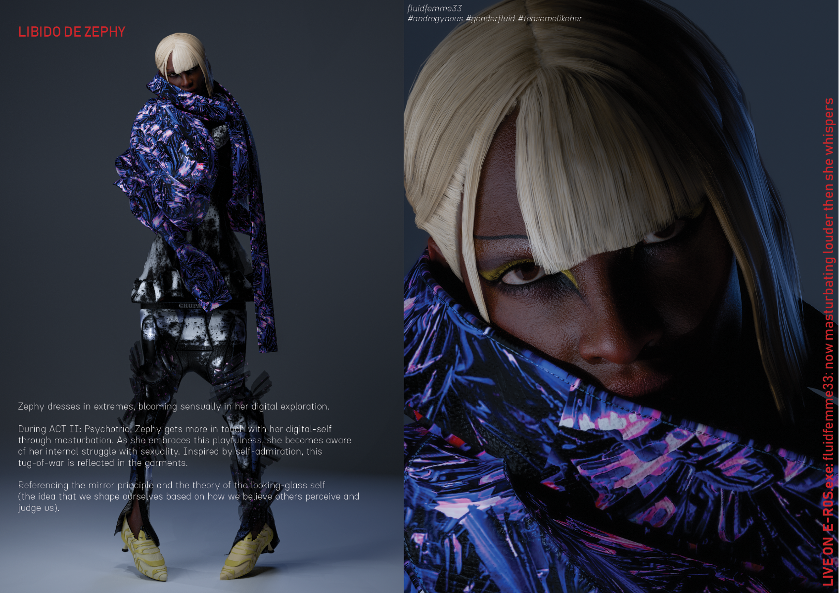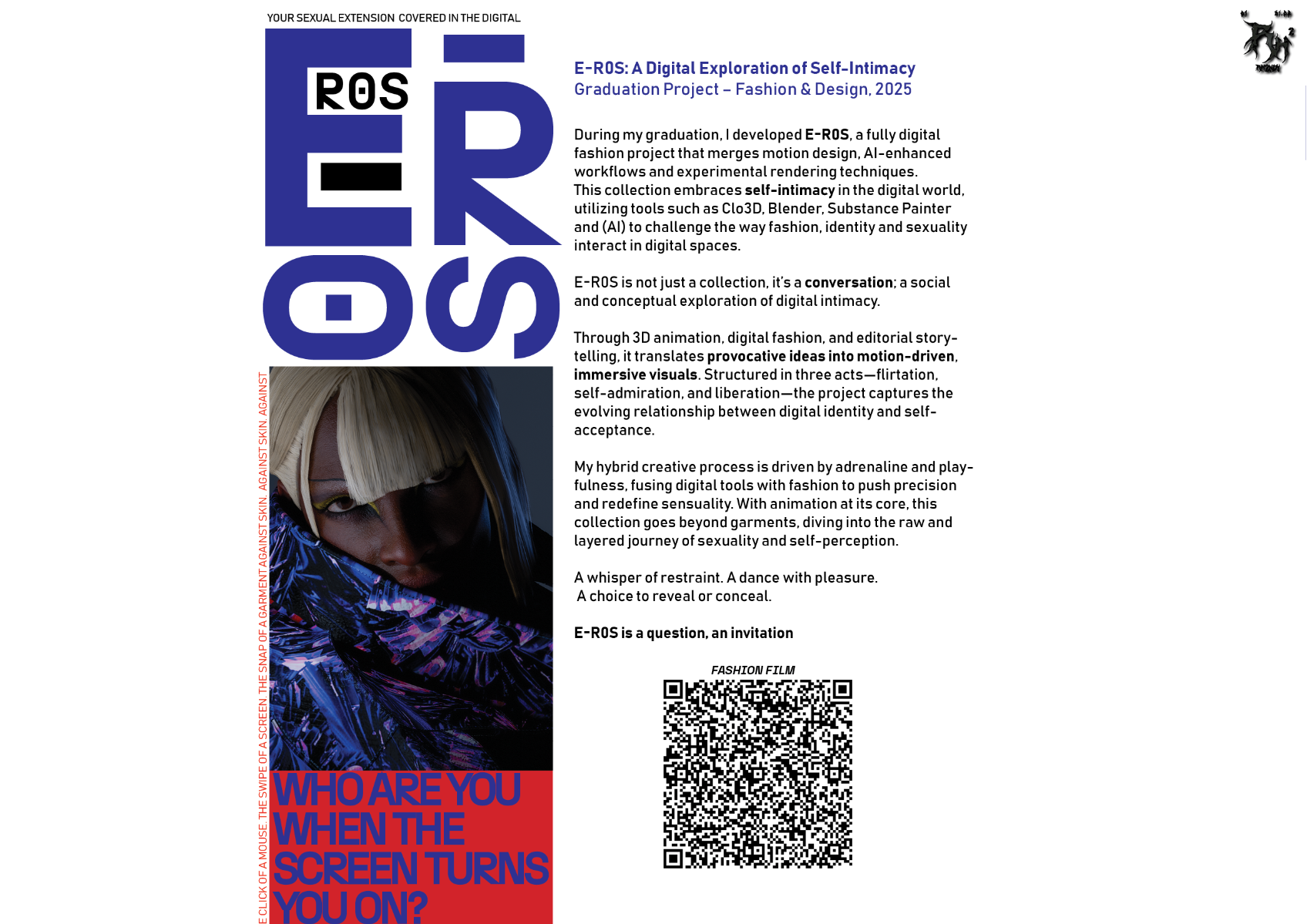E-R0S is a fashion film that explores the journey of self-intimacy in the digital space. Told in three acts, the film merges 3D garment design, 3D/AI-driven visuals and stylized motion to examine desire, identity and the blurred line between self-love and self-lust. Each look reflects a stage of emotional transformation, inviting the viewer to question their own intimacy in an increasingly digital world. Who are you when the screen turns you on?