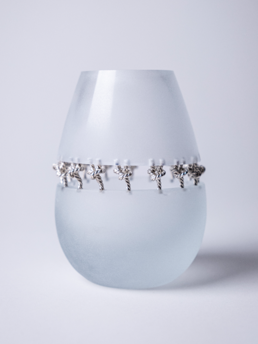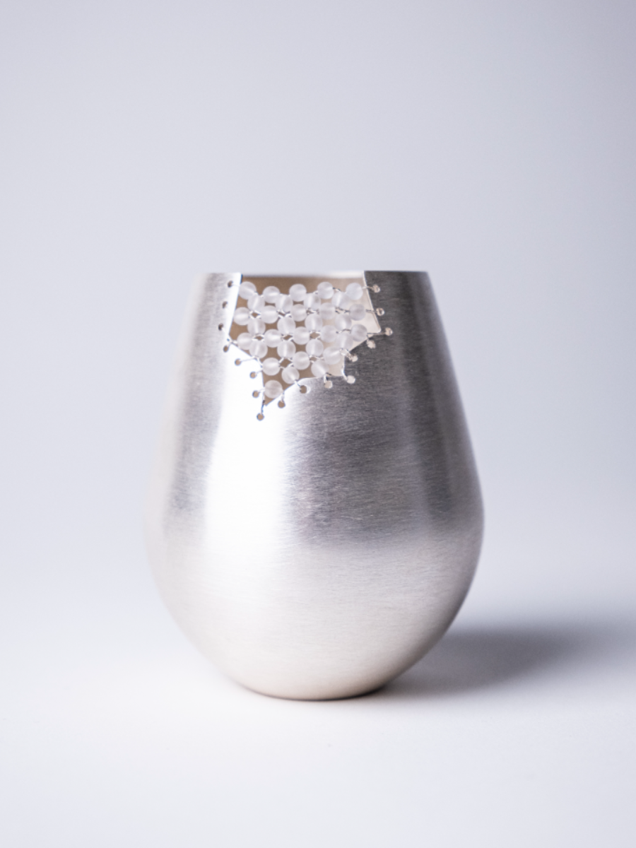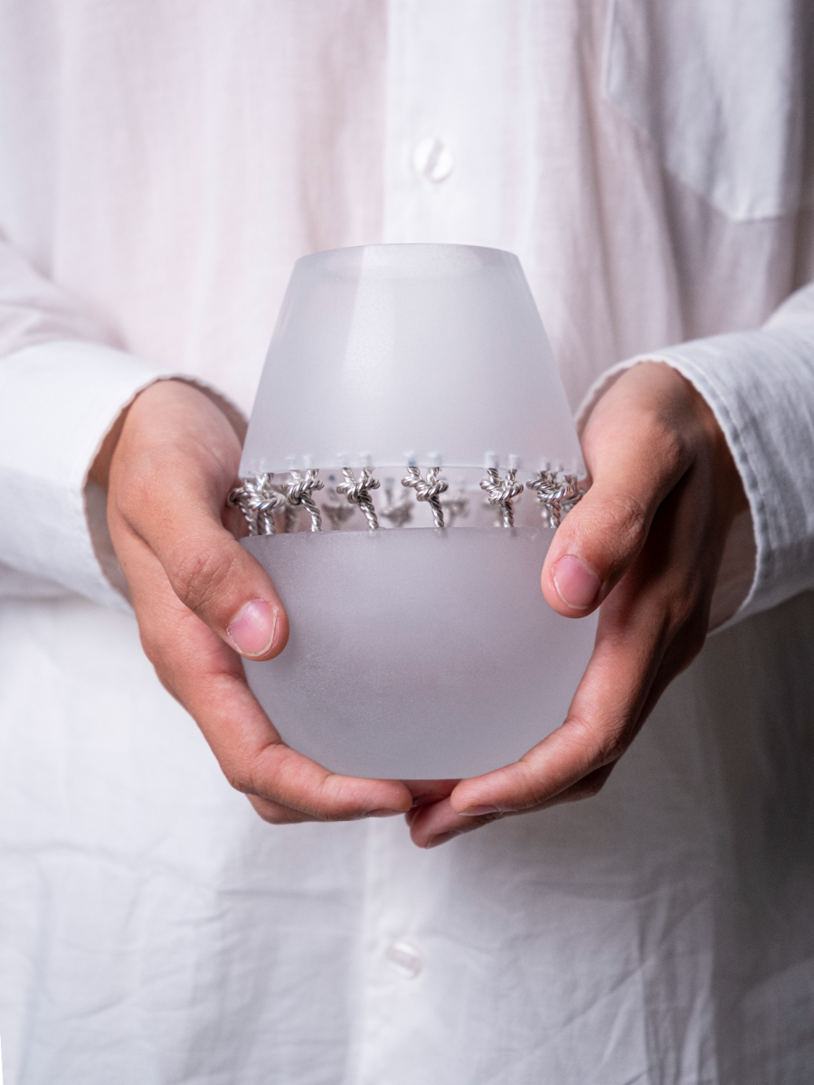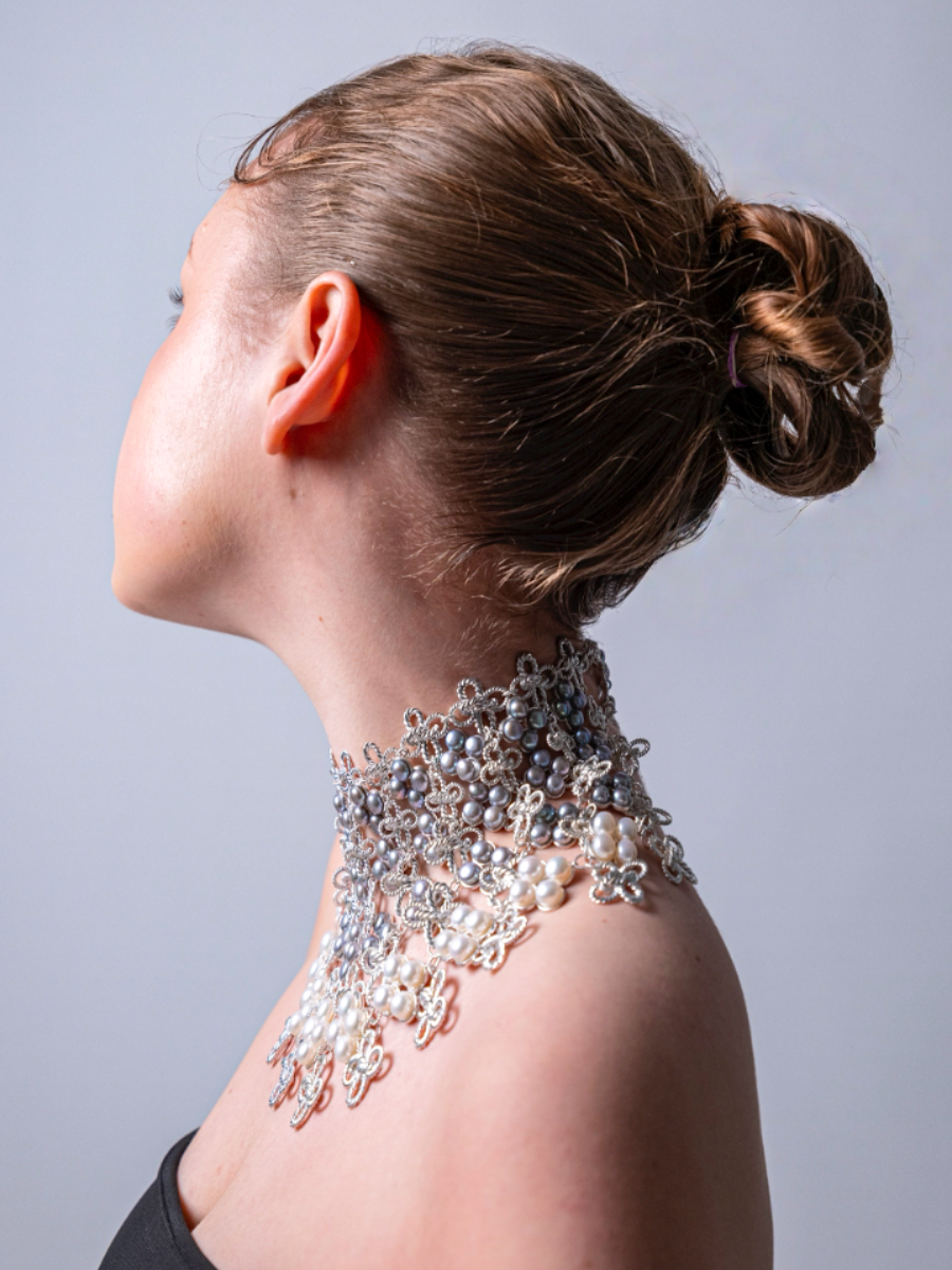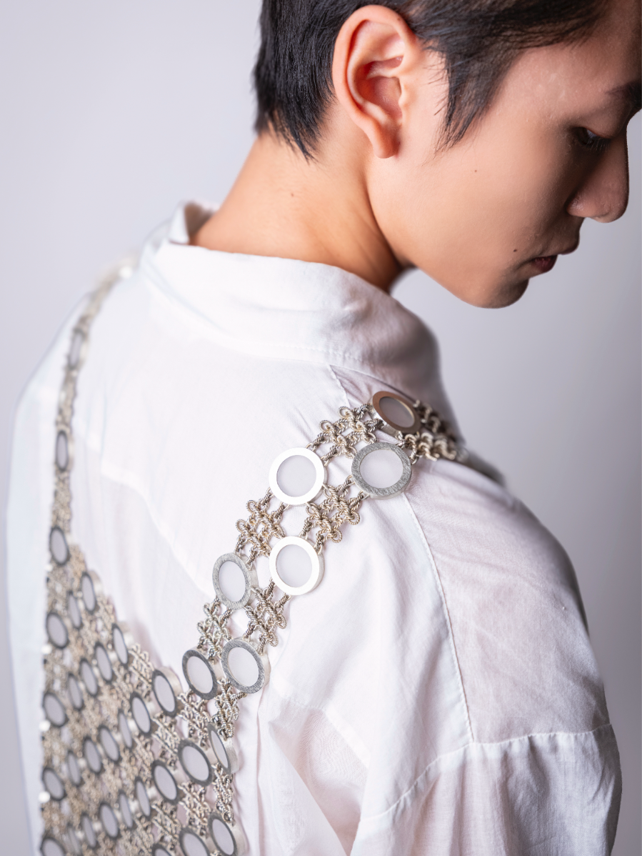 Chuhan’s Collection Echoes in the Blur examines the shifting nature of memory through a series of wearable jewellery and vessels. Using techniques such as knot casting, beading, crocheting, and layering, the project explores how memories are held, distorted, and reassembled over time. Materials such as frosted quartz, mother of pearl, and laser engraved acrylic are chosen for their translucent, hazy qualities—mirroring the way memory fades or fragments. Chuhan frames the body as both vessel and memory site, where inner emotion takes external, physical shape. Through tactile contrasts of softness and rigidity, Echoes in the Blur becomes a meditation on what it means to remember, and how jewellery can hold what words often cannot.