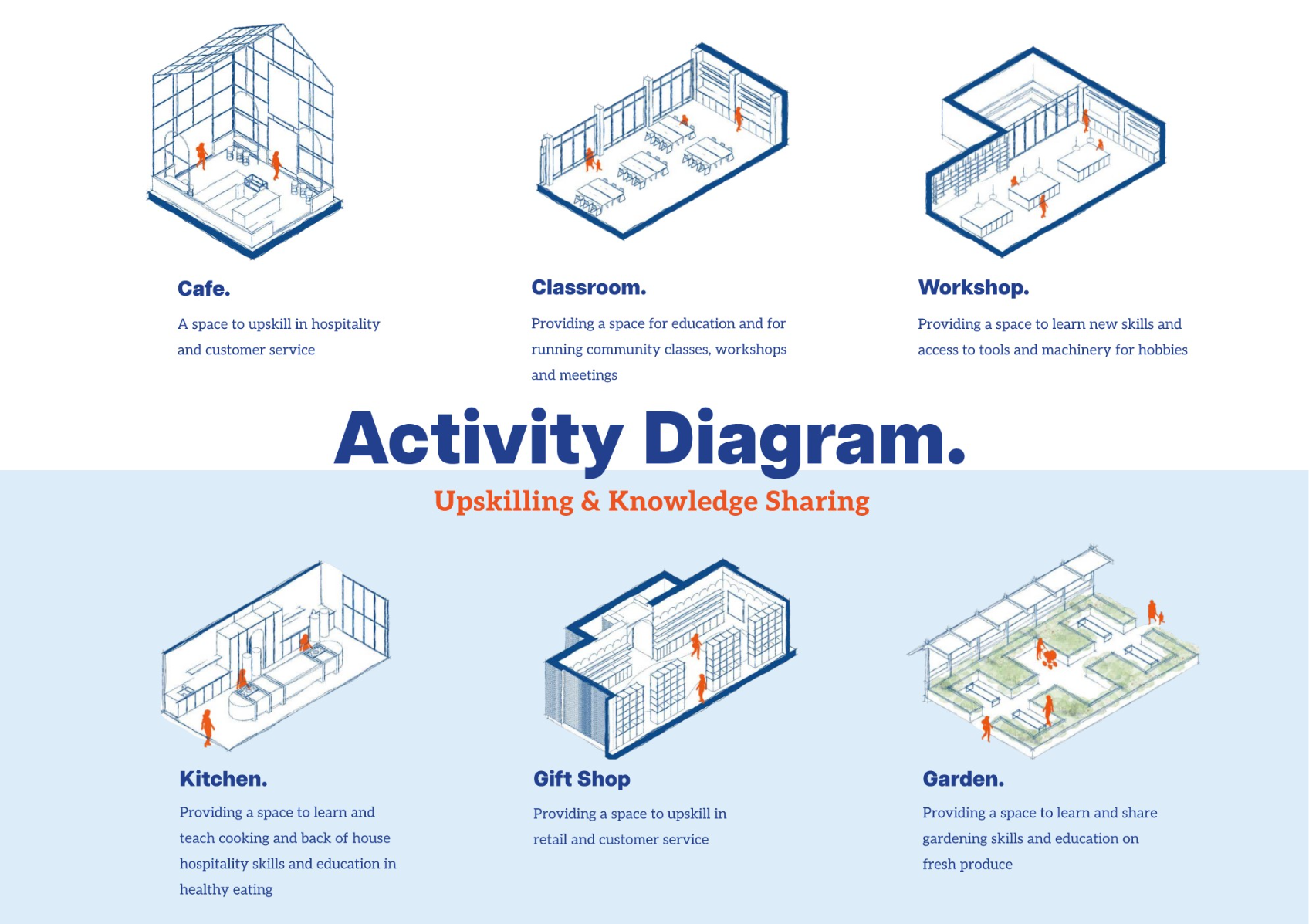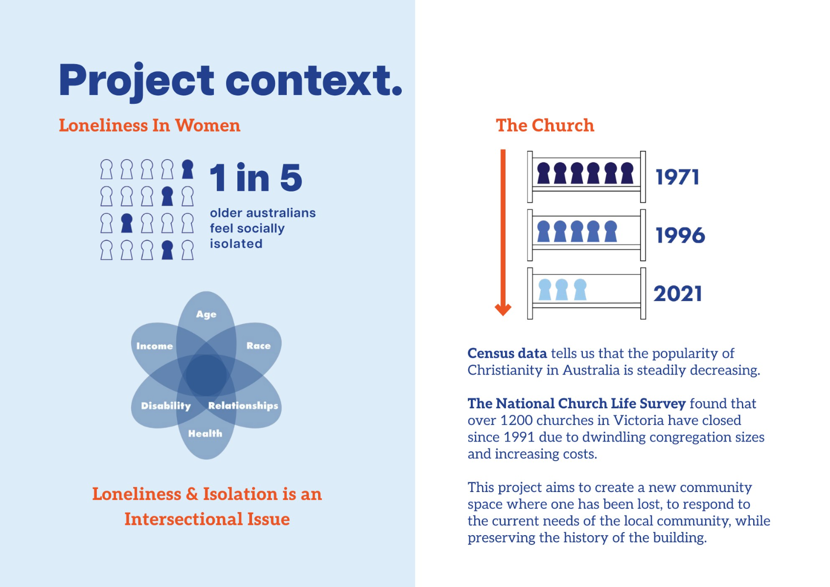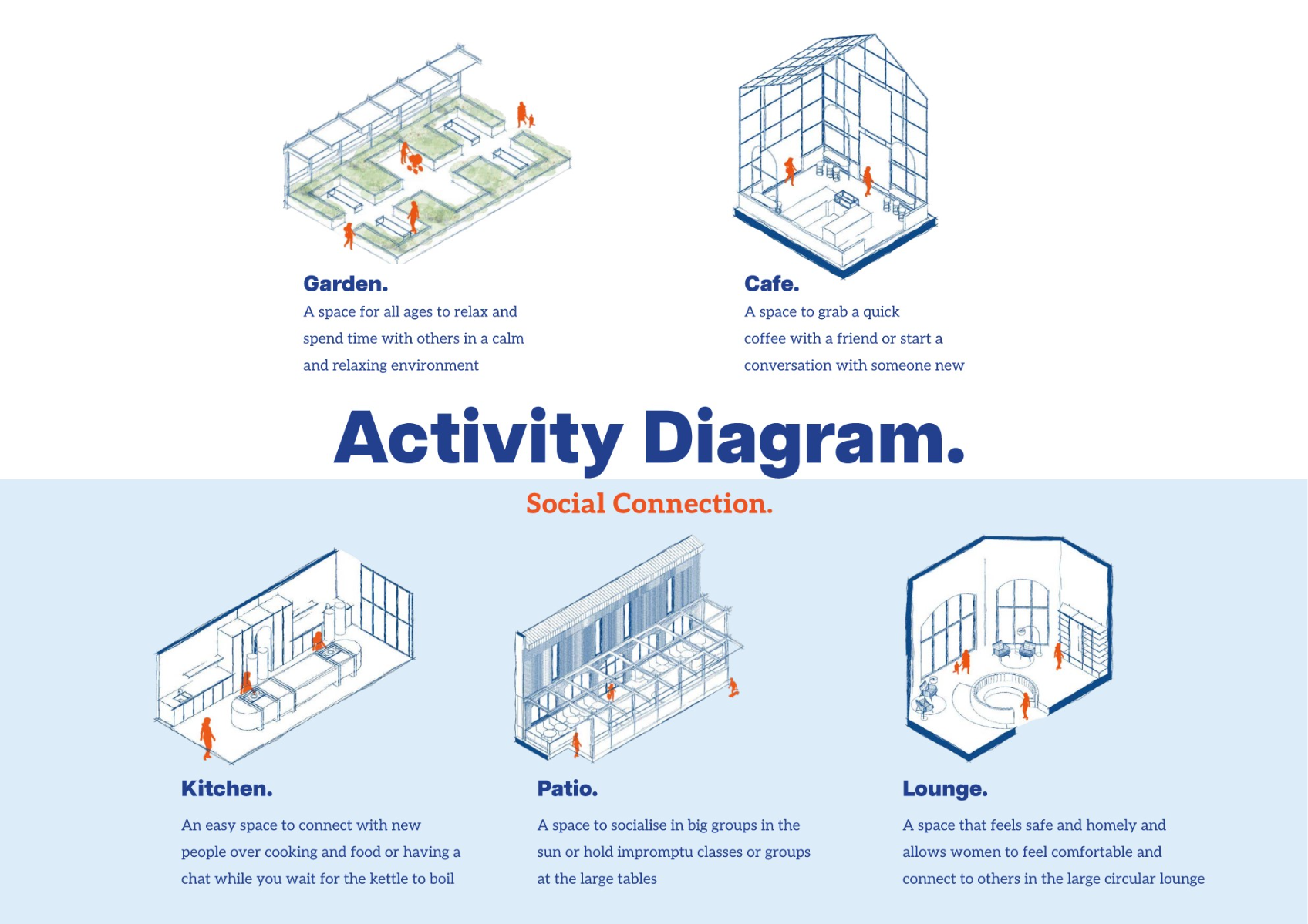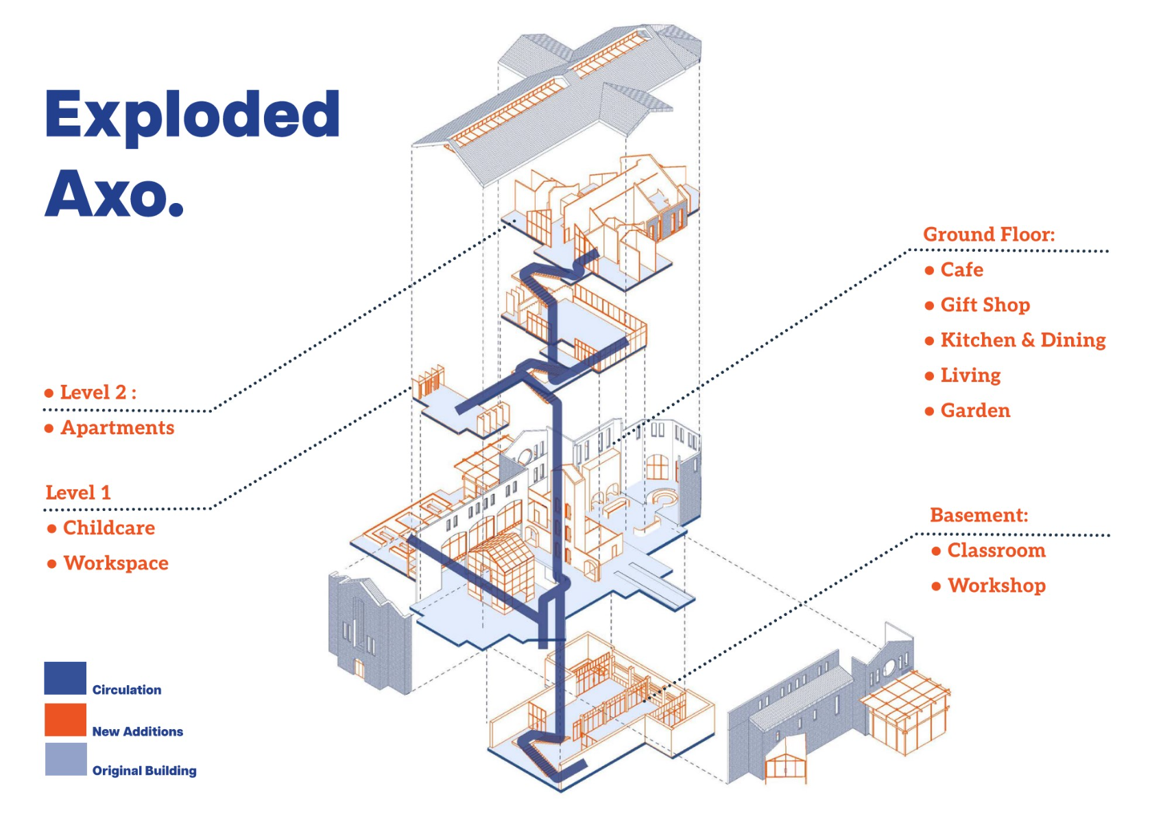 Eden is a women’s community centre that aims to reduce loneliness by creating a welcoming space that fosters a sense of belonging. Housed in a former church, the design strikes a balance between creating a homely and comfortable environment and preserving the integrity of the original building. My research on loneliness guided me to include two main objectives for my design: to create a welcoming and homely environment that encourages women to return and stay longer, and to foster intergenerational connections. The design includes an accessible building with a wide range of activities and provides spaces that encourage both purposeful and incidental interactions.