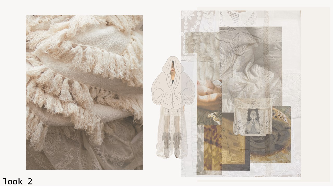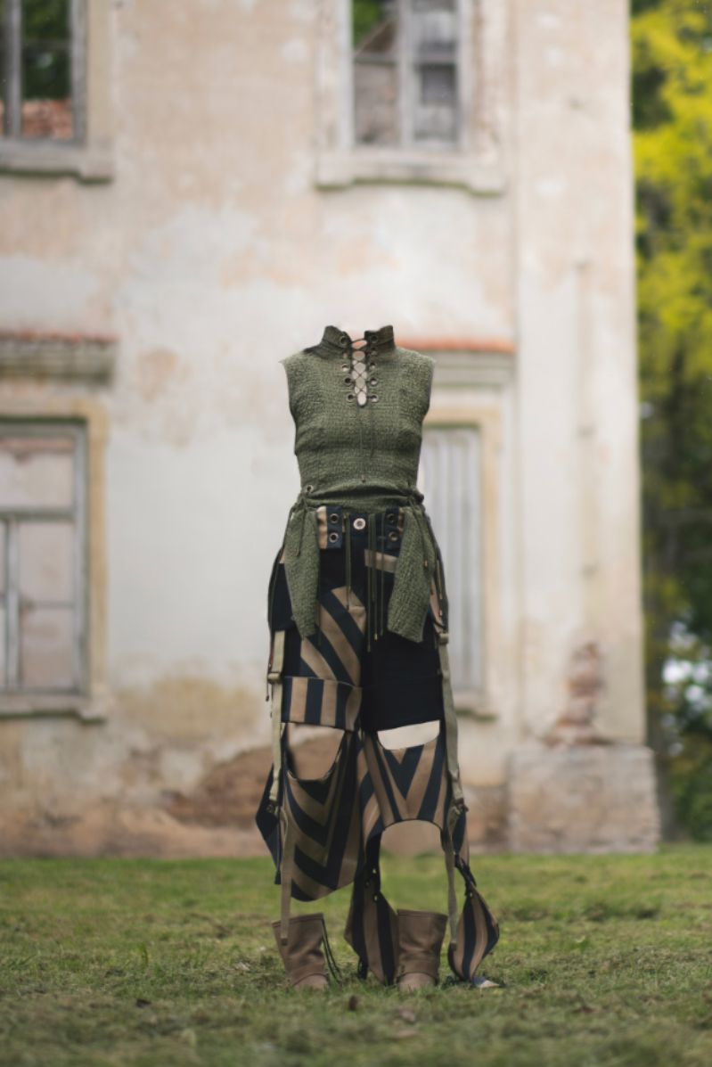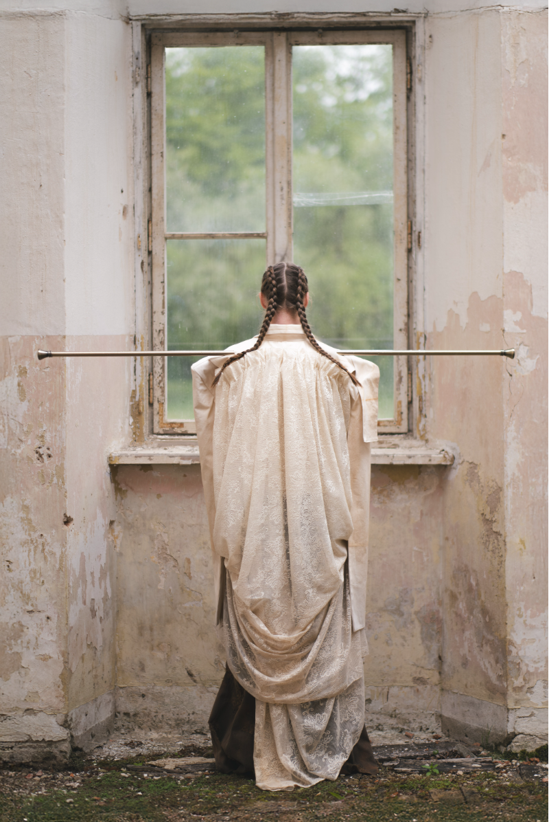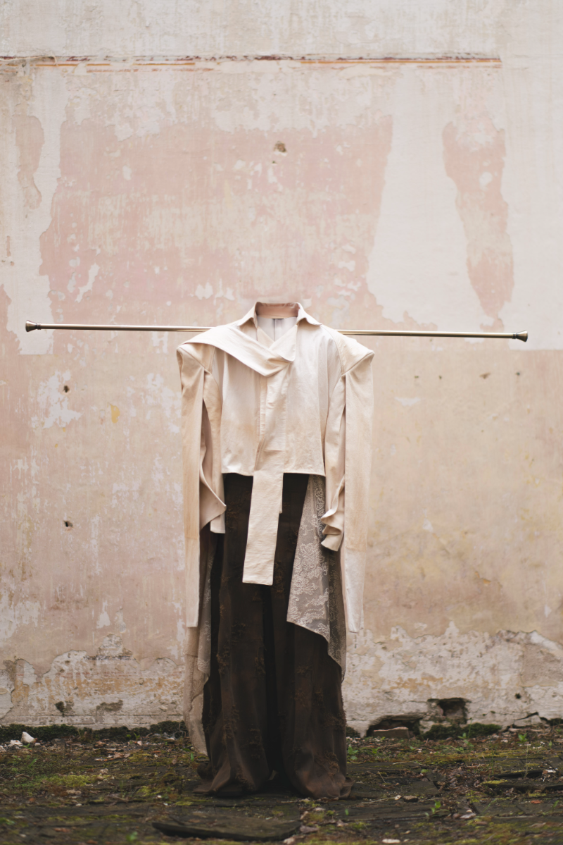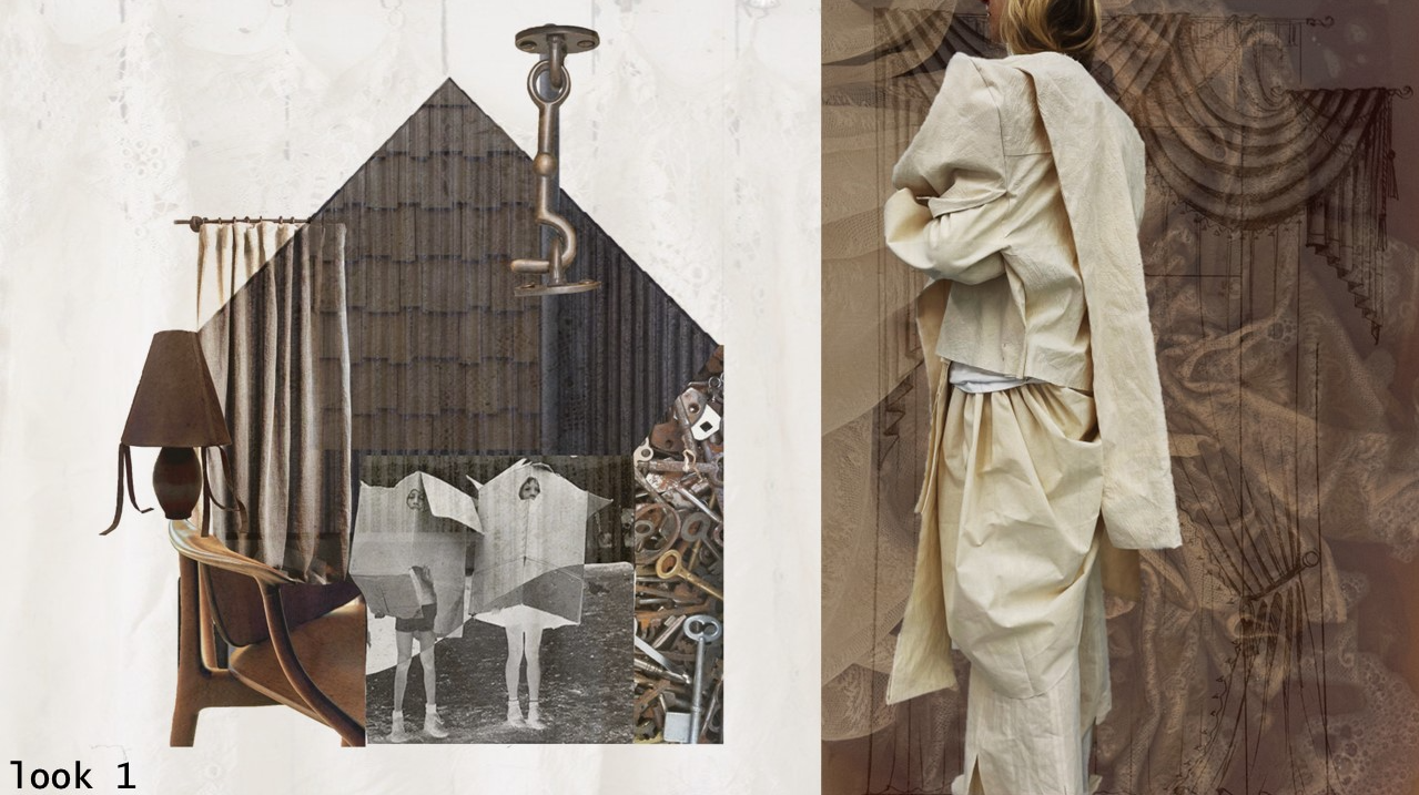 "Home Sweet Home" is an experimental fashion collection that deconstructs the multi-layered concept of home in the context of mass migration, geopolitical and ecological changes. Here, the garments are upcycled and crafted from materials sourced from my family’s home interiors, flea markets, and thrift shops. The transformation of past objects into new forms and meanings echoes the collection's themes of loss, resilience of memory and the transformative power of time. The emotion of the collection swings like a pendulum between harmonious comfort and aggressive heaviness: home is perceived not as a static physical space, but as an ever-changing emotional landscape, built by personal and collective sentiments and experiences. Through colour, materiality and construction, each model serves as a fragment of a larger visual narrative about our modern identity shaped by the complex relationship with our homes. Whilst acting as an allegory for the personal quest for home and belonging, the collection raises the question: What does it mean to belong to a place in a world that is constantly moving and changing?