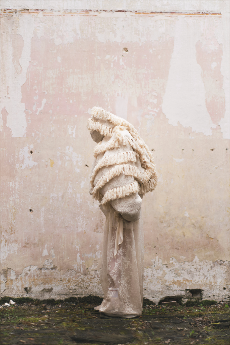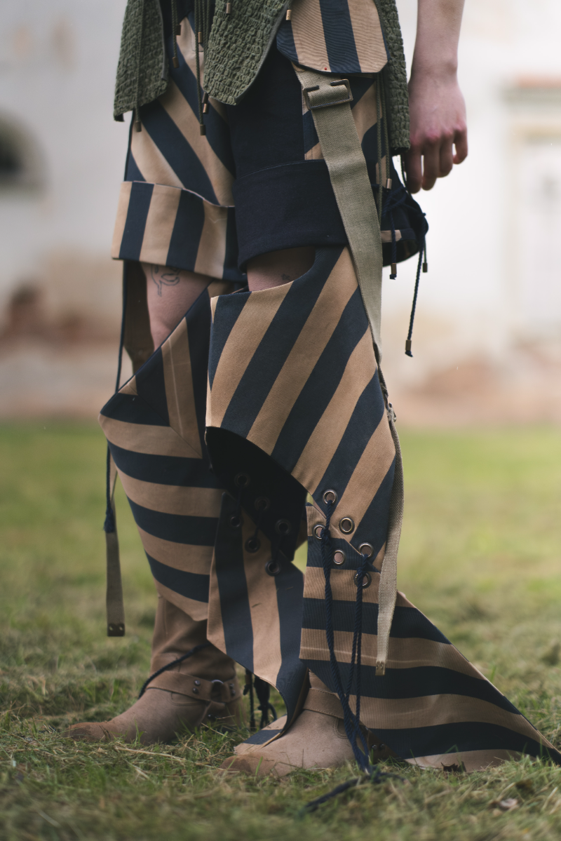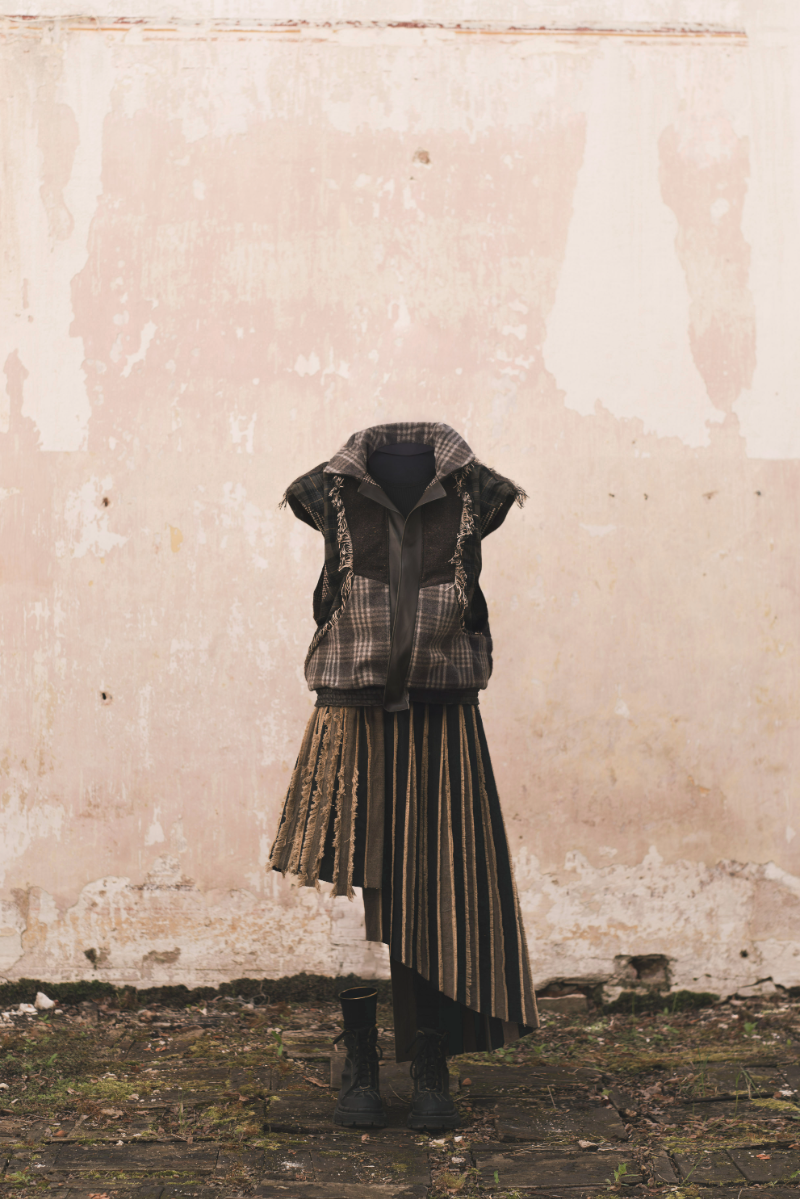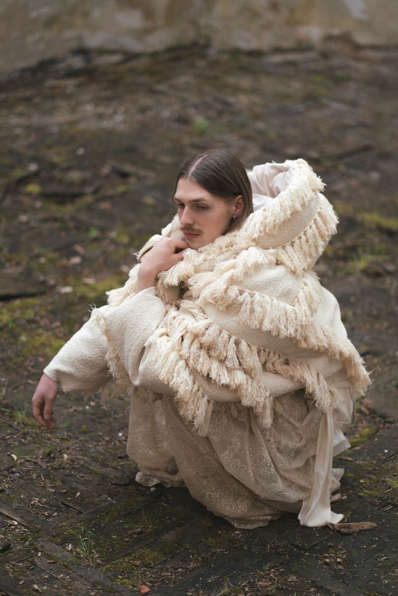 "Home Sweet Home" is an experimental fashion collection that deconstructs the multi-layered concept of home in the context of mass migration, geopolitical and ecological changes. Here, the garments are upcycled and crafted from materials sourced from my family’s home interiors, flea markets, and thrift shops. The transformation of past objects into new forms and meanings echoes the collection's themes of loss, resilience of memory and the transformative power of time. The emotion of the collection swings like a pendulum between harmonious comfort and aggressive heaviness: home is perceived not as a static physical space, but as an ever-changing emotional landscape, built by personal and collective sentiments and experiences. Through colour, materiality and construction, each model serves as a fragment of a larger visual narrative about our modern identity shaped by the complex relationship with our homes. Whilst acting as an allegory for the personal quest for home and belonging, the collection raises the question: What does it mean to belong to a place in a world that is constantly moving and changing?