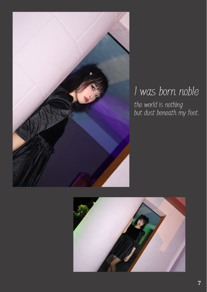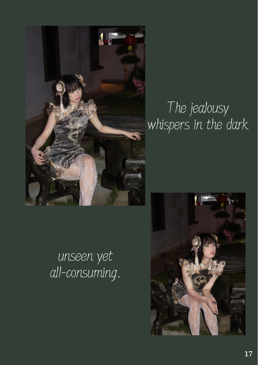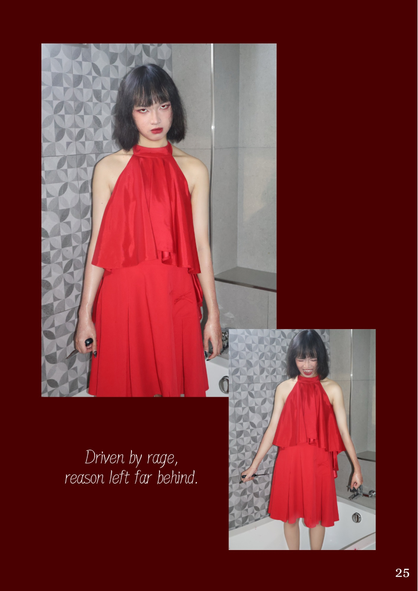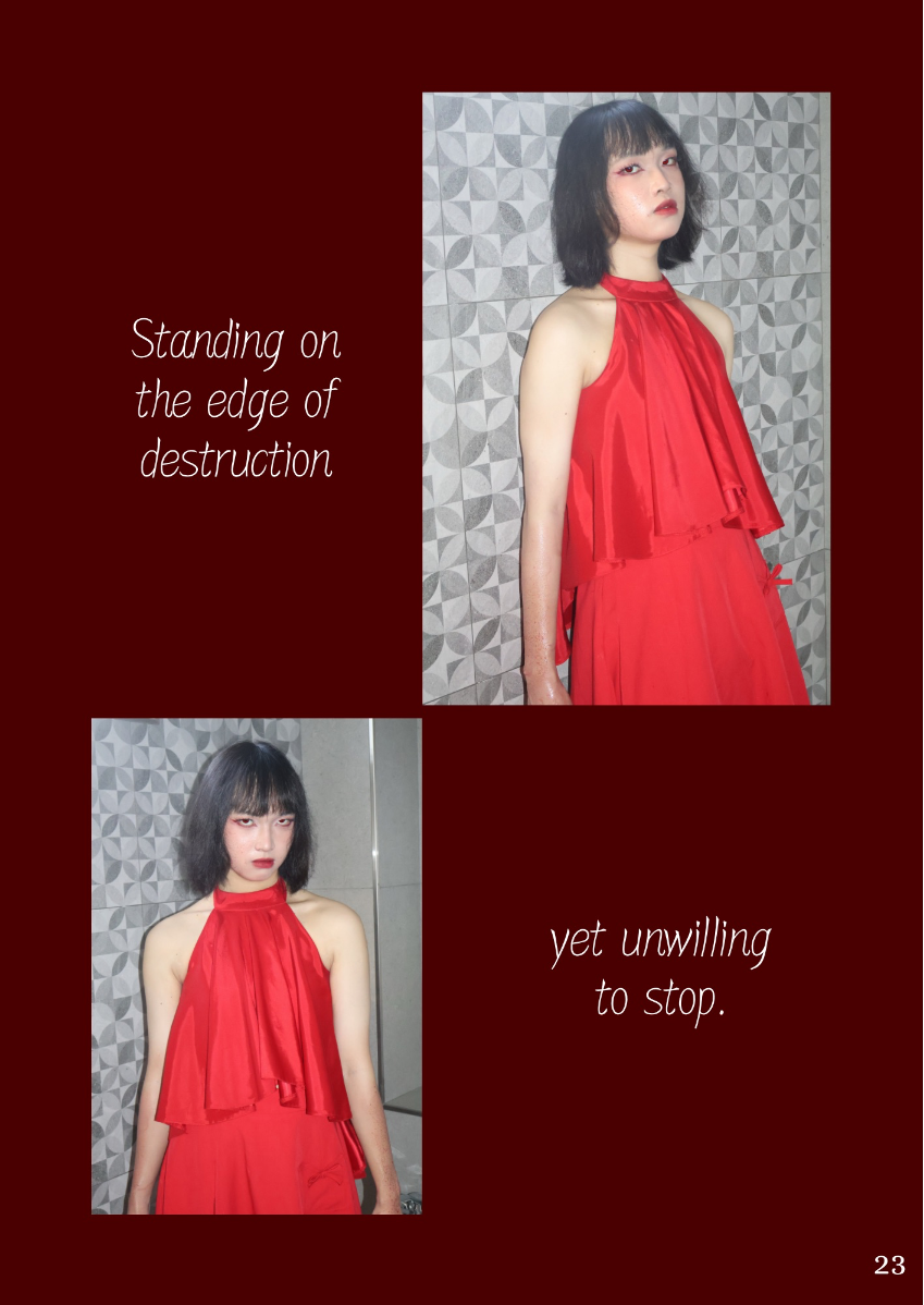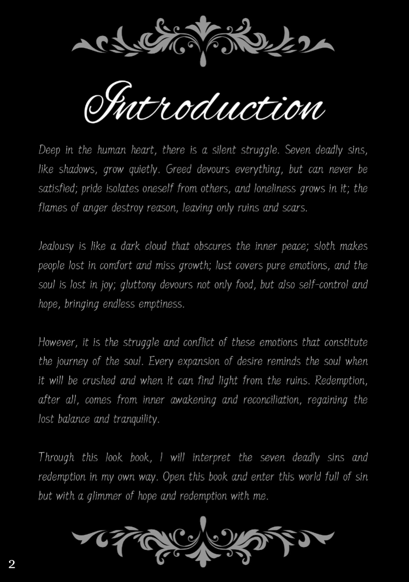 This lookbook is inspired by the concept of the Seven Deadly Sins, a classification of the worst human vices in Catholic doctrine. The Seven Deadly Sins - Pride, Envy, Wrath, Sloth, Greed, Gluttony and Lust - are seen as the root of immoral behavior, often triggering a series of negative behaviors and habits. Each sin represents a different aspect of human nature, showing the dark side of human nature. Through this series of works, I try to explore these themes of temptation, excess and moral degradation, and express them in my own way. Each outfit, look and overall atmosphere is designed to embody the sin it represents, transforming the abstract concept of sin into a concrete visual expression. However, in addition to the display of these sins, this lookbook also hopes to present the theme of "redemption" - a process of self-transcendence and redemption from sin. The embodiment of each sin is not only a depiction of human depravity, but also a reflection on change and purification. In the face of our own weaknesses and temptations, redemption provides a ray of hope and guides us to a higher moral realm. Through this visual journey, I invite the audience to find a spiritual dialogue between sin and redemption, and to think about the possibility of personal growth and moral rejuvenation.