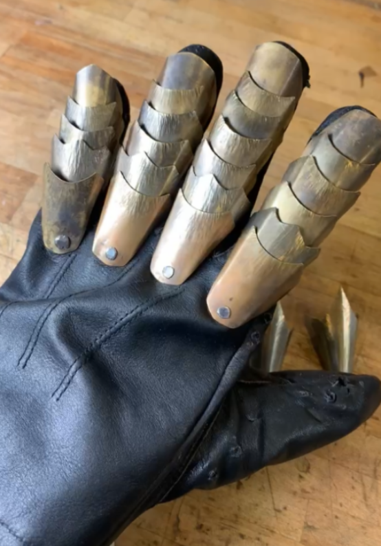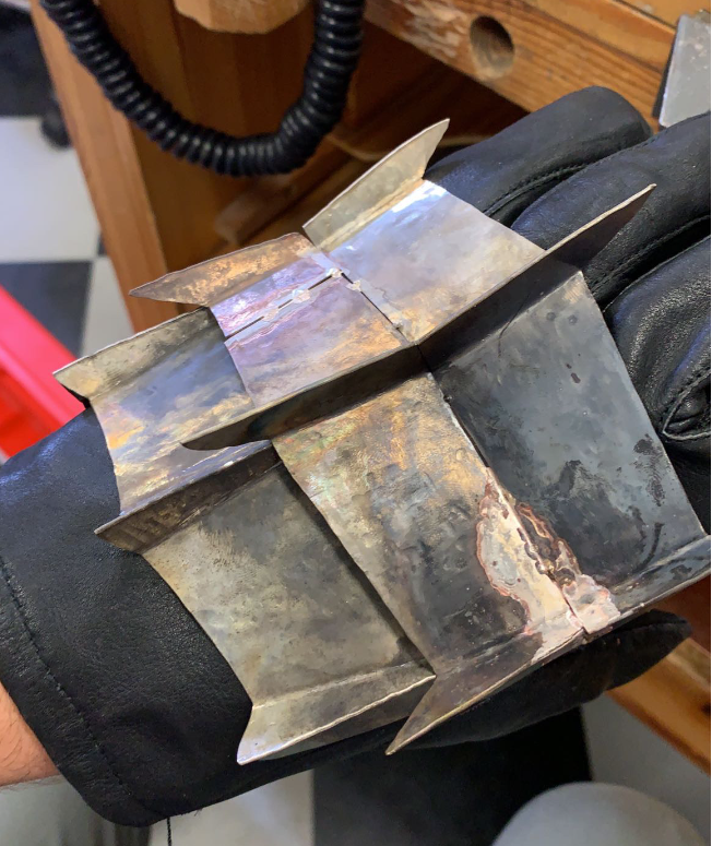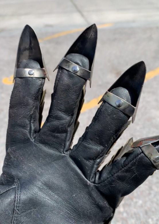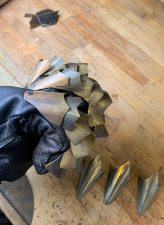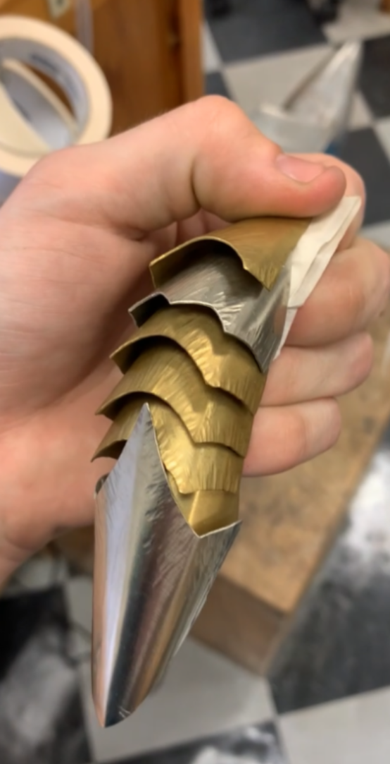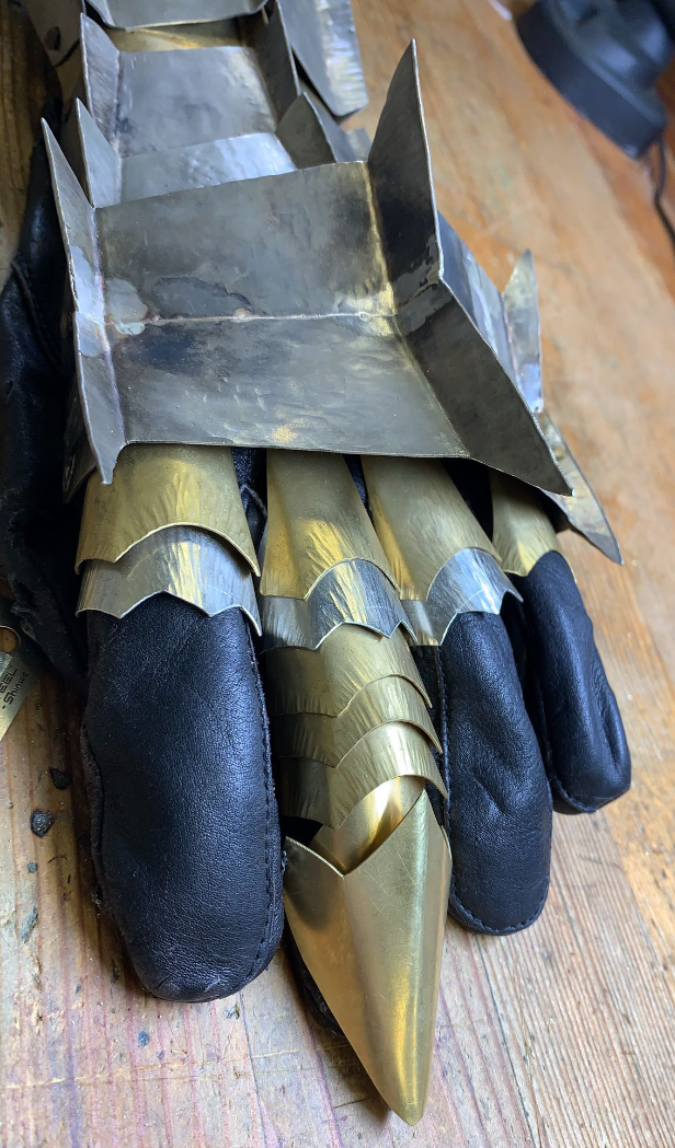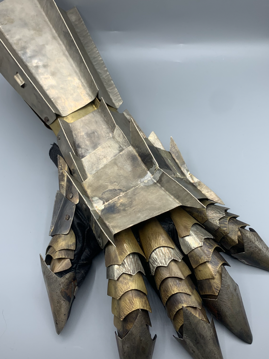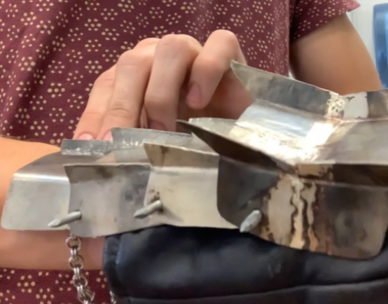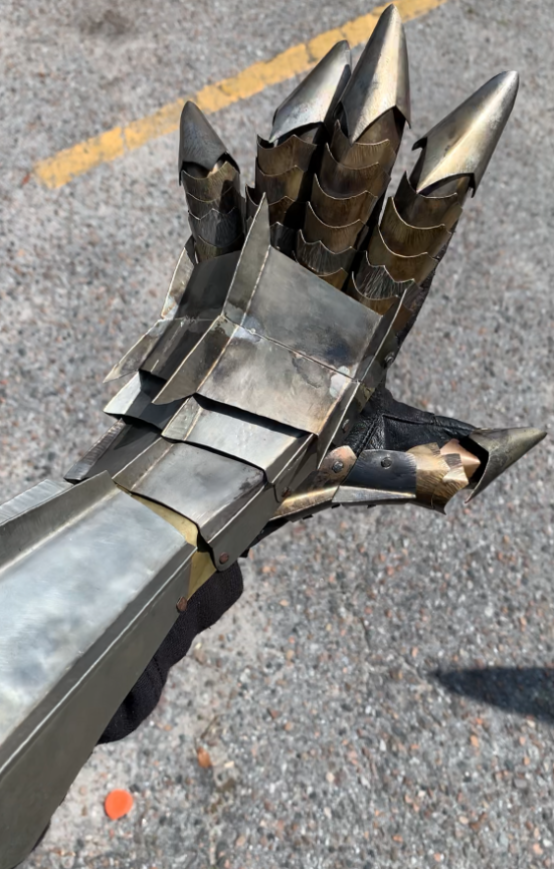 This gauntlet began as a personal project driven by my fascination with sharp, angular aesthetics and my desire to expand my technical skills. Inspired by medieval armor, I wanted to create something that felt bold and a little dangerous while still being wearable and functional. The design explores rough textures and striking forms, contrasting them with the natural movement of the human body. As the piece shifts with the wearer, it produces satisfying sounds and dynamic shapes. Made from nickel silver, brass, and stainless steel rivets, it features an adjustable faux leather glove and a spring-latch arm brace for a secure and comfortable fit. This project was a valuable learning experience, allowing me to experiment with new techniques while bringing a vision to life. It reflects my ongoing curiosity about materials, mechanics, and the relationship between form and function.