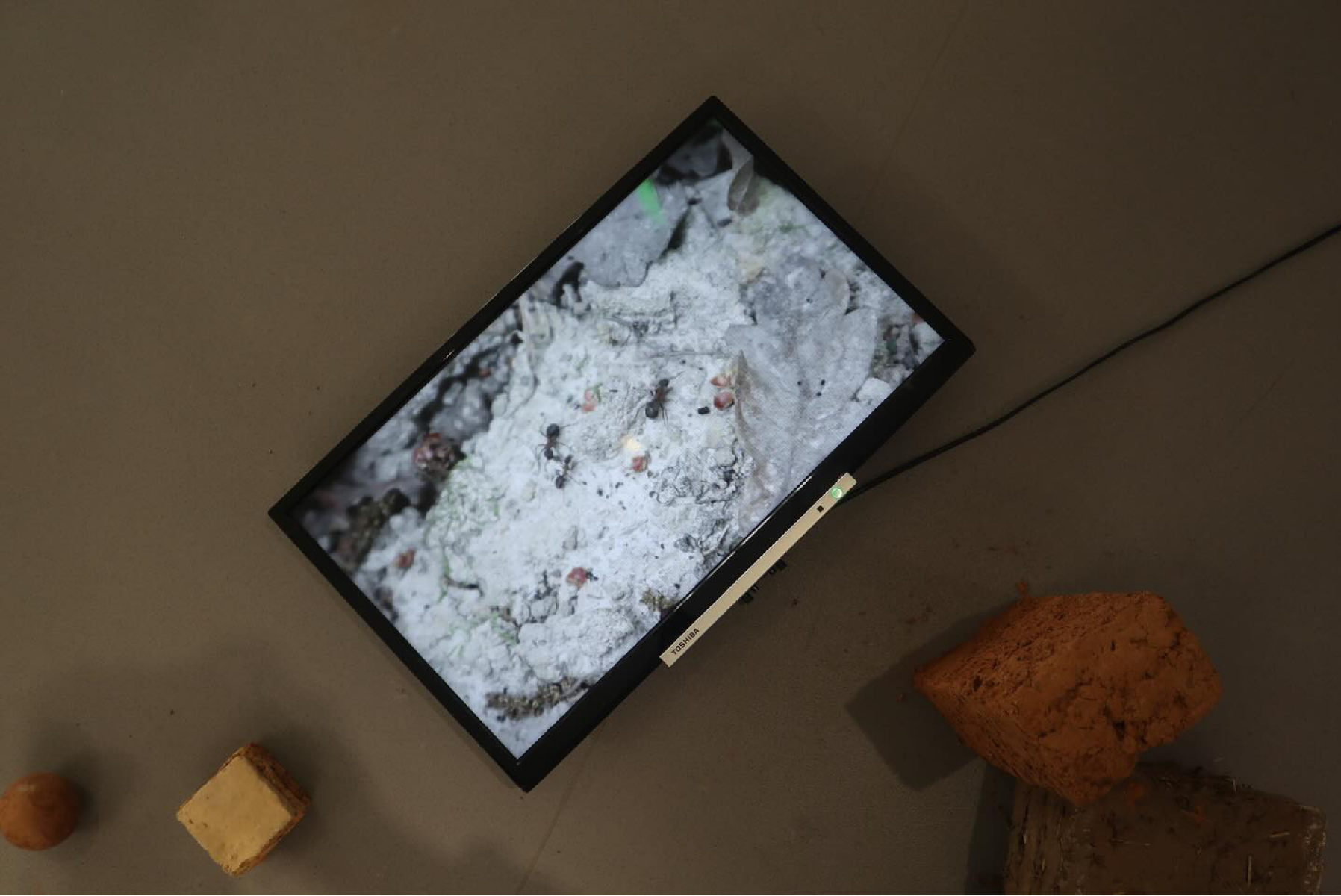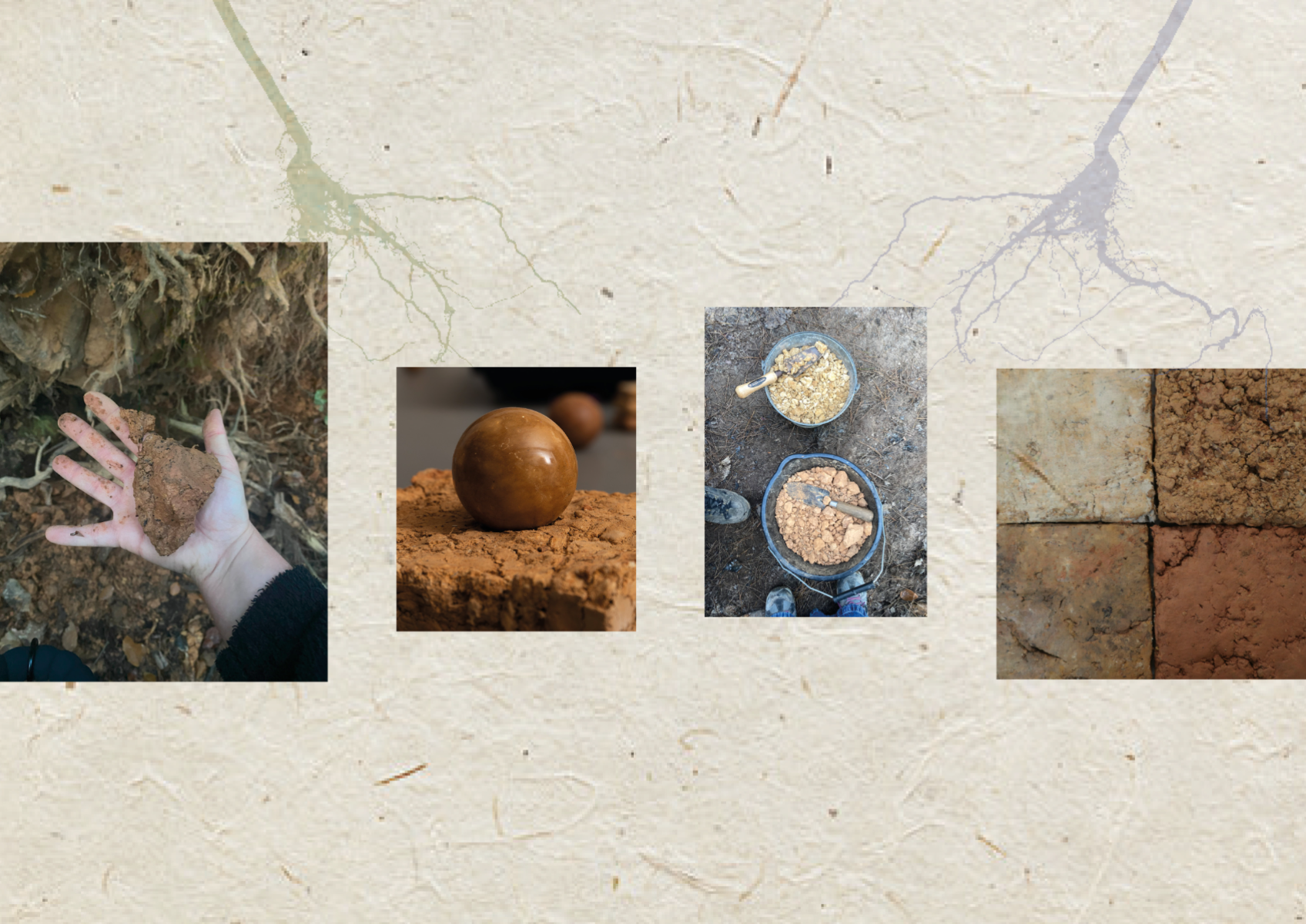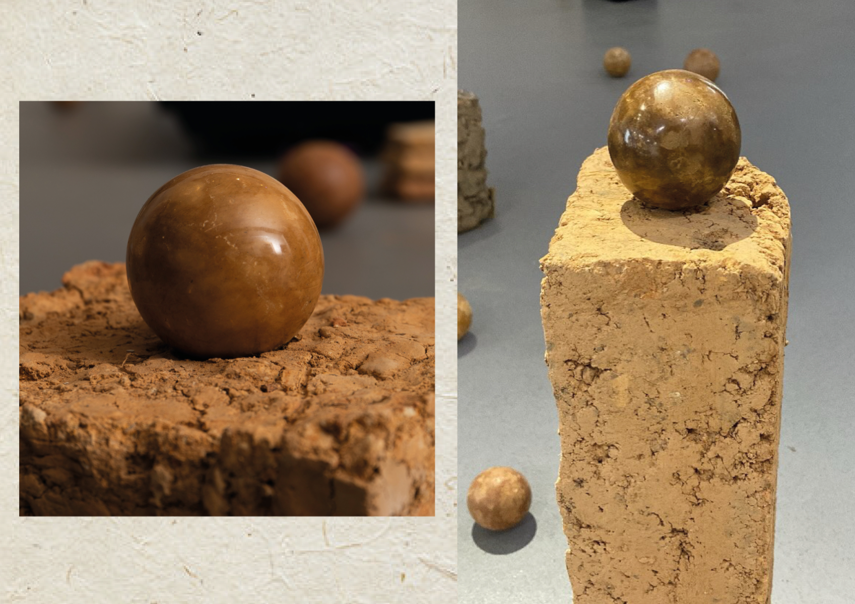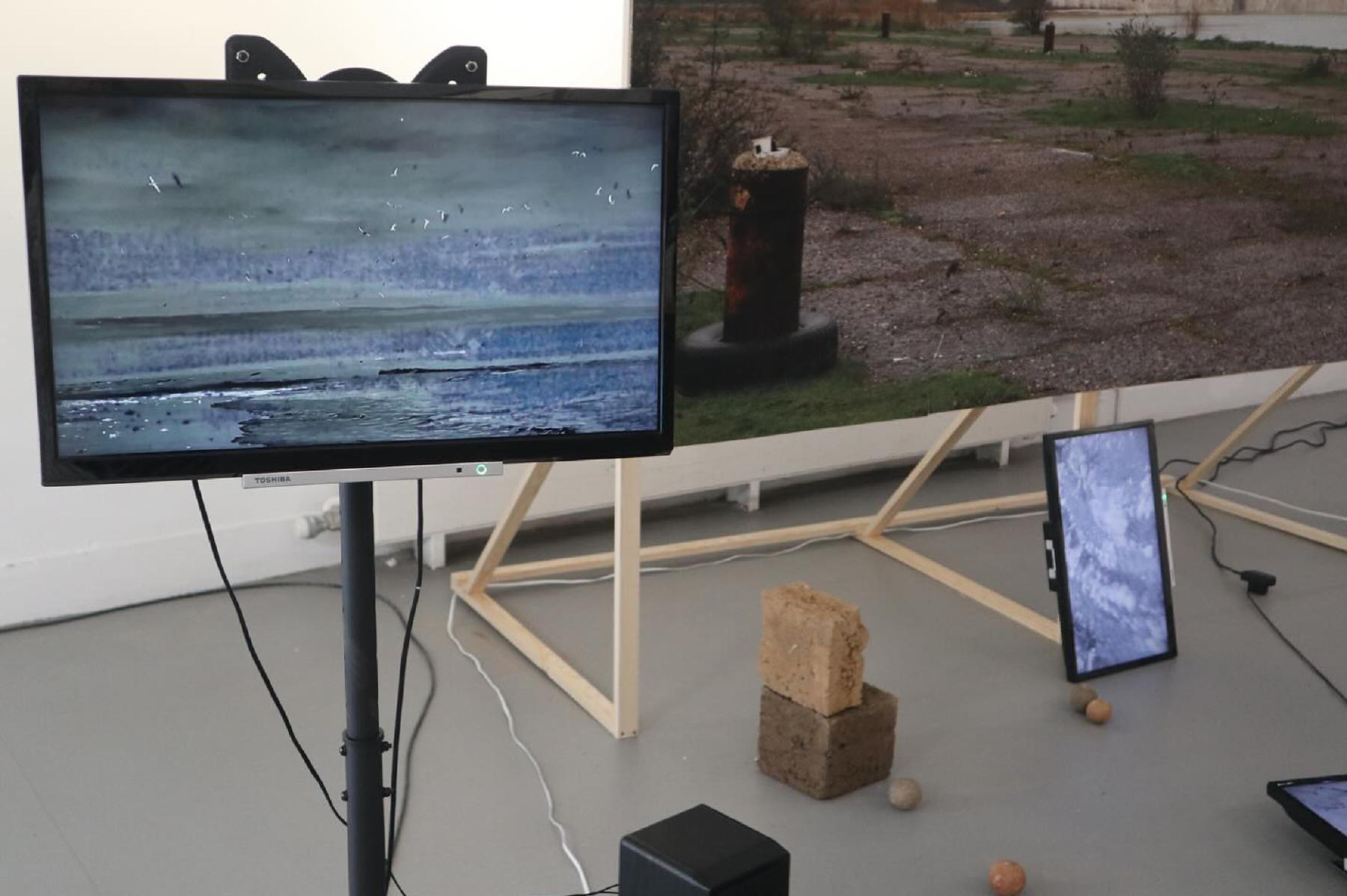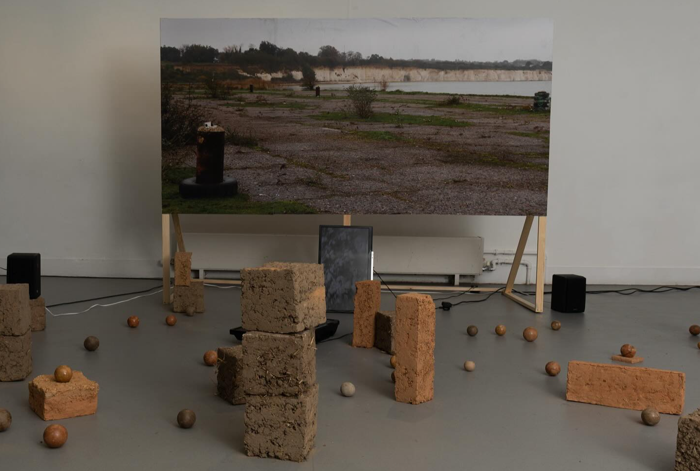 “From a distance” is a response to the Kent landscapes shaped through walking, gathering, and transforming earth into form. It explores how we experience land in the age of the Anthropocene, where encounters with place are often fractured or lost. A panoramic billboard, earth-formed monoliths and spheres, and screens with video and sound construct a mediated ‘spectacle’ of place. Together, they juxtapose the direct, embodied engagement of walking in the land and a distanced technological representation. The billboard acts as both a window and a barrier, symbolising a longing for connection with nature, while confronting the reality of our disconnection. At its core is the retired hoverport of Pegwell Bay, a site once dominated by industry, now slowly reclaimed by nature. Its haunting beauty holds both ruin and resilience. The work asks: What remains of place after extraction, neglect, and spectacle? And can we begin to reimagine more attentive, ethical ways of being with the land?