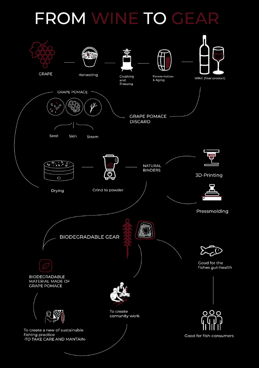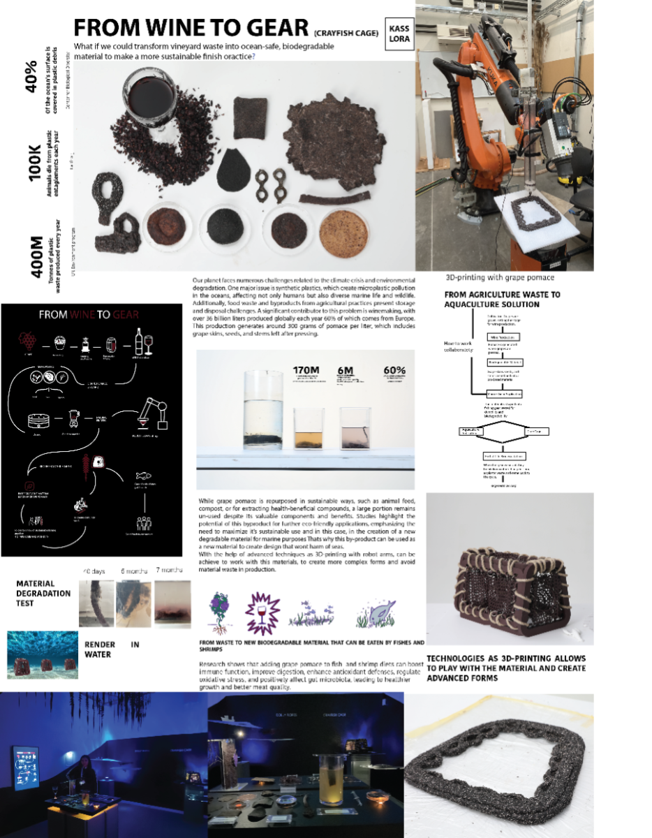 A biomaterial solution to help reduce plastic pollution in the ocean Plastic waste in the oceans, especially from the fishing industry, is a major environmental threat. Ropes and lobster traps made of plastic often wear down, becoming microplastic pollution, entangling marine life, and creating ghost gear. At the same time, the European wine industry produces around 5 million tons of grape residues each year, much of which remains unused. Research shows that these byproducts can even support gut health in fish and shrimp, opening new opportunities for sustainable applications in marine environments. From Wine to Gear transforms grape residues into biodegradable fishing equipment designed for both commercial and private use. By replacing plastic ropes and traps with new bio-materials, the project helps to reduce marine pollution and offers a responsible, future-oriented perspective to the fishing industry . With hydrodynamic design optimized for stability and low resistance in water, grape-based composites can be shaped through methods such as 3D printing and heat pressing.